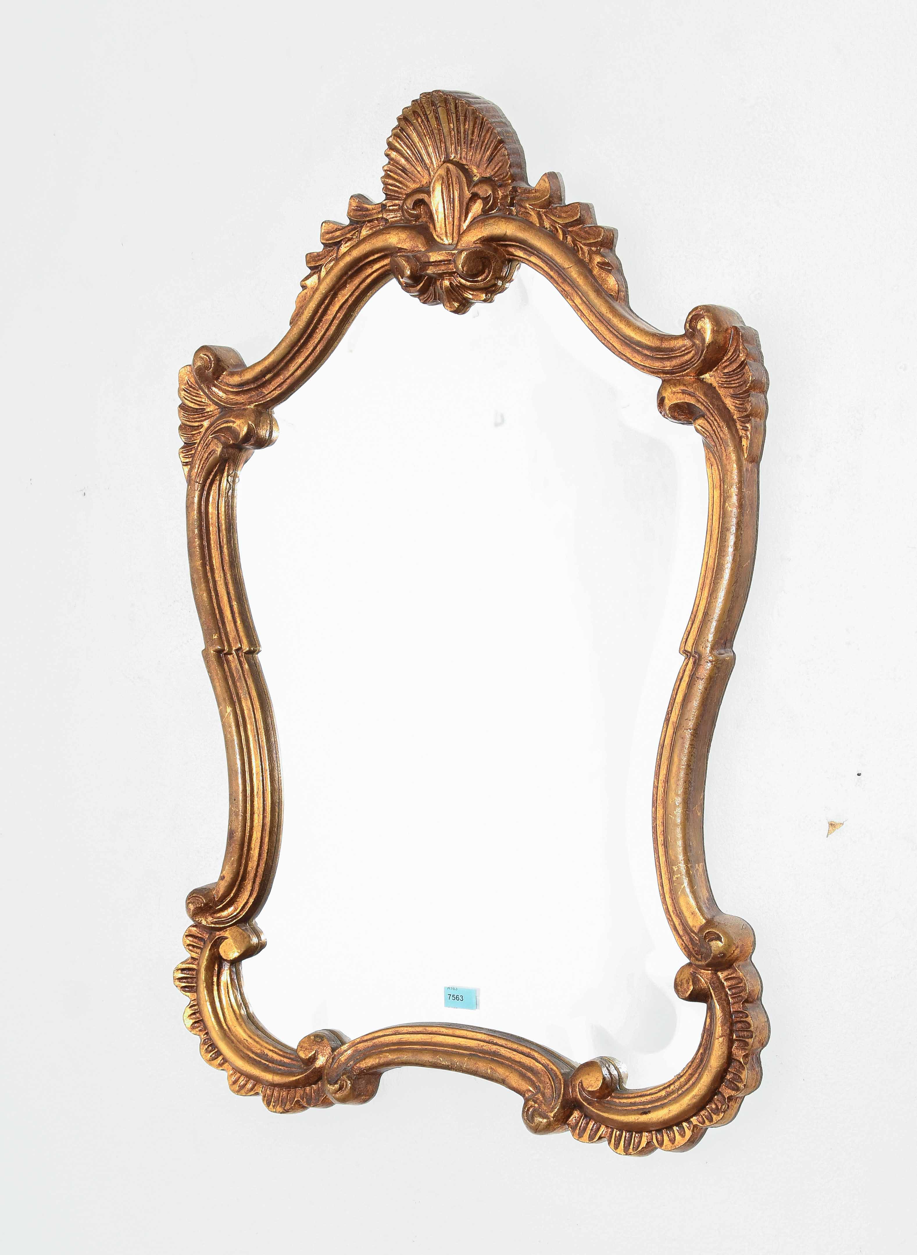 Barock-Stil 20. Jh. Hartholz, Goldfarbe. Geschweifter Rahmen mit muschelförmigem Abschluss. Gebrauchsspuren. 45x73 cm.