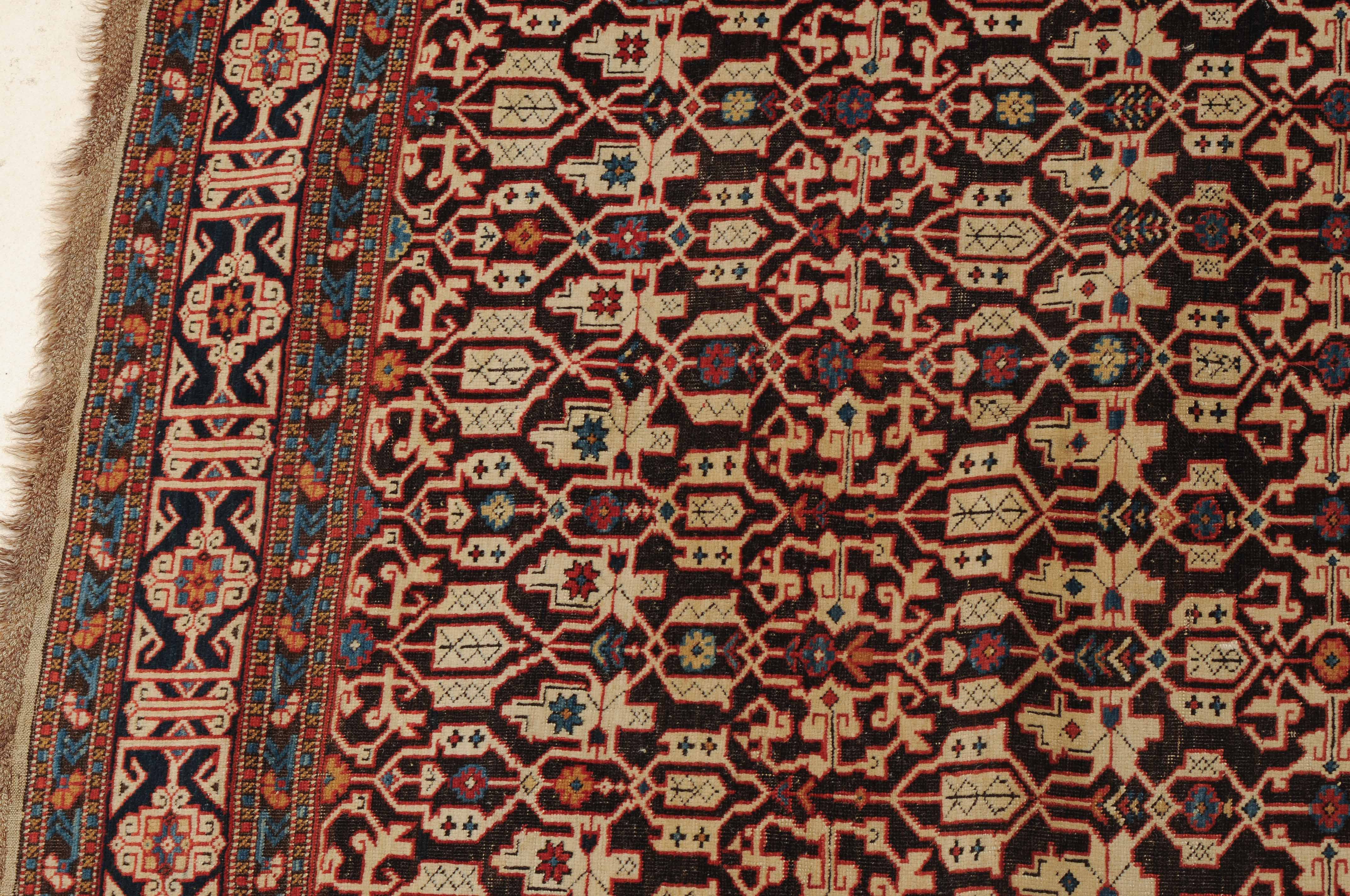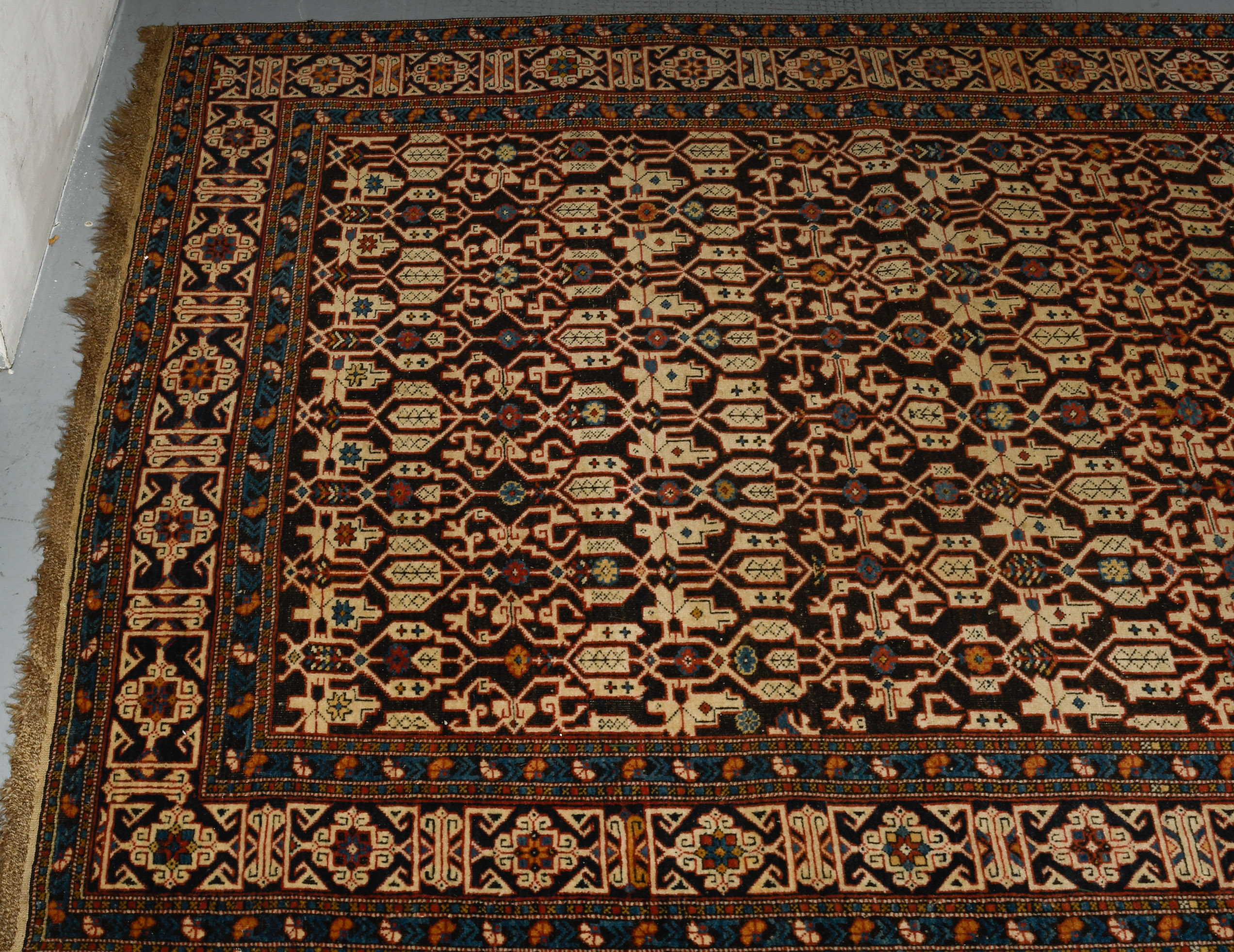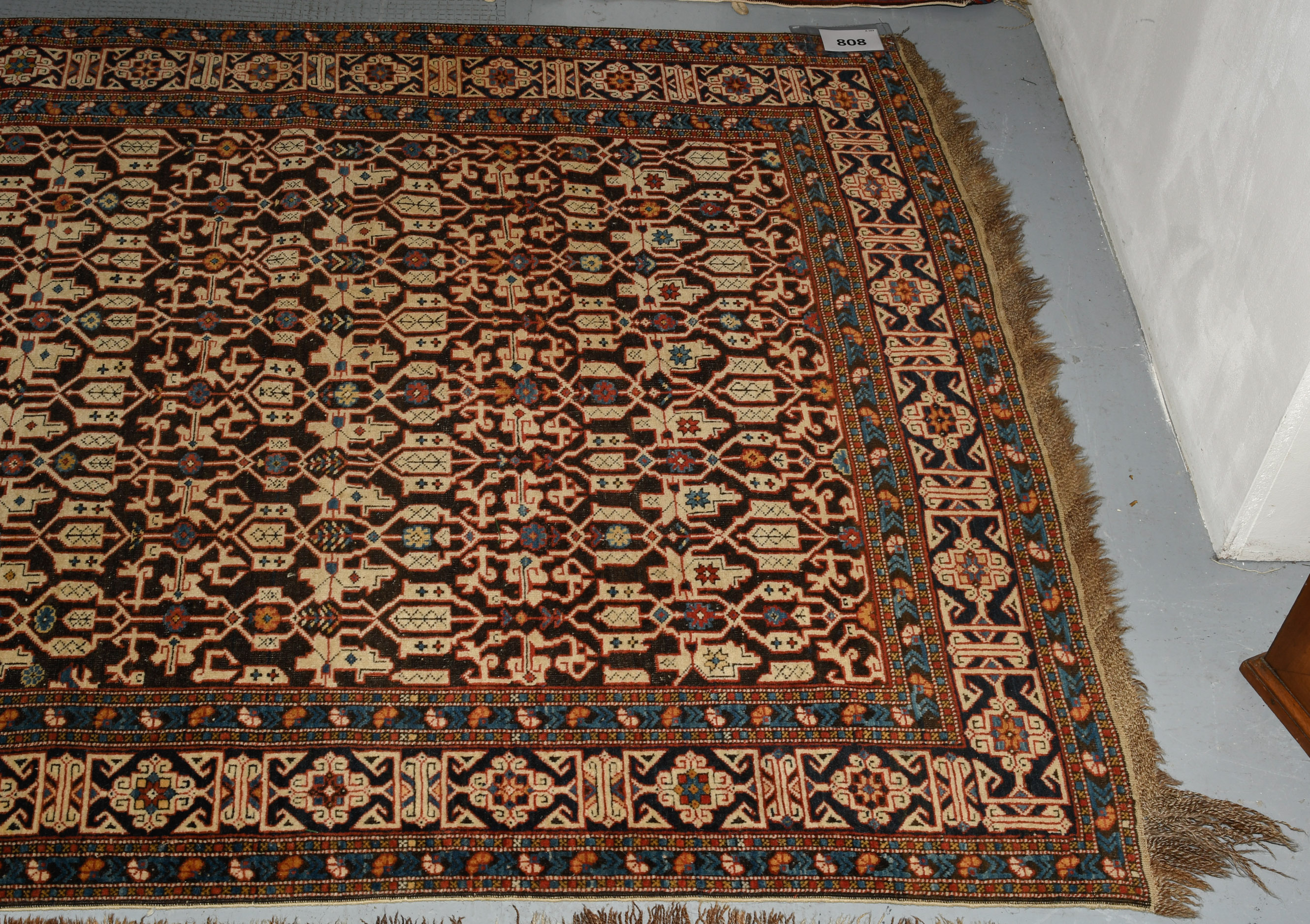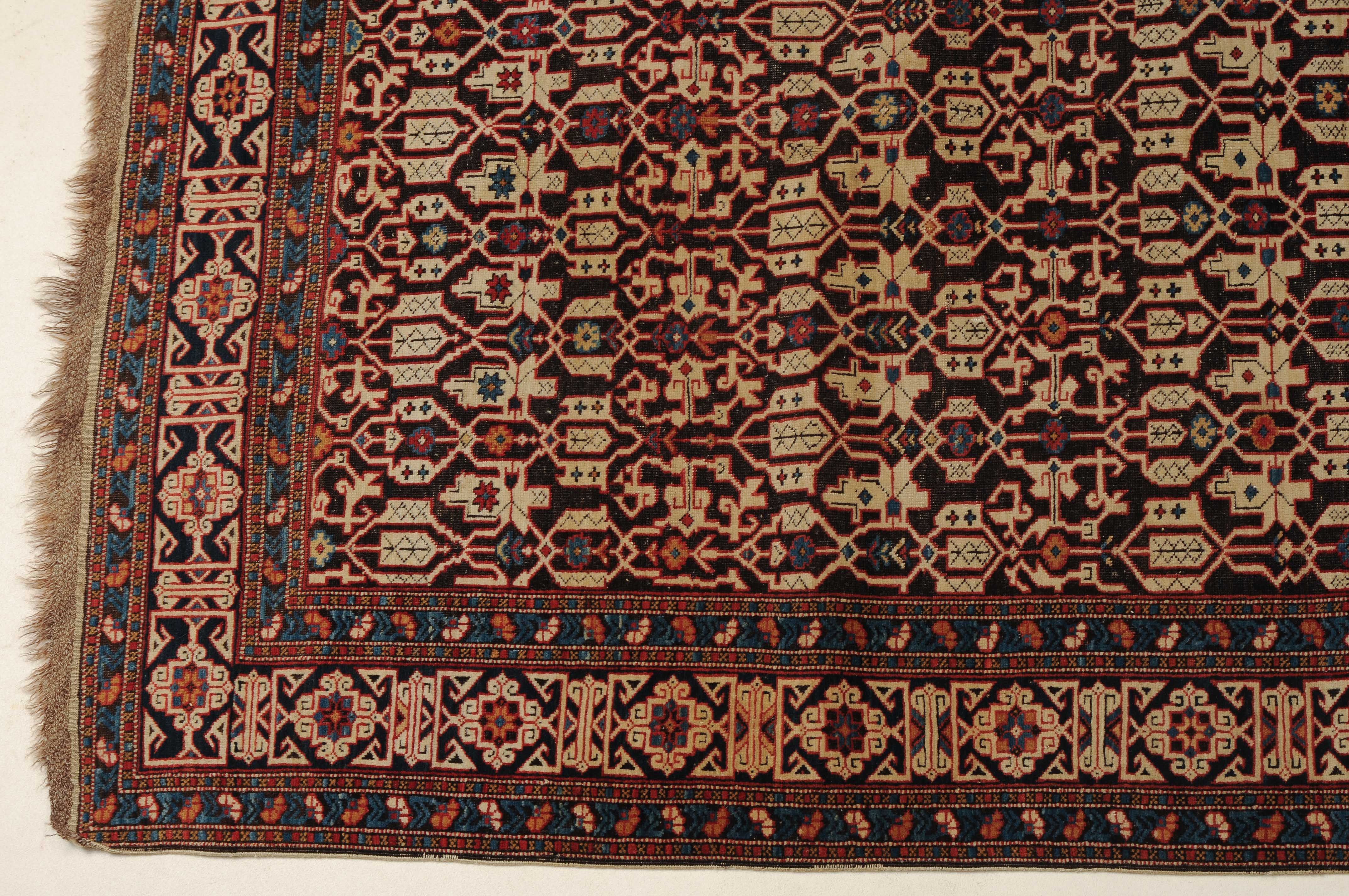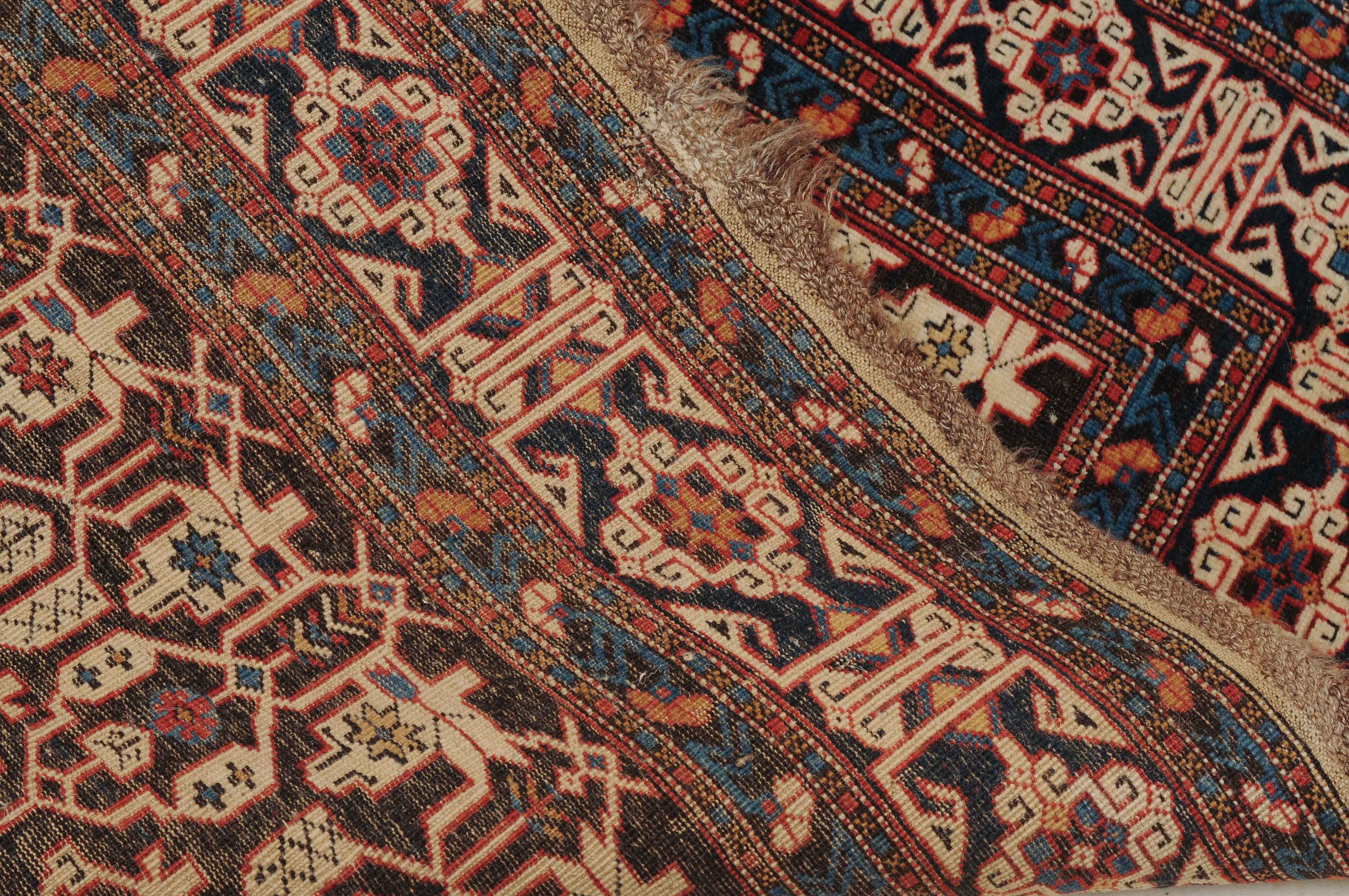 NO-Kaukasus, um 1900. Das dunkelbraune Innenfeld ist durchgehend mit dekorativ aneinander gereihten weissen Tschitschi-Ornamenten in unendlichem Rapport überzogen. Die charakteristische schwarze Kufi-Konagend-Hauptbordüre wird von 2 in Rot und Blau gehaltenen Nelkenborten gesäumt. Gebrauchsspuren. 126x161 cm (ft. 4.2x5.3).