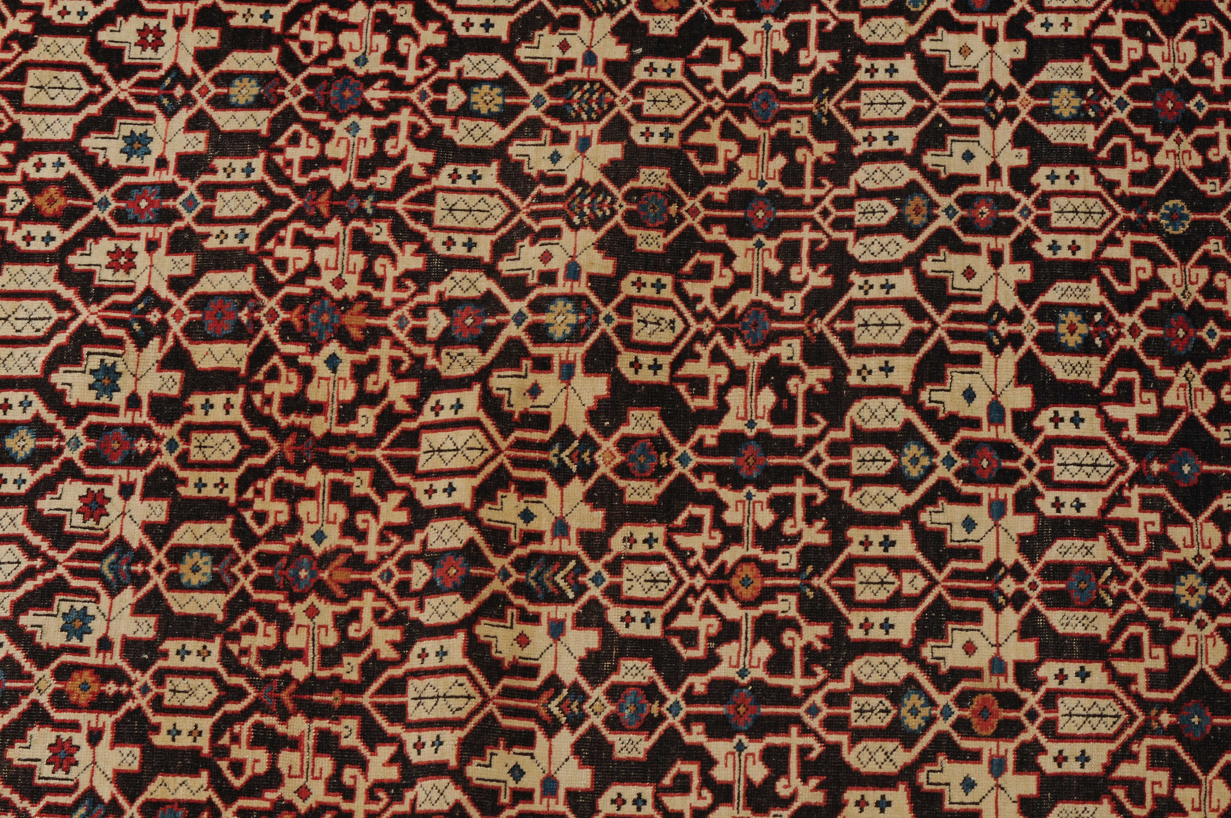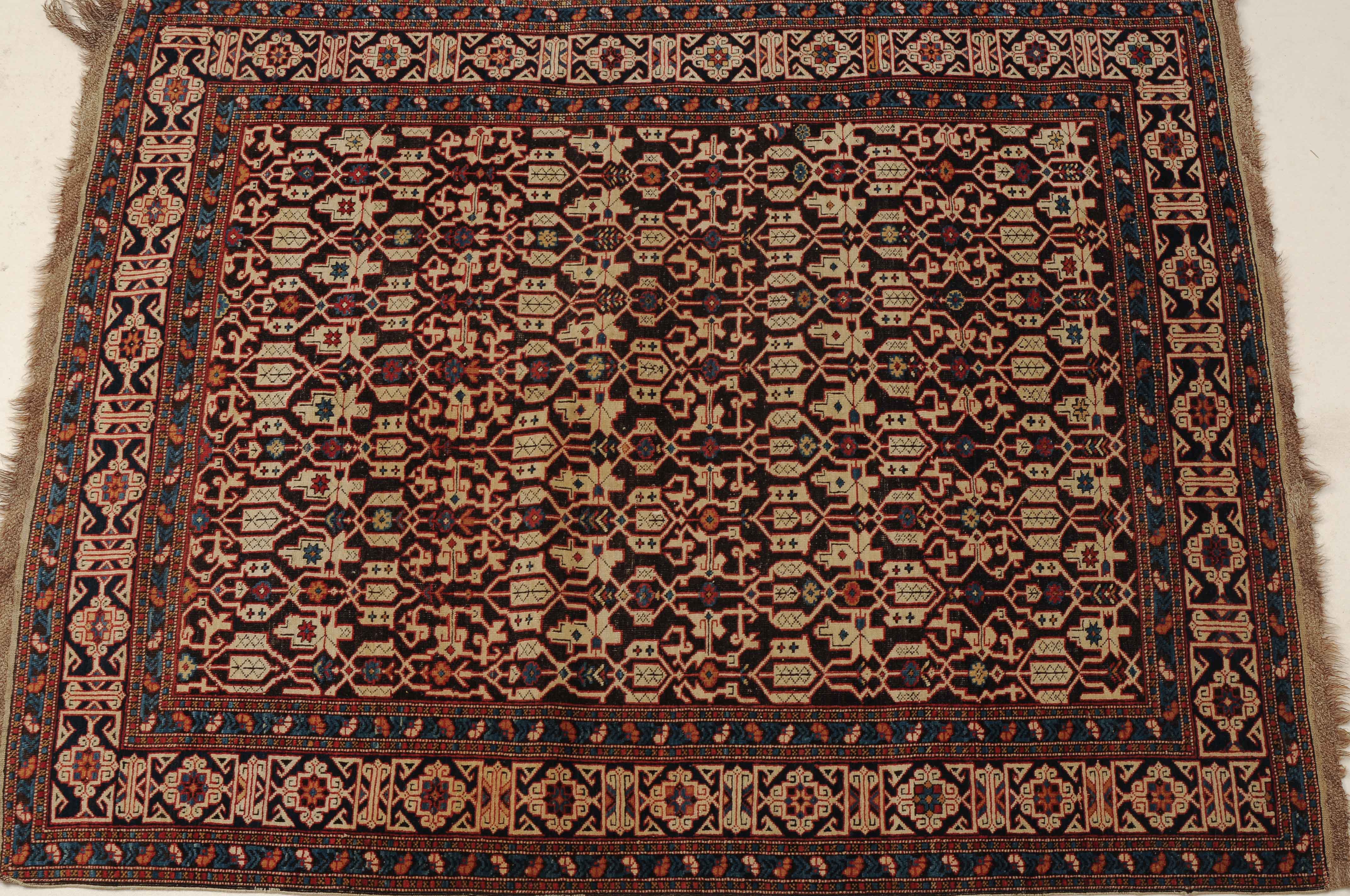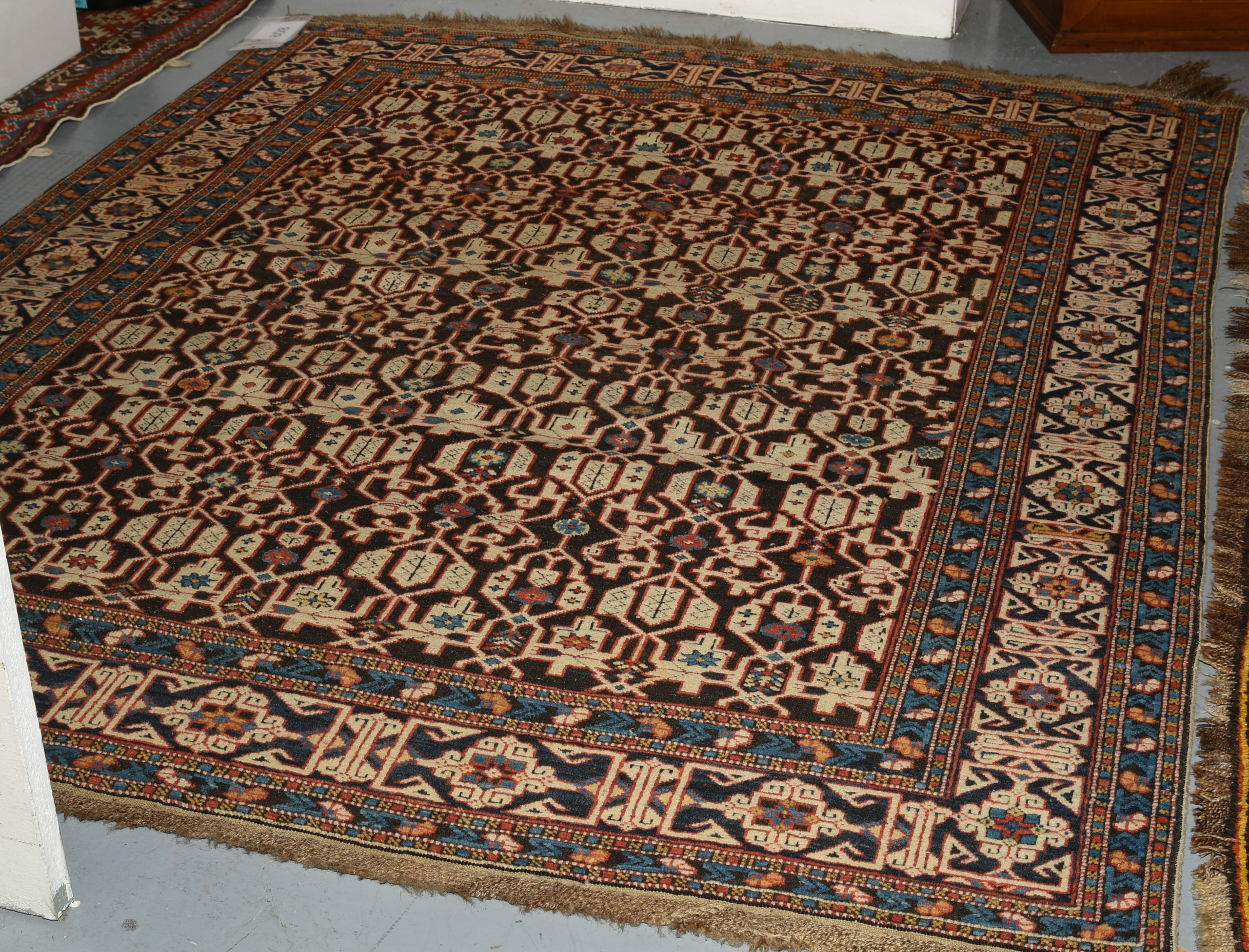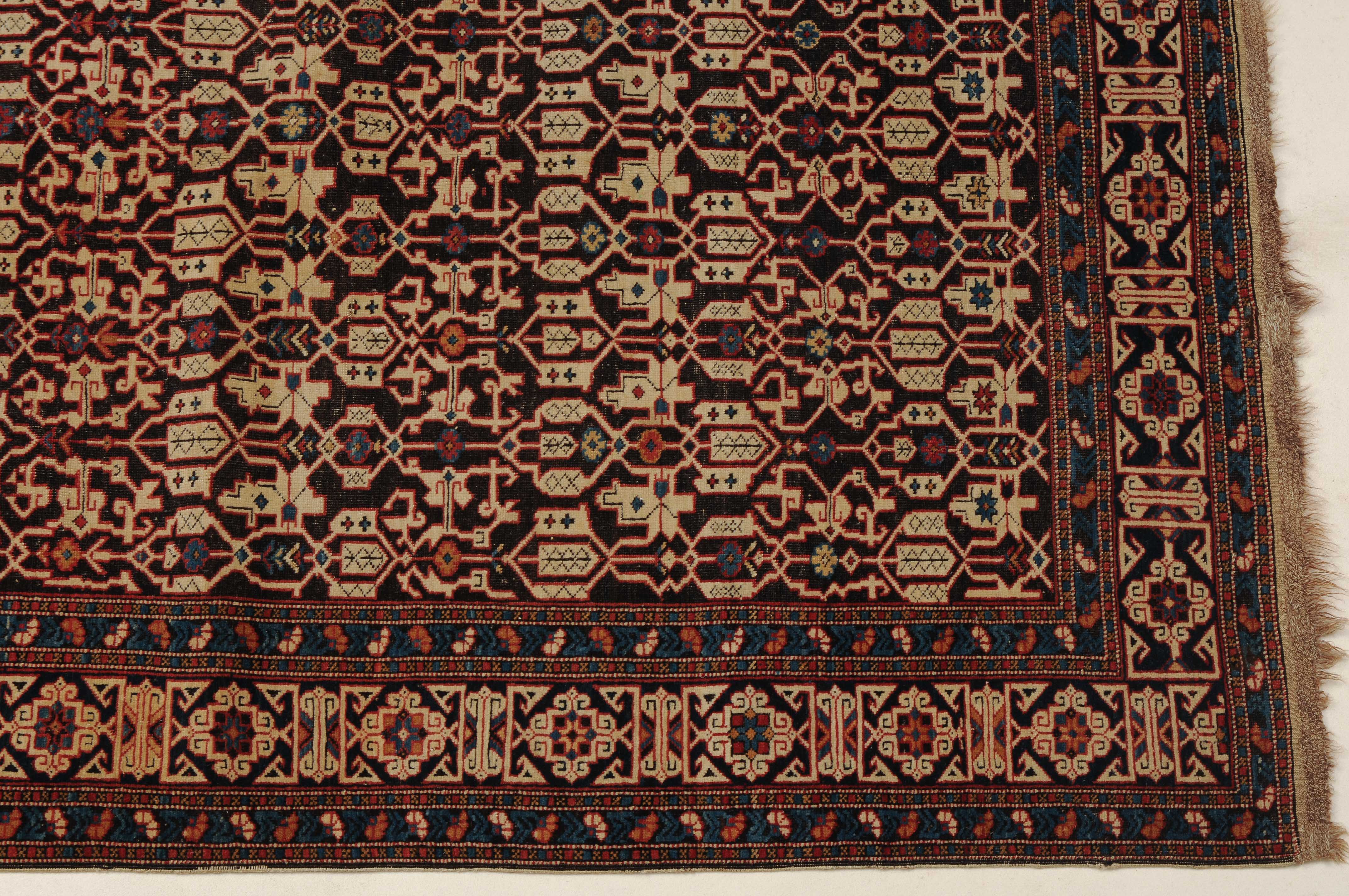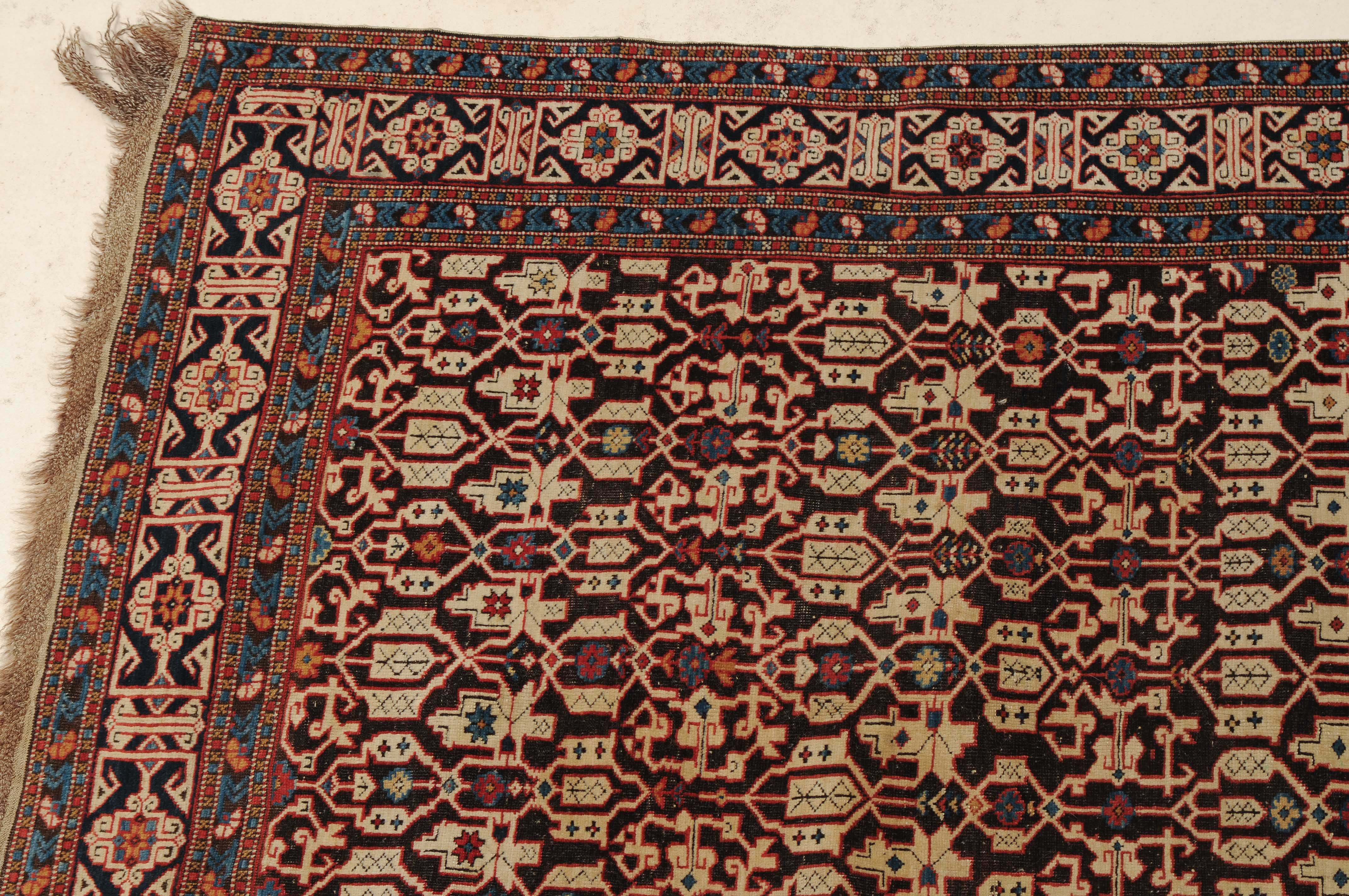 NO-Kaukasus, um 1900. Das dunkelbraune Innenfeld ist durchgehend mit dekorativ aneinander gereihten weissen Tschitschi-Ornamenten in unendlichem Rapport überzogen. Die charakteristische schwarze Kufi-Konagend-Hauptbordüre wird von 2 in Rot und Blau gehaltenen Nelkenborten gesäumt. Gebrauchsspuren. 126x161 cm (ft. 4.2x5.3).