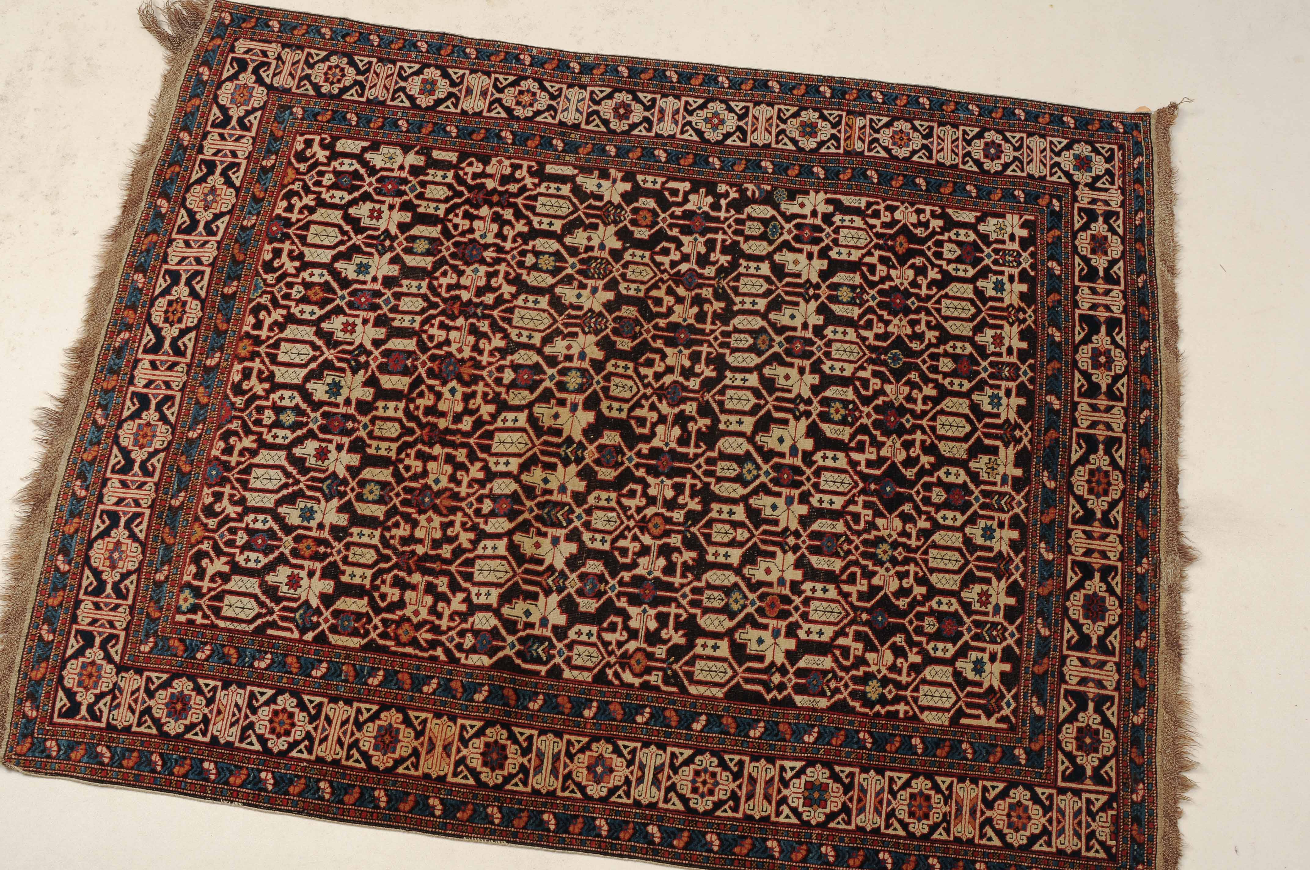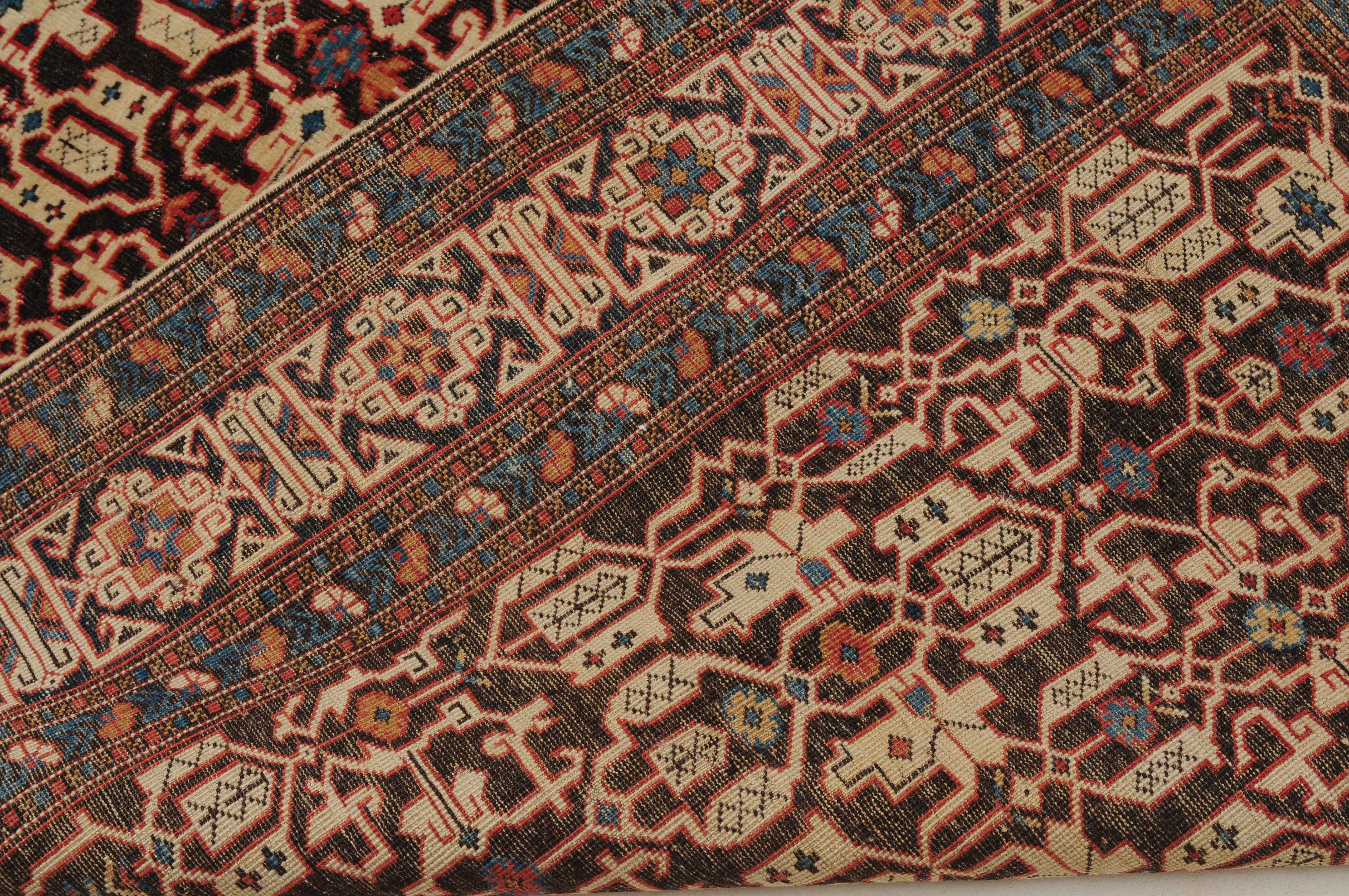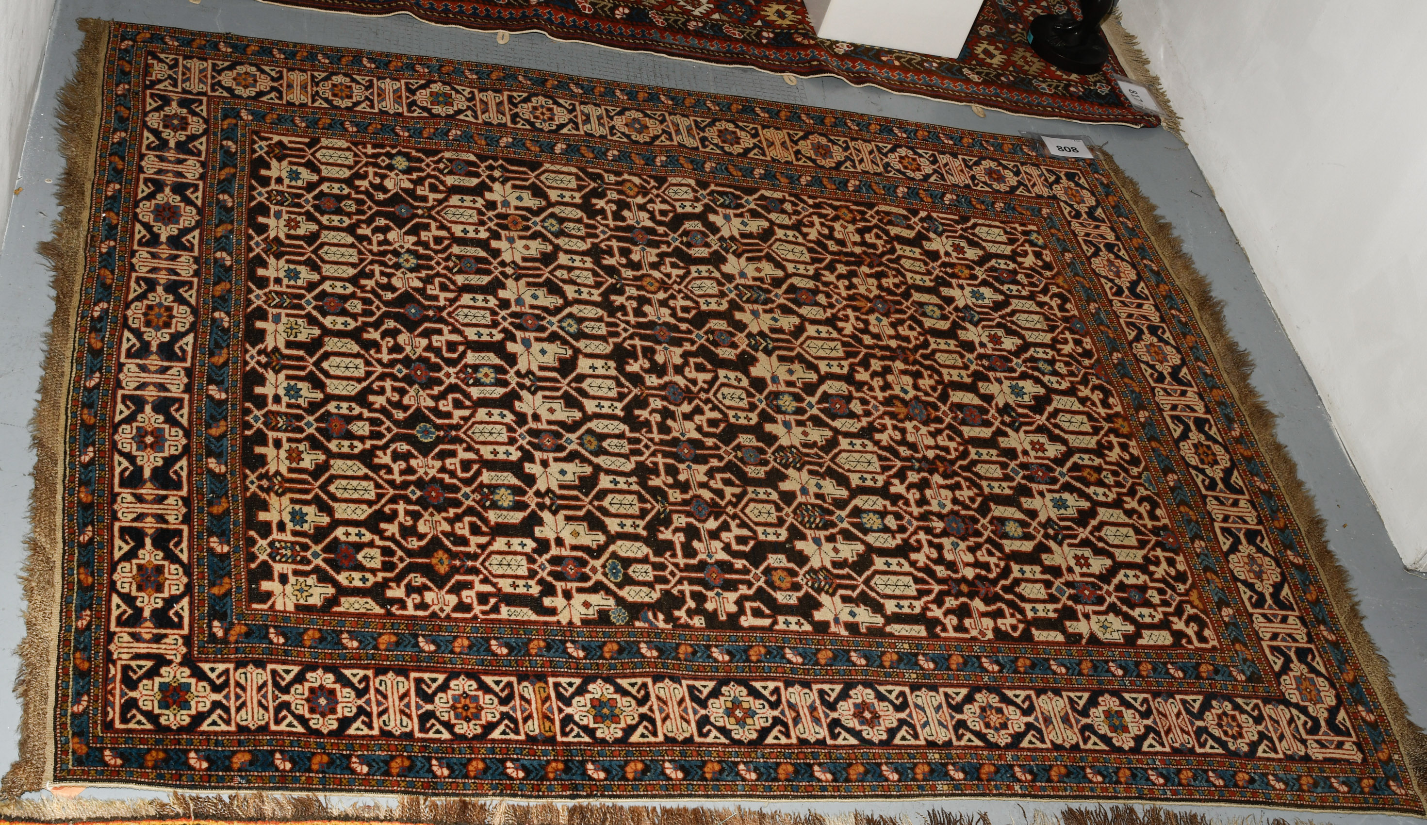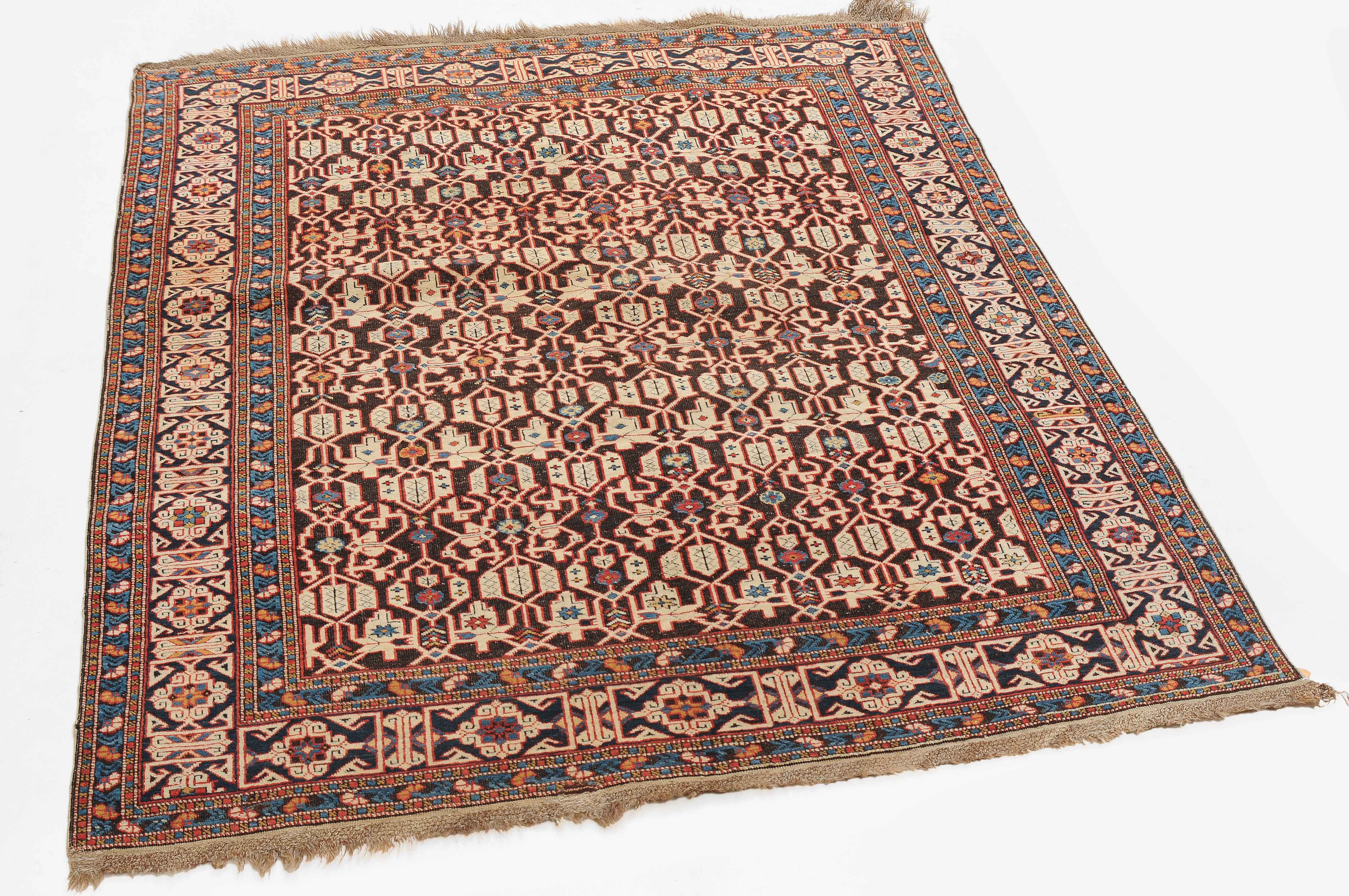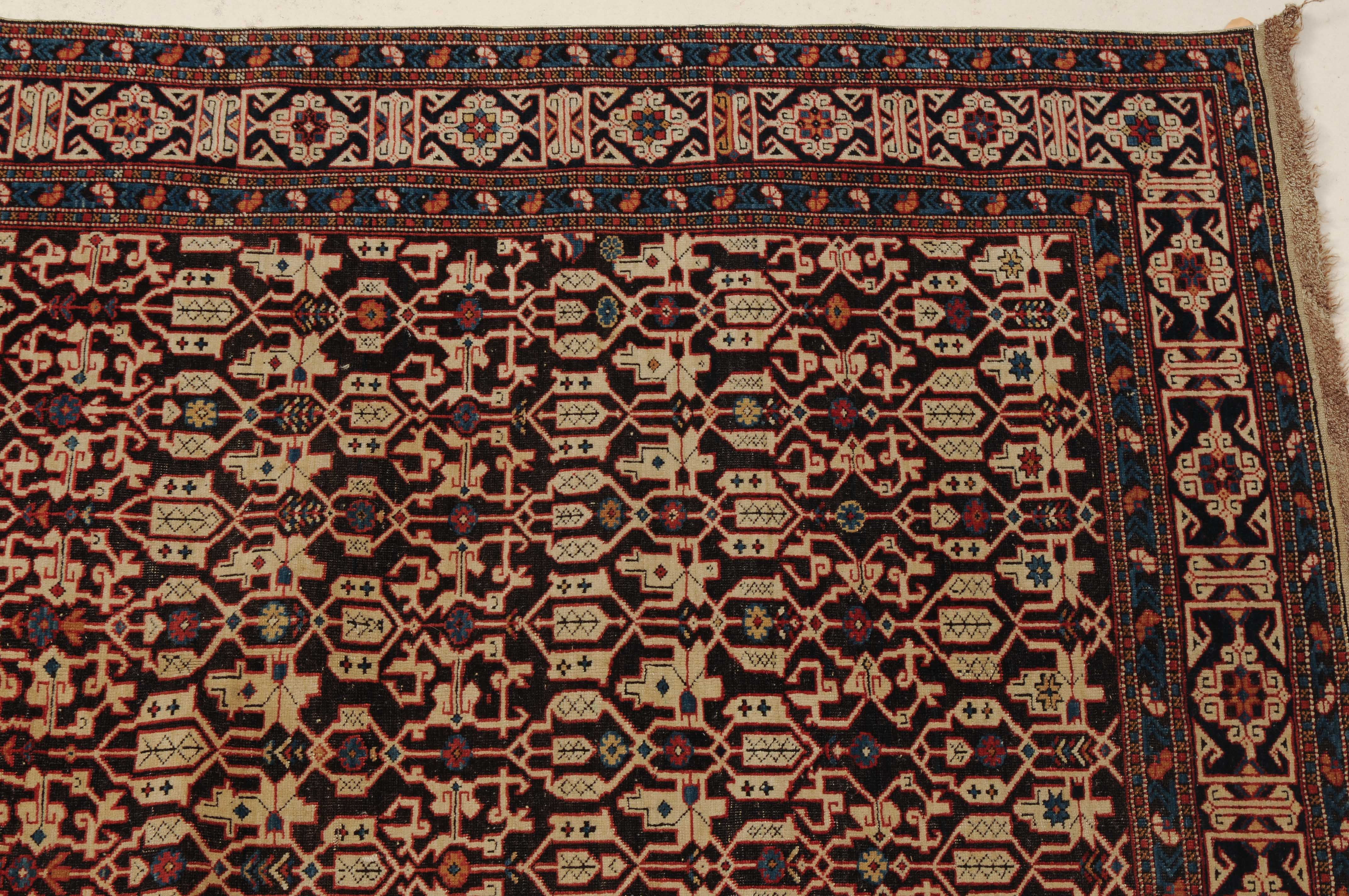 NO-Kaukasus, um 1900. Das dunkelbraune Innenfeld ist durchgehend mit dekorativ aneinander gereihten weissen Tschitschi-Ornamenten in unendlichem Rapport überzogen. Die charakteristische schwarze Kufi-Konagend-Hauptbordüre wird von 2 in Rot und Blau gehaltenen Nelkenborten gesäumt. Gebrauchsspuren. 126x161 cm (ft. 4.2x5.3).