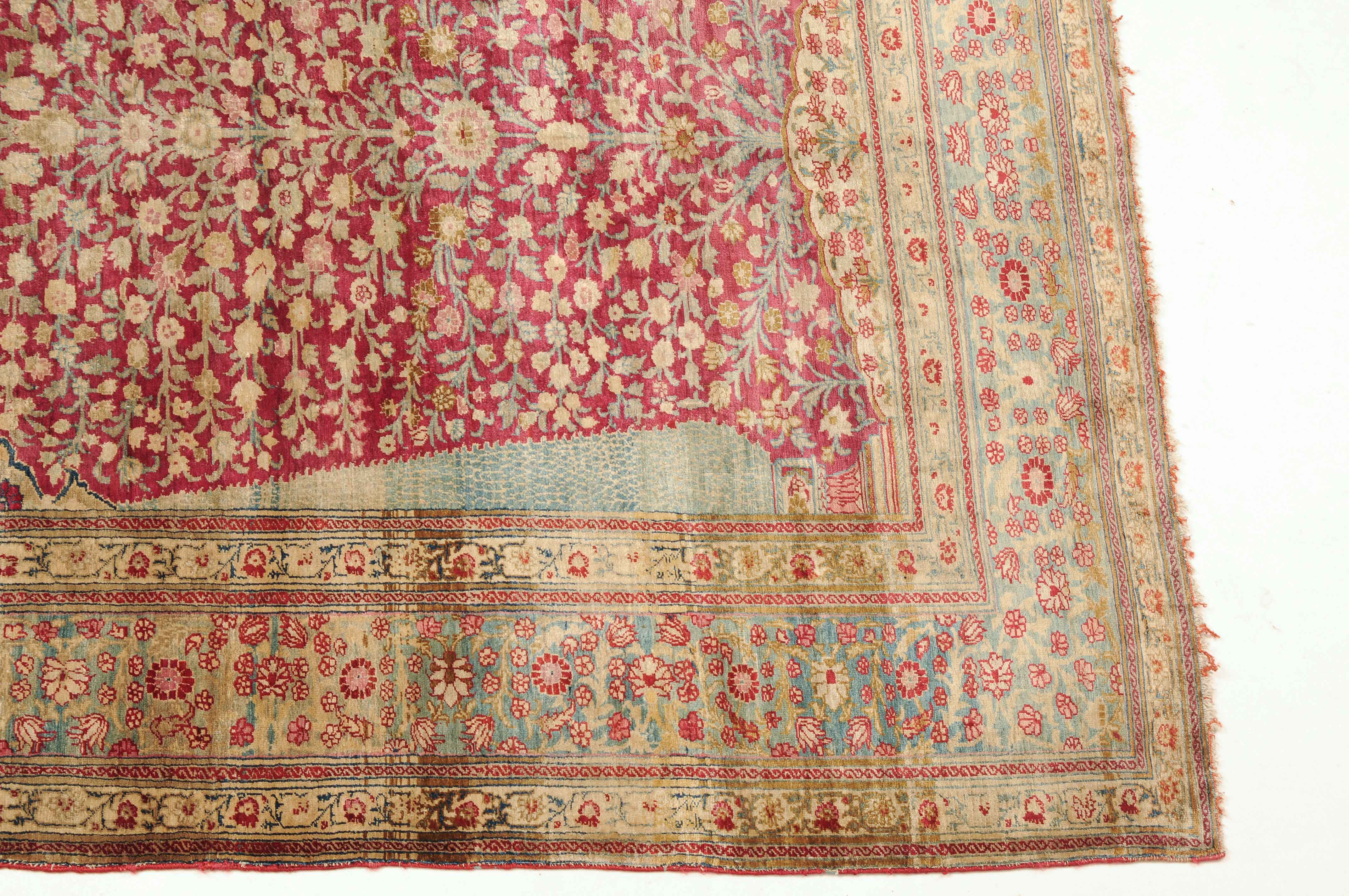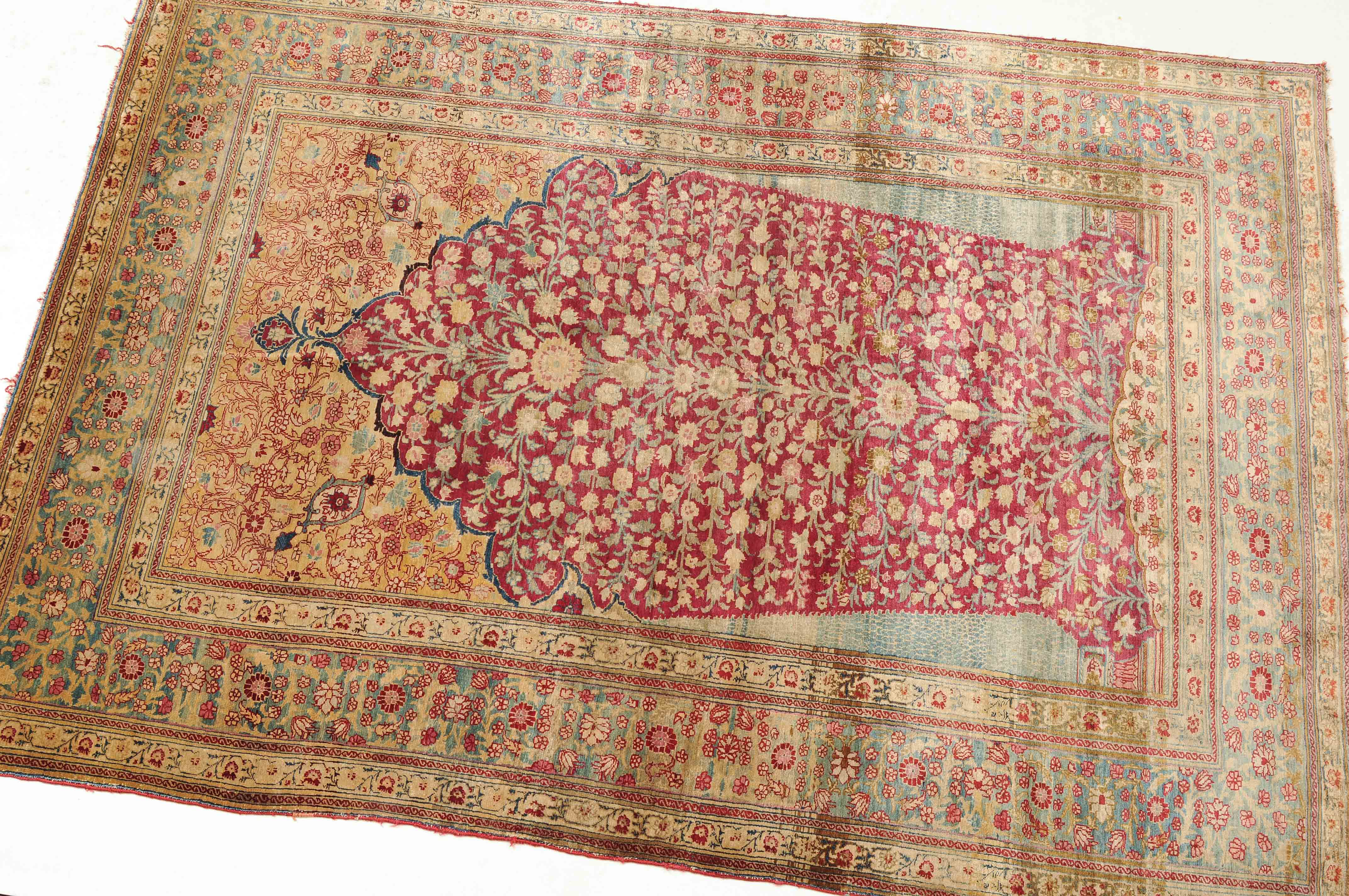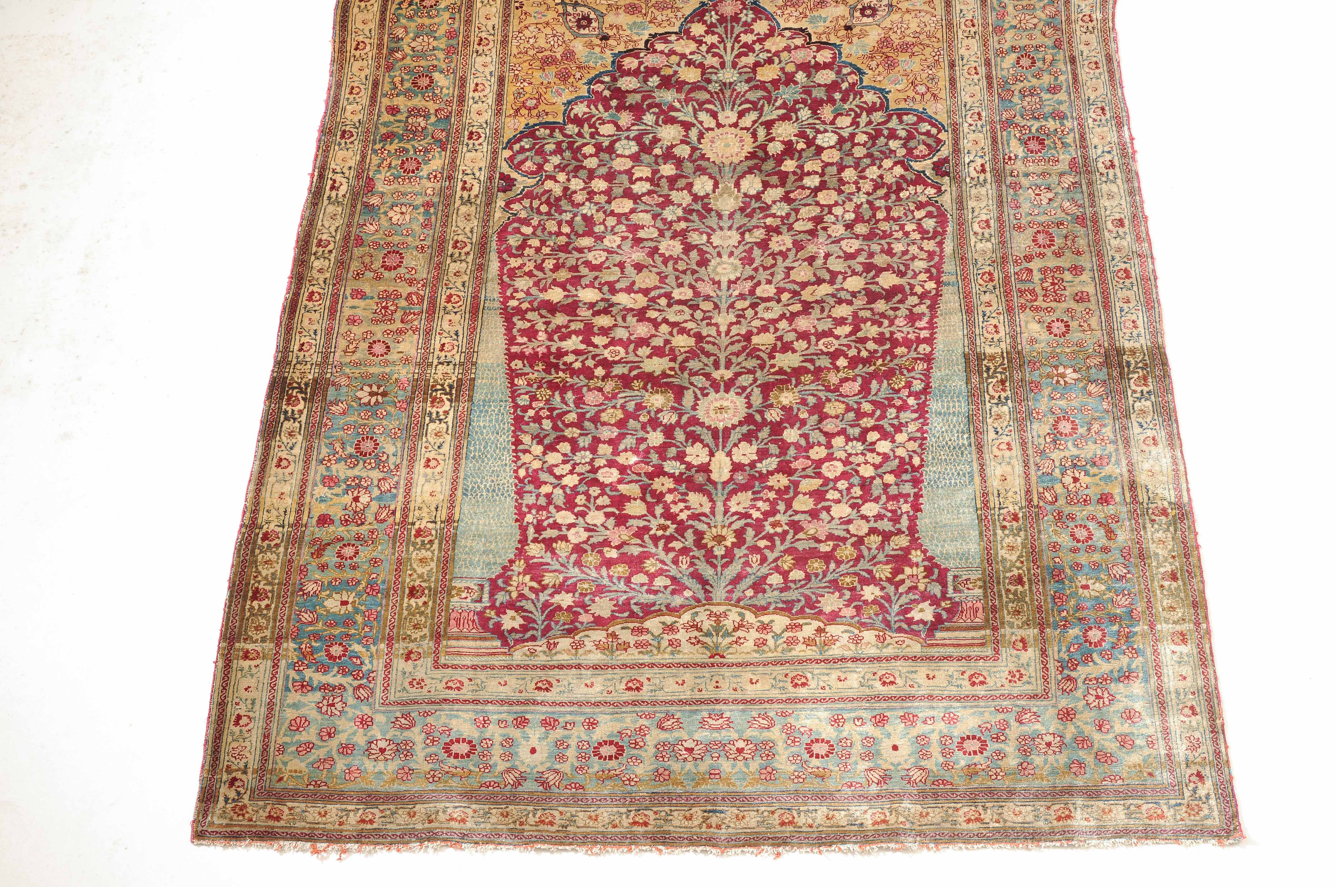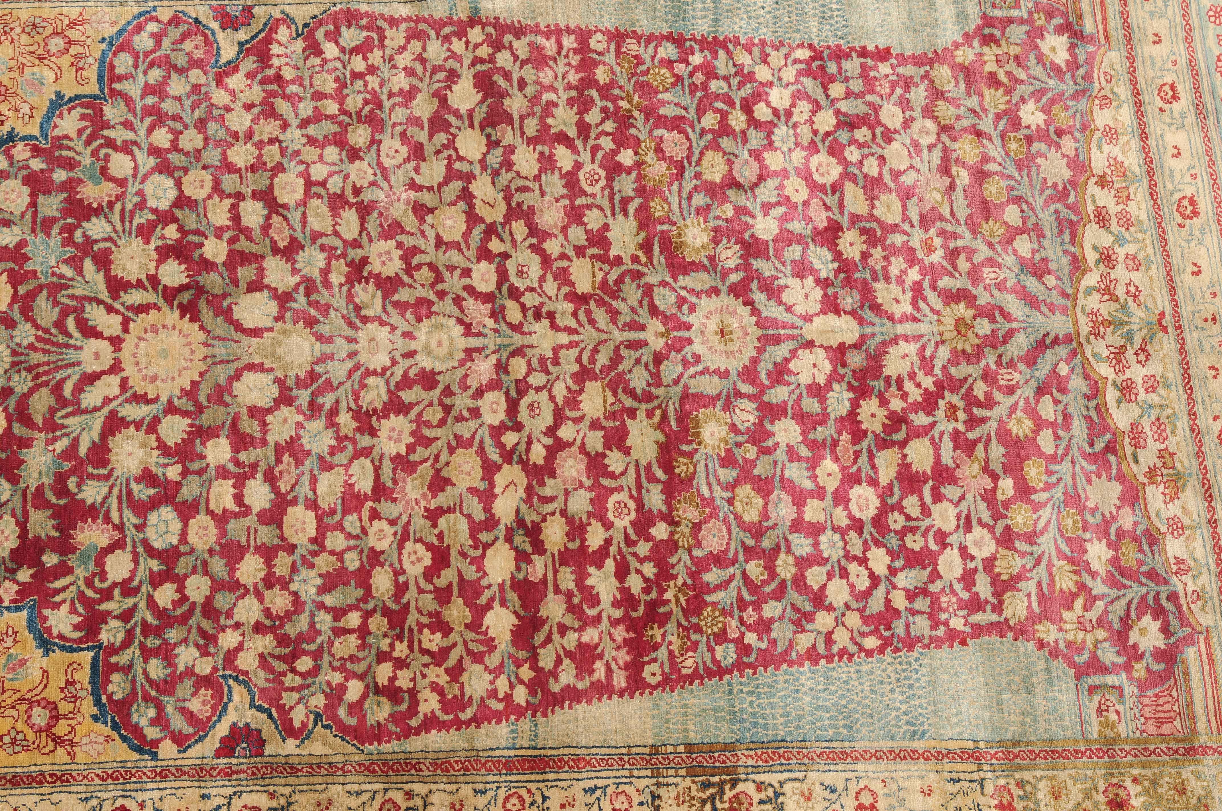 NW-Persien, um 1900. Flormaterial reine Seide. Der in Gelb gehaltene Giebel ist mit kunstvollen Blütenranken verziert und grenzt an die tiefrote, mit filigran gezeichneten Blütenmotiven durchgehend belegte Gebetsnische, die im unteren Teil seitlich von 2 hellblauen Zypressen flankiert wird. 2 florale Nebenbordüren säumen die dekorativ belegte hellblaue Blütenbandbordüre. Sehr gute Erhaltung. 130x188 cm (ft. 4.3x6.2).