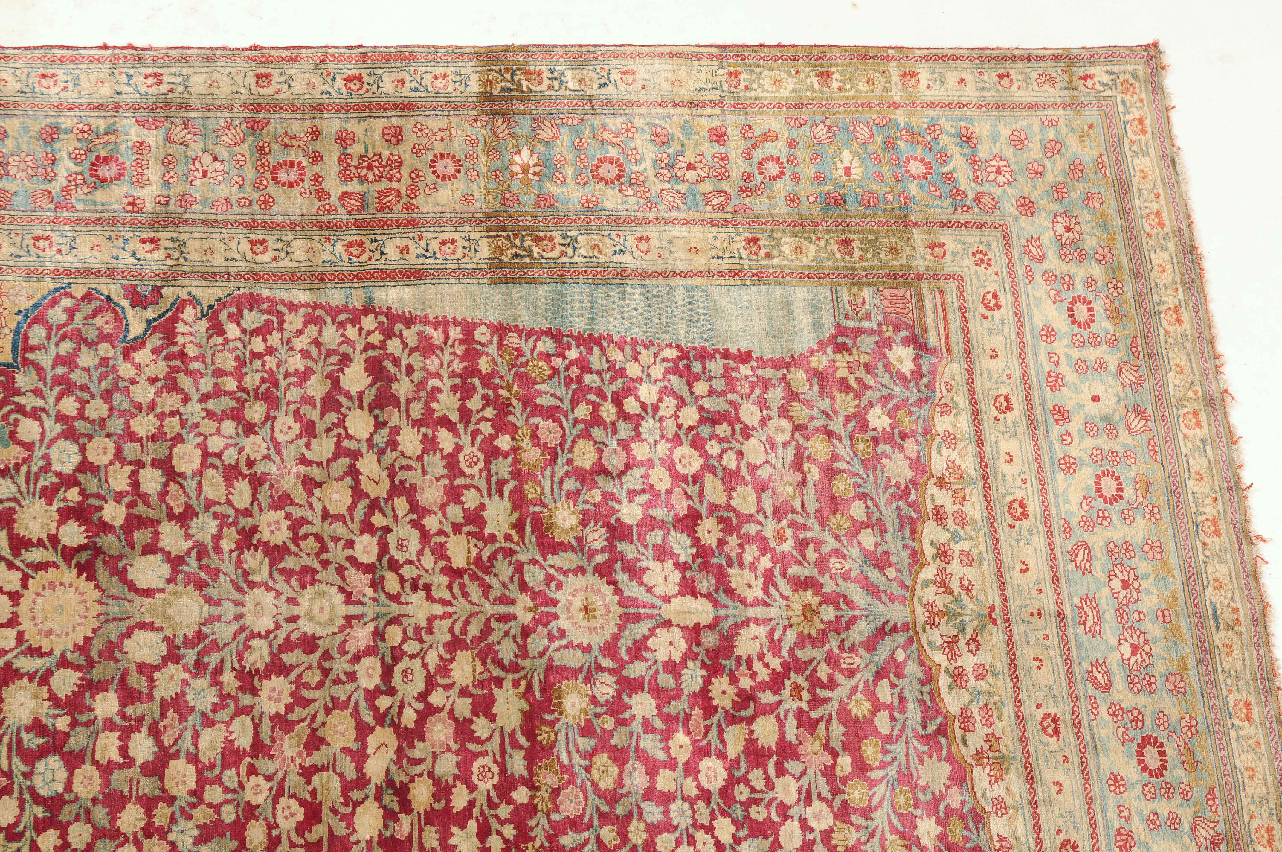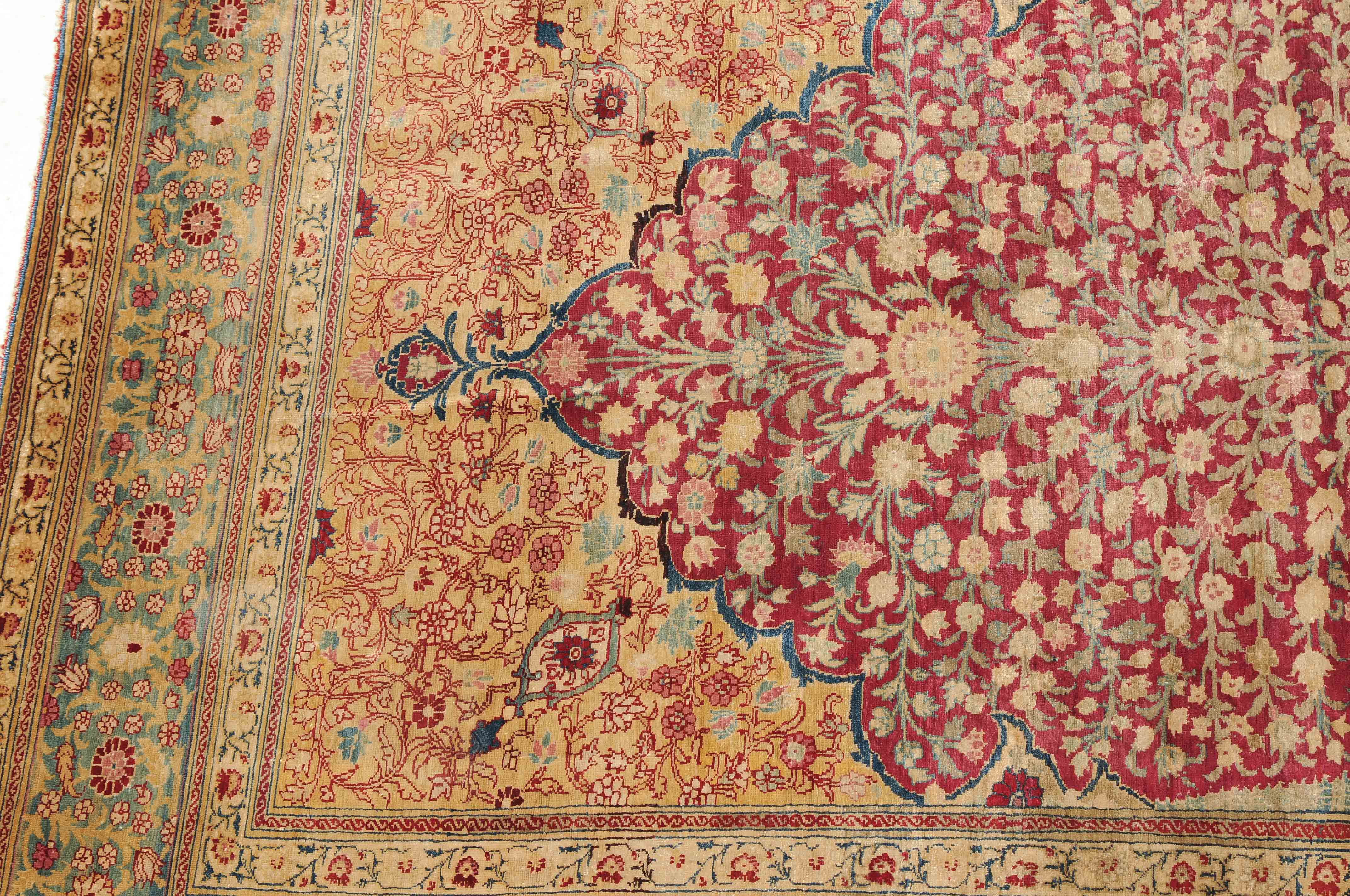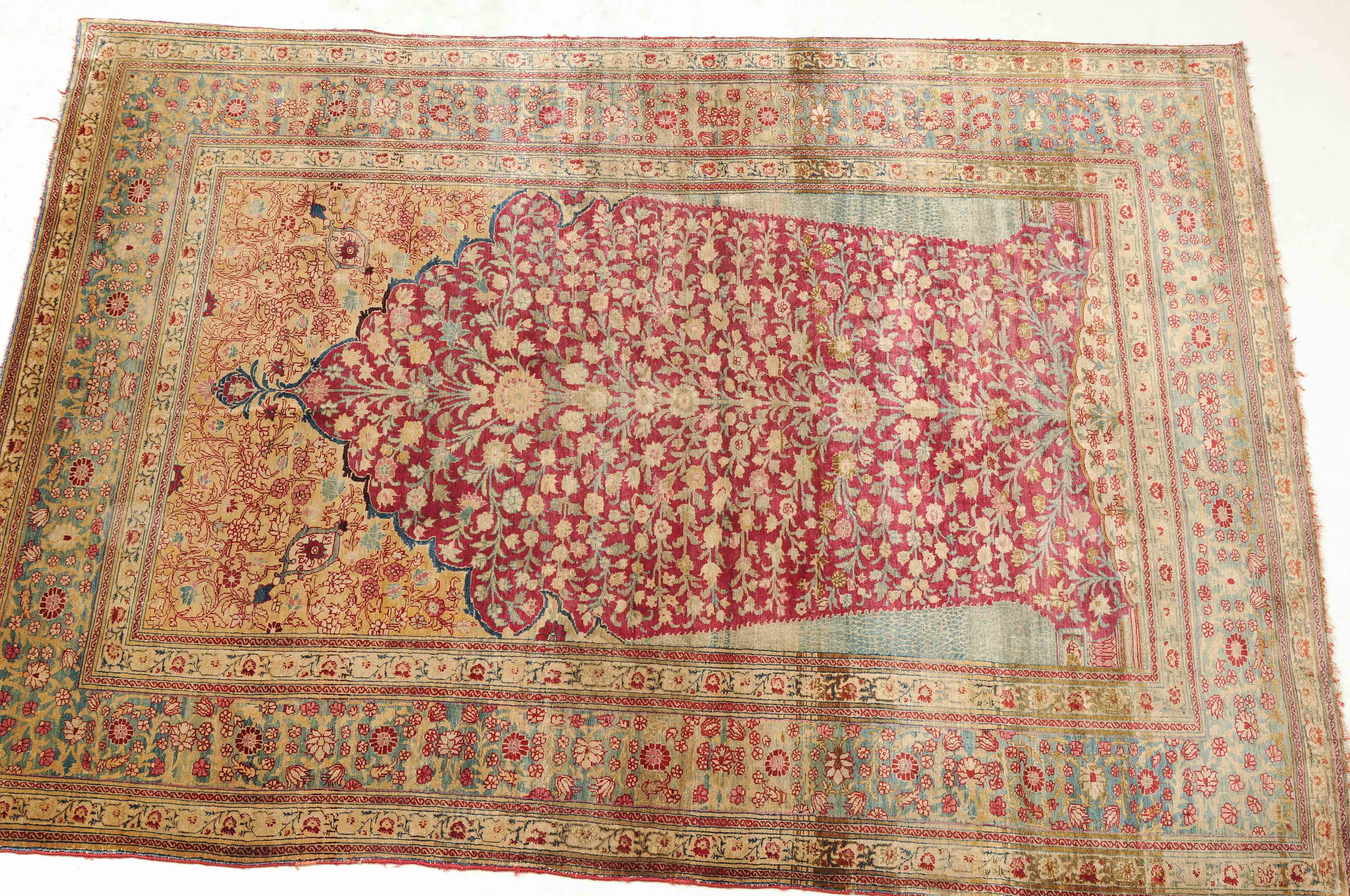 NW-Persien, um 1900. Flormaterial reine Seide. Der in Gelb gehaltene Giebel ist mit kunstvollen Blütenranken verziert und grenzt an die tiefrote, mit filigran gezeichneten Blütenmotiven durchgehend belegte Gebetsnische, die im unteren Teil seitlich von 2 hellblauen Zypressen flankiert wird. 2 florale Nebenbordüren säumen die dekorativ belegte hellblaue Blütenbandbordüre. Sehr gute Erhaltung. 130x188 cm (ft. 4.3x6.2).