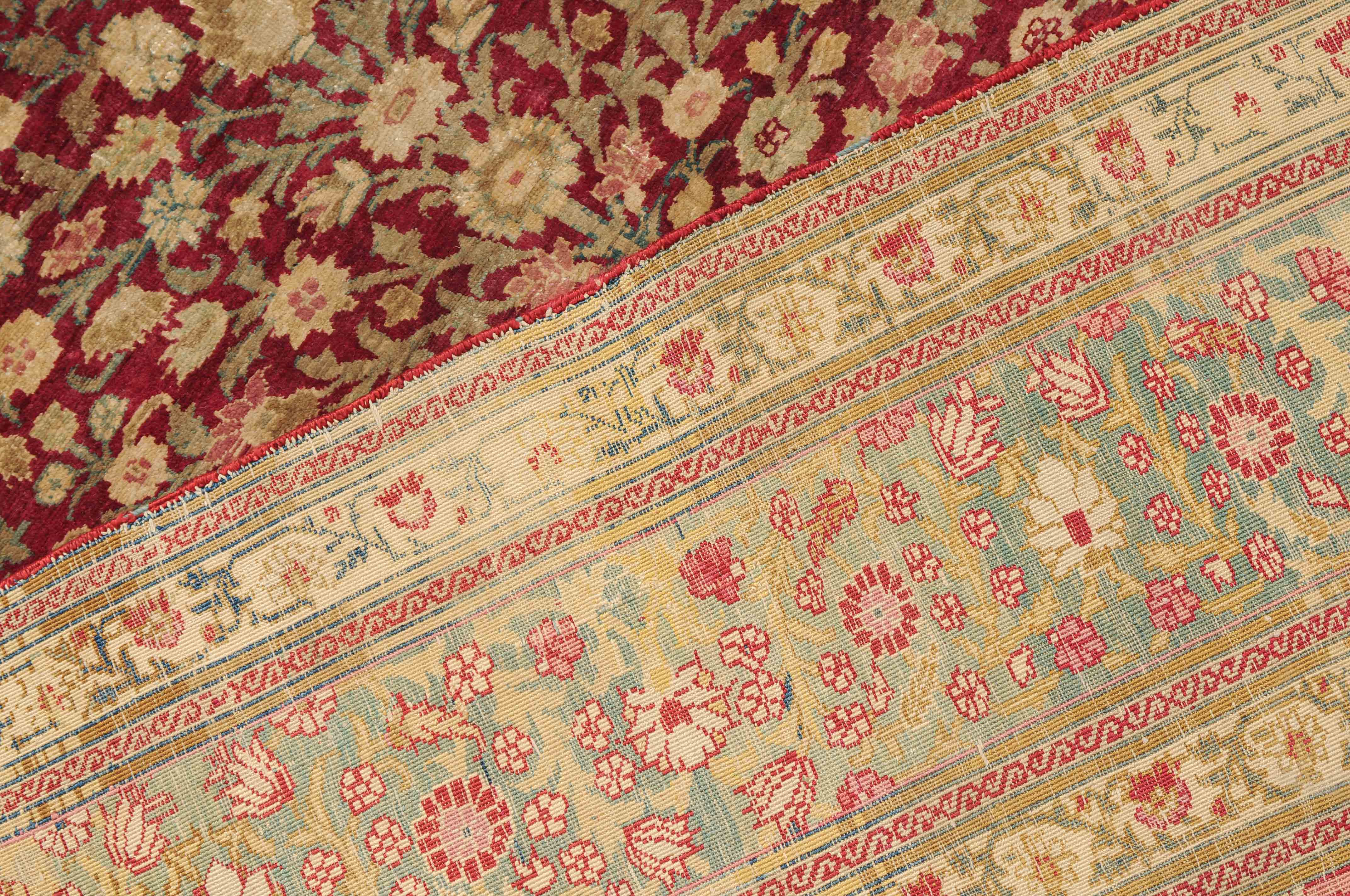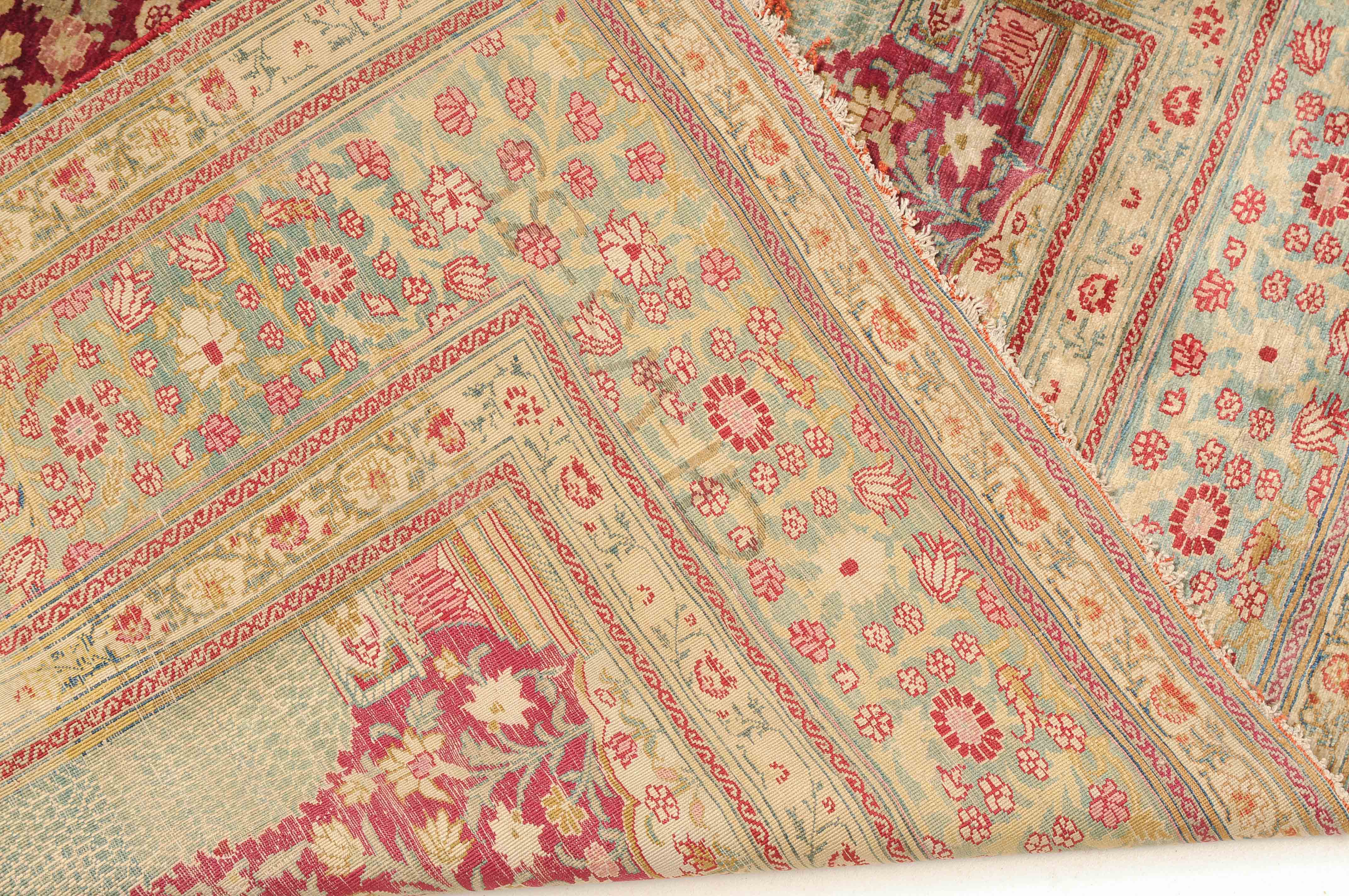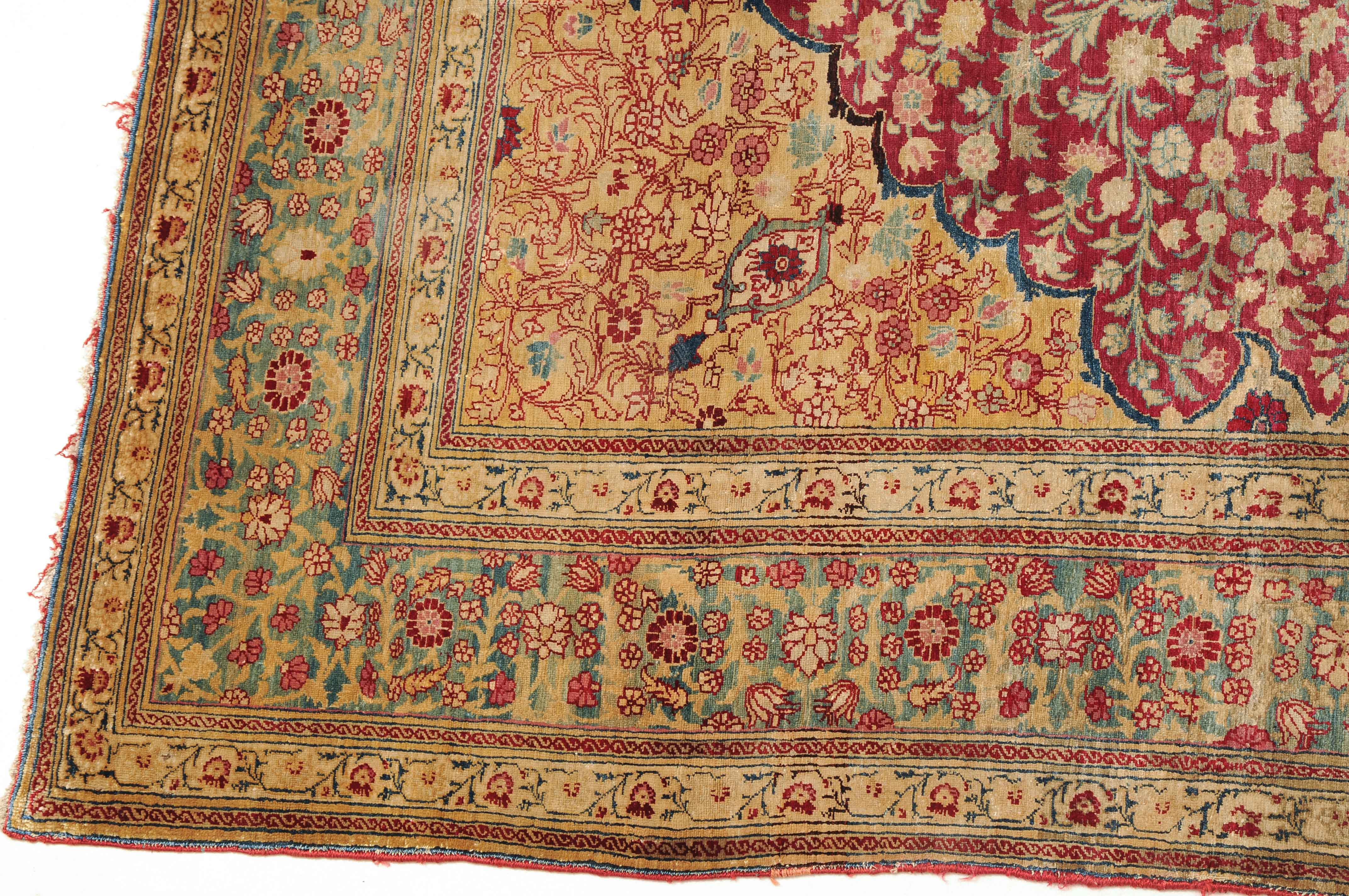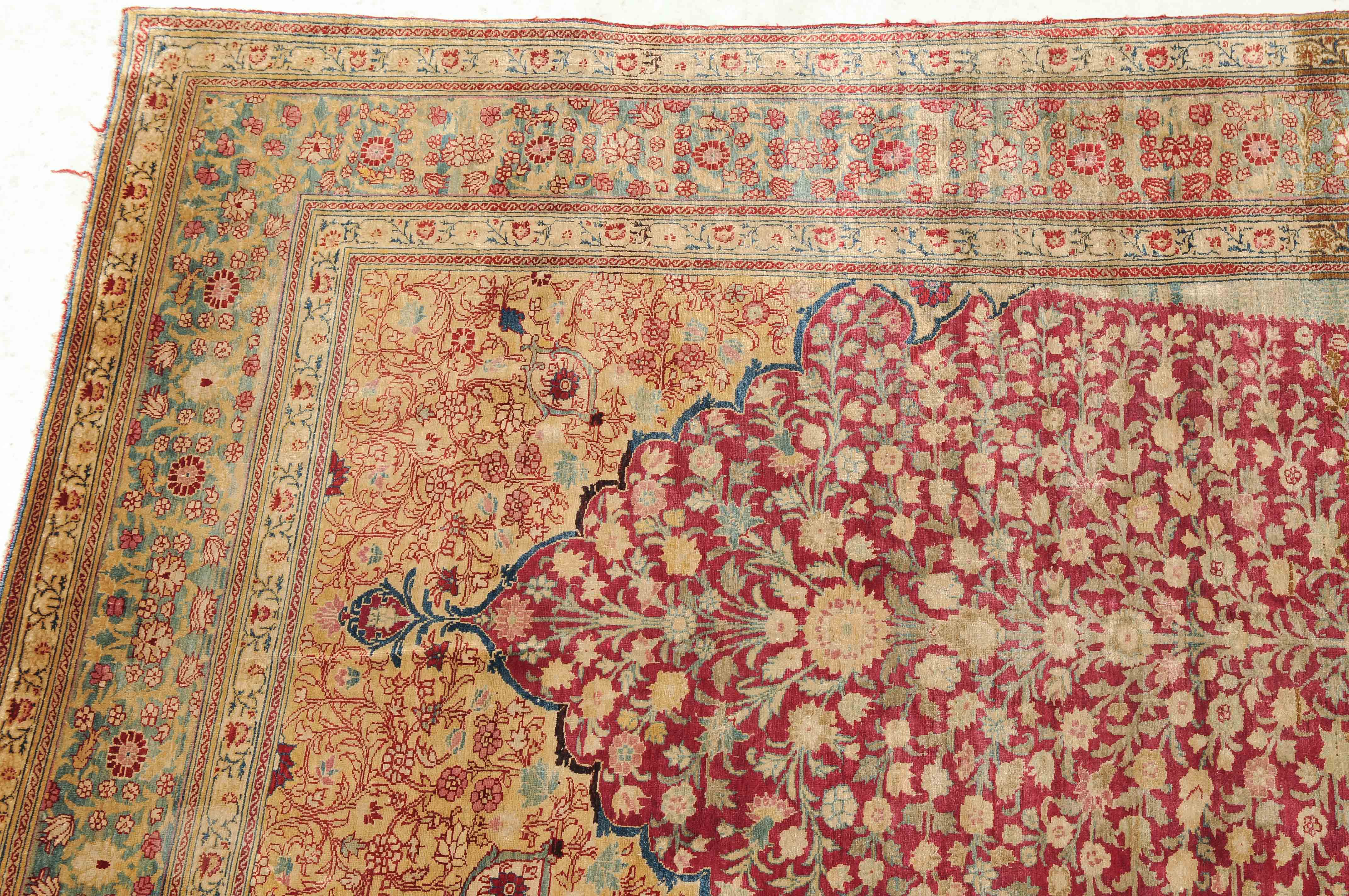 NW-Persien, um 1900. Flormaterial reine Seide. Der in Gelb gehaltene Giebel ist mit kunstvollen Blütenranken verziert und grenzt an die tiefrote, mit filigran gezeichneten Blütenmotiven durchgehend belegte Gebetsnische, die im unteren Teil seitlich von 2 hellblauen Zypressen flankiert wird. 2 florale Nebenbordüren säumen die dekorativ belegte hellblaue Blütenbandbordüre. Sehr gute Erhaltung. 130x188 cm (ft. 4.3x6.2).