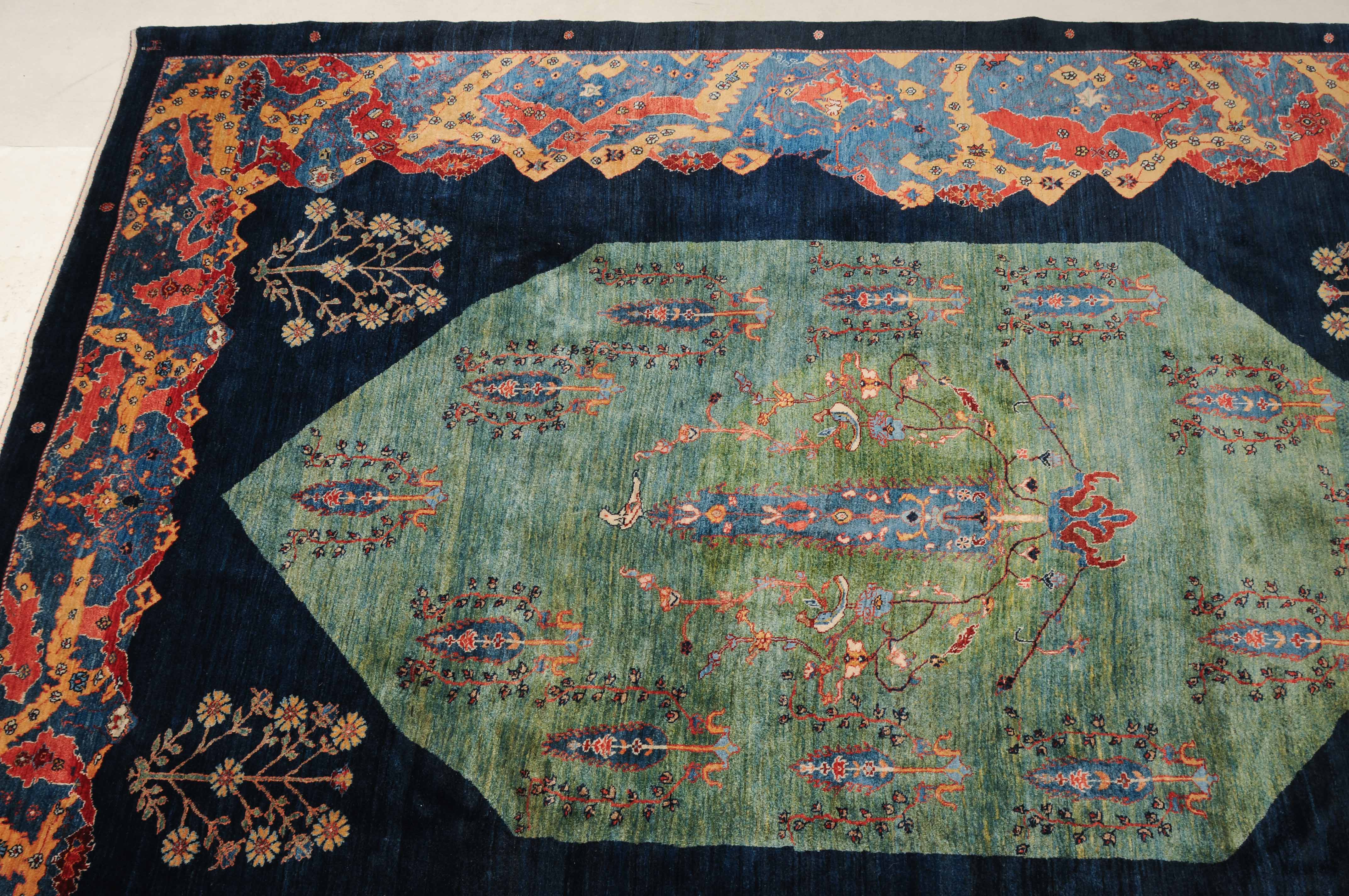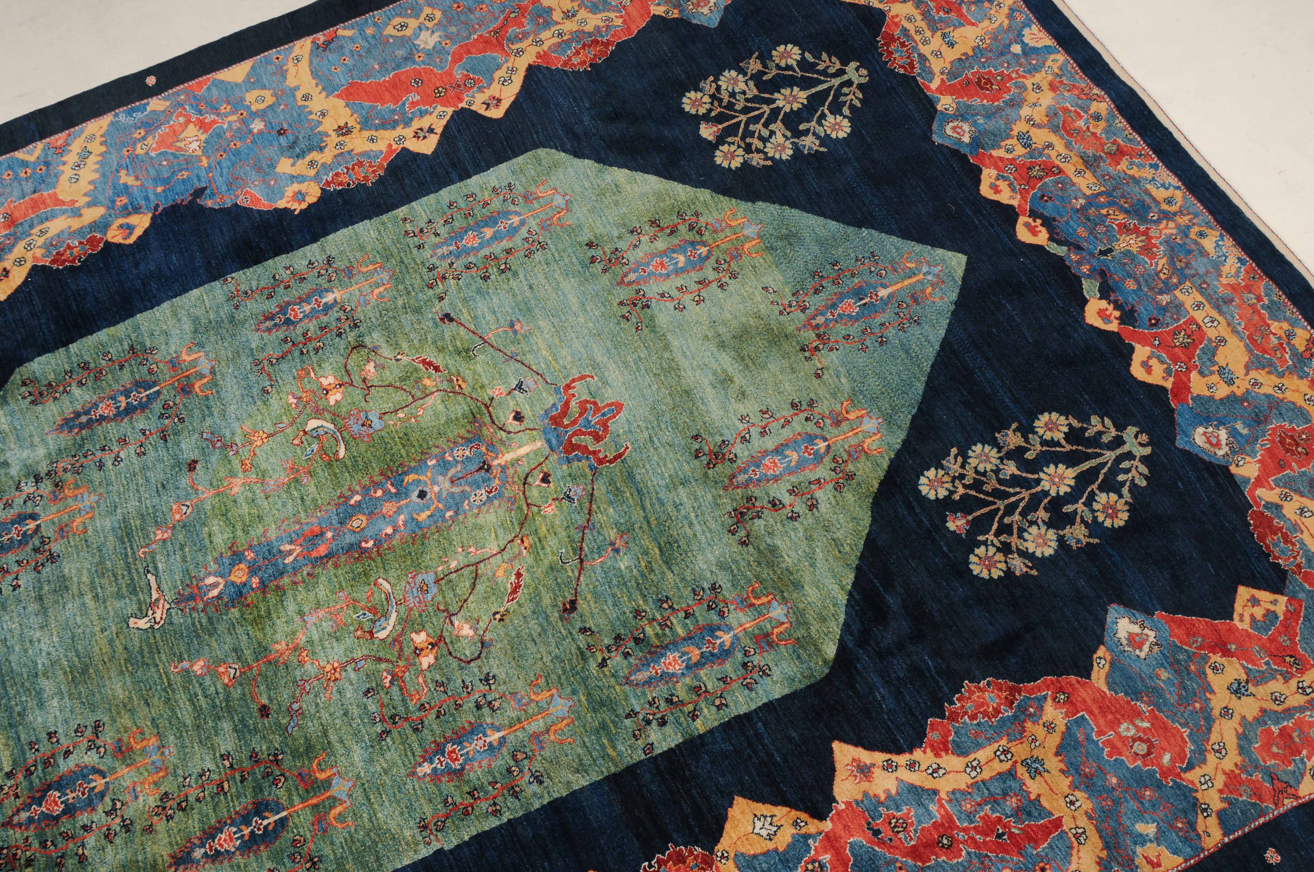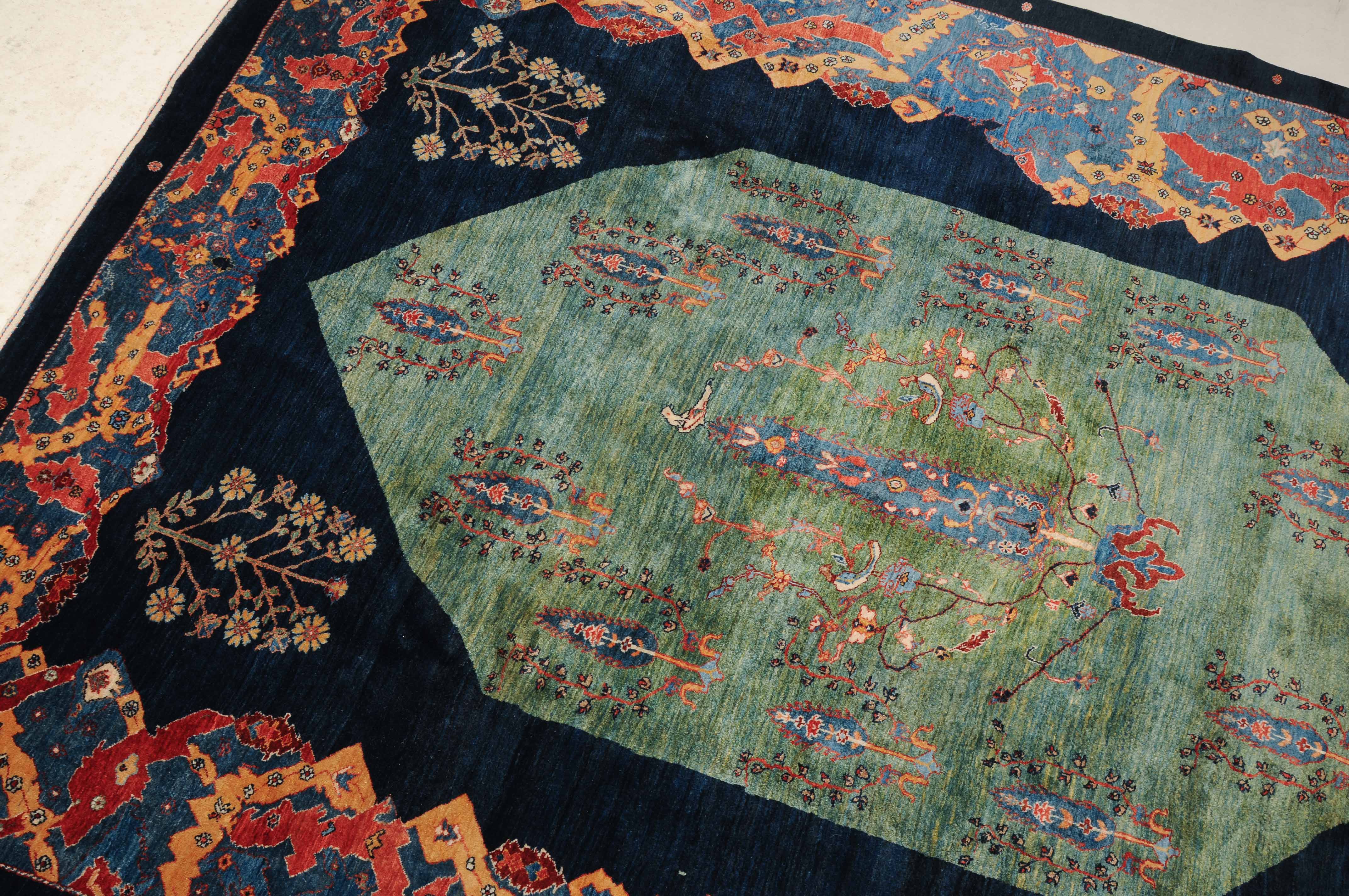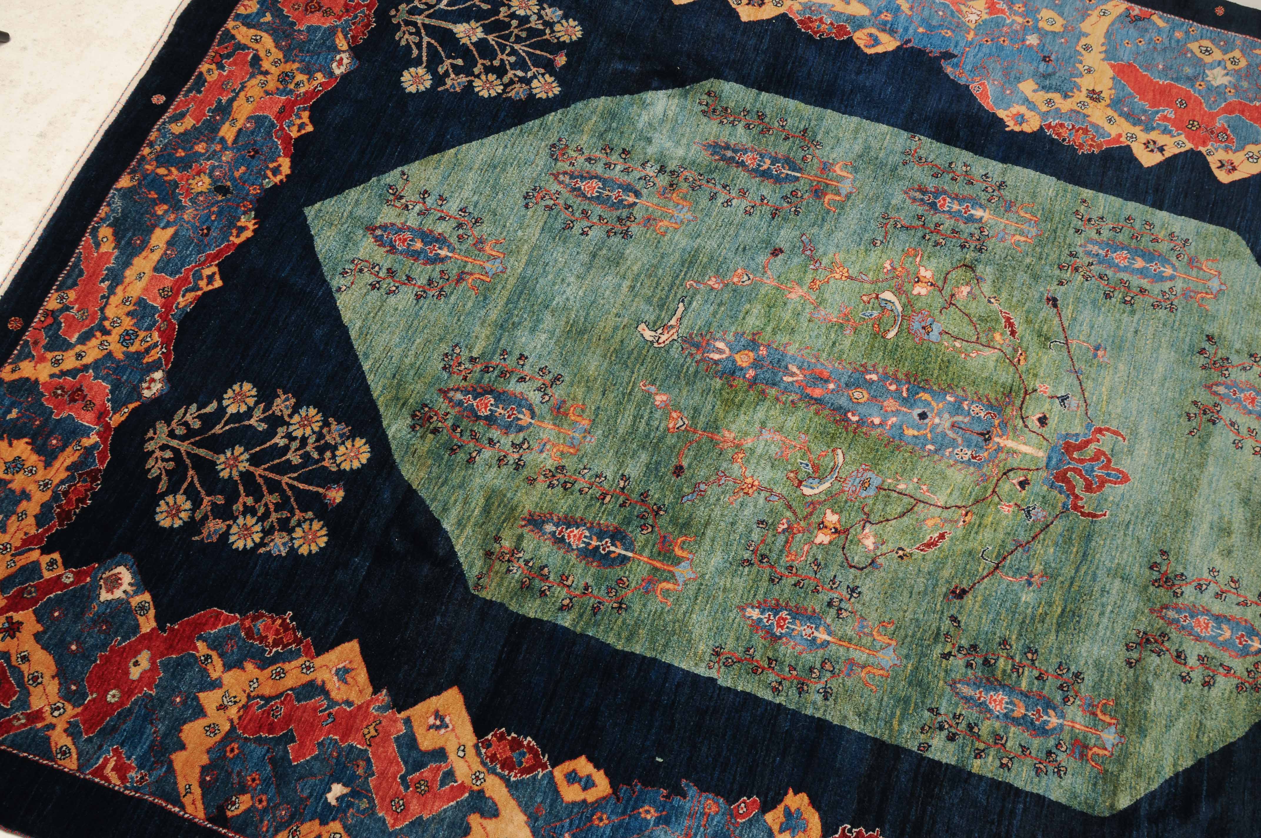 S-Persien, um 1980. Sehr fein geknüpfter Teppich. Im dunkelblauen Mittelfeld ruht ein türkisgrünes Hexagon, das im Inneren mit stilisierten hellblauen Bäumen und einem feingliedrigen Rankenwerk auf dekorative Weise geschmückt ist, flankiert von filigranen Blütenstauden in den 4 Ecken. Die hellblaue Hauptbordüre ist mit einem geschlungenen Rankendekor in Gelb und Rot belegt. Sehr gute Erhaltung. 225x294 cm (ft. 7.4x9.7).