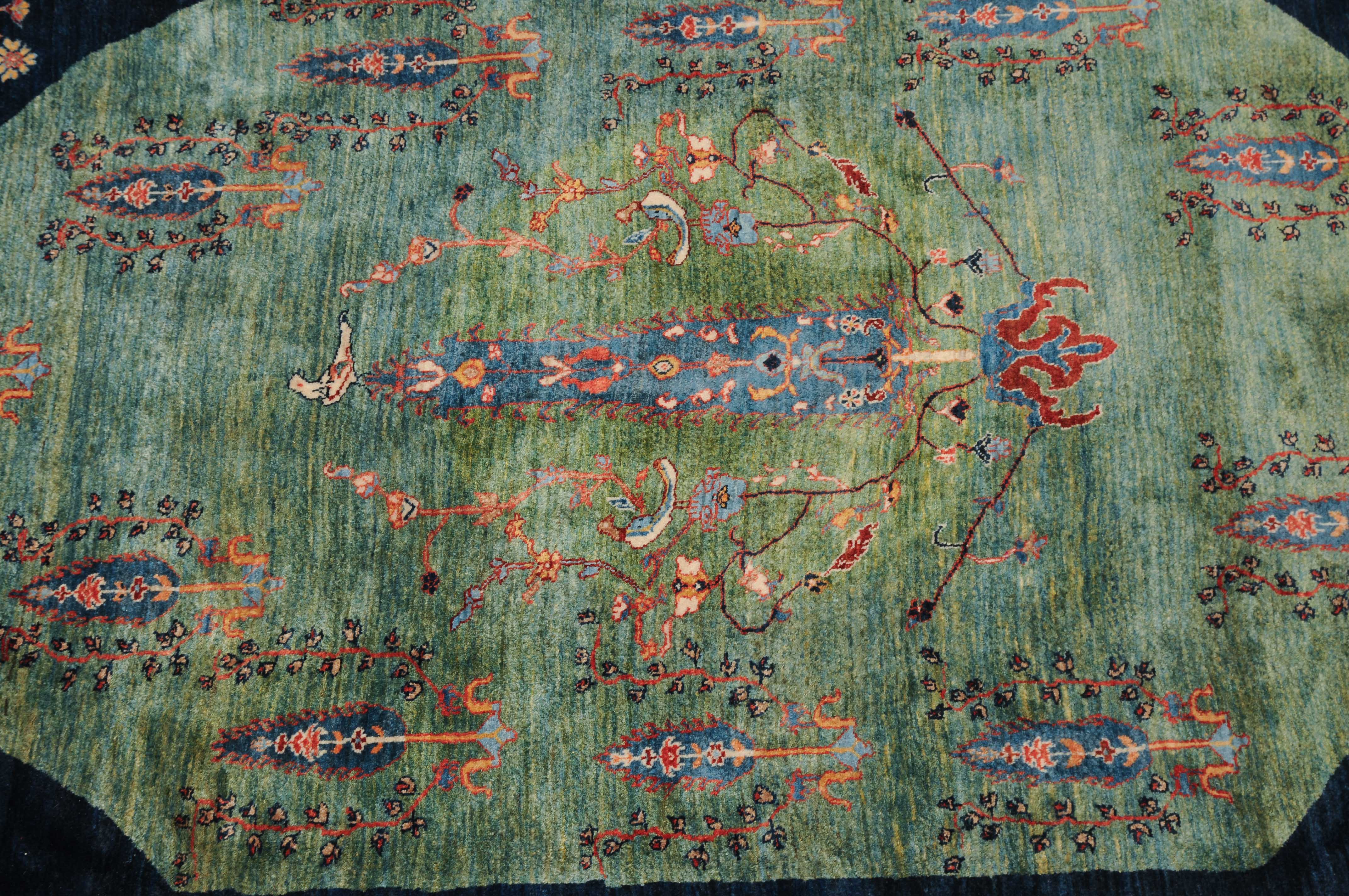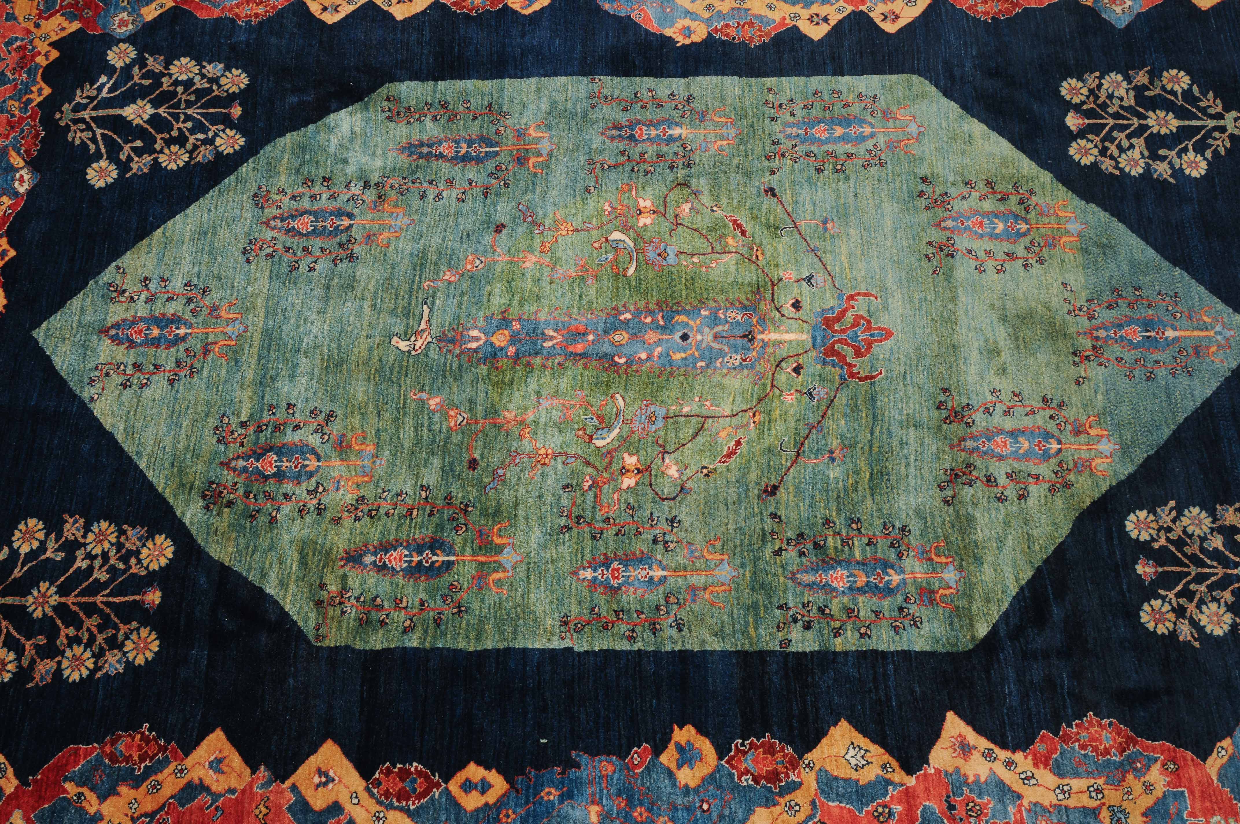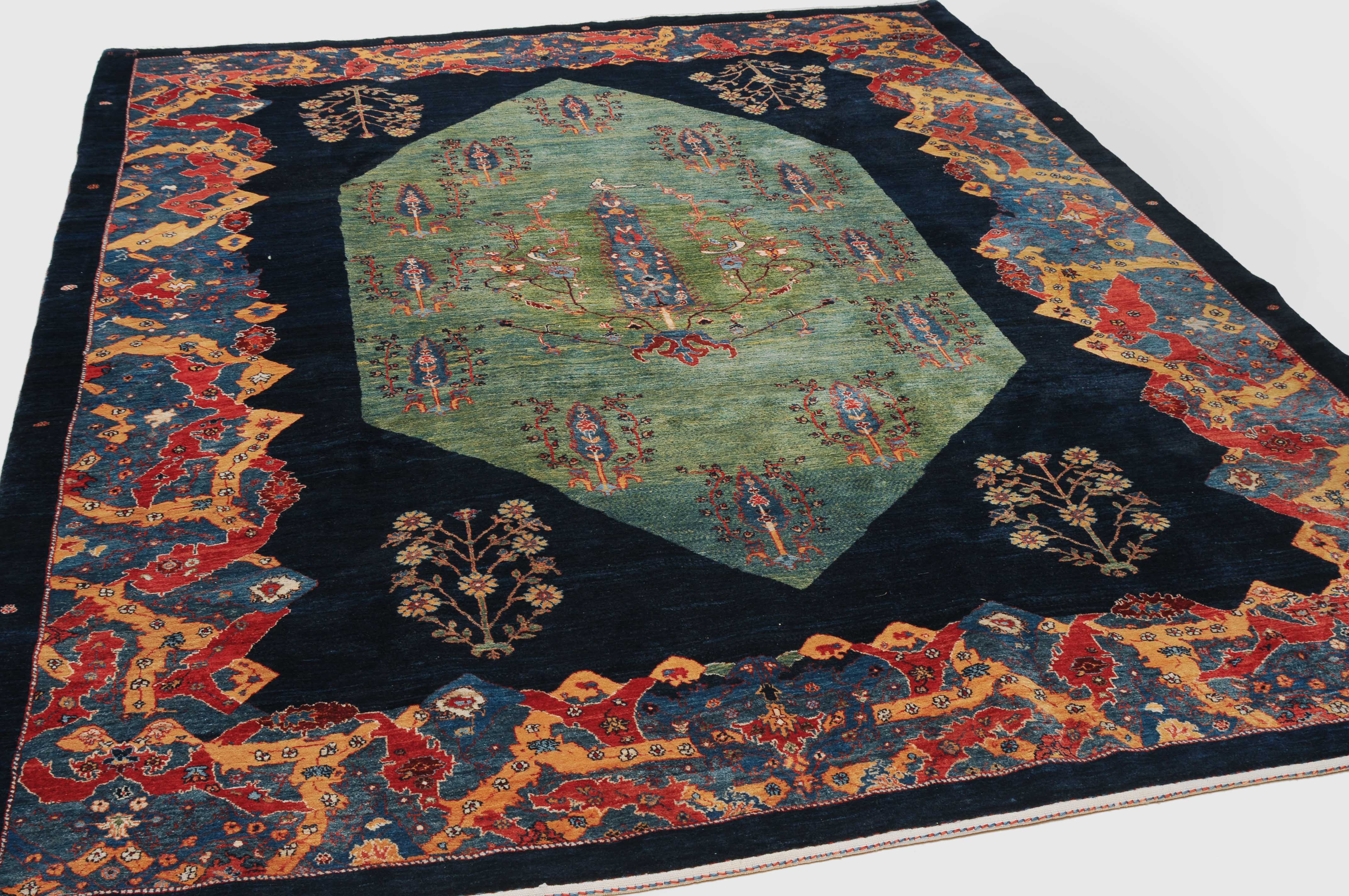 S-Persien, um 1980. Sehr fein geknüpfter Teppich. Im dunkelblauen Mittelfeld ruht ein türkisgrünes Hexagon, das im Inneren mit stilisierten hellblauen Bäumen und einem feingliedrigen Rankenwerk auf dekorative Weise geschmückt ist, flankiert von filigranen Blütenstauden in den 4 Ecken. Die hellblaue Hauptbordüre ist mit einem geschlungenen Rankendekor in Gelb und Rot belegt. Sehr gute Erhaltung. 225x294 cm (ft. 7.4x9.7).