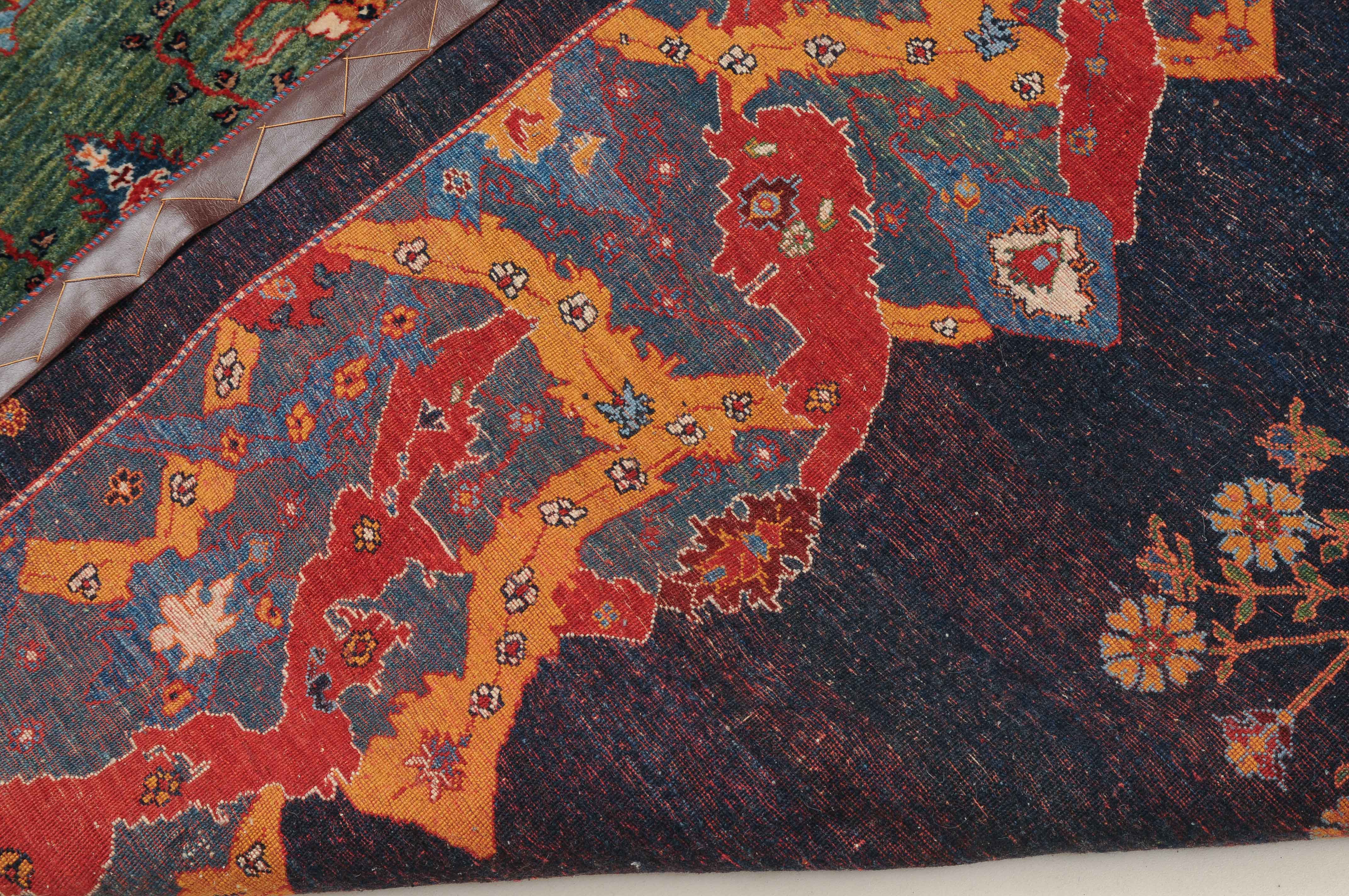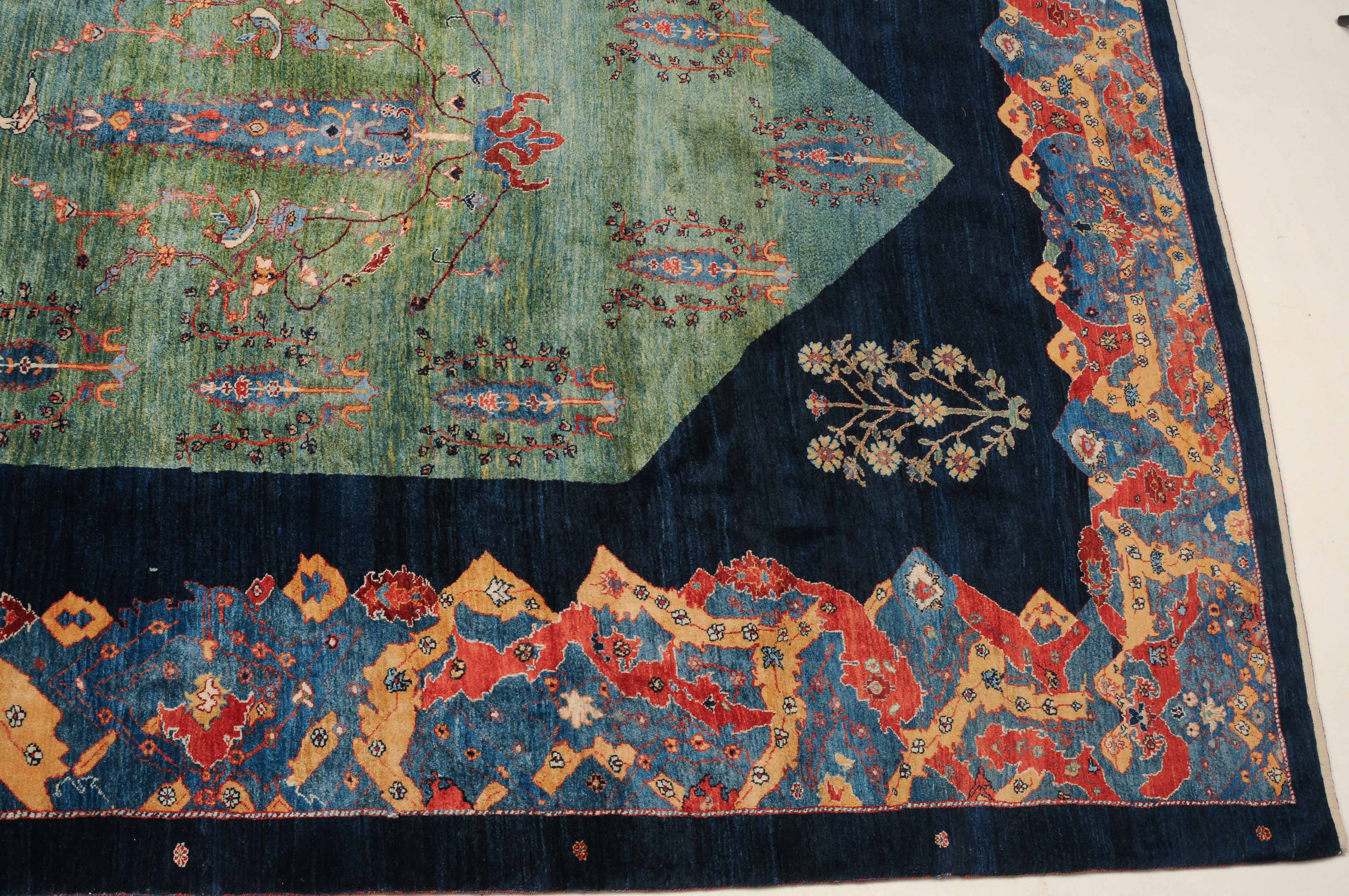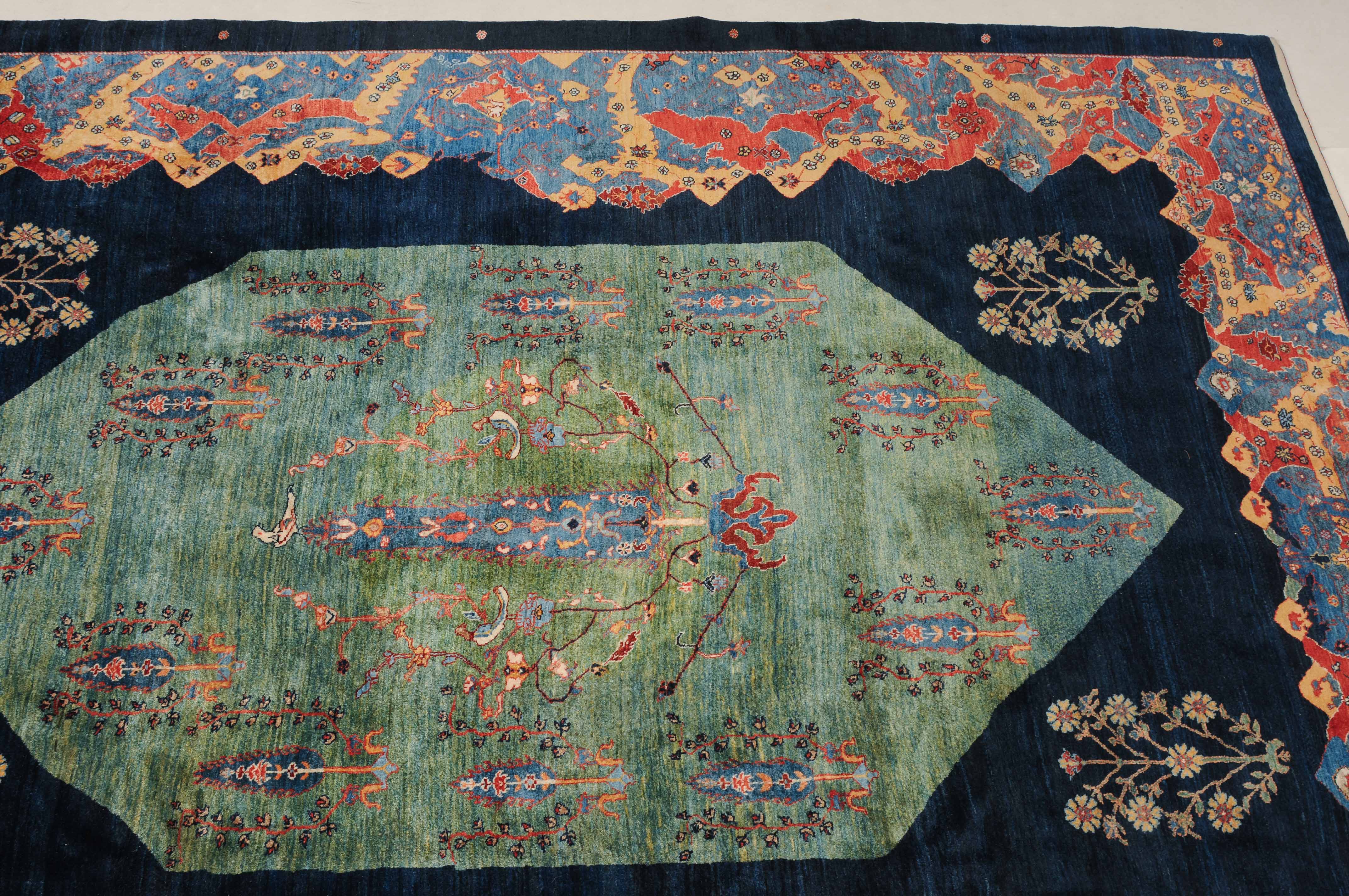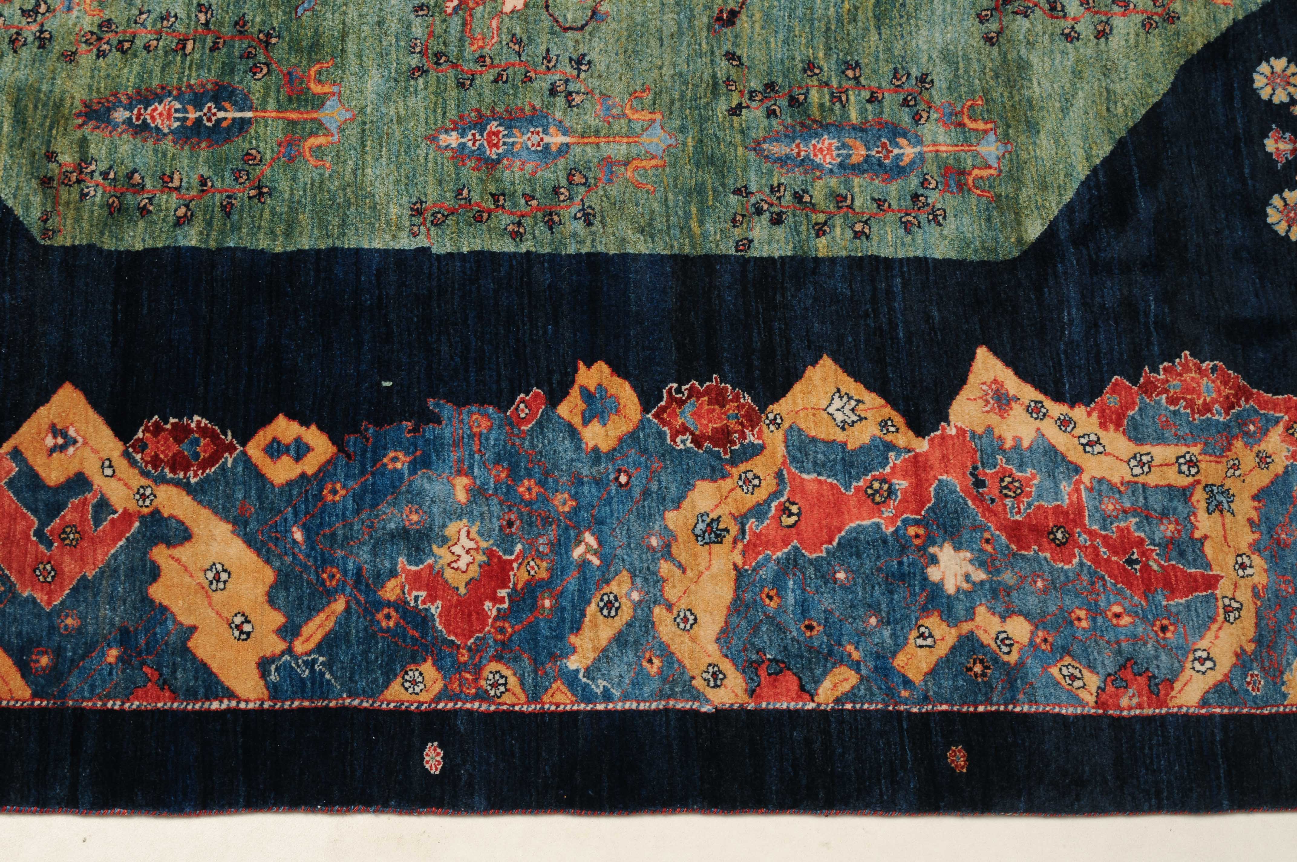 S-Persien, um 1980. Sehr fein geknüpfter Teppich. Im dunkelblauen Mittelfeld ruht ein türkisgrünes Hexagon, das im Inneren mit stilisierten hellblauen Bäumen und einem feingliedrigen Rankenwerk auf dekorative Weise geschmückt ist, flankiert von filigranen Blütenstauden in den 4 Ecken. Die hellblaue Hauptbordüre ist mit einem geschlungenen Rankendekor in Gelb und Rot belegt. Sehr gute Erhaltung. 225x294 cm (ft. 7.4x9.7).