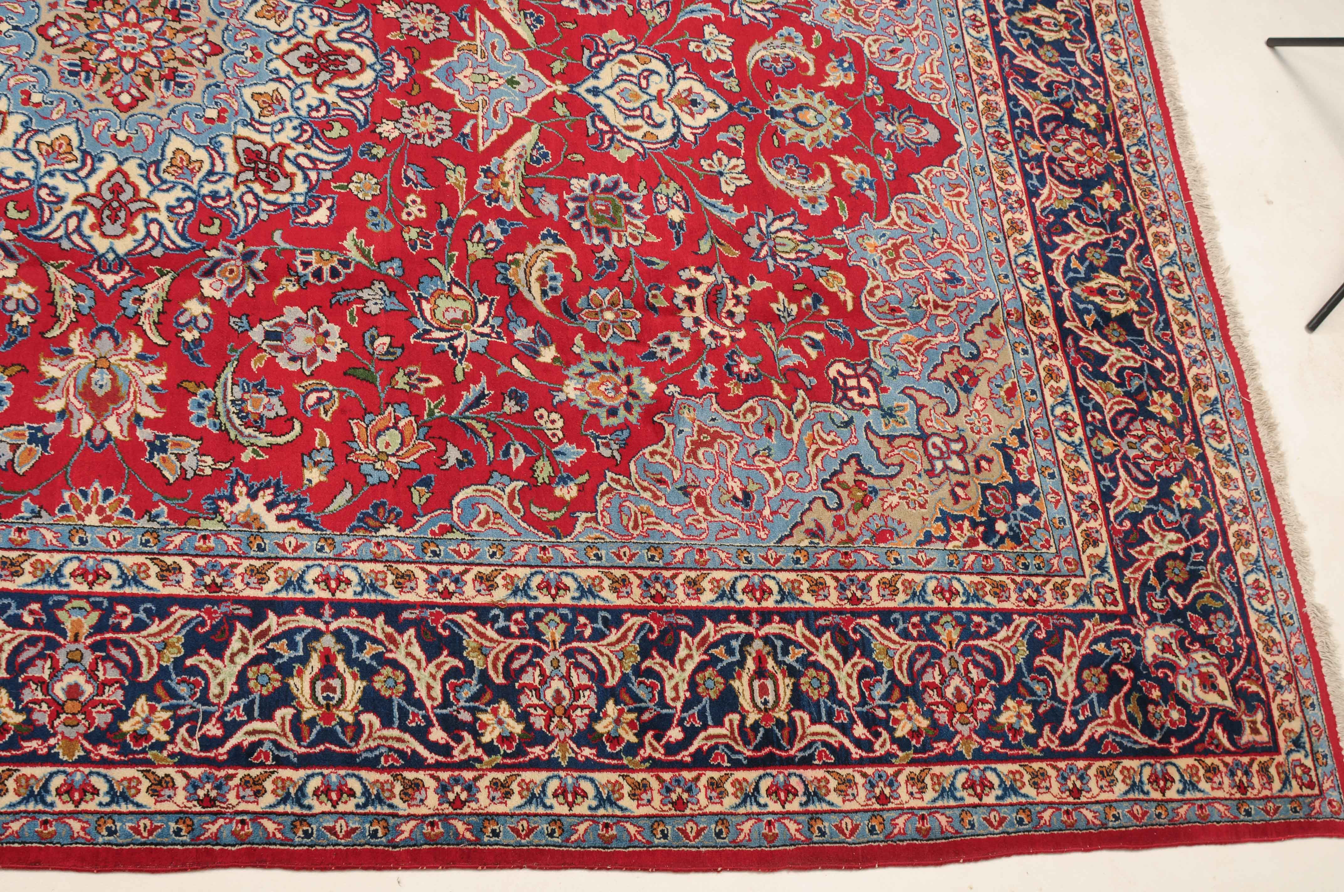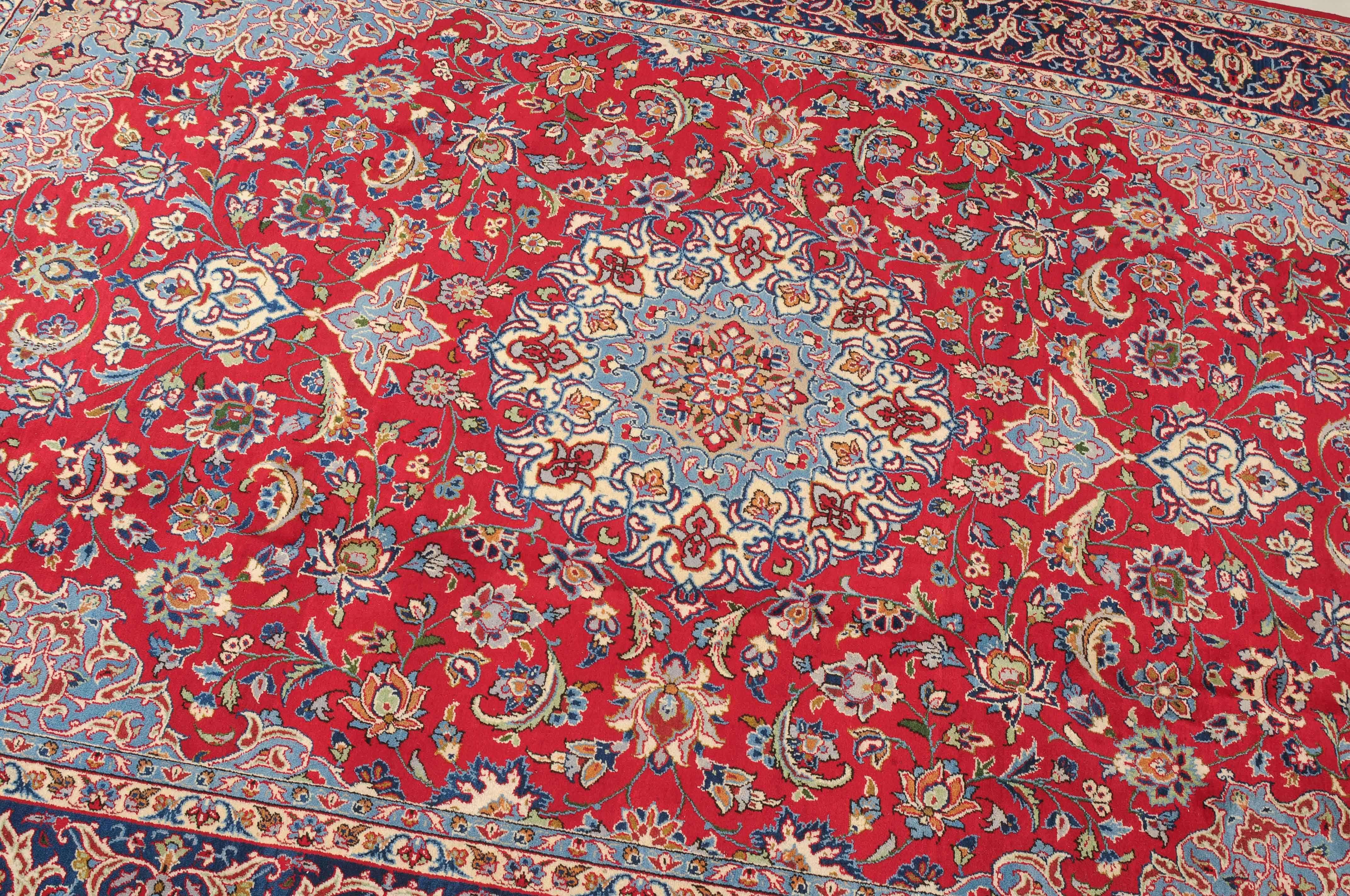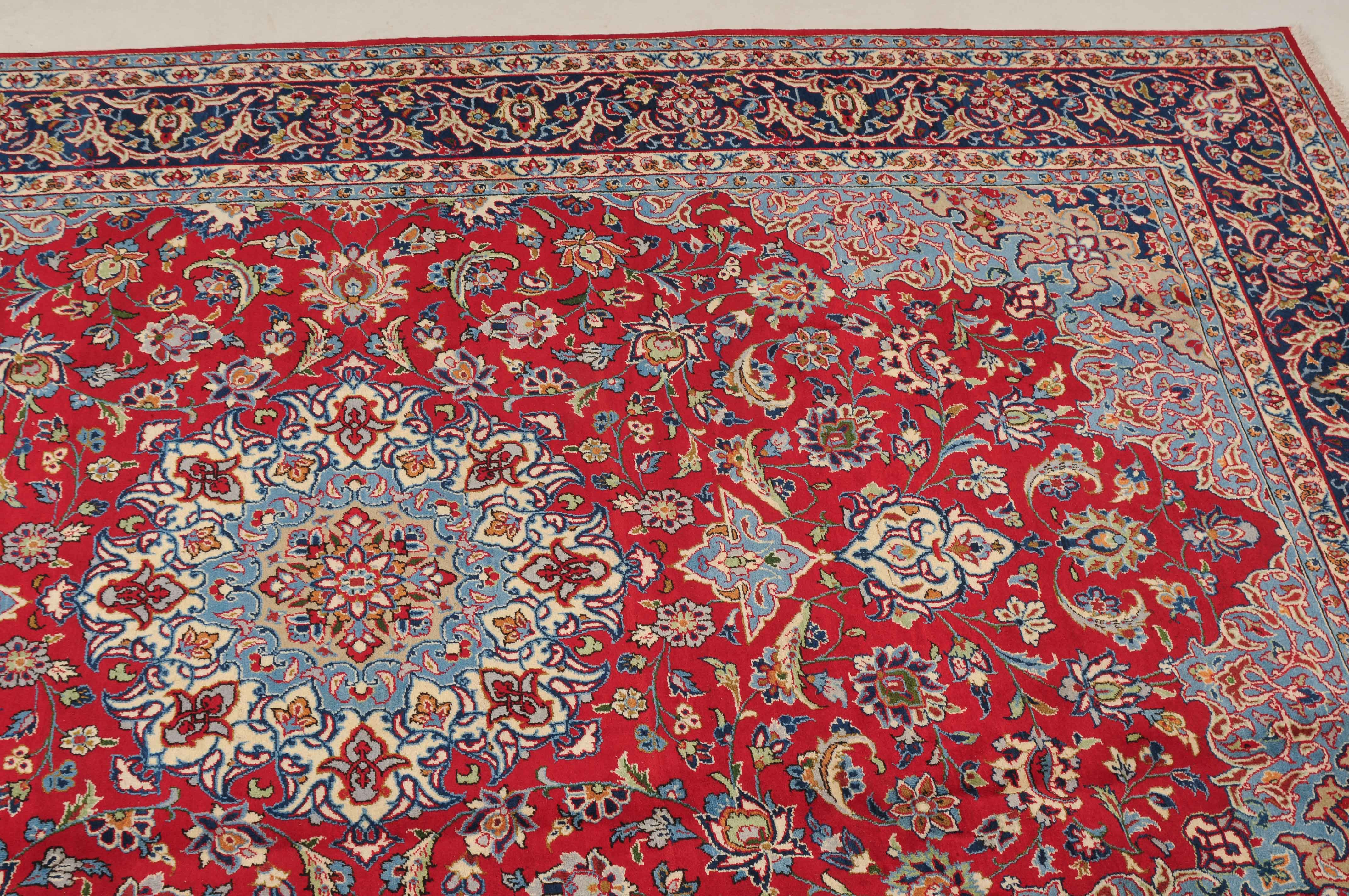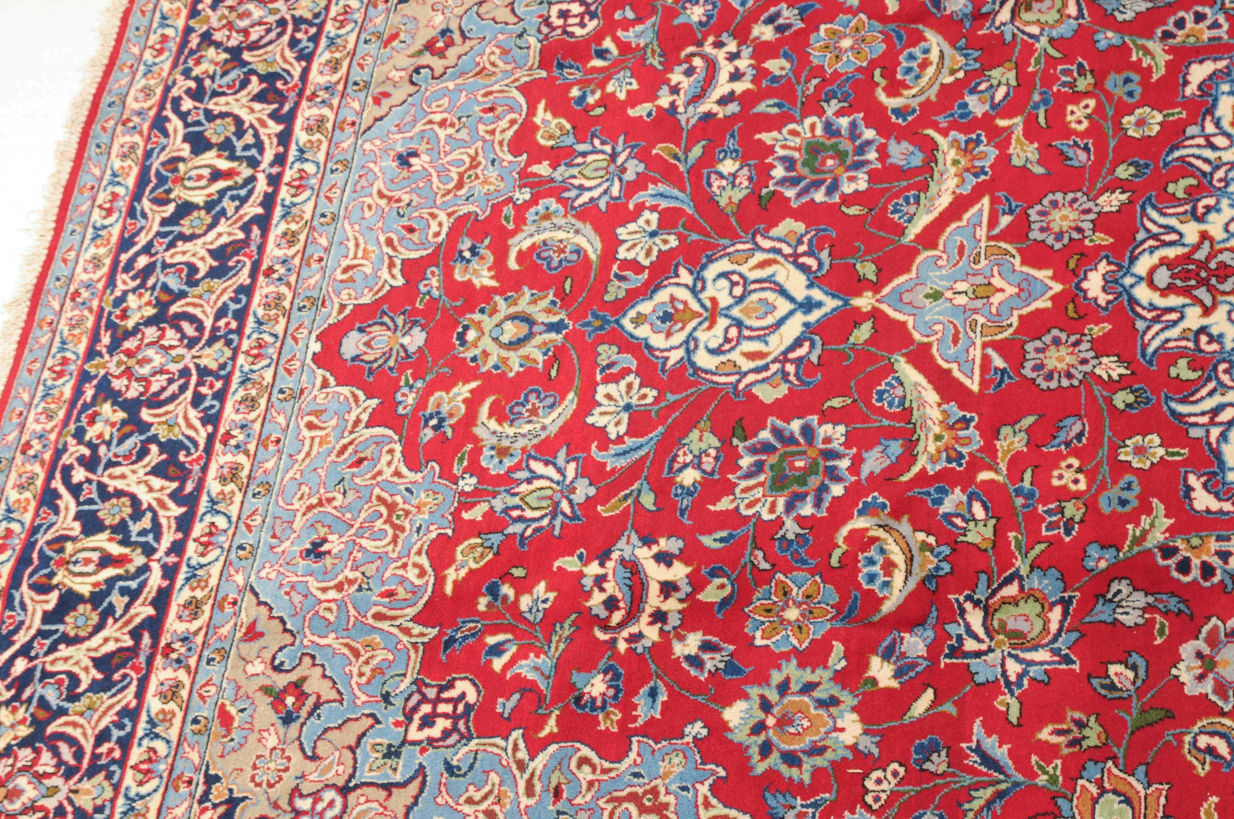 Z-Persien, um 1960. Der rote Grund ist mit einem dicht angelegten floralen Dekor belegt. Im Zentrum figuriert ein hellblaues Rundsternmedaillon mit 2 Ausläufern, umgeben von Blütenmotiven, Zweigen, Blattranken und 4 ebenfalls hellblauen Eckzwickeln. 4 dekorative florale Nebenbordüren in Hellblau und Weiss umranden die dunkelblaue, mit Palmetten und Blattranken verzierte Hauptbordüre. Sehr gute Erhaltung. 252x372 cm (ft. 8.3x12.3).