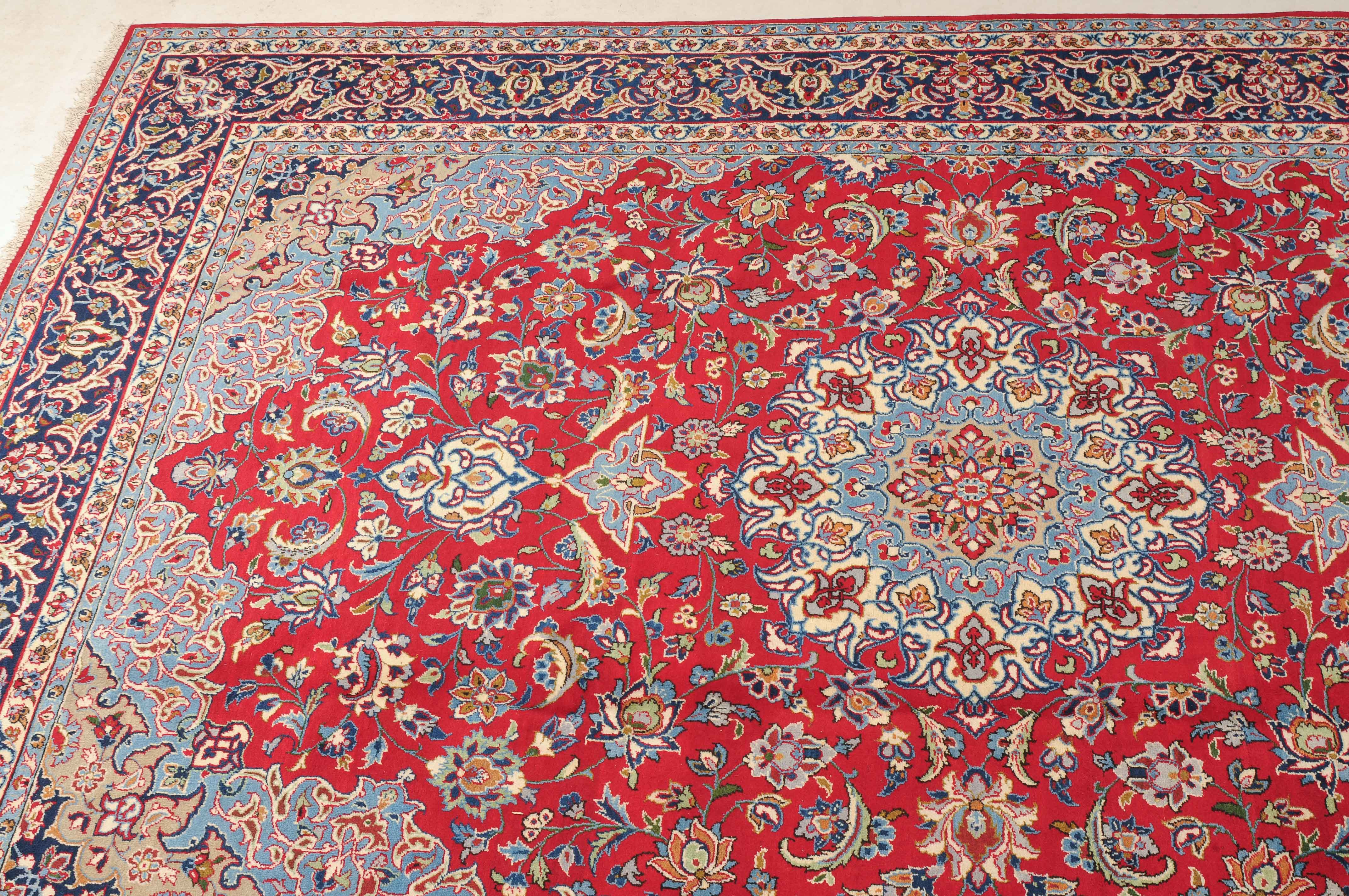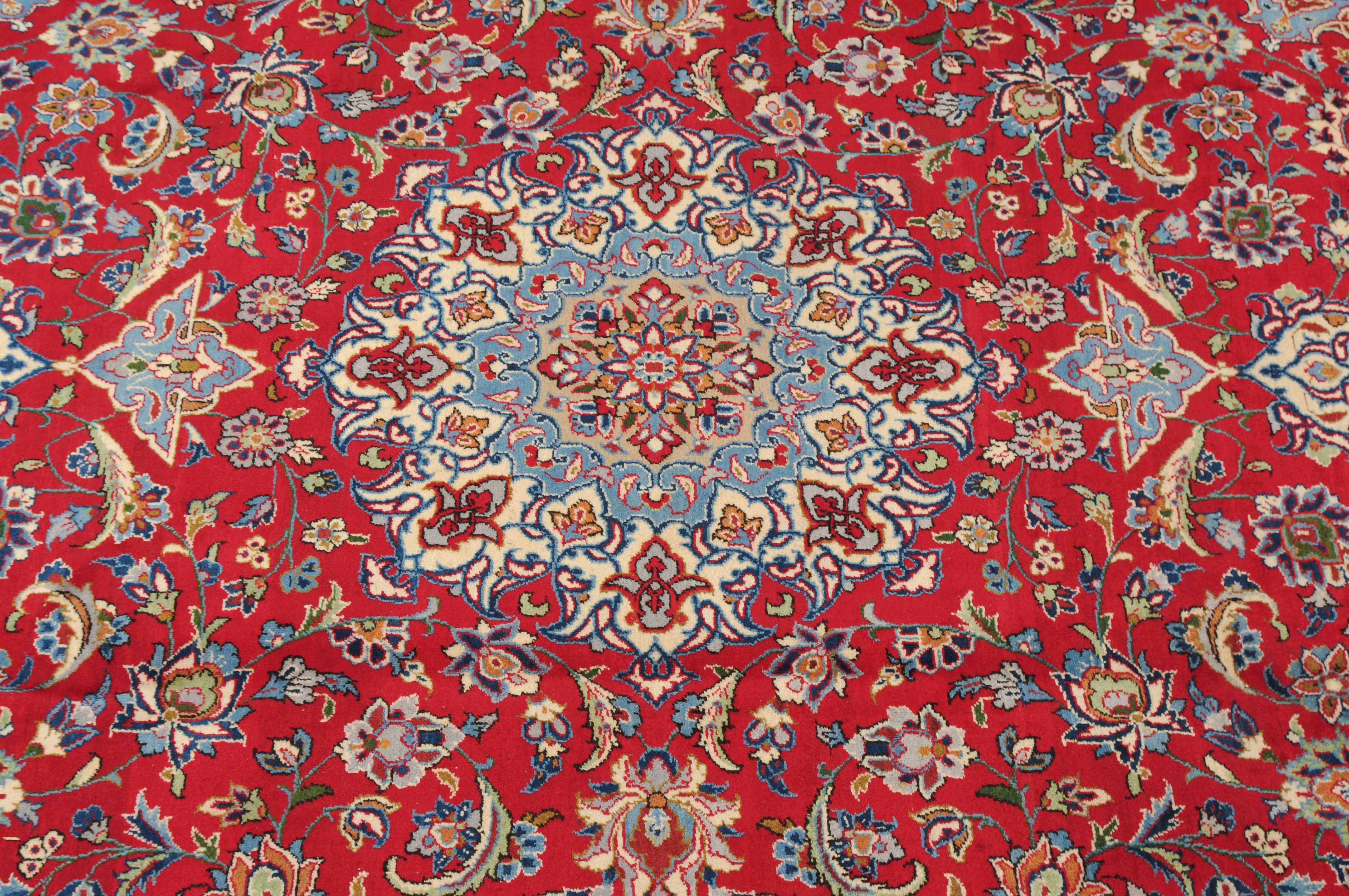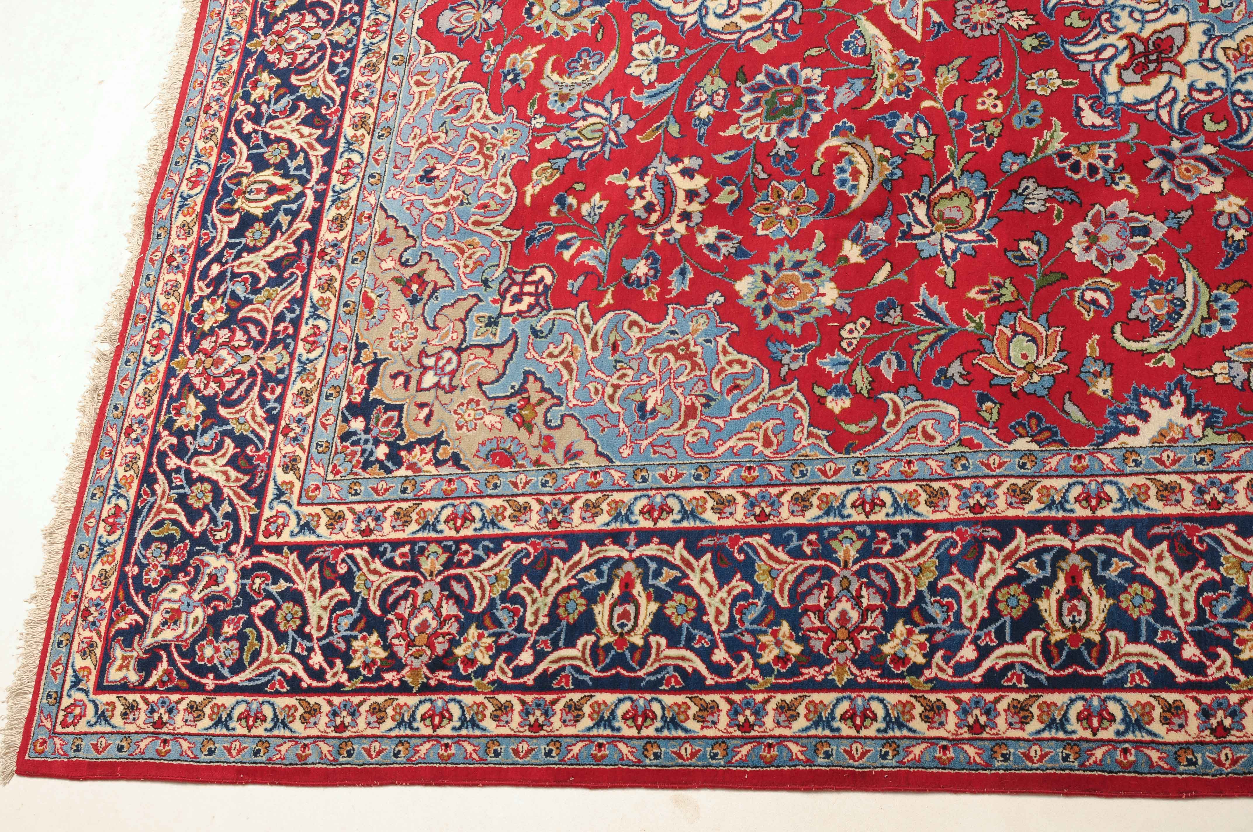 Z-Persien, um 1960. Der rote Grund ist mit einem dicht angelegten floralen Dekor belegt. Im Zentrum figuriert ein hellblaues Rundsternmedaillon mit 2 Ausläufern, umgeben von Blütenmotiven, Zweigen, Blattranken und 4 ebenfalls hellblauen Eckzwickeln. 4 dekorative florale Nebenbordüren in Hellblau und Weiss umranden die dunkelblaue, mit Palmetten und Blattranken verzierte Hauptbordüre. Sehr gute Erhaltung. 252x372 cm (ft. 8.3x12.3).