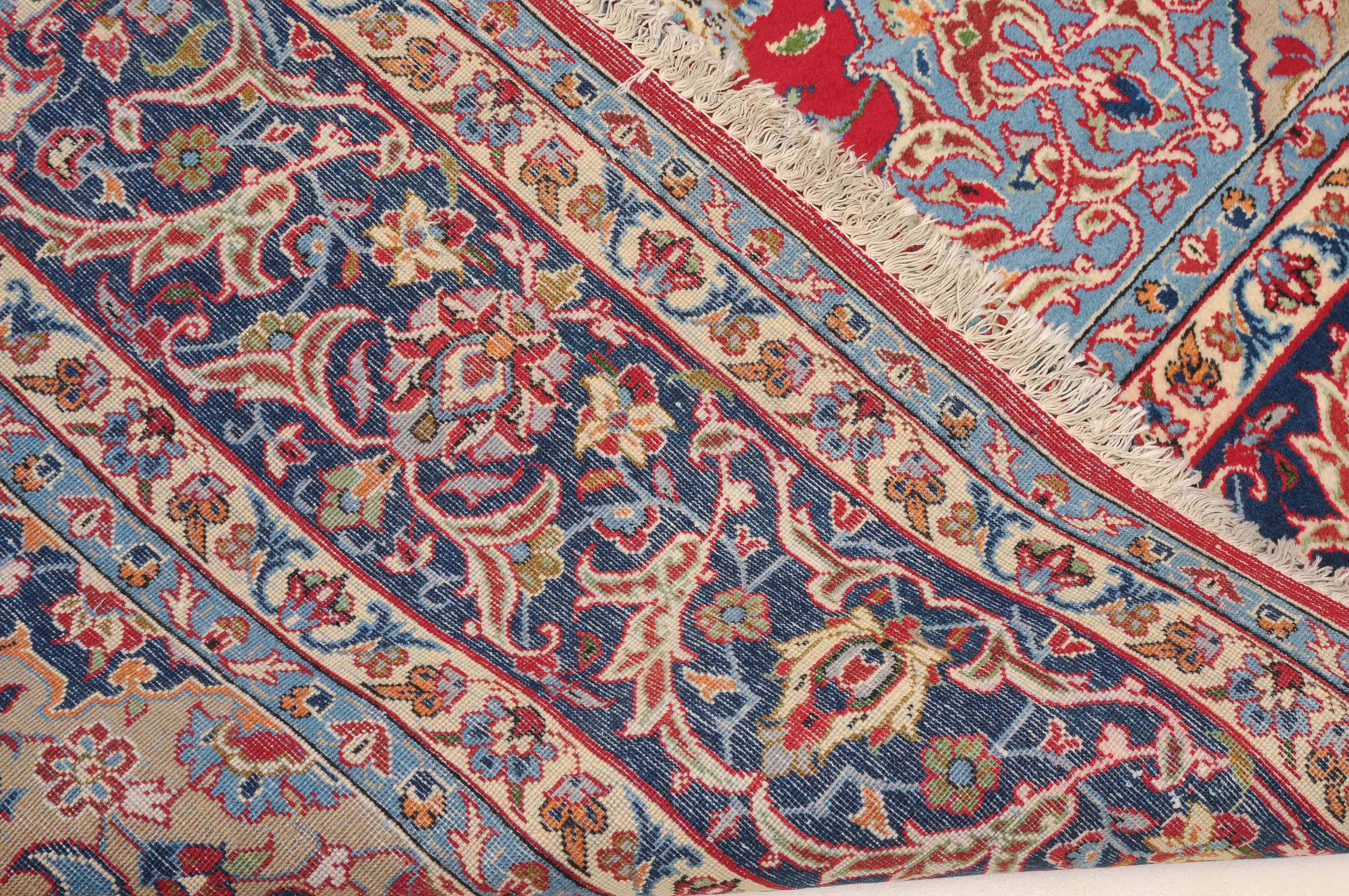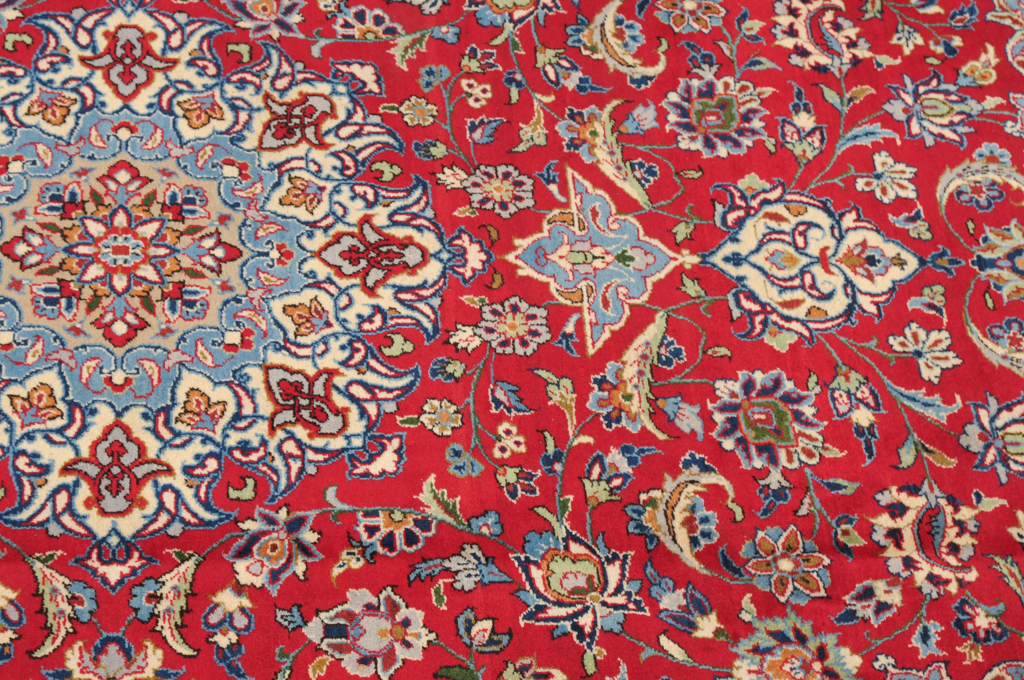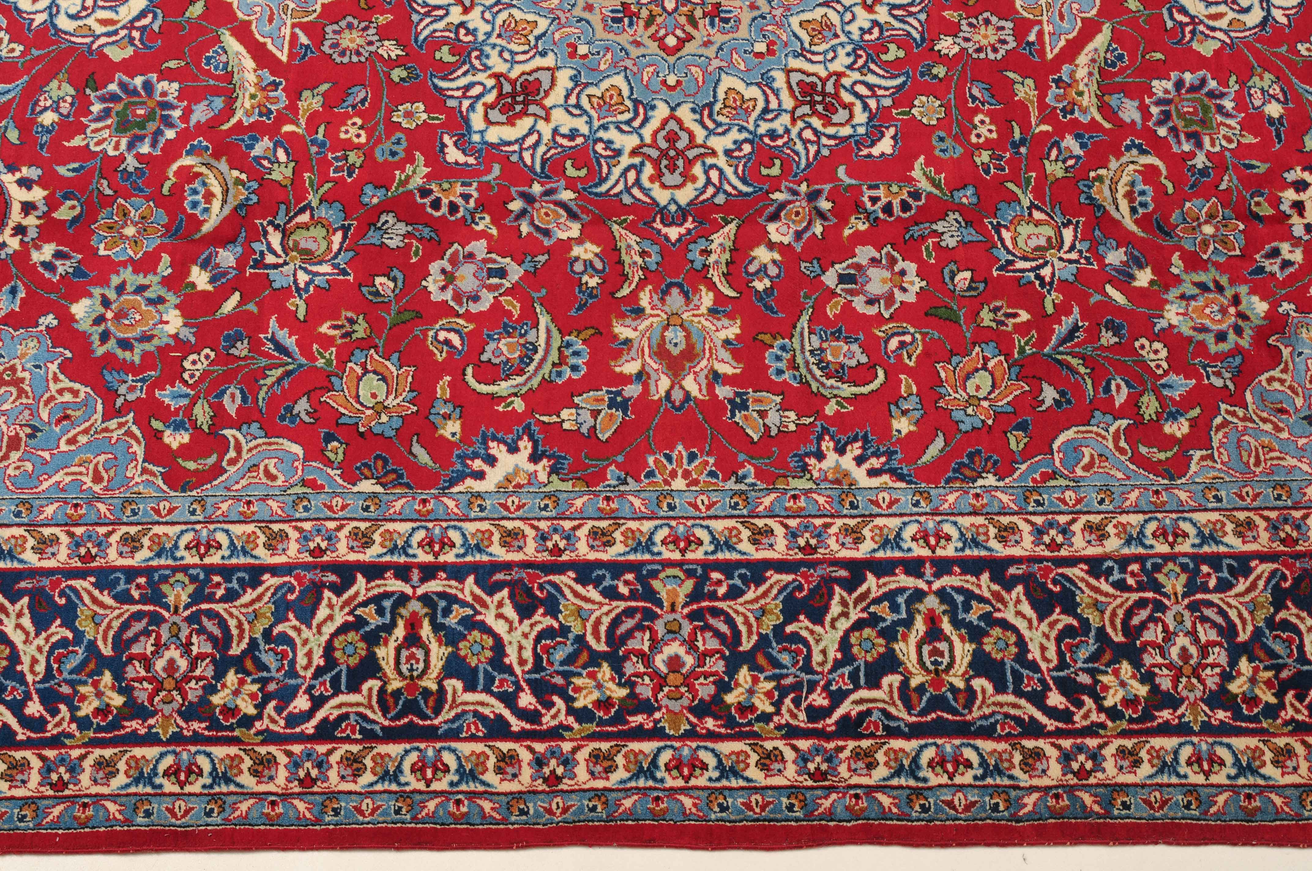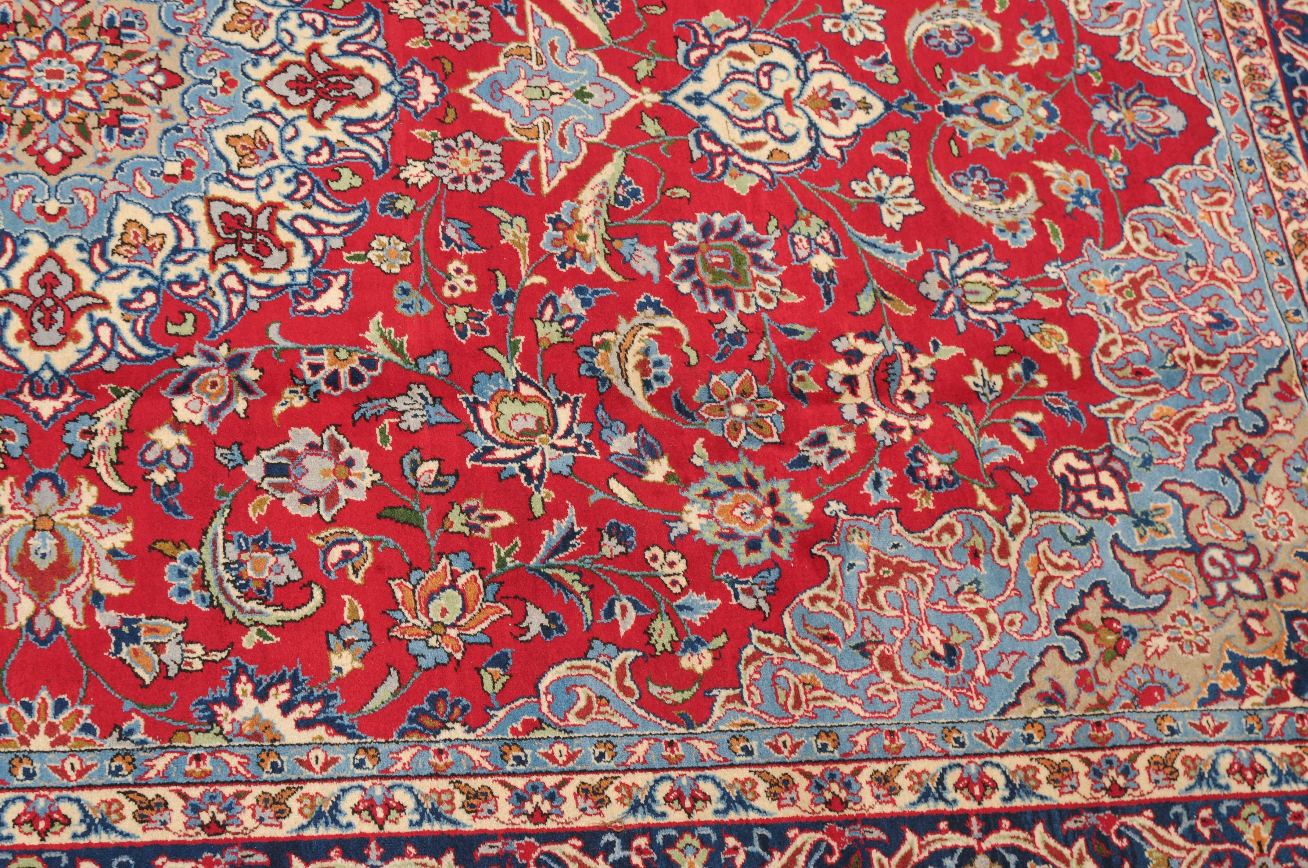Z-Persien, um 1960. Der rote Grund ist mit einem dicht angelegten floralen Dekor belegt. Im Zentrum figuriert ein hellblaues Rundsternmedaillon mit 2 Ausläufern, umgeben von Blütenmotiven, Zweigen, Blattranken und 4 ebenfalls hellblauen Eckzwickeln. 4 dekorative florale Nebenbordüren in Hellblau und Weiss umranden die dunkelblaue, mit Palmetten und Blattranken verzierte Hauptbordüre. Sehr gute Erhaltung. 252x372 cm (ft. 8.3x12.3).