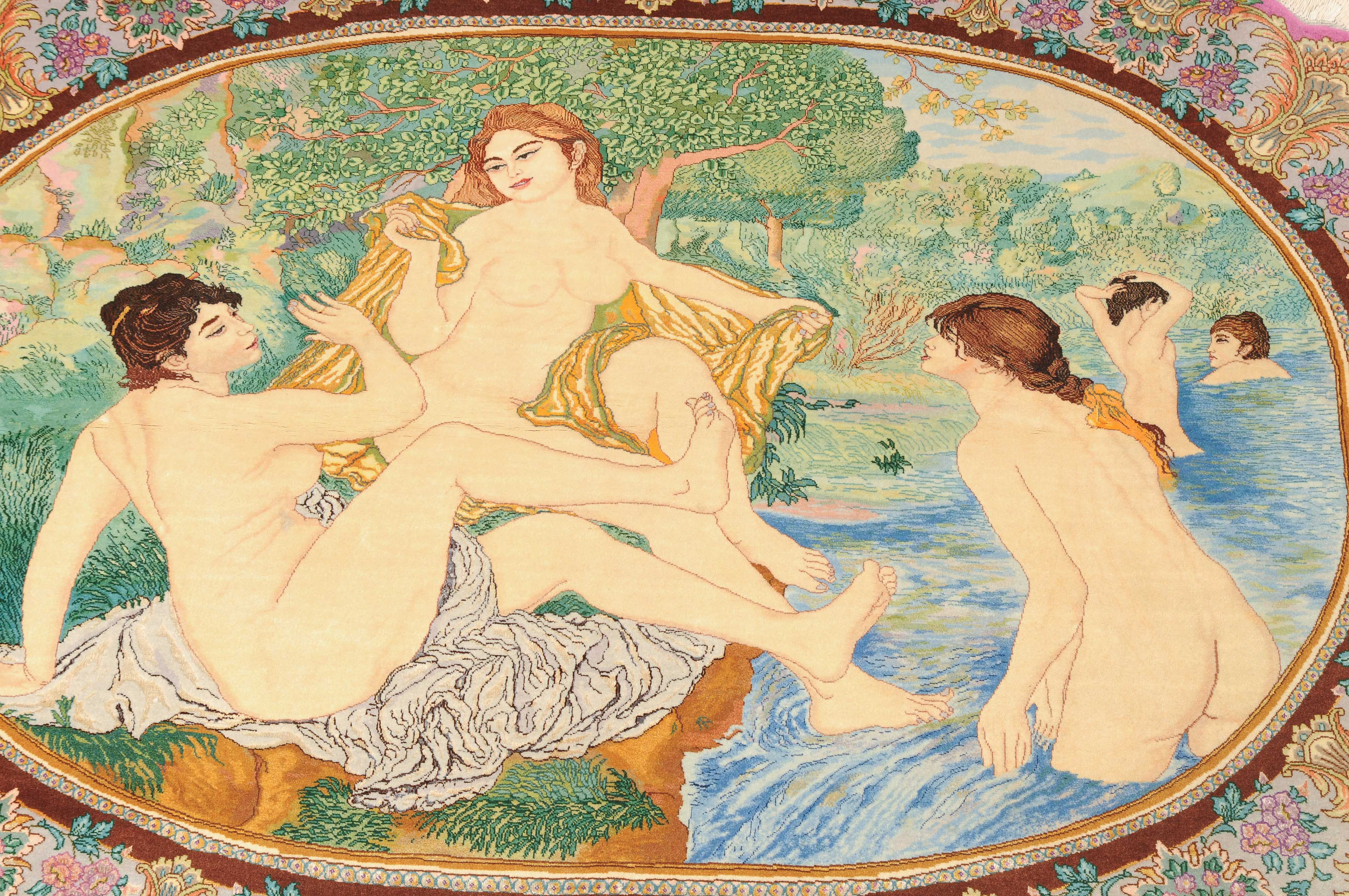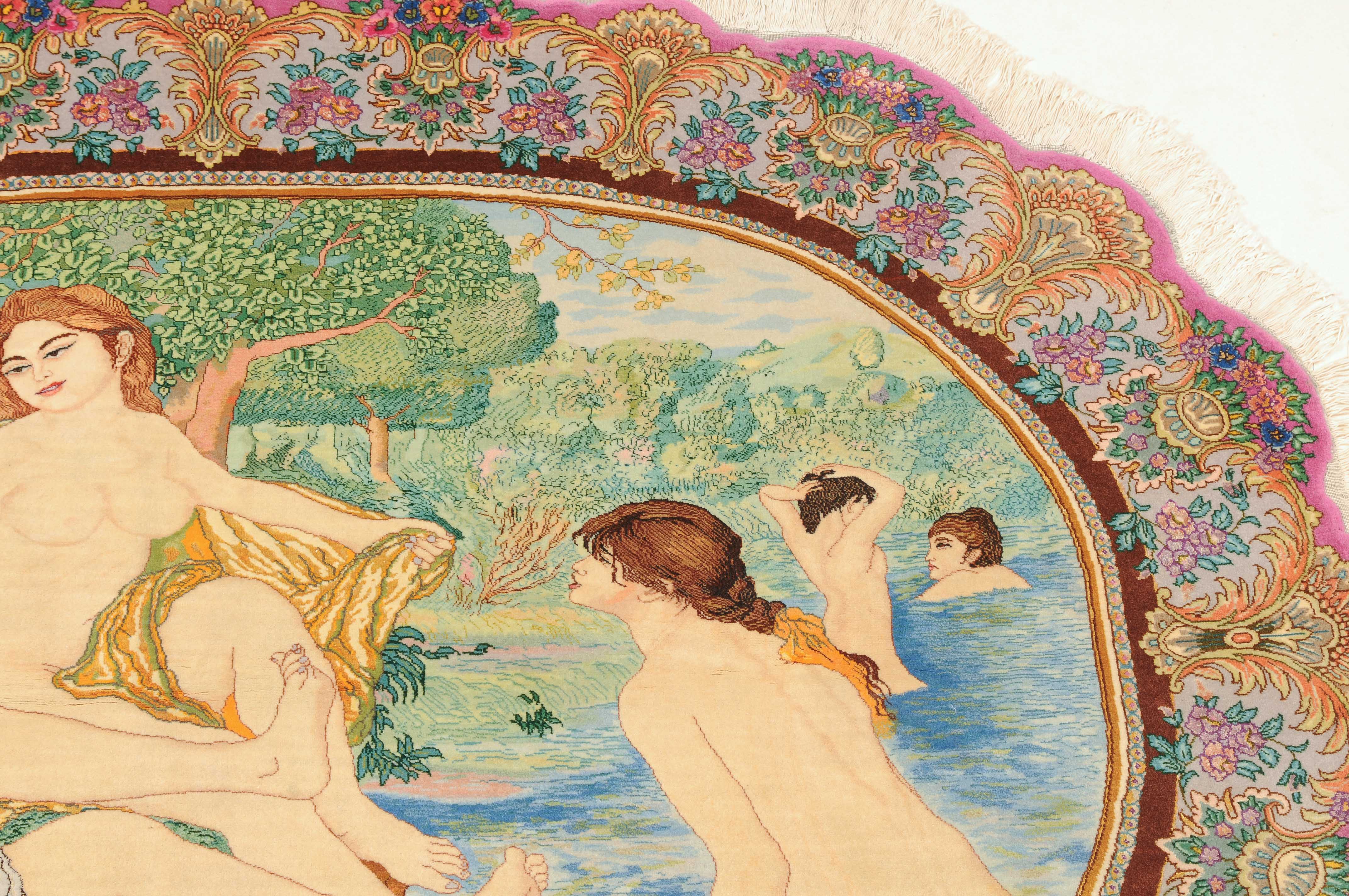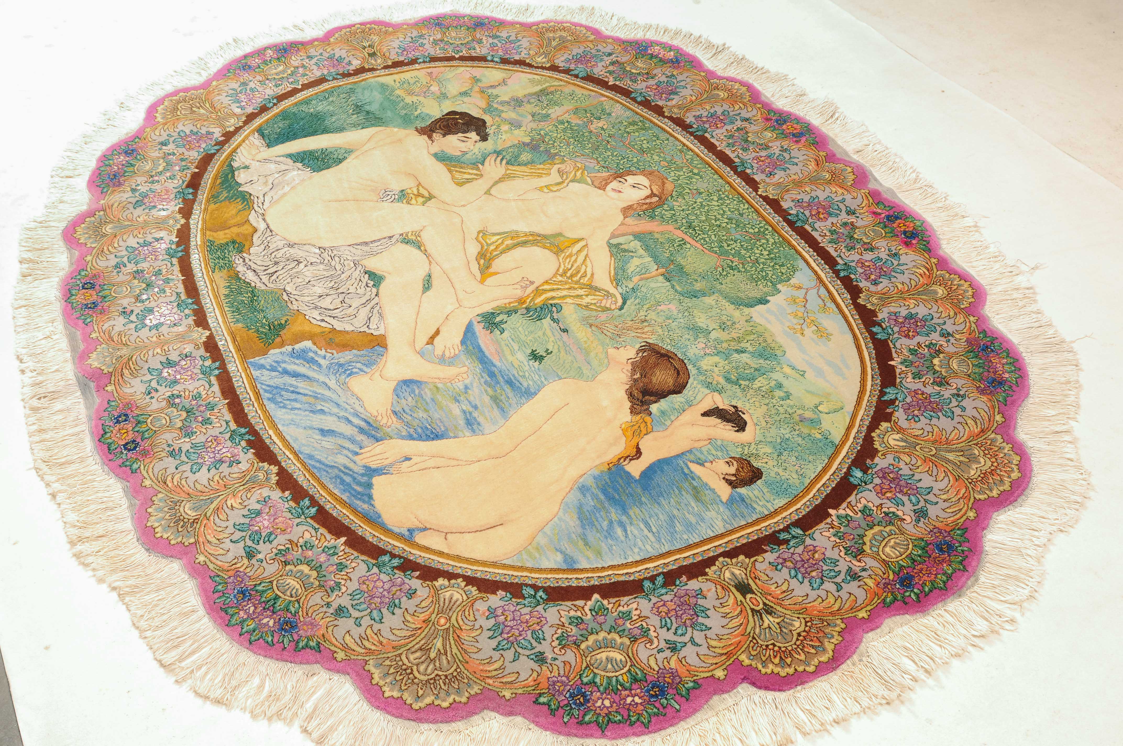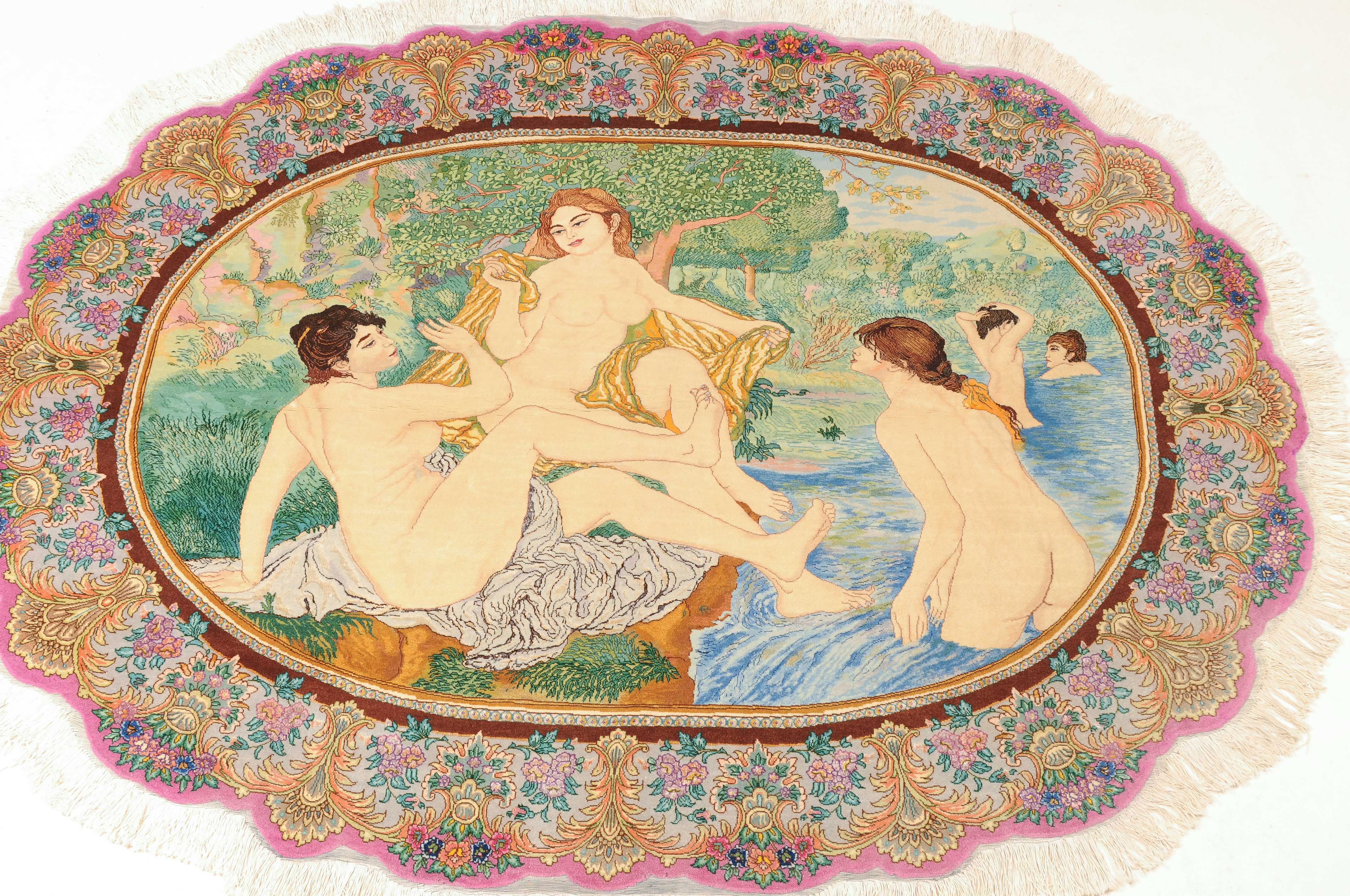 NW-Persien, um 1970. Ovales Format, feine Knüpfung, Flormaterial Wolle und Seide. In einem ovalen Rahmen sind an einem Flussufer 5 badende Frauen dargestellt, dazu figurieren im Hintergrund fein gezeichnete Bäume und Wiesen. Die helle wellige Bordüre ist mit einer üppigen floralen Musterung geschmückt. Sehr gute Erhaltung. 145x200 cm (ft. 4.8x6.6).