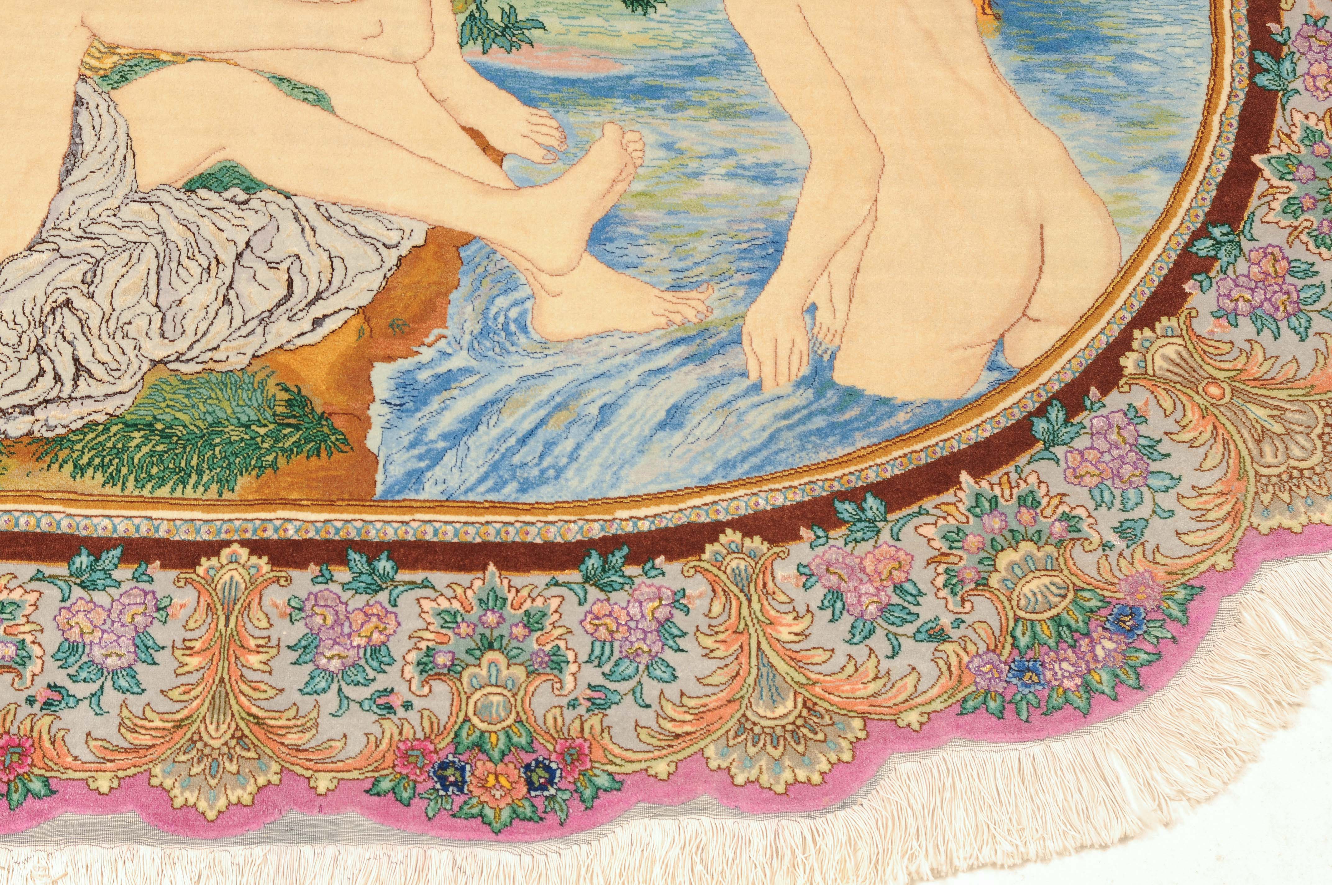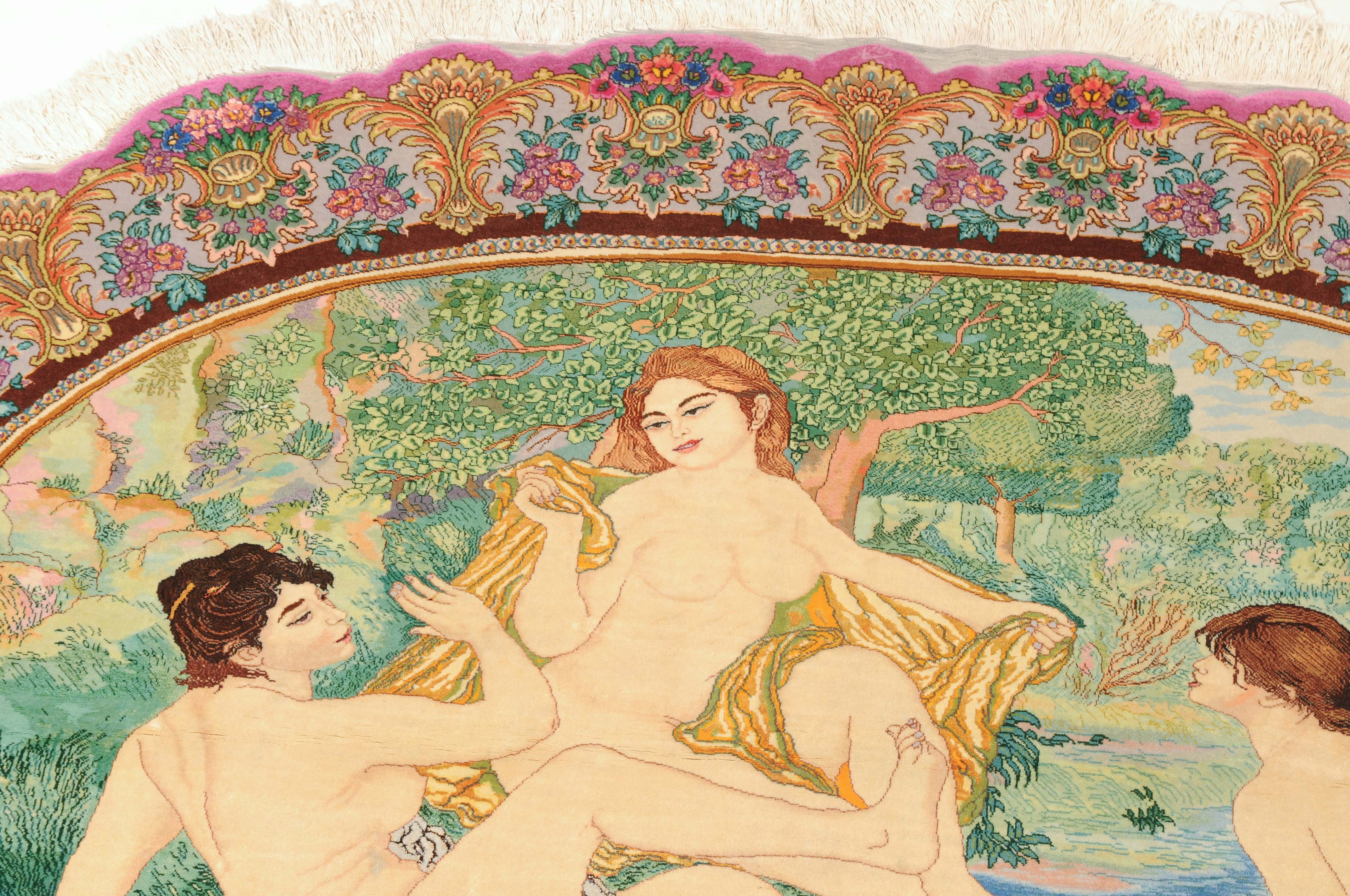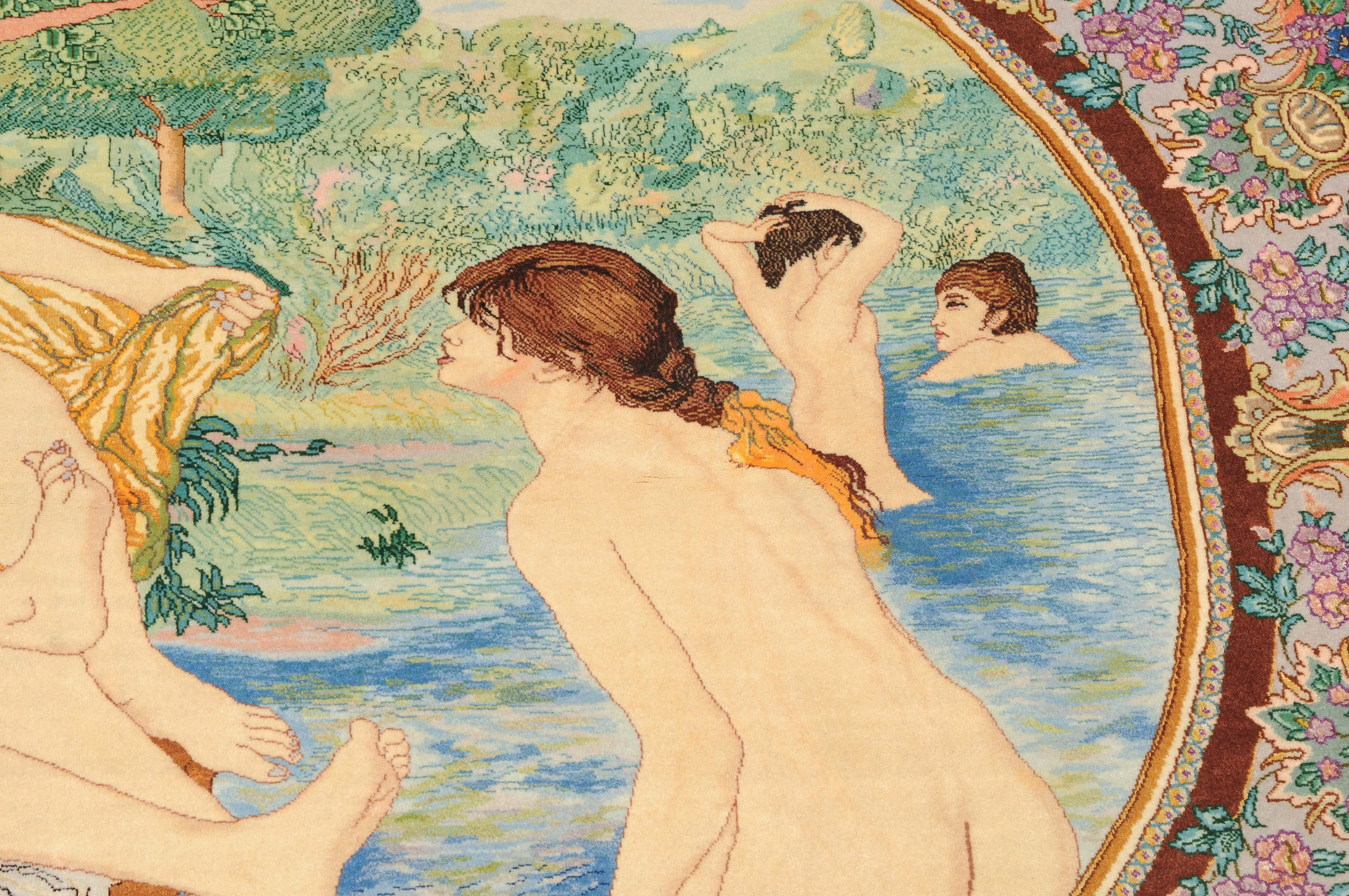 NW-Persien, um 1970. Ovales Format, feine Knüpfung, Flormaterial Wolle und Seide. In einem ovalen Rahmen sind an einem Flussufer 5 badende Frauen dargestellt, dazu figurieren im Hintergrund fein gezeichnete Bäume und Wiesen. Die helle wellige Bordüre ist mit einer üppigen floralen Musterung geschmückt. Sehr gute Erhaltung. 145x200 cm (ft. 4.8x6.6).