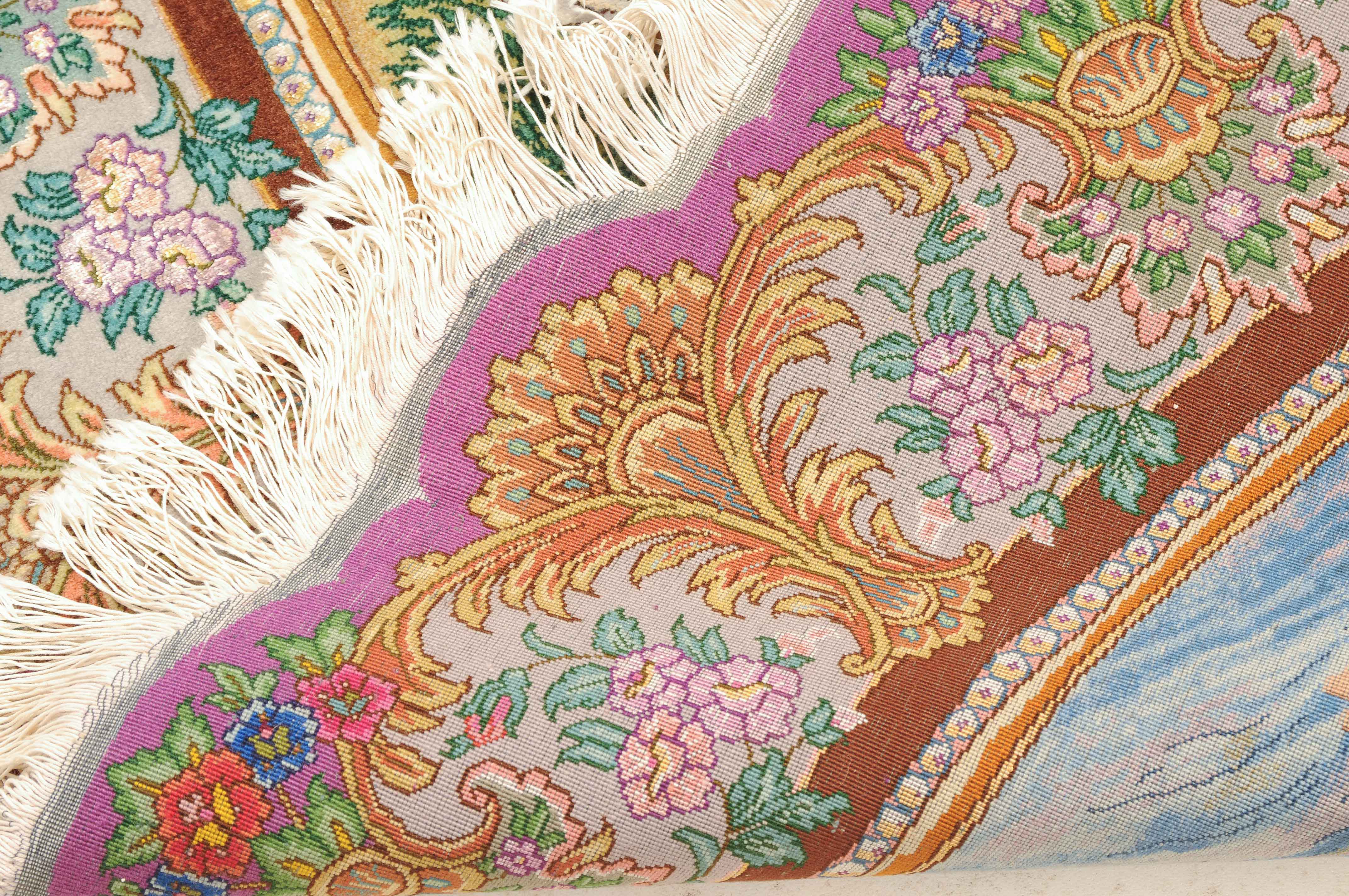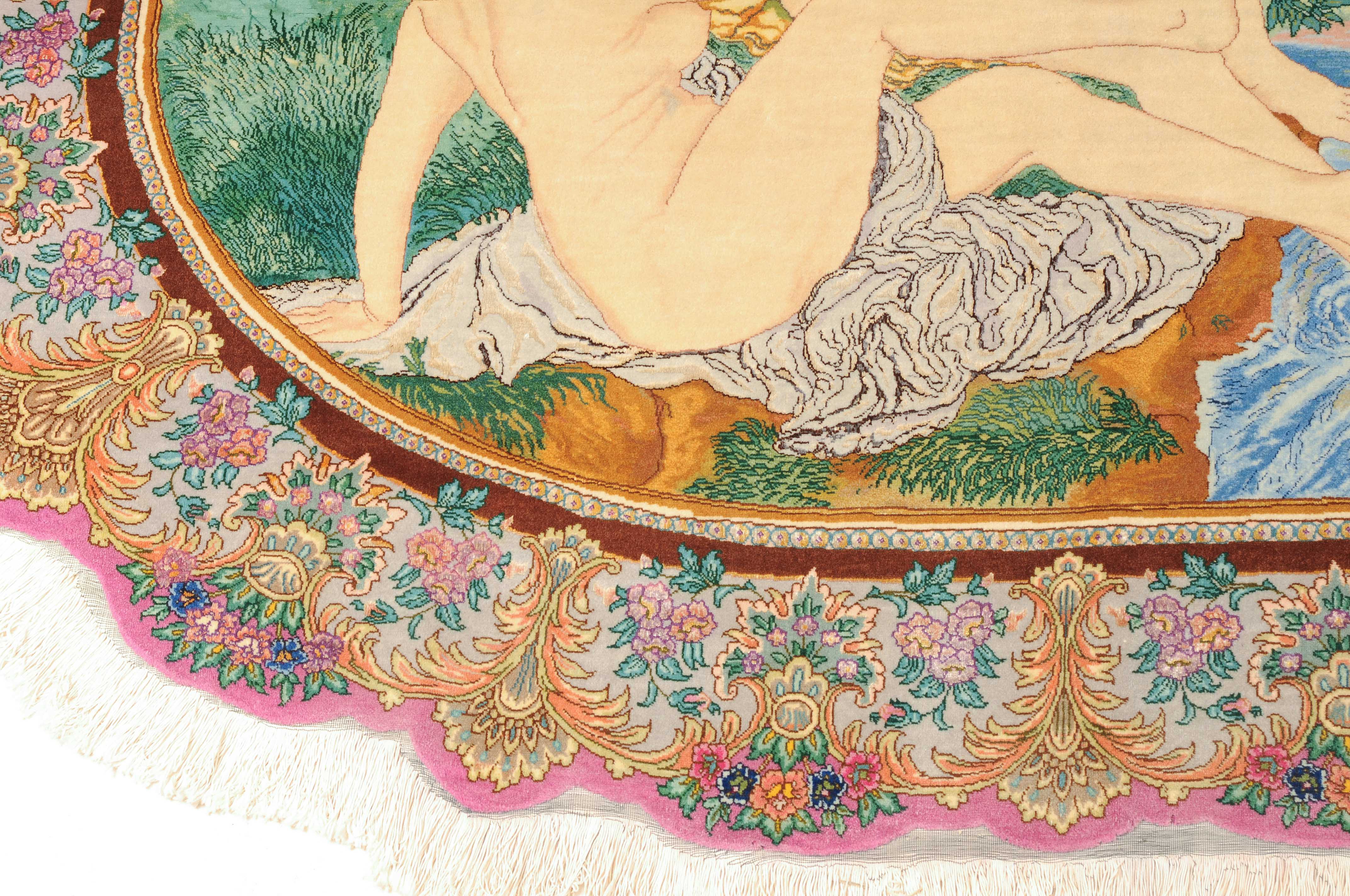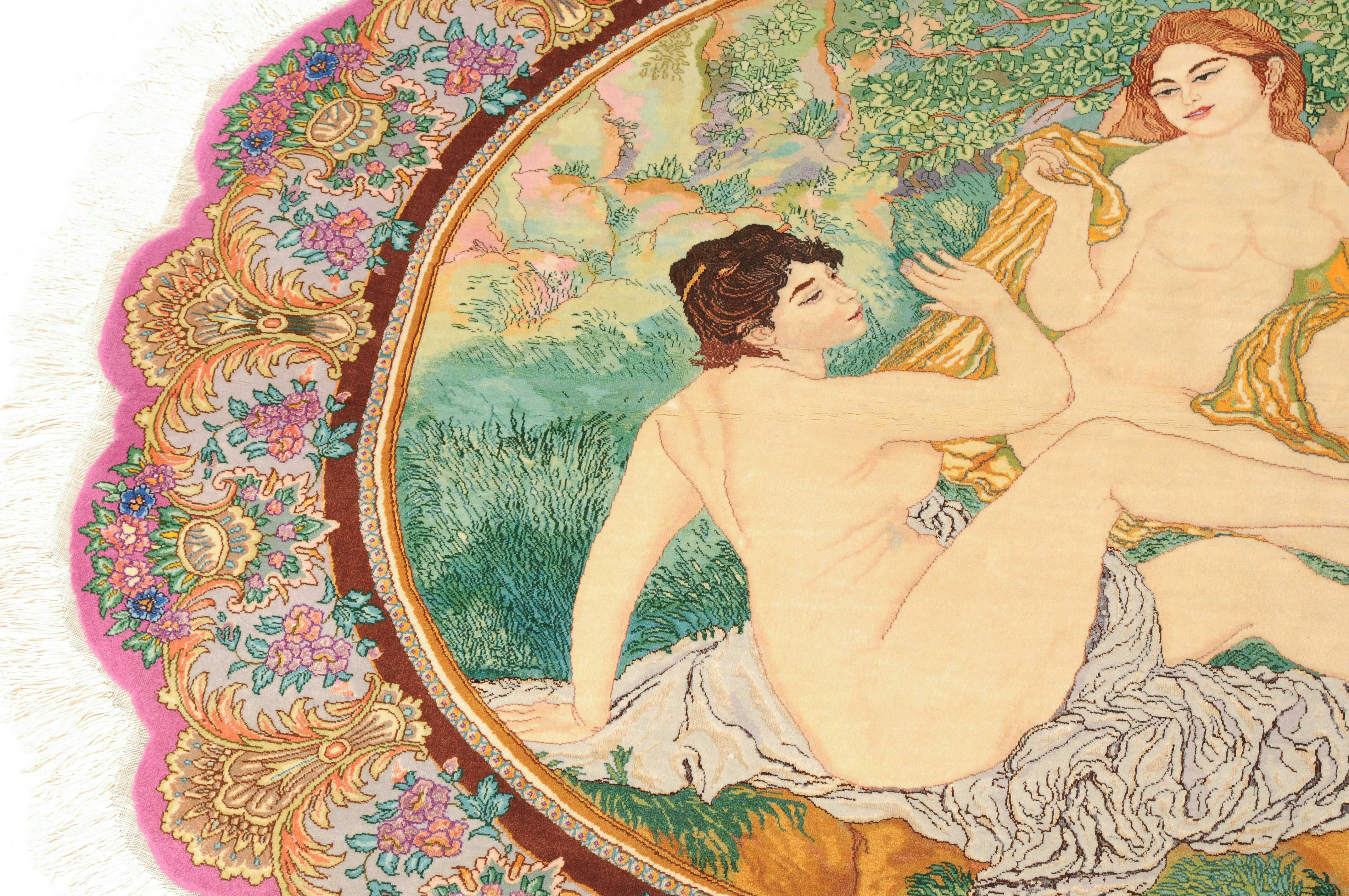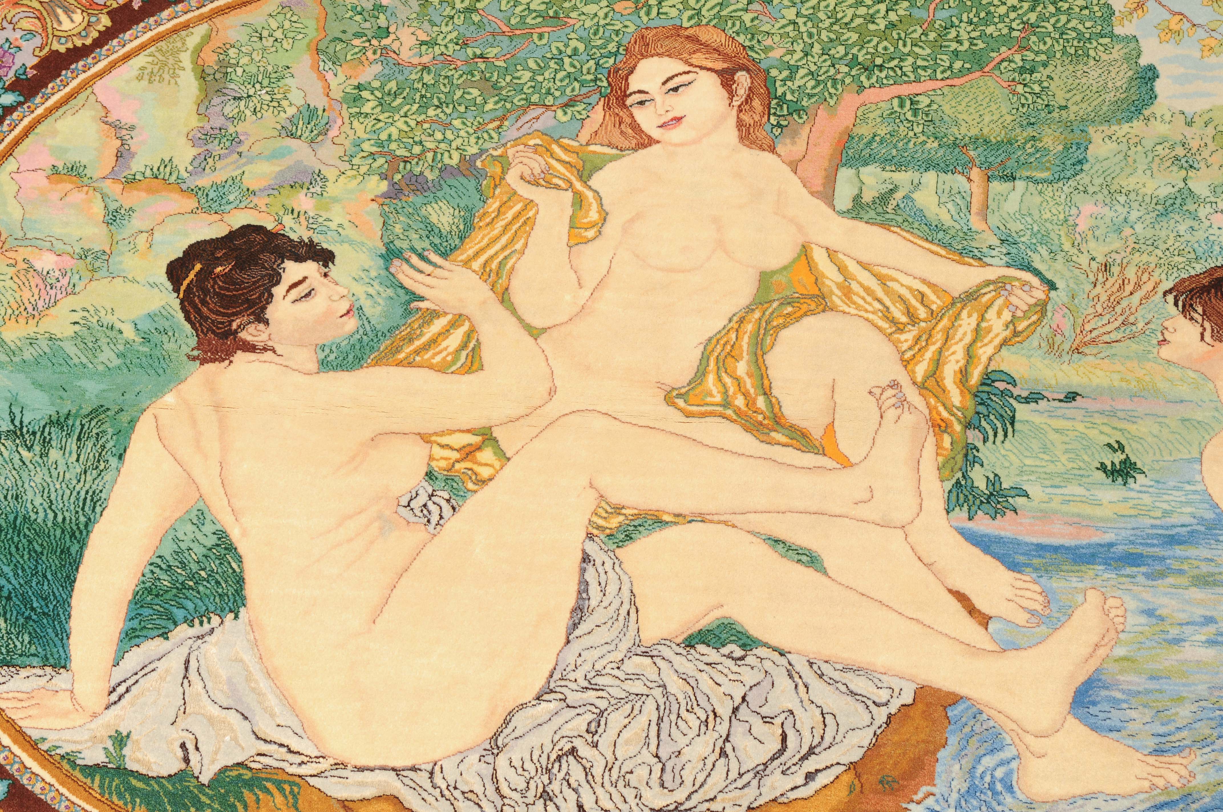 NW-Persien, um 1970. Ovales Format, feine Knüpfung, Flormaterial Wolle und Seide. In einem ovalen Rahmen sind an einem Flussufer 5 badende Frauen dargestellt, dazu figurieren im Hintergrund fein gezeichnete Bäume und Wiesen. Die helle wellige Bordüre ist mit einer üppigen floralen Musterung geschmückt. Sehr gute Erhaltung. 145x200 cm (ft. 4.8x6.6).