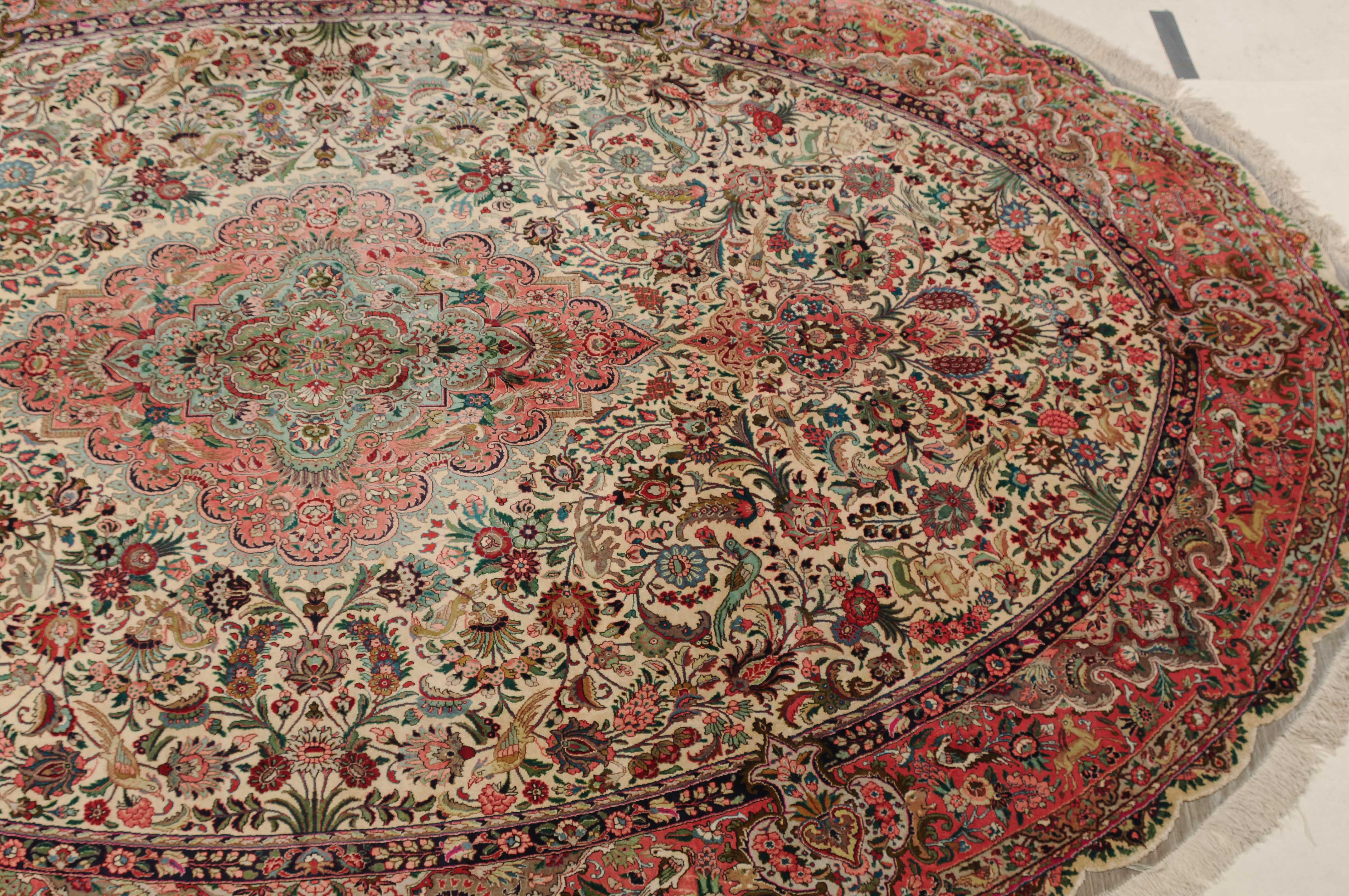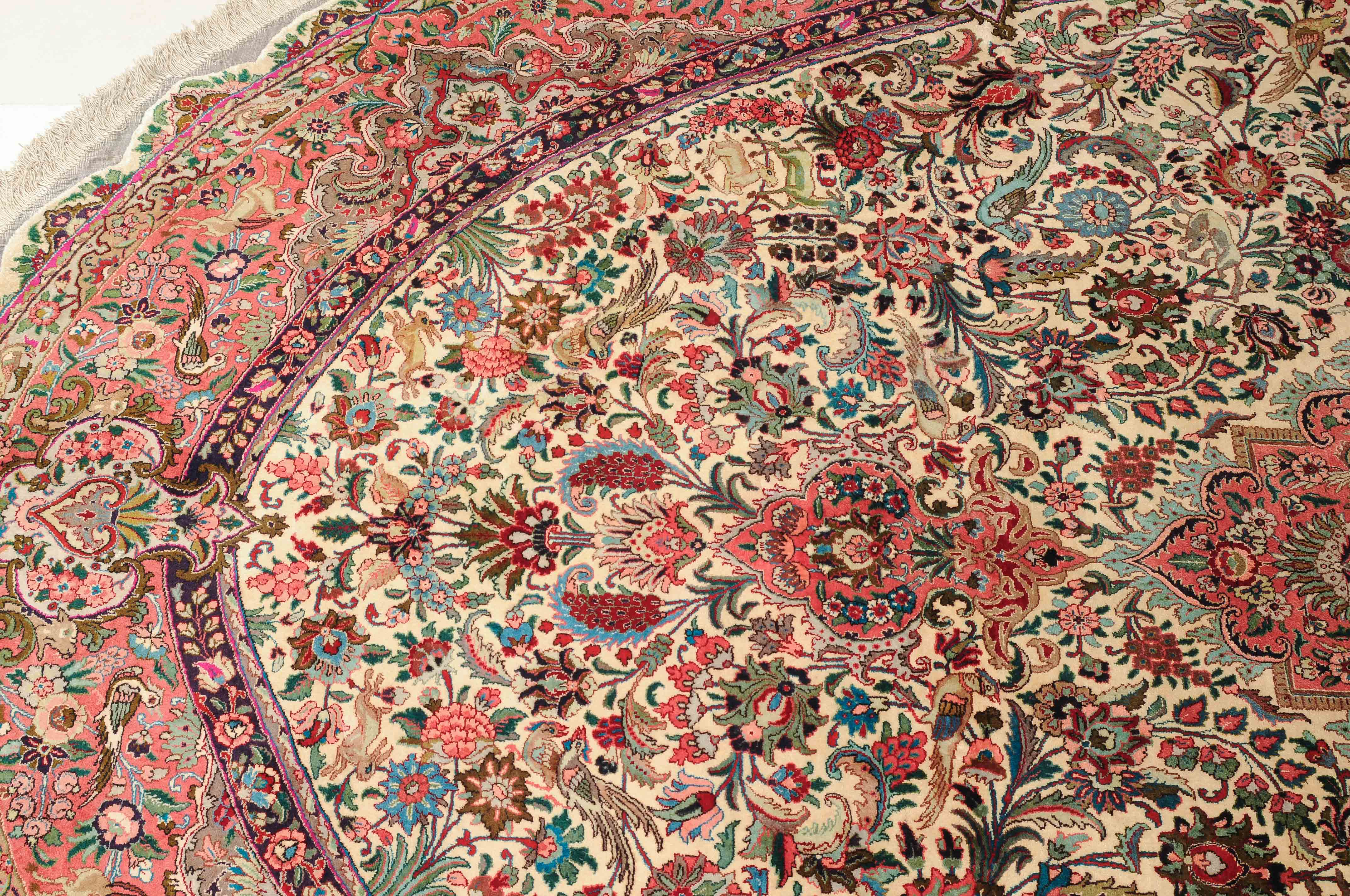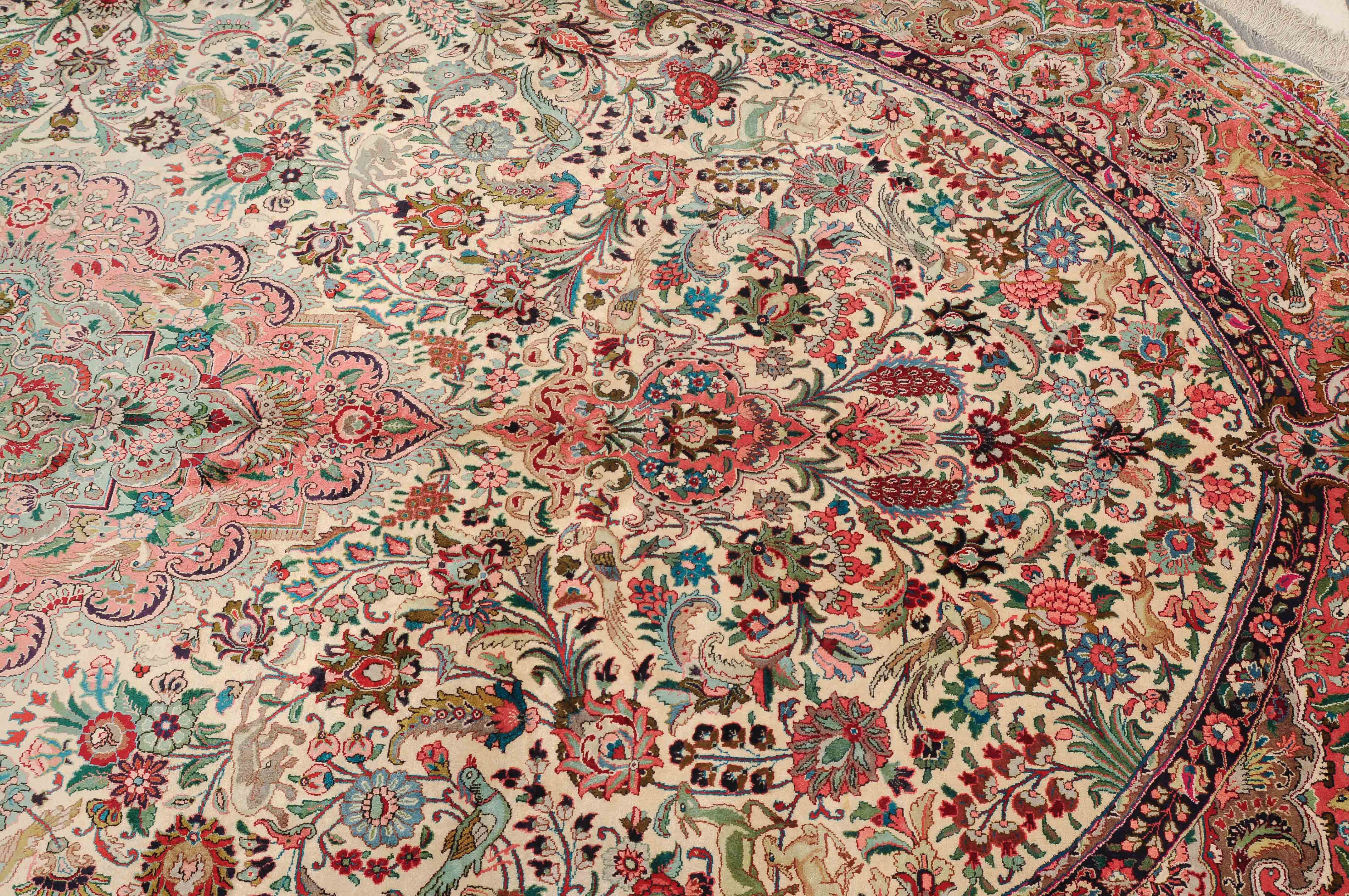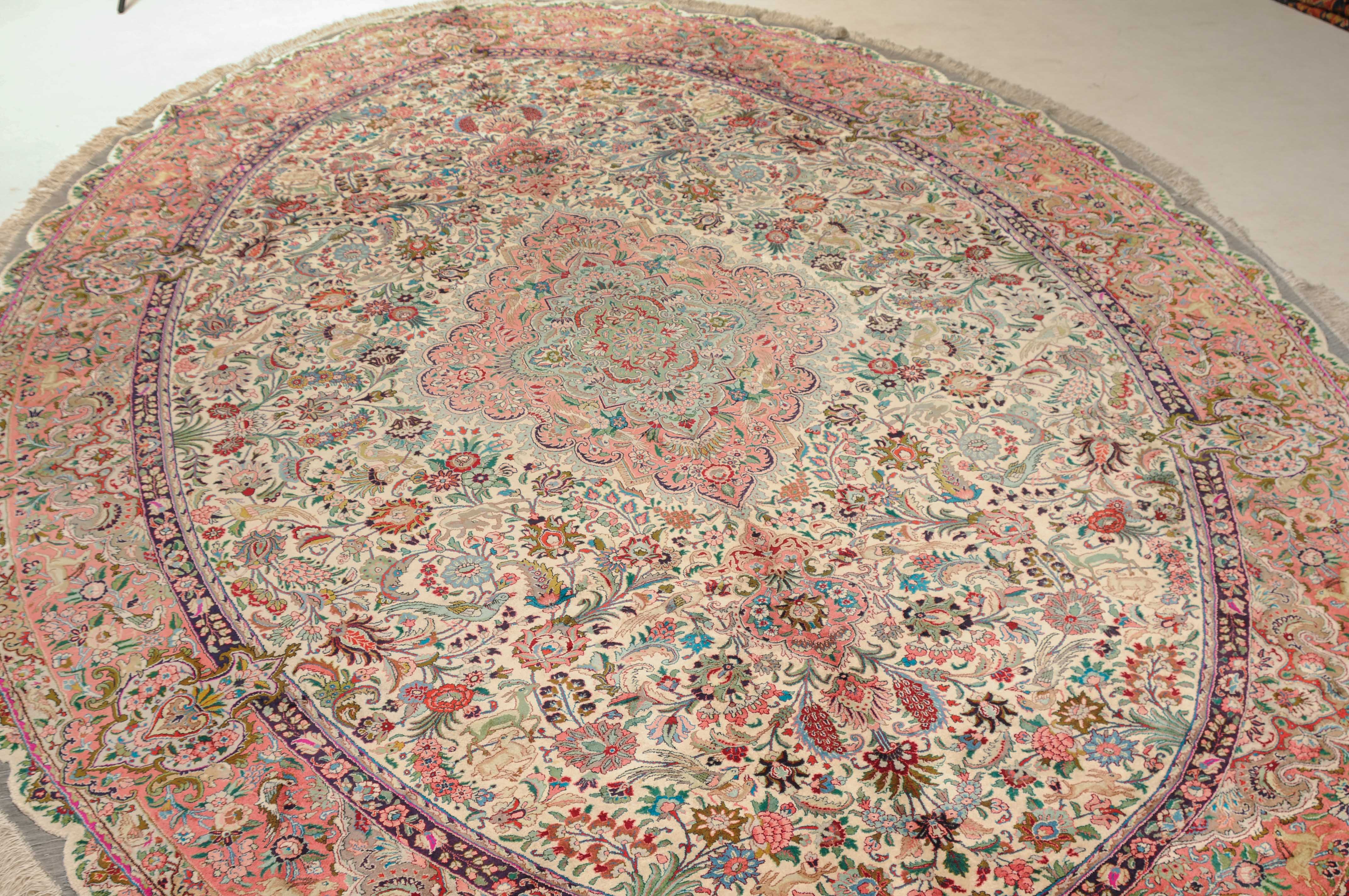 NW-Persien, um 1960. Flormaterial und Kette reine Seide. Aussergewöhnliches ovales Format. Im weissen Mittelfeld ruht ein elegantes rosarotes Zitronen-Medaillon, dicht umgeben von Blütenpalmetten, feingliedrigen Ranken, Tieren und Vögeln in verschiedensten Variationen und Farbtönen. Mehrere florale Nebenbordüren umgeben die breite rote, mit Palmetten, Ranken und Tieren auf dekorative Weise geschmückte Hauptbordüre. Sehr gute Erhaltung. 250x360 cm (ft. 8.3x11.9).