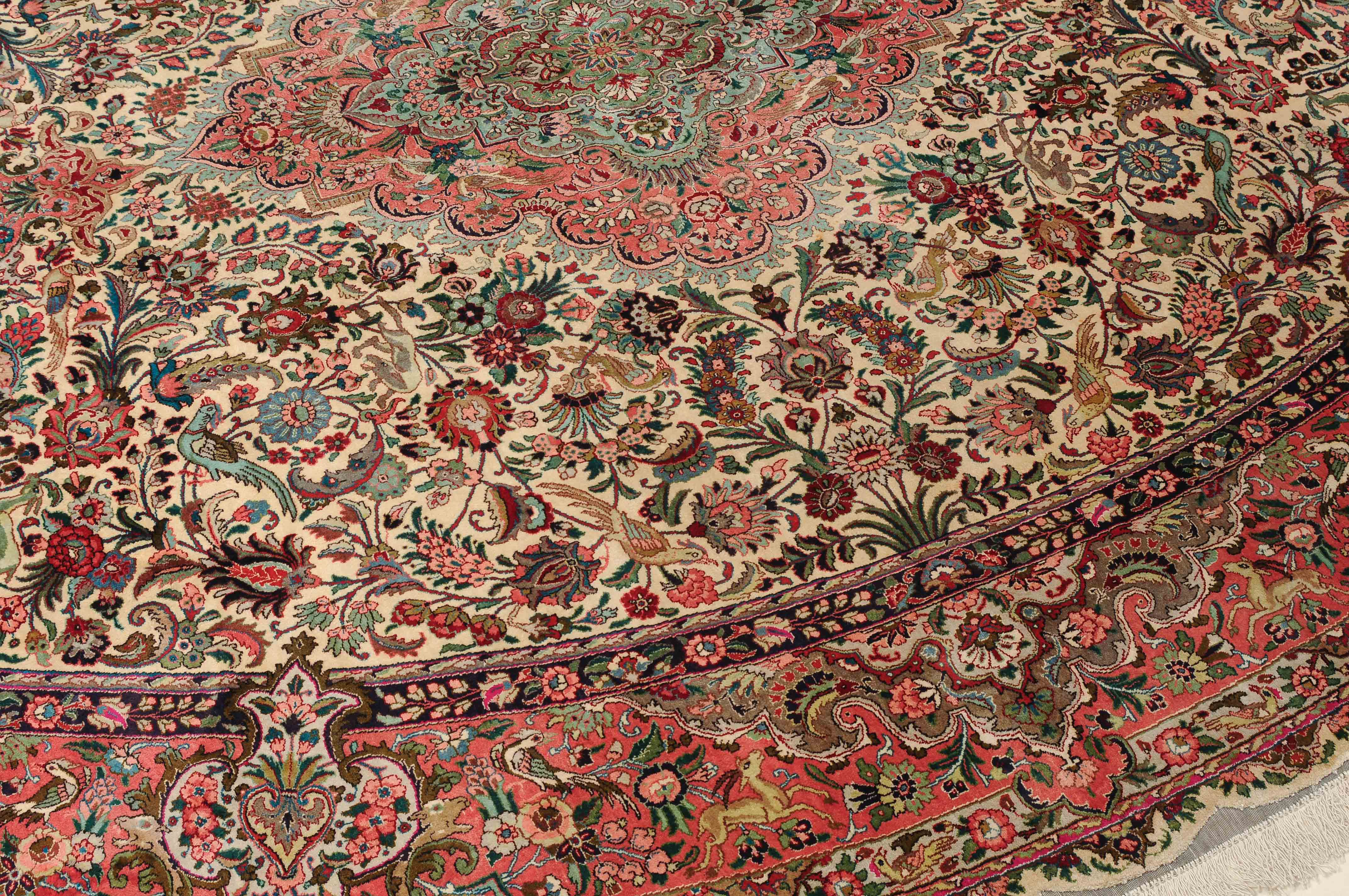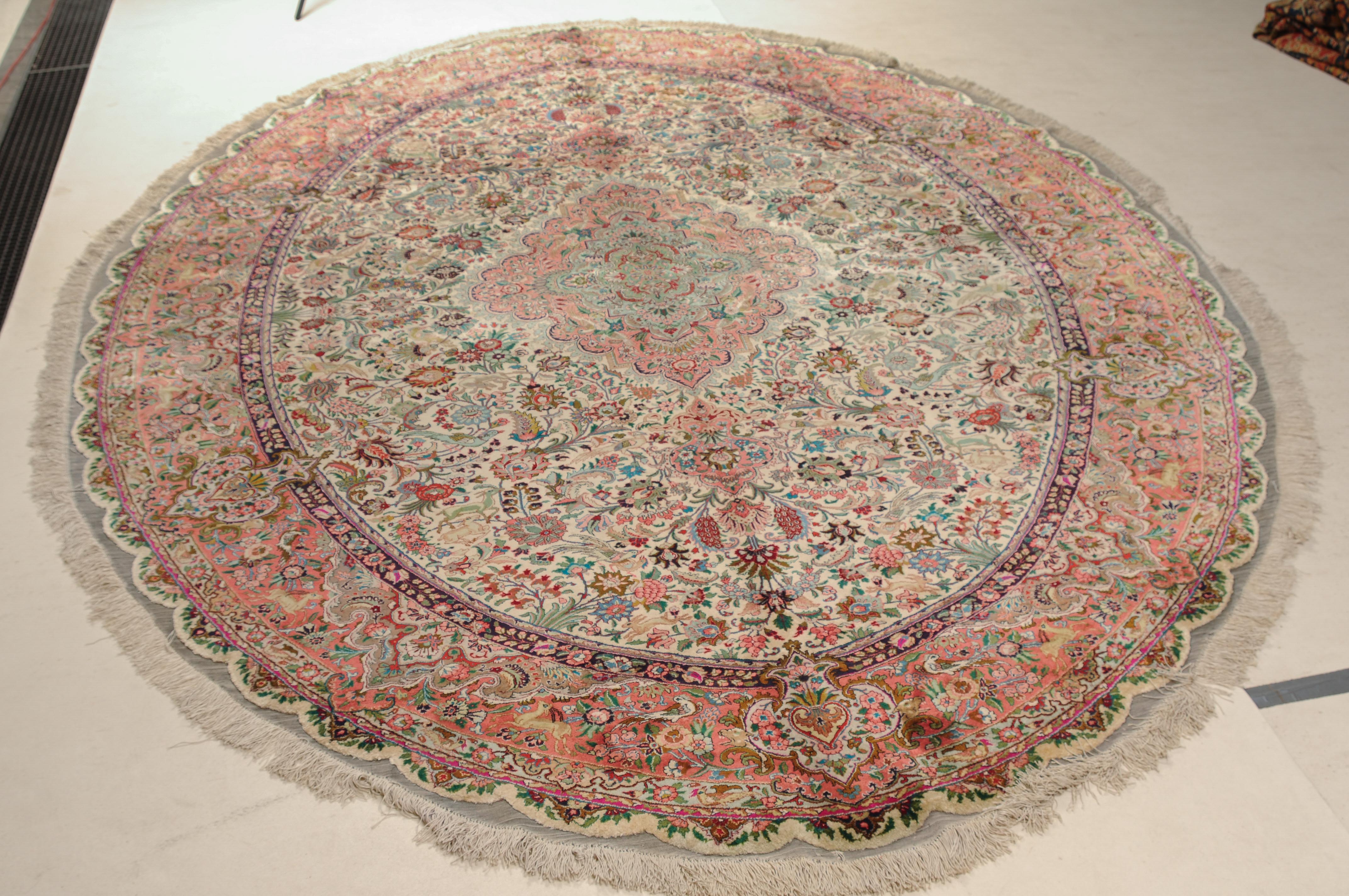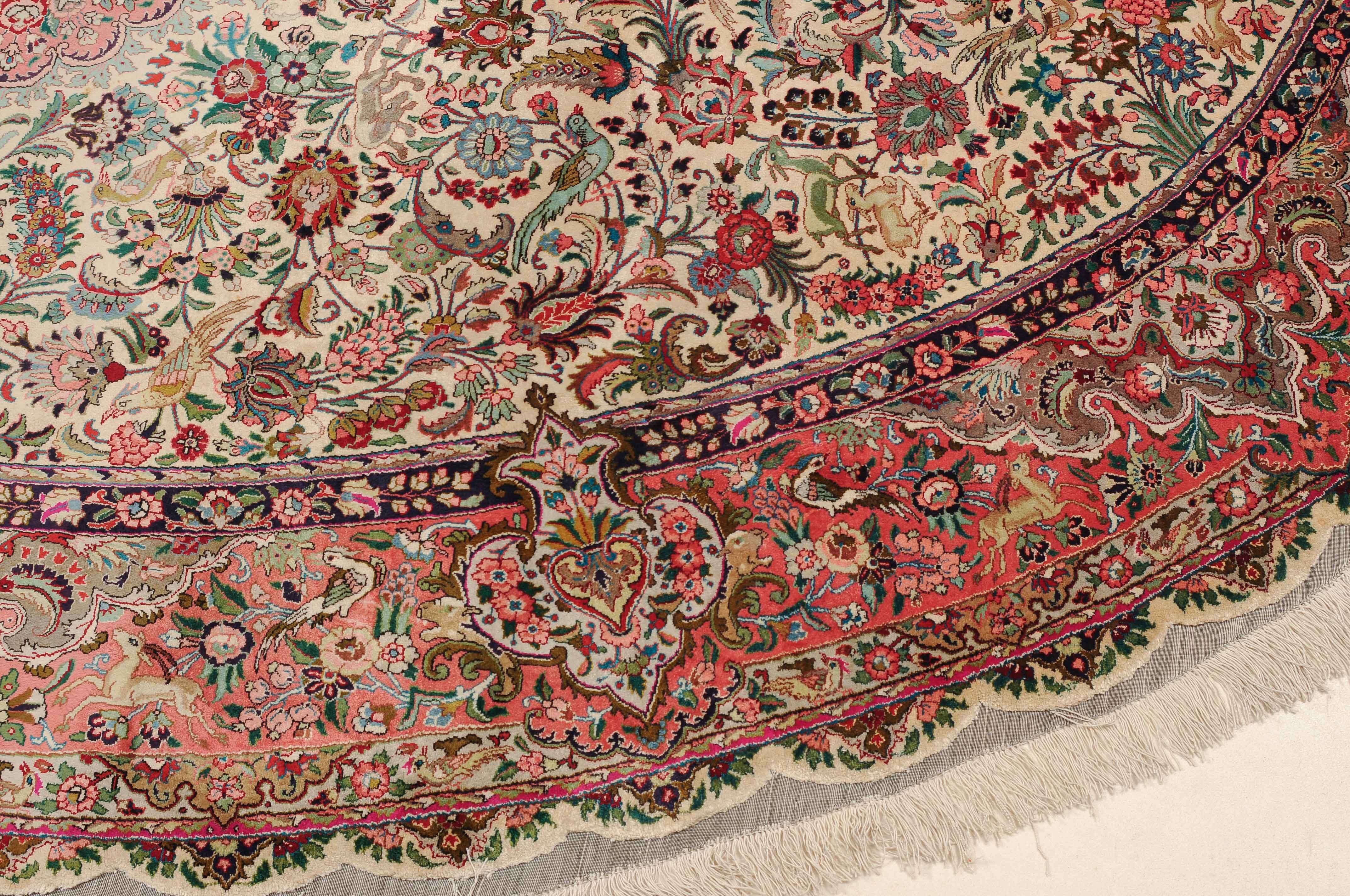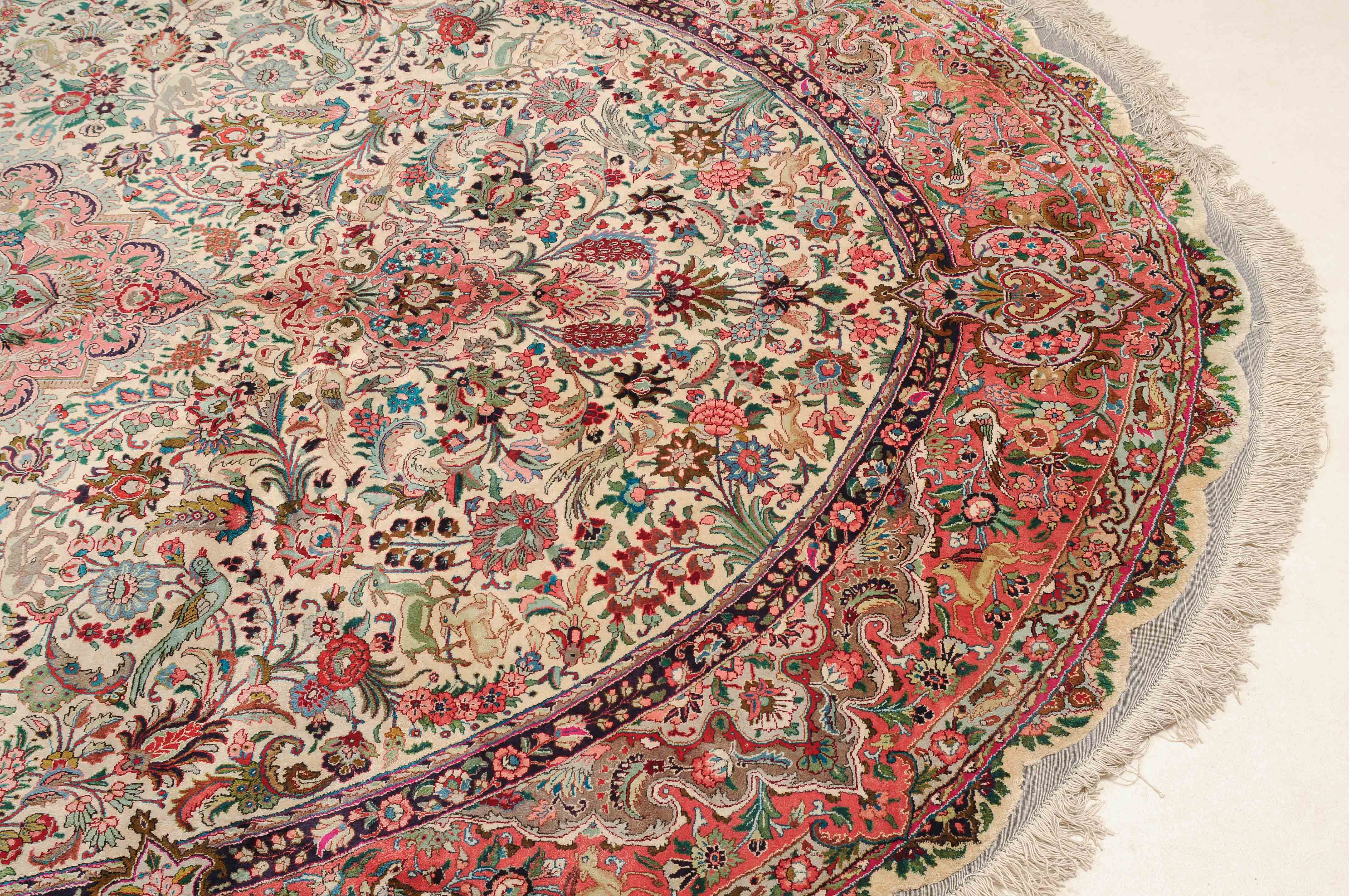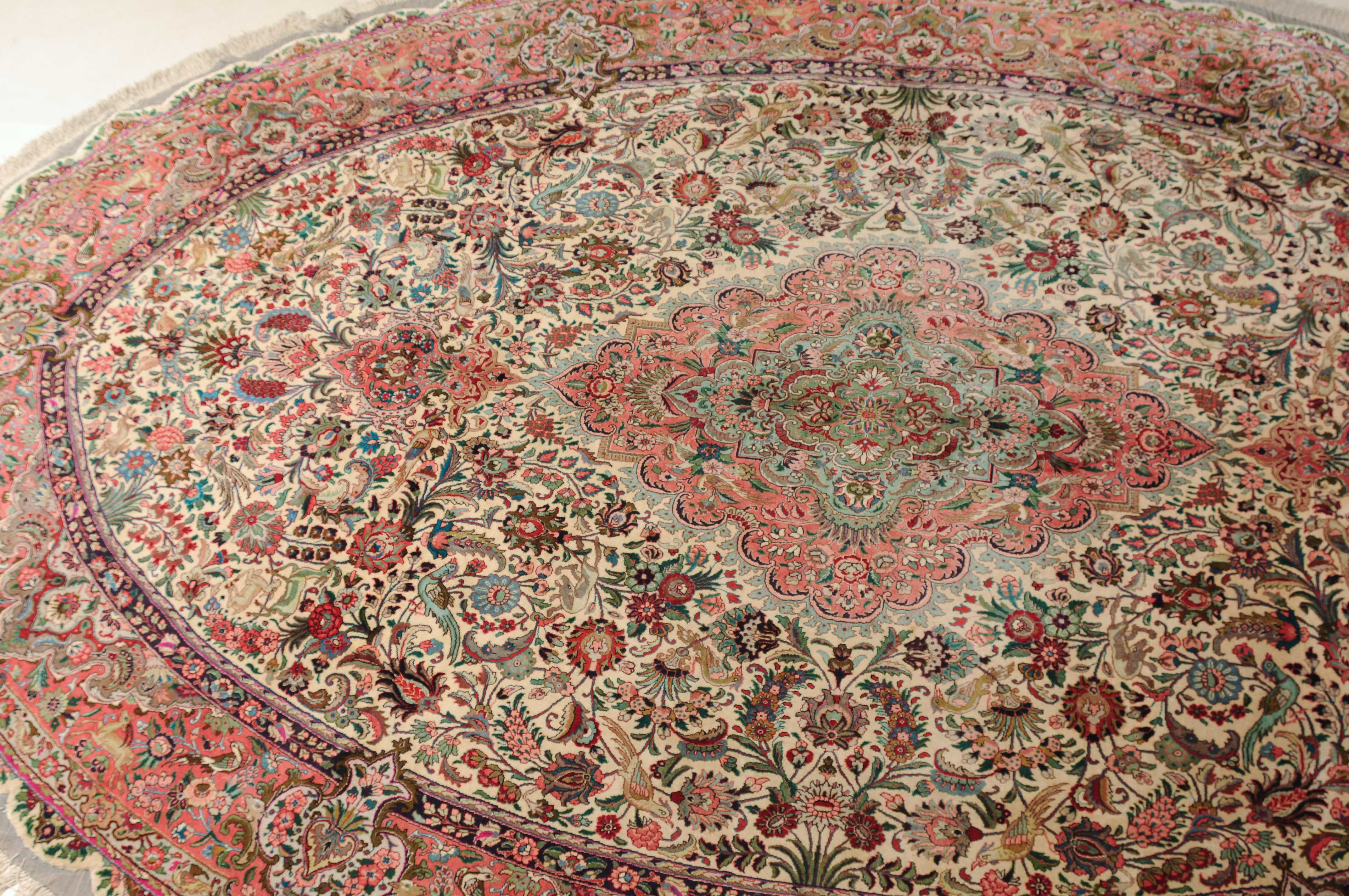 NW-Persien, um 1960. Flormaterial und Kette reine Seide. Aussergewöhnliches ovales Format. Im weissen Mittelfeld ruht ein elegantes rosarotes Zitronen-Medaillon, dicht umgeben von Blütenpalmetten, feingliedrigen Ranken, Tieren und Vögeln in verschiedensten Variationen und Farbtönen. Mehrere florale Nebenbordüren umgeben die breite rote, mit Palmetten, Ranken und Tieren auf dekorative Weise geschmückte Hauptbordüre. Sehr gute Erhaltung. 250x360 cm (ft. 8.3x11.9).