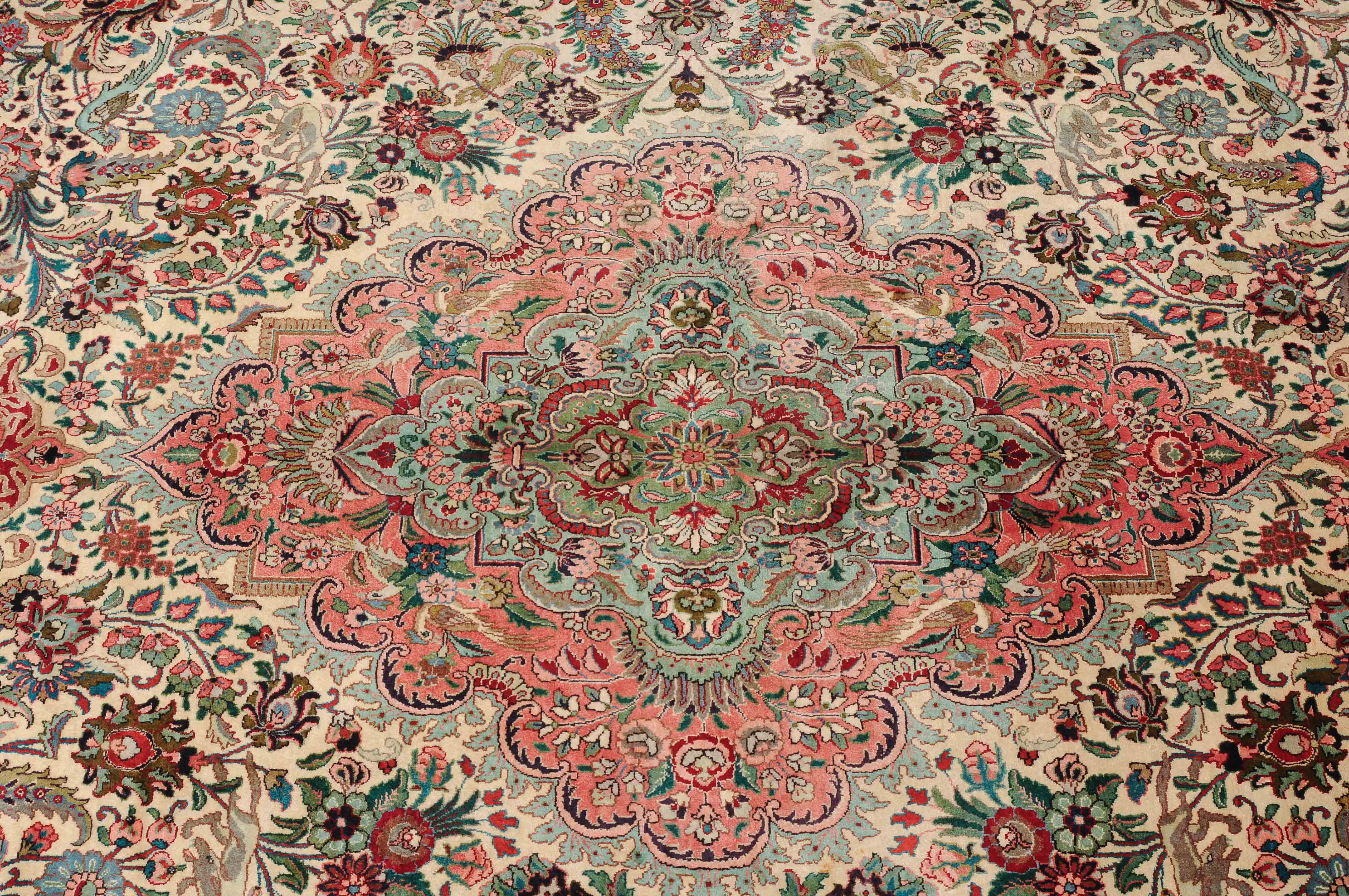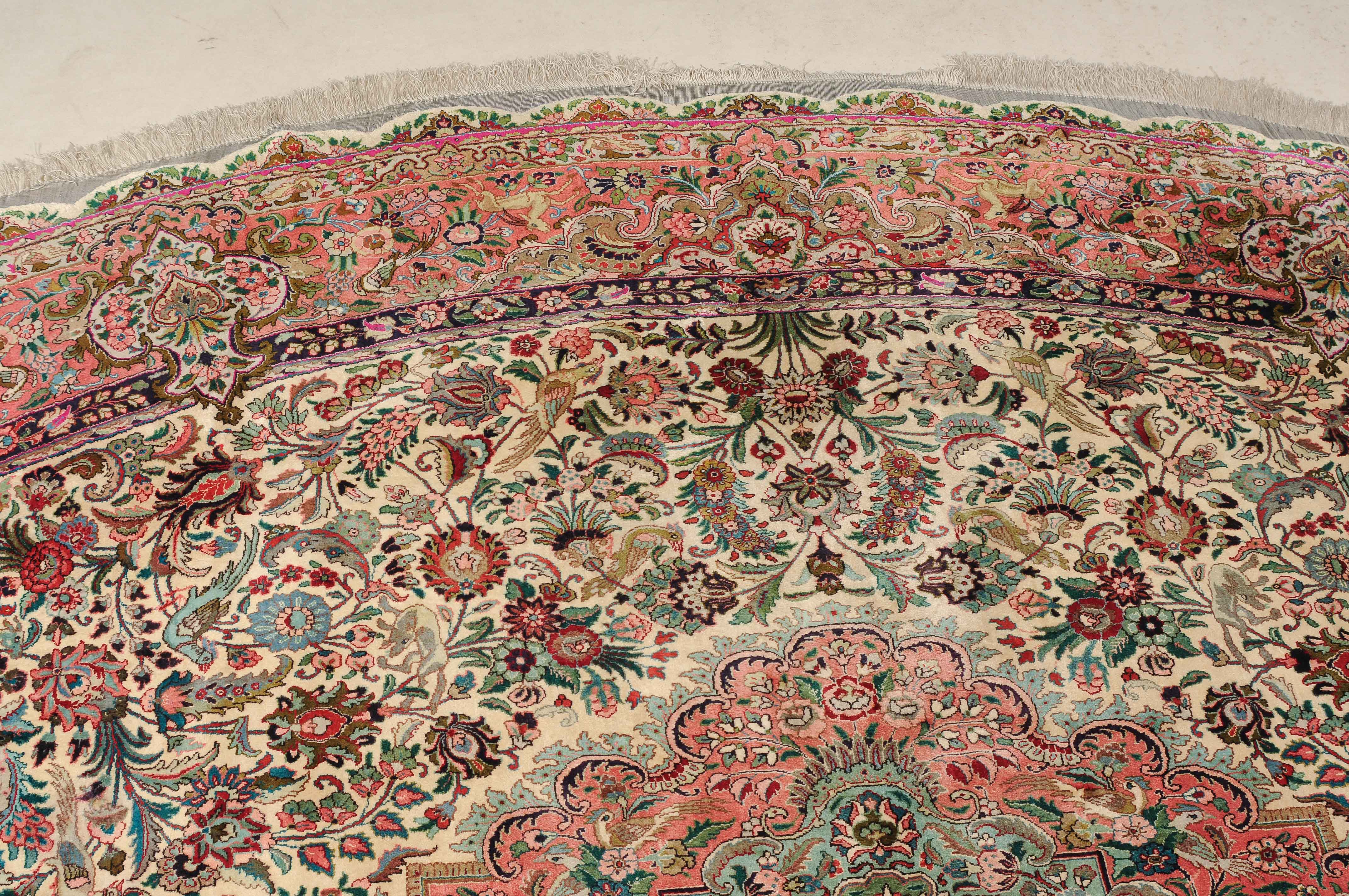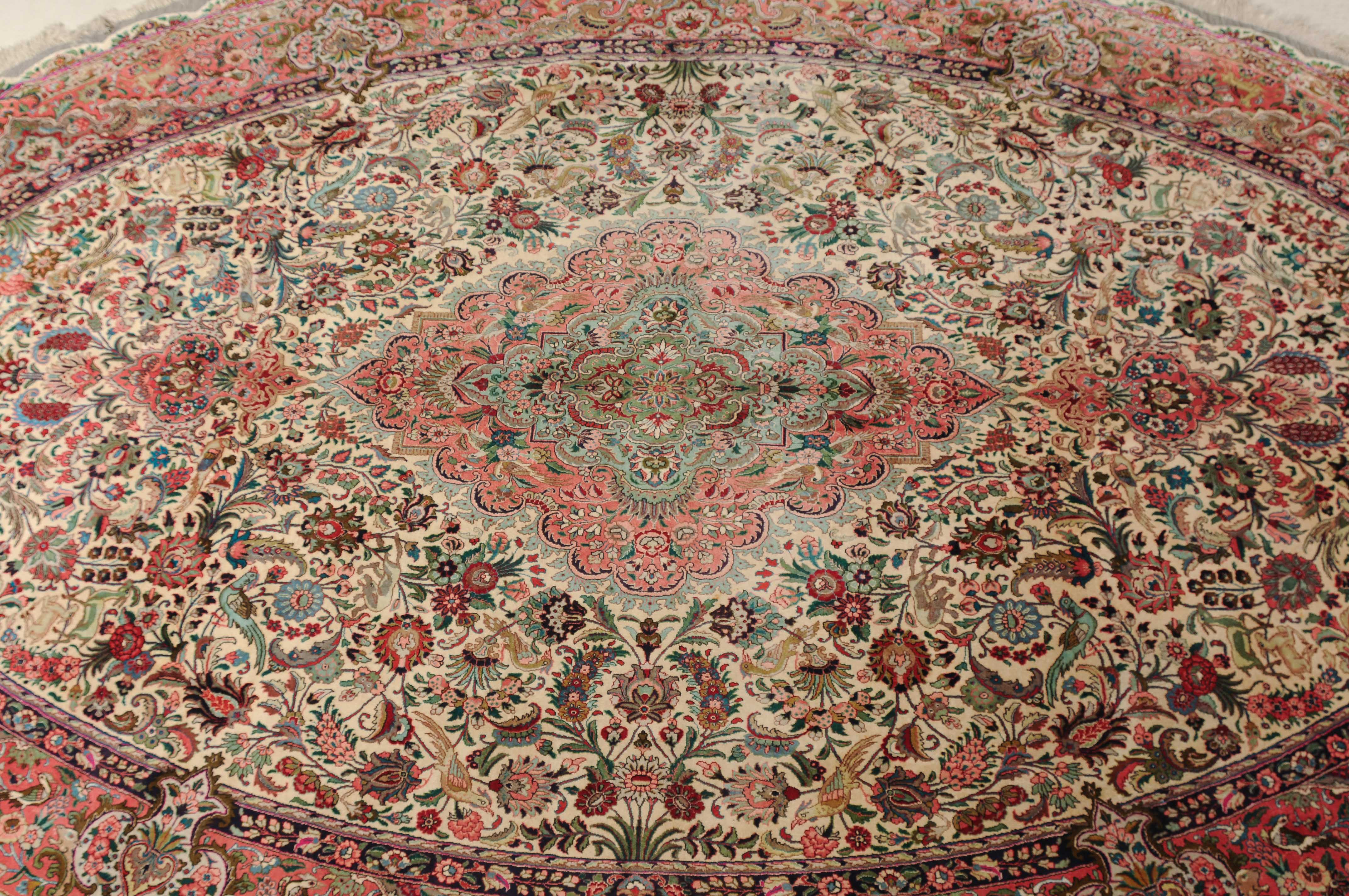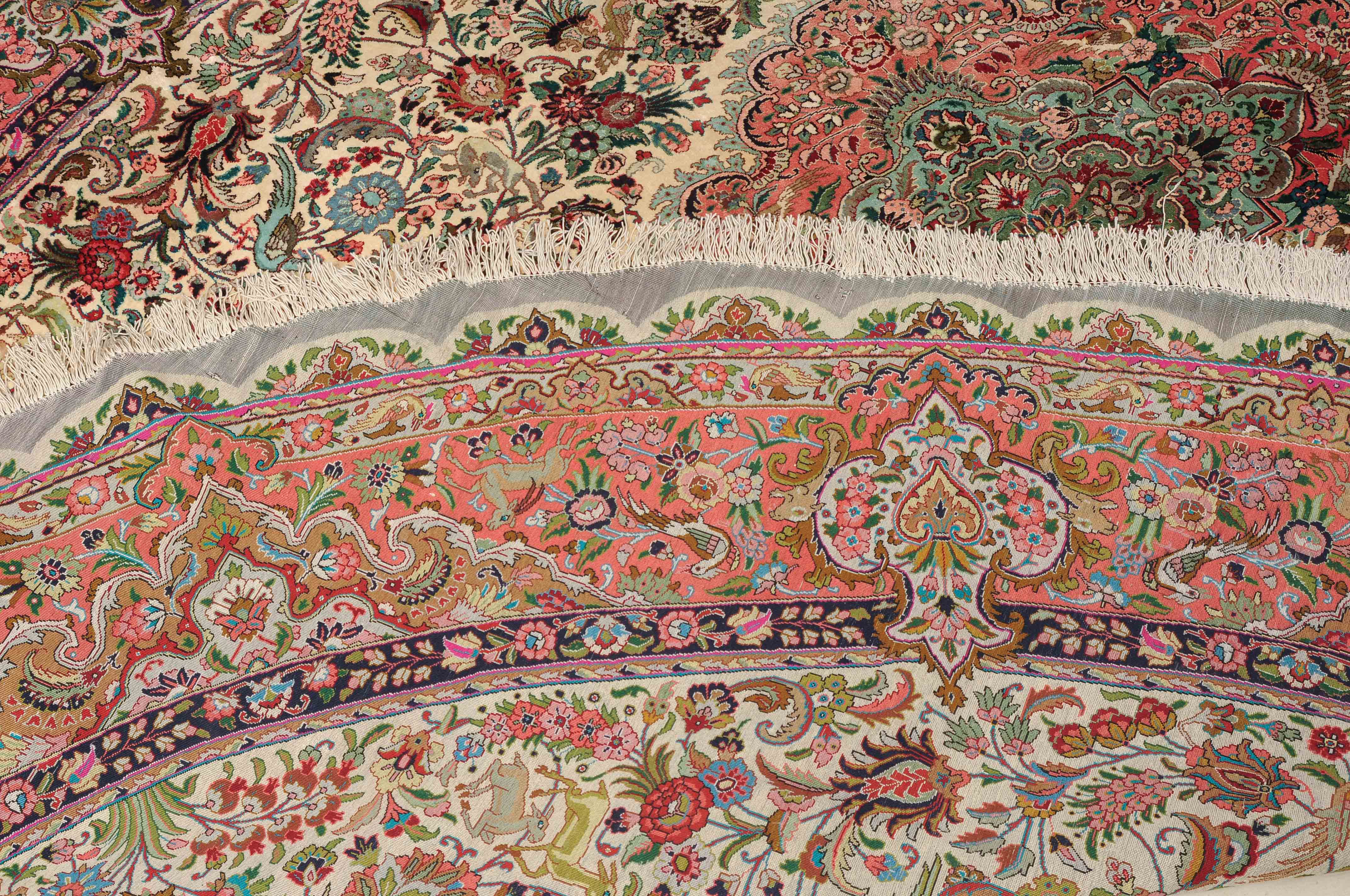 NW-Persien, um 1960. Flormaterial und Kette reine Seide. Aussergewöhnliches ovales Format. Im weissen Mittelfeld ruht ein elegantes rosarotes Zitronen-Medaillon, dicht umgeben von Blütenpalmetten, feingliedrigen Ranken, Tieren und Vögeln in verschiedensten Variationen und Farbtönen. Mehrere florale Nebenbordüren umgeben die breite rote, mit Palmetten, Ranken und Tieren auf dekorative Weise geschmückte Hauptbordüre. Sehr gute Erhaltung. 250x360 cm (ft. 8.3x11.9).