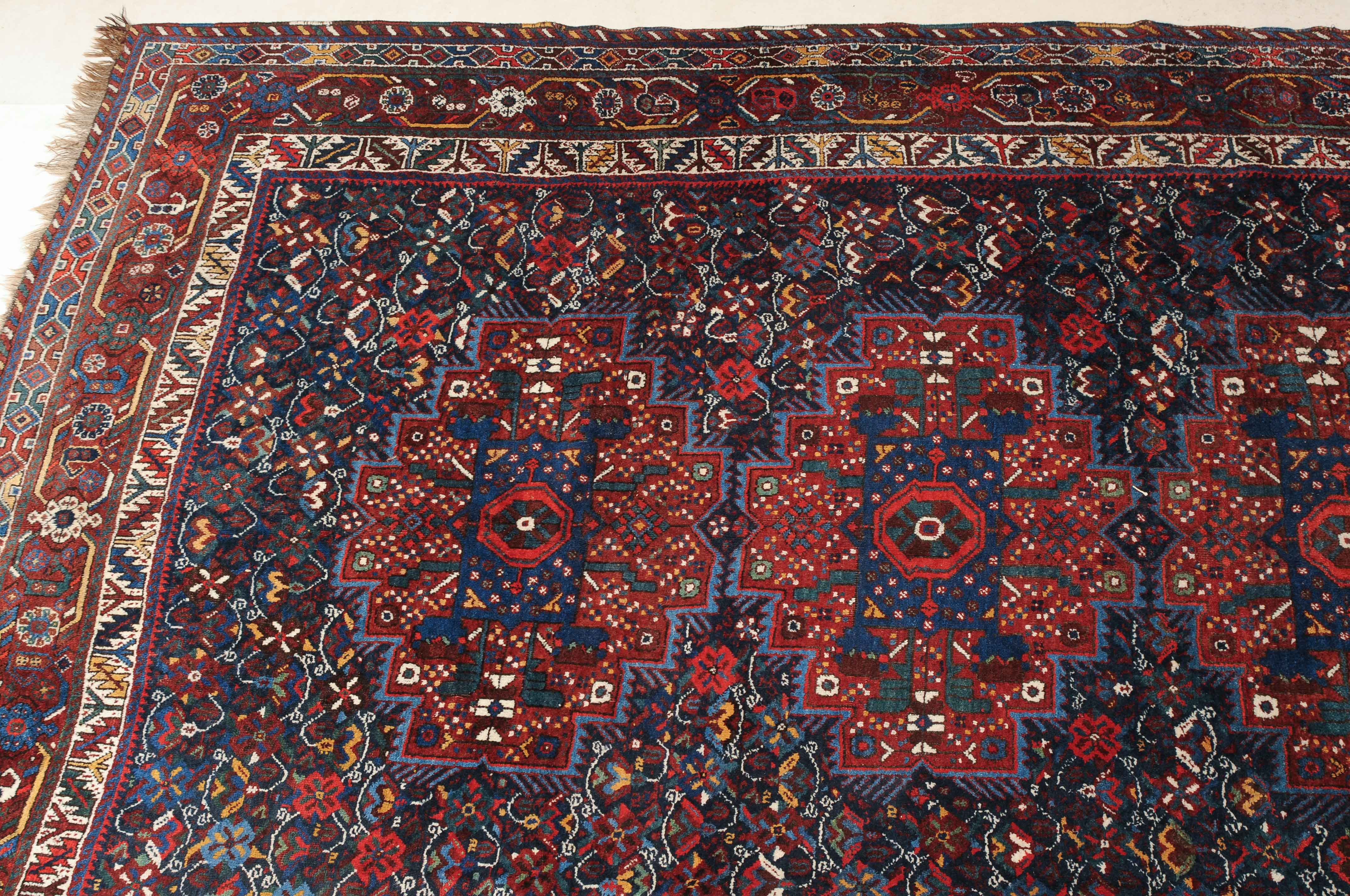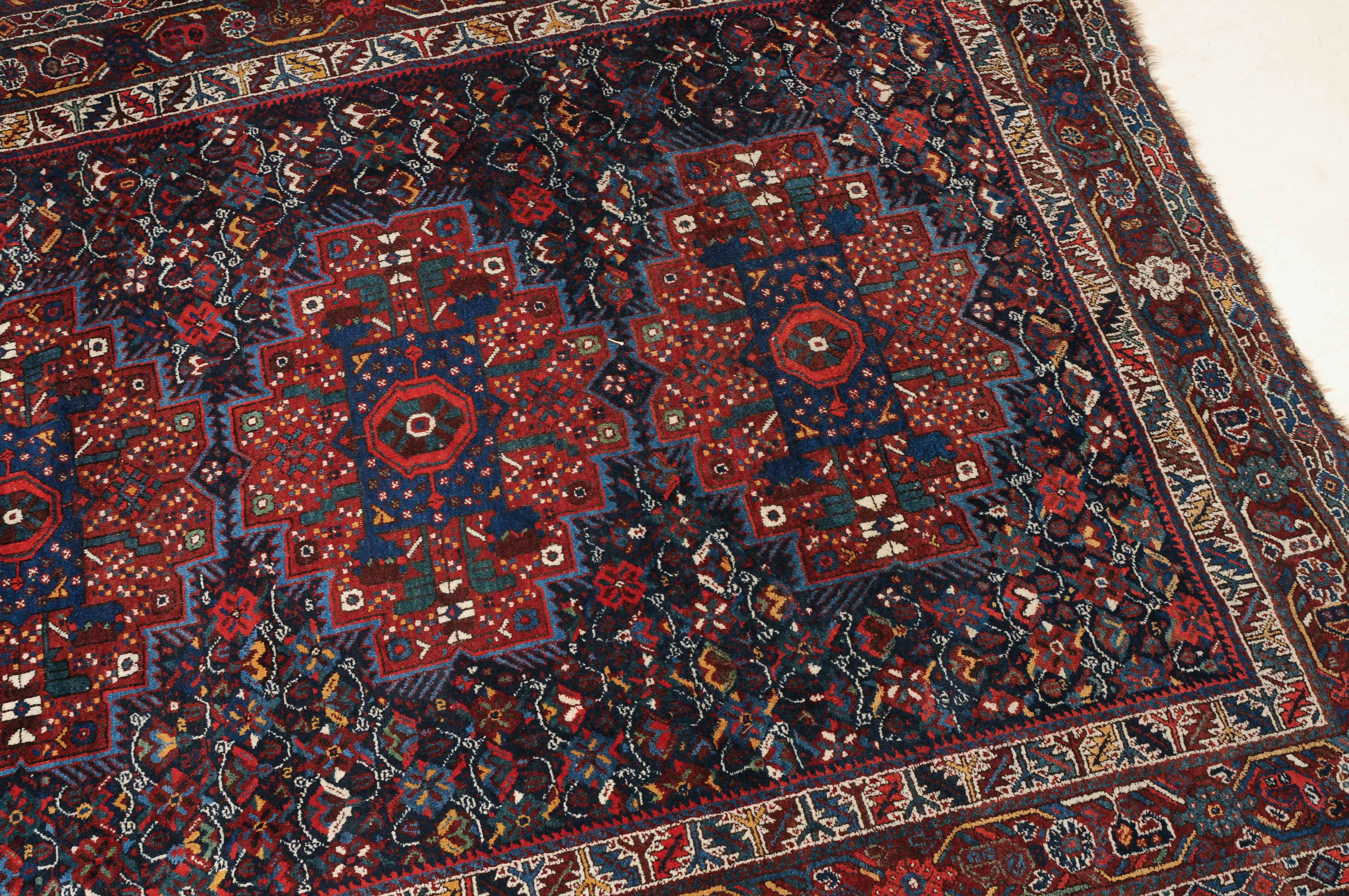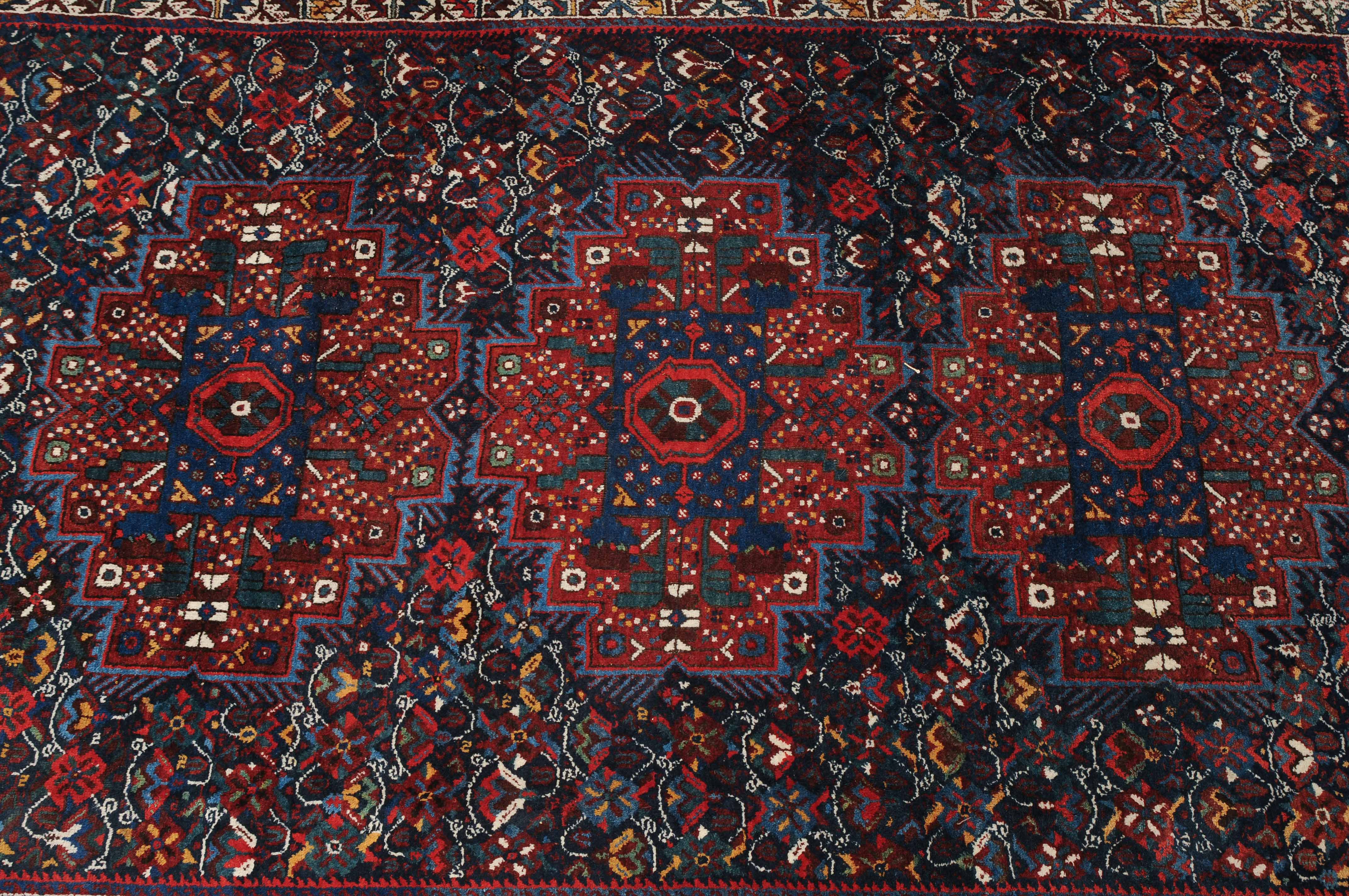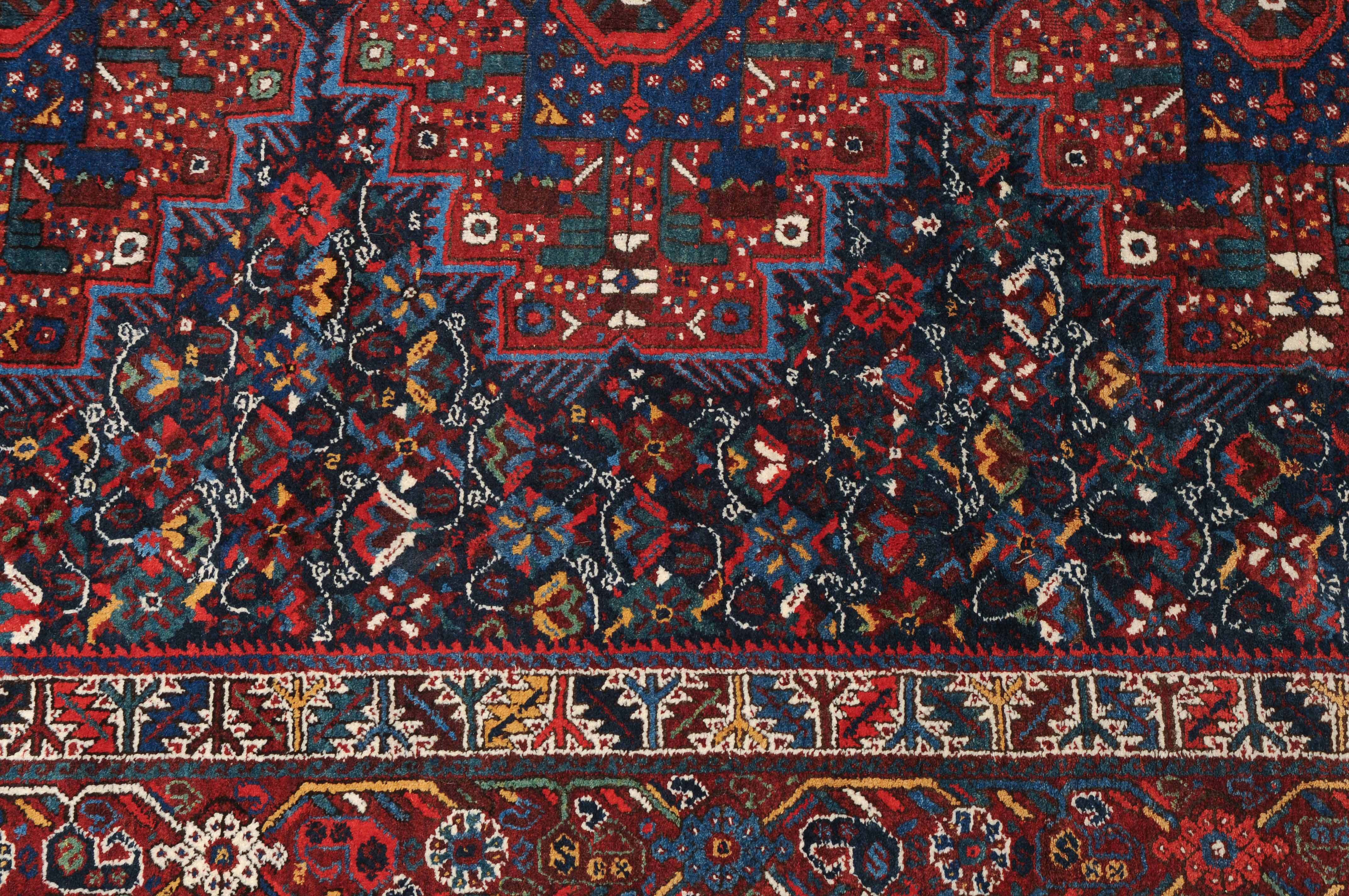 S-Persien, um 1910. Im dunkelblauen Mittelfeld präsentieren sich 3 grosszügig angelegte Polygone, flankiert von einem dicht verteilten Streudekor und Kompositionen aus Blütenranken, die schöne Farbakzente setzen. Mehrere dekorative Nebenbordüren umfassen die filigrane rote Palmetten- und Wellenranken-Hauptbordüre. Gebrauchsspuren. 215x290 cm (ft. 7.1x9.6).