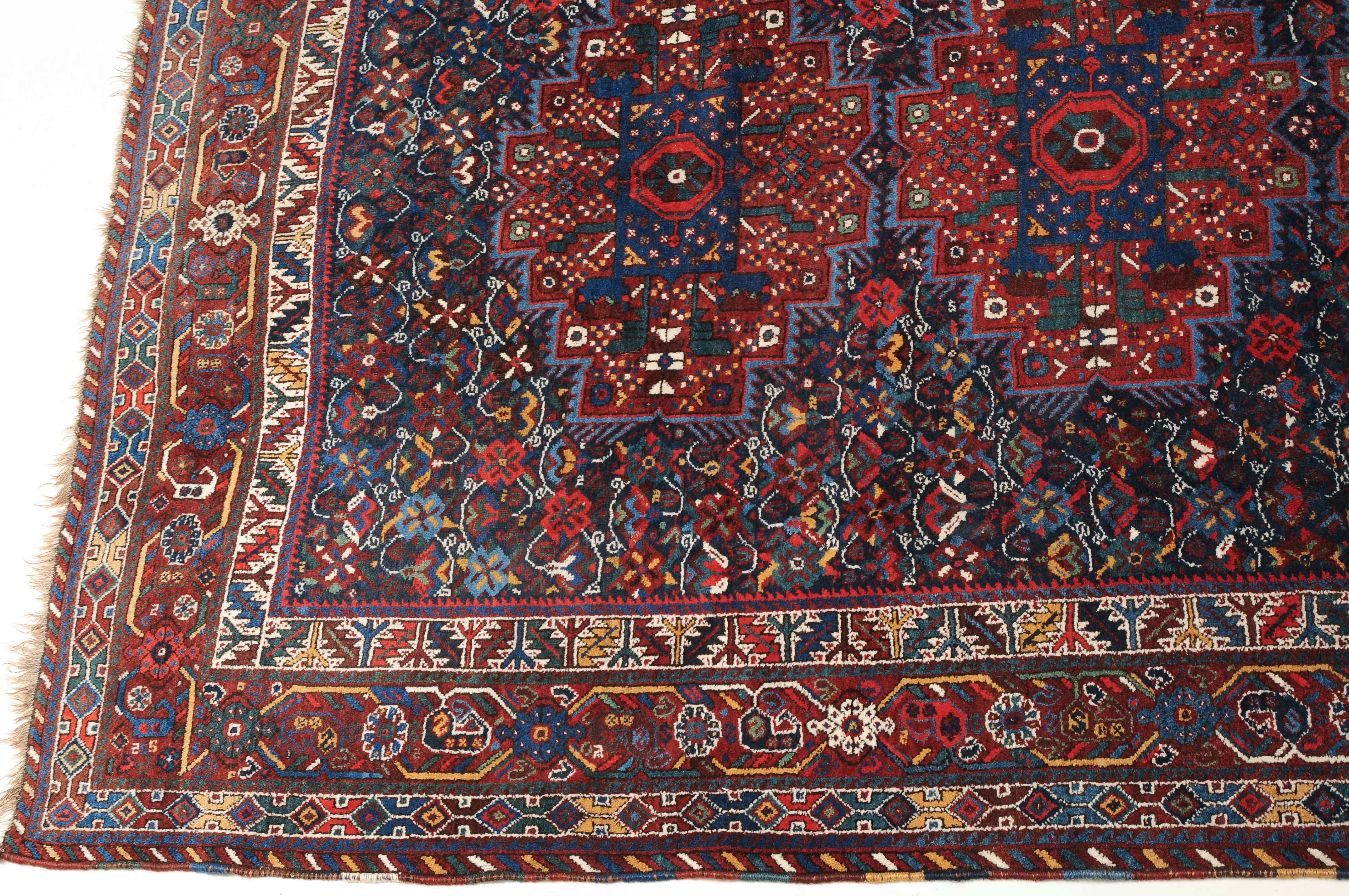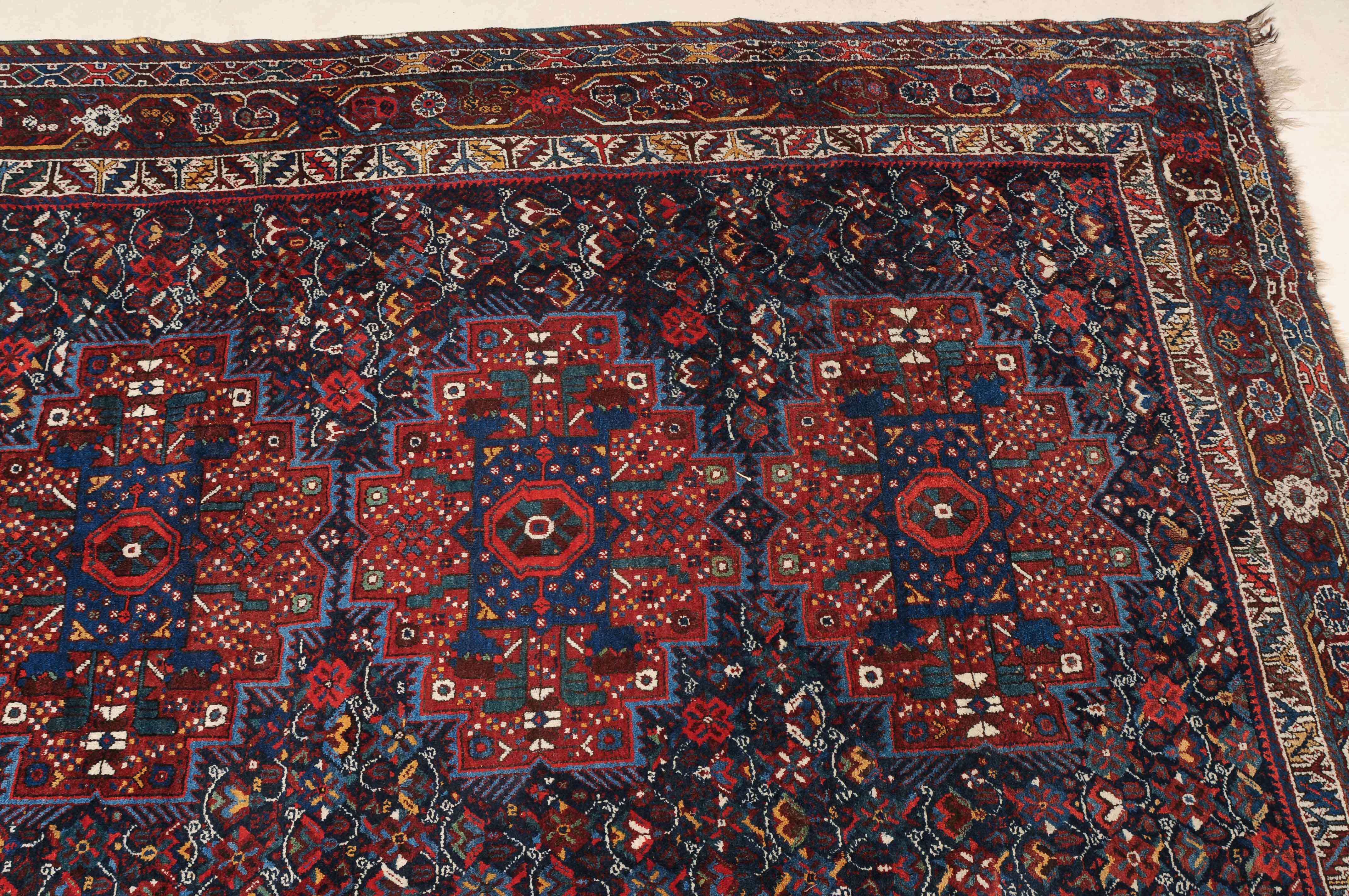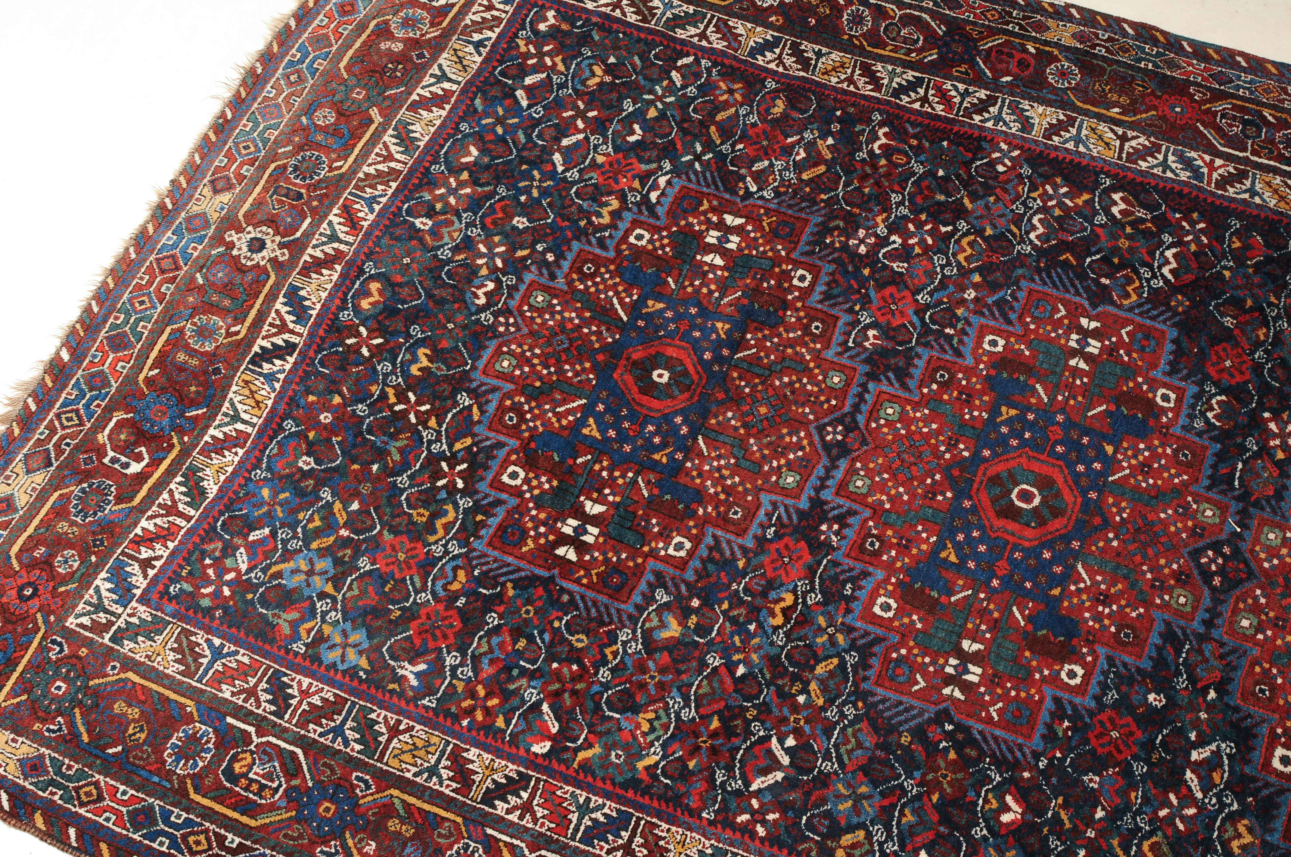 S-Persien, um 1910. Im dunkelblauen Mittelfeld präsentieren sich 3 grosszügig angelegte Polygone, flankiert von einem dicht verteilten Streudekor und Kompositionen aus Blütenranken, die schöne Farbakzente setzen. Mehrere dekorative Nebenbordüren umfassen die filigrane rote Palmetten- und Wellenranken-Hauptbordüre. Gebrauchsspuren. 215x290 cm (ft. 7.1x9.6).