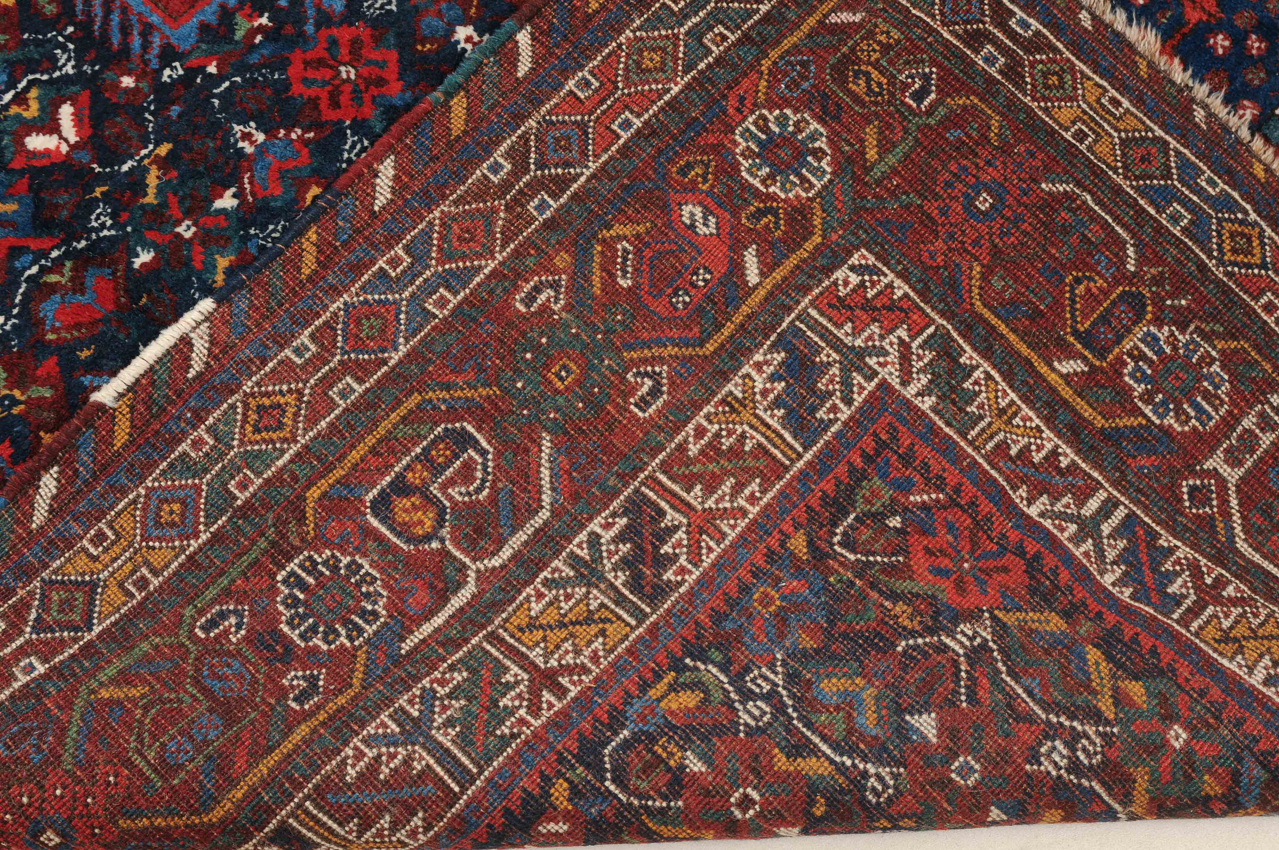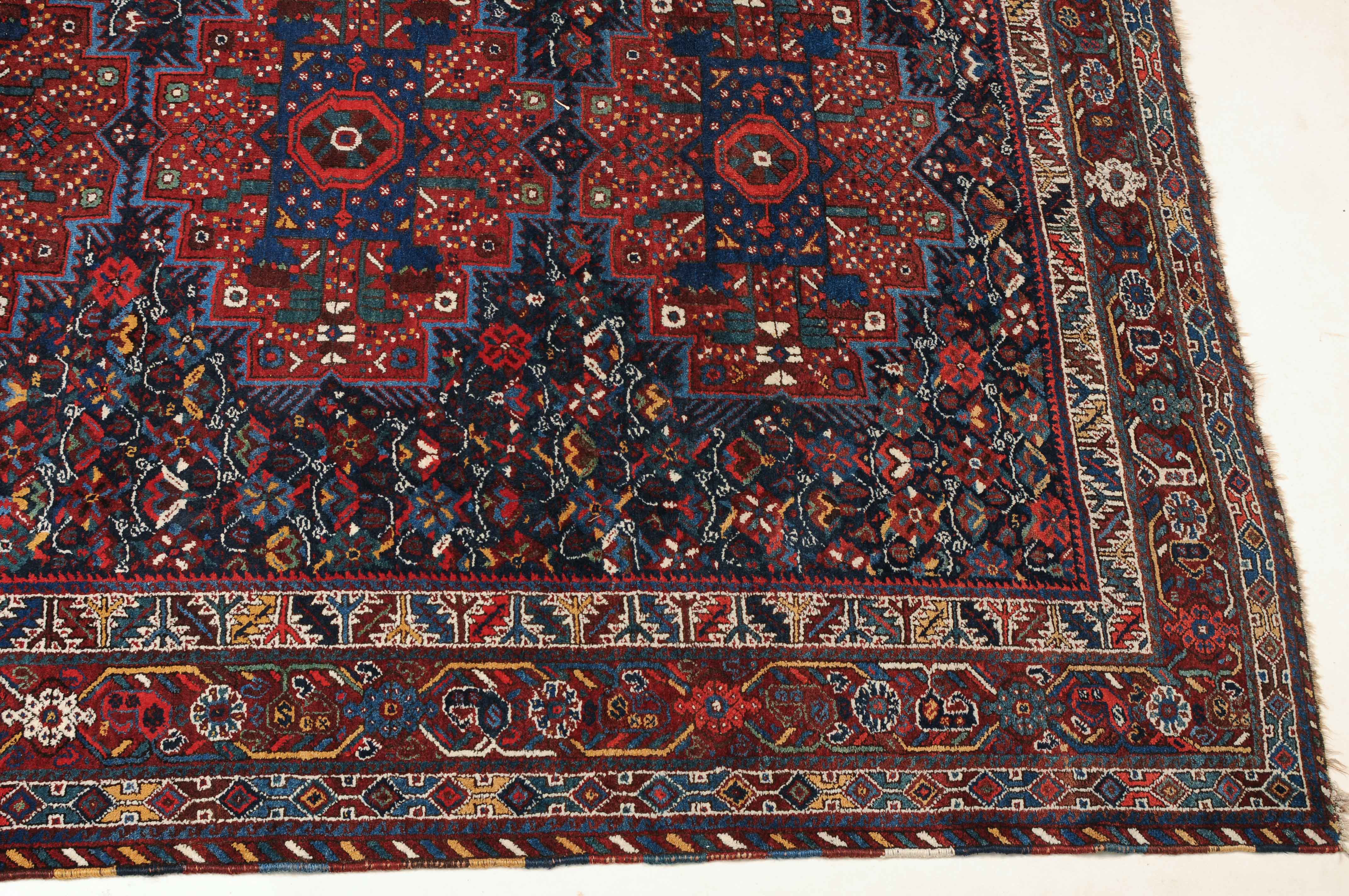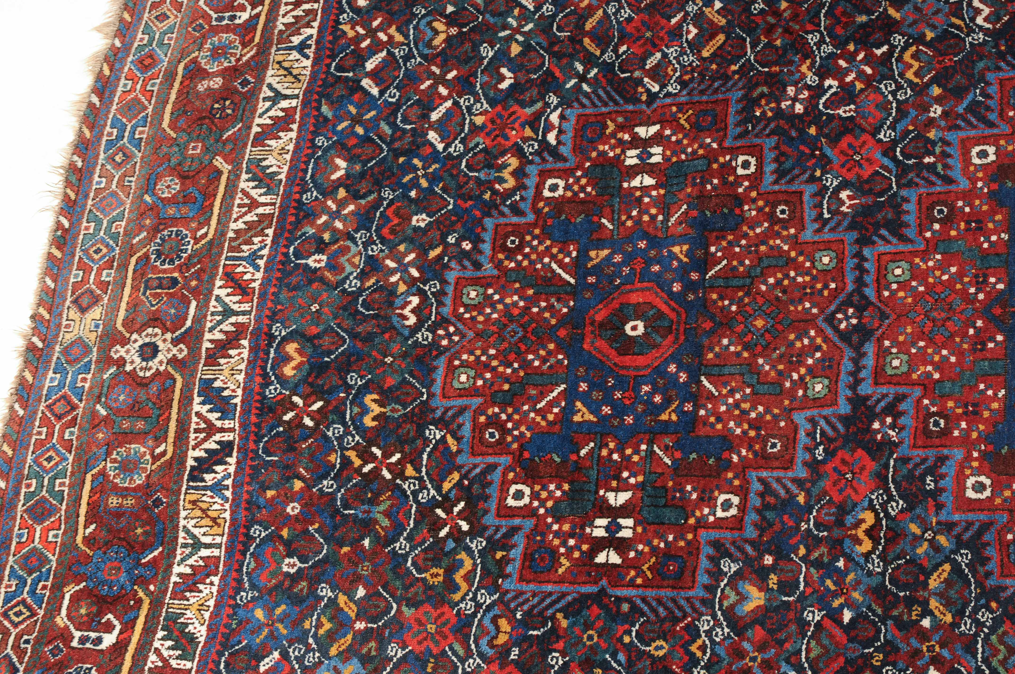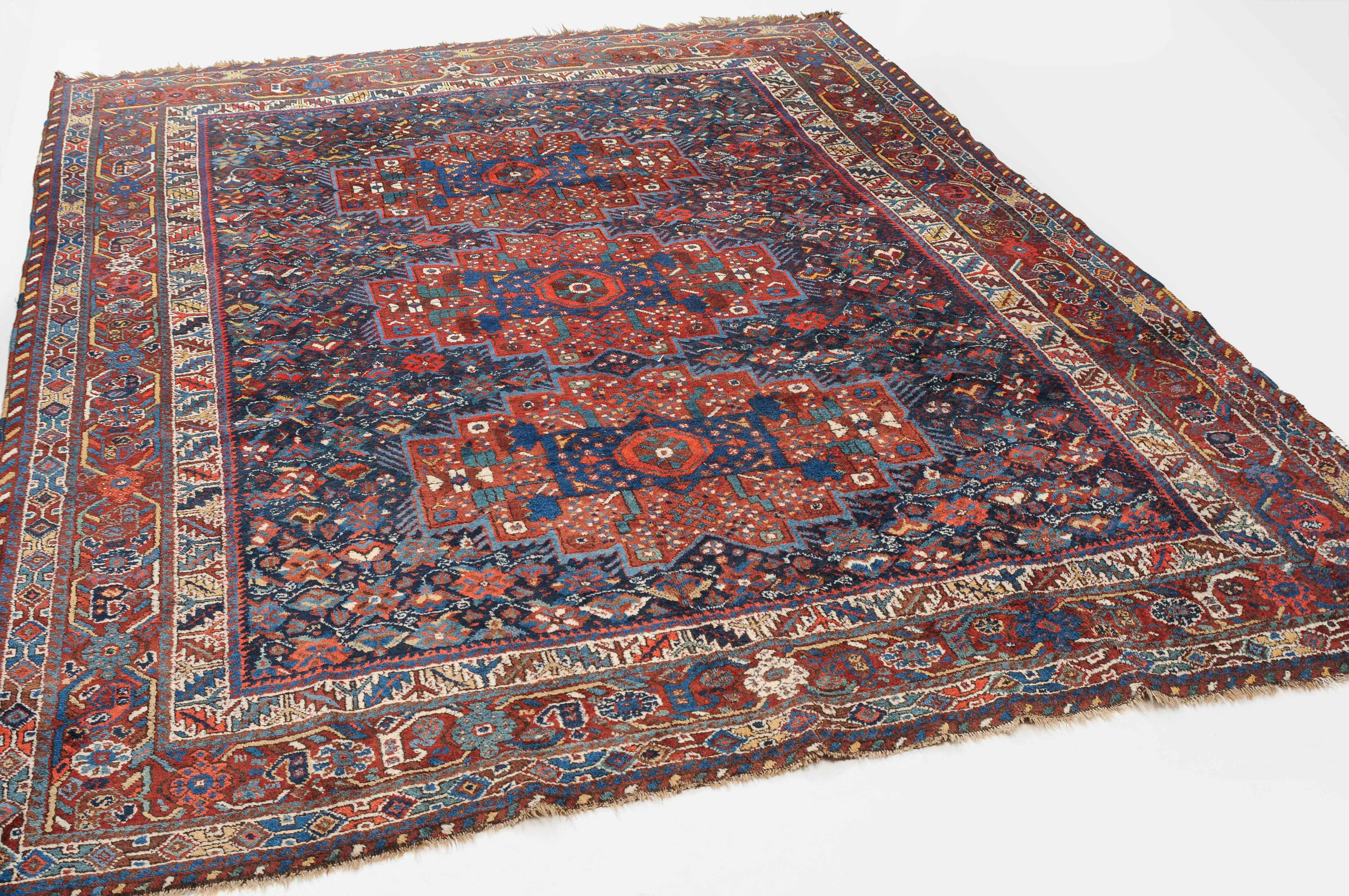 S-Persien, um 1910. Im dunkelblauen Mittelfeld präsentieren sich 3 grosszügig angelegte Polygone, flankiert von einem dicht verteilten Streudekor und Kompositionen aus Blütenranken, die schöne Farbakzente setzen. Mehrere dekorative Nebenbordüren umfassen die filigrane rote Palmetten- und Wellenranken-Hauptbordüre. Gebrauchsspuren. 215x290 cm (ft. 7.1x9.6).