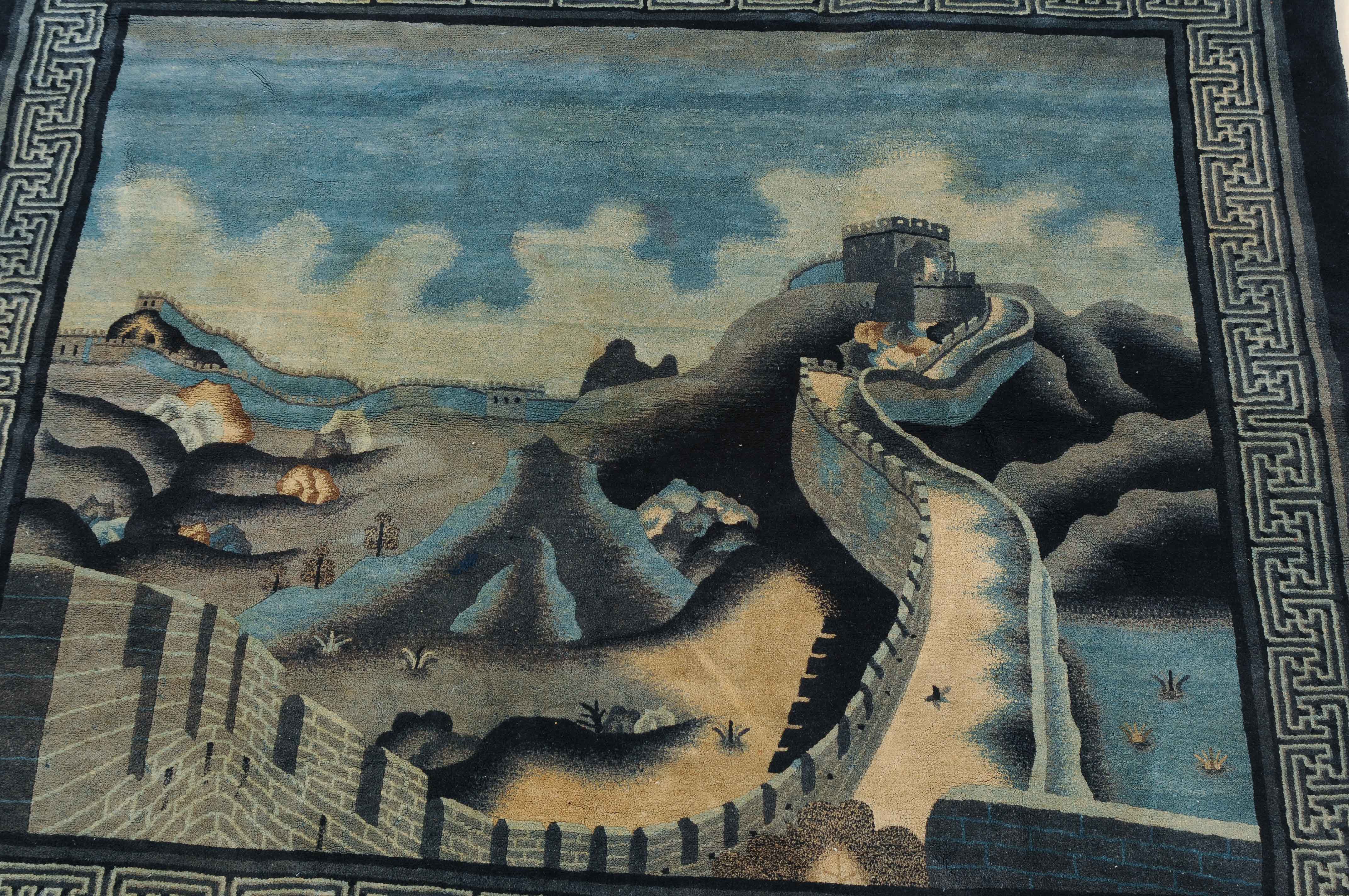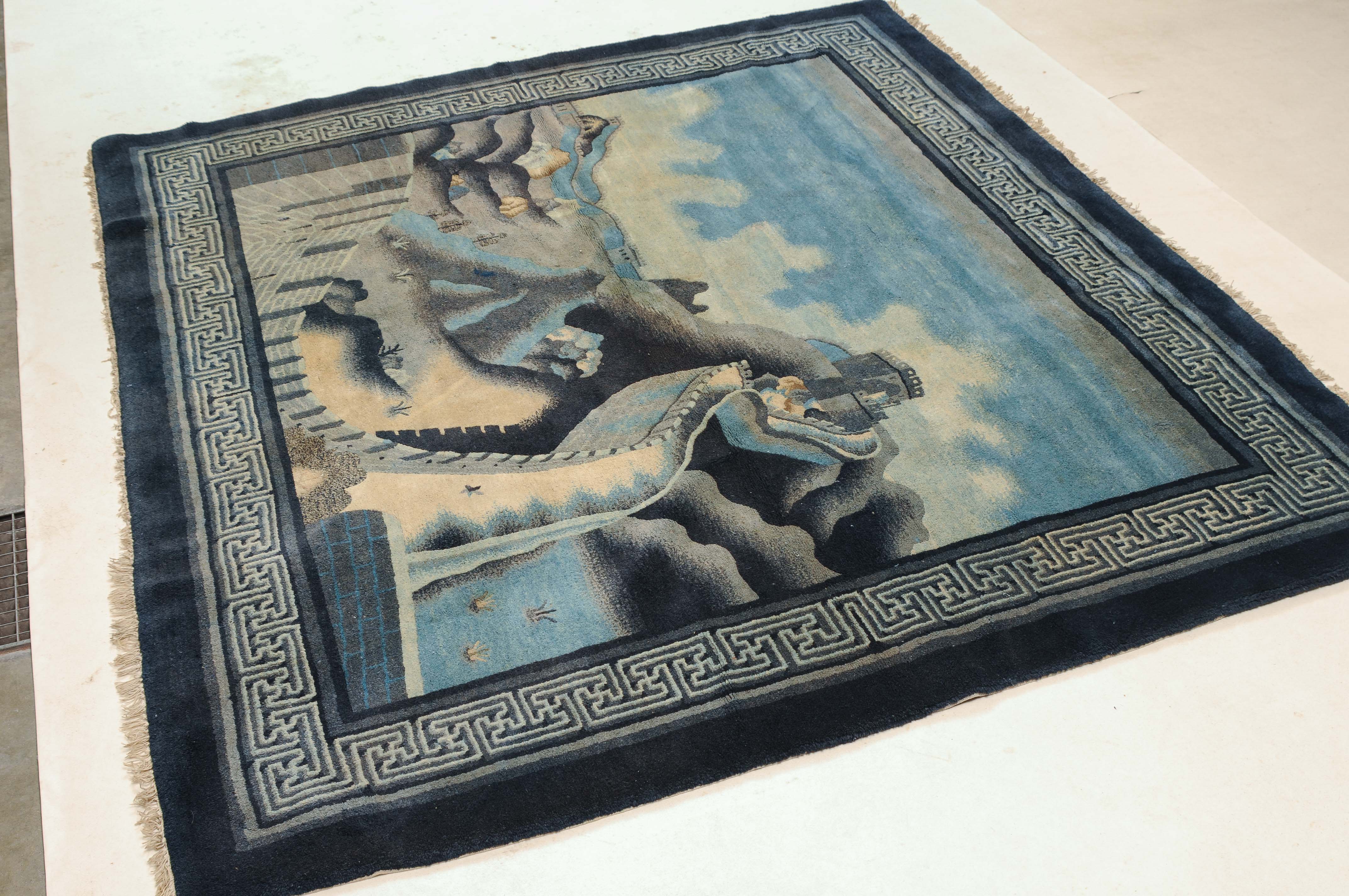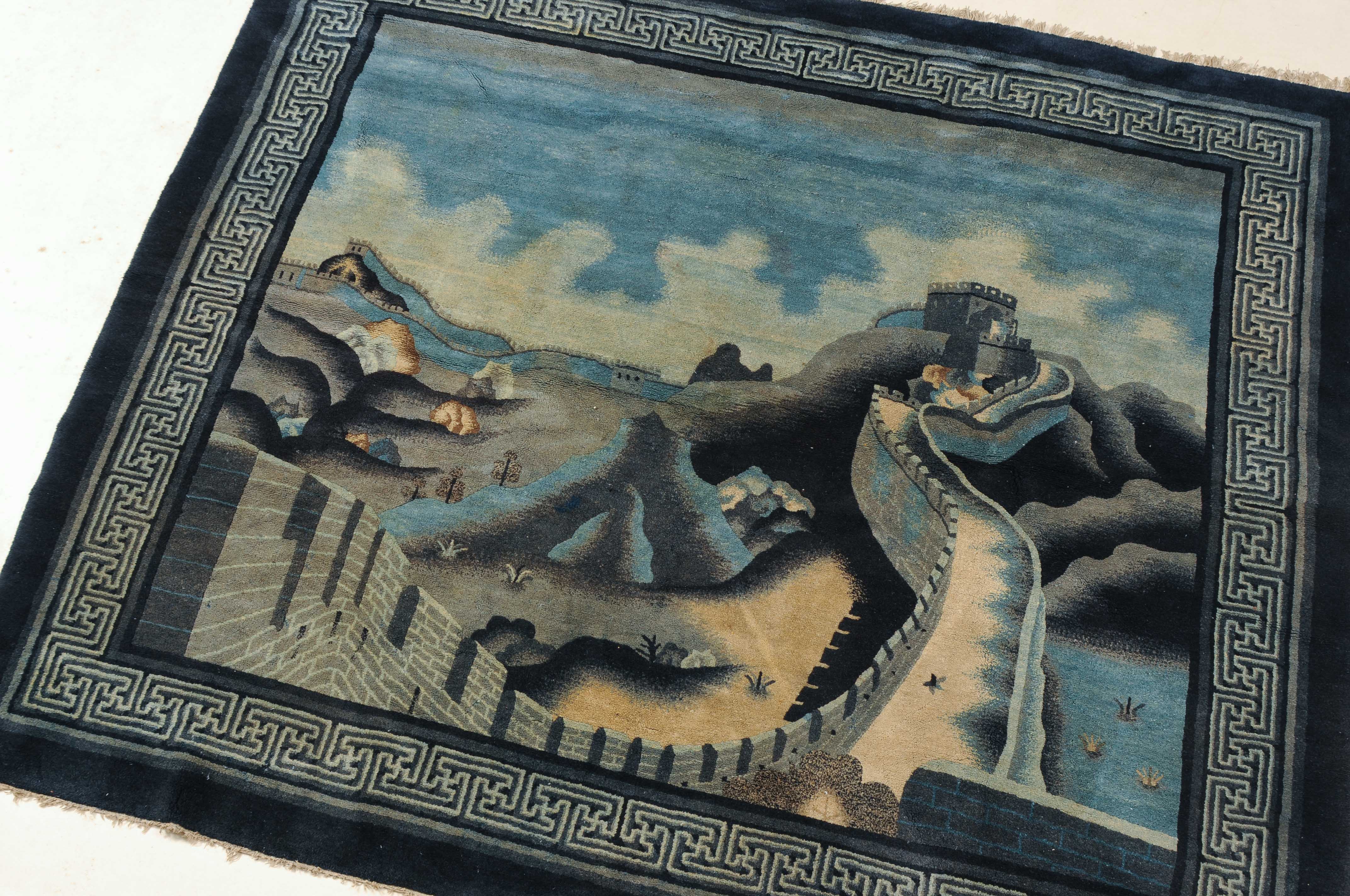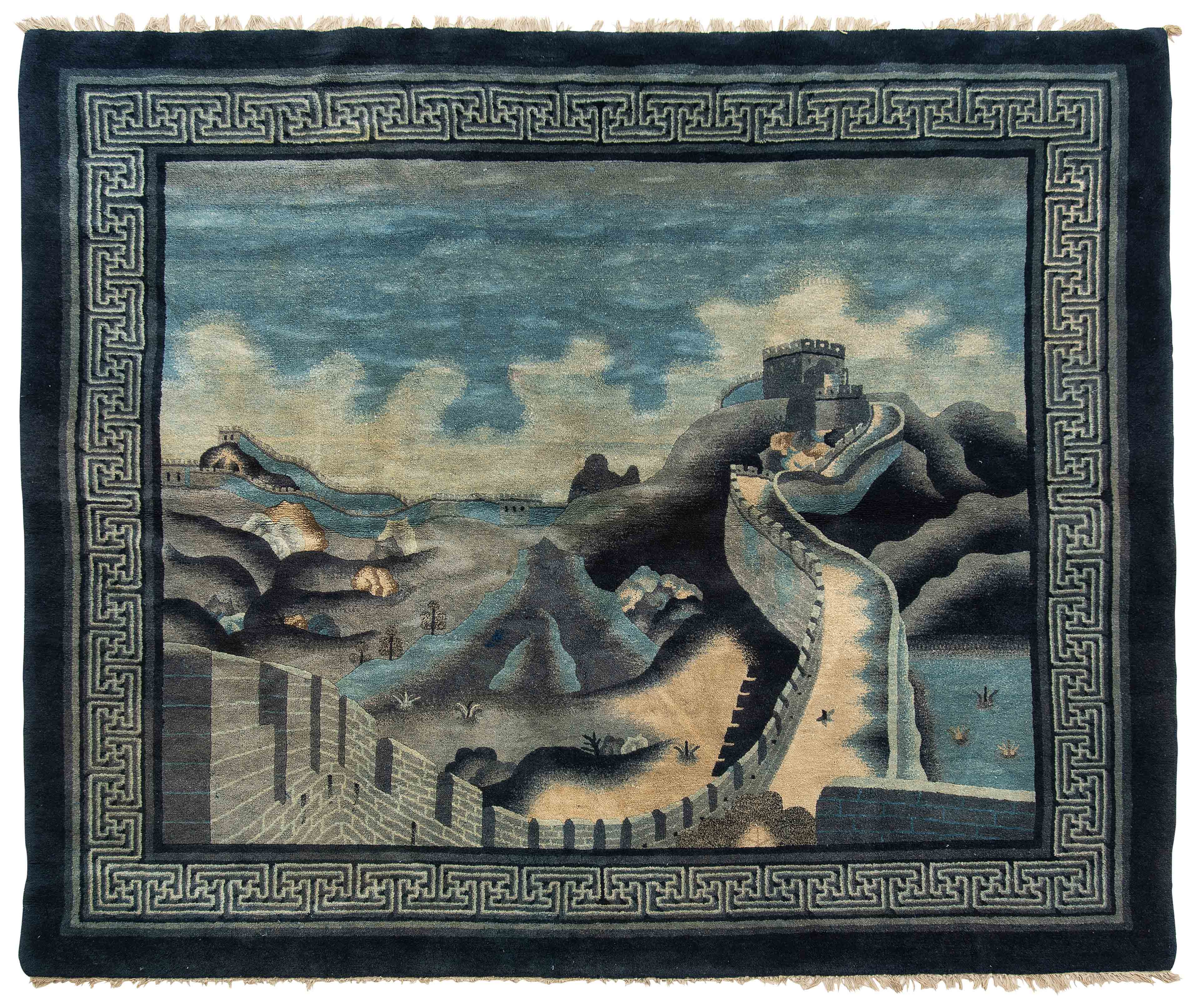 S-Mongolei, um 1930. Auf einem in Blau gehaltenen Grund ist die Chinesische Mauer mit mehreren Wachtürmen dargestellt, flankiert von Felsen und Hügeln in verschiedenen Farbtönen. Das Innenfeld wird von einer eleganten breiten T-Bordüre gerahmt. Sehr gute Erhaltung. 165x195 cm (ft. 5.4x6.4).