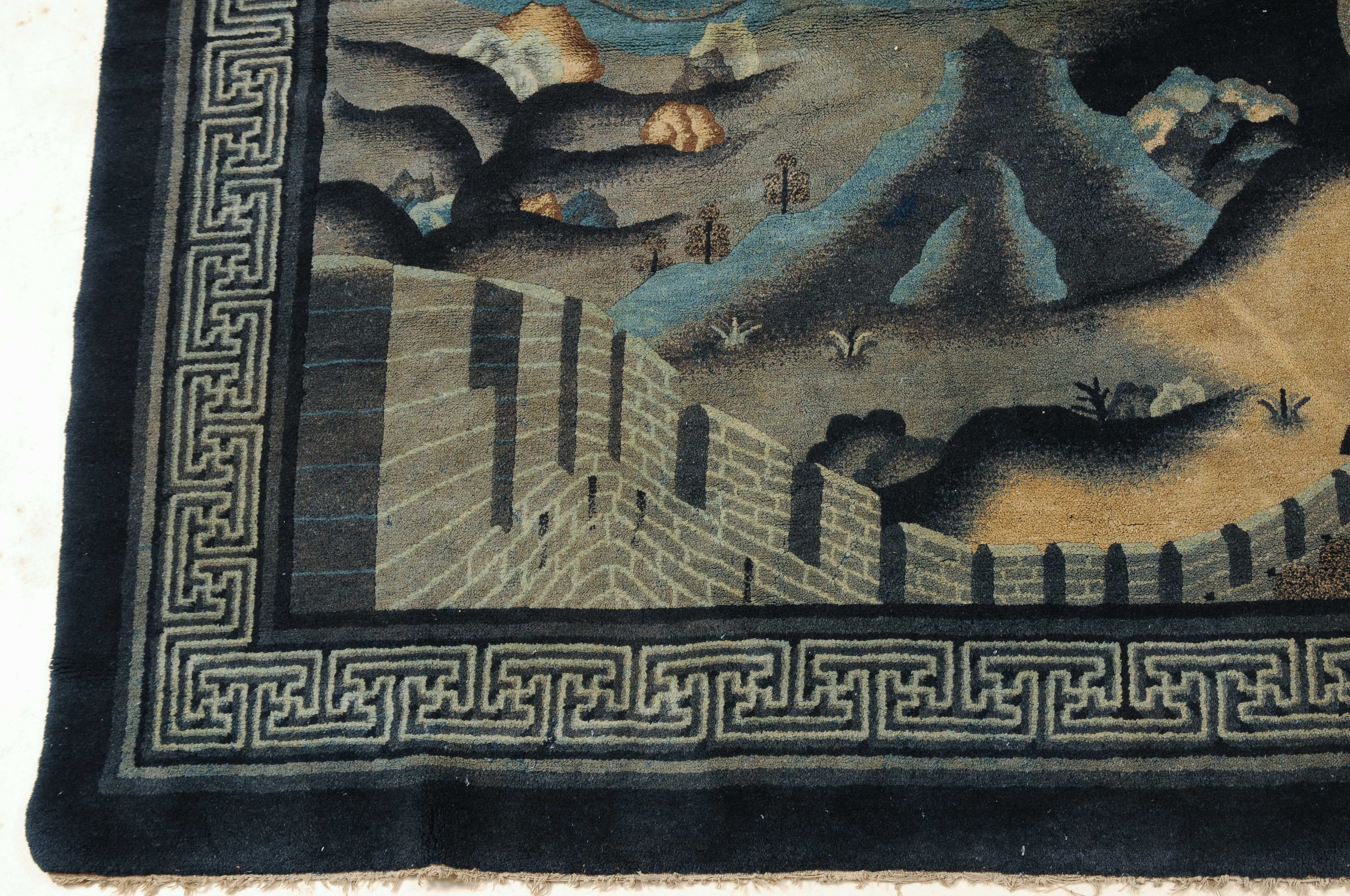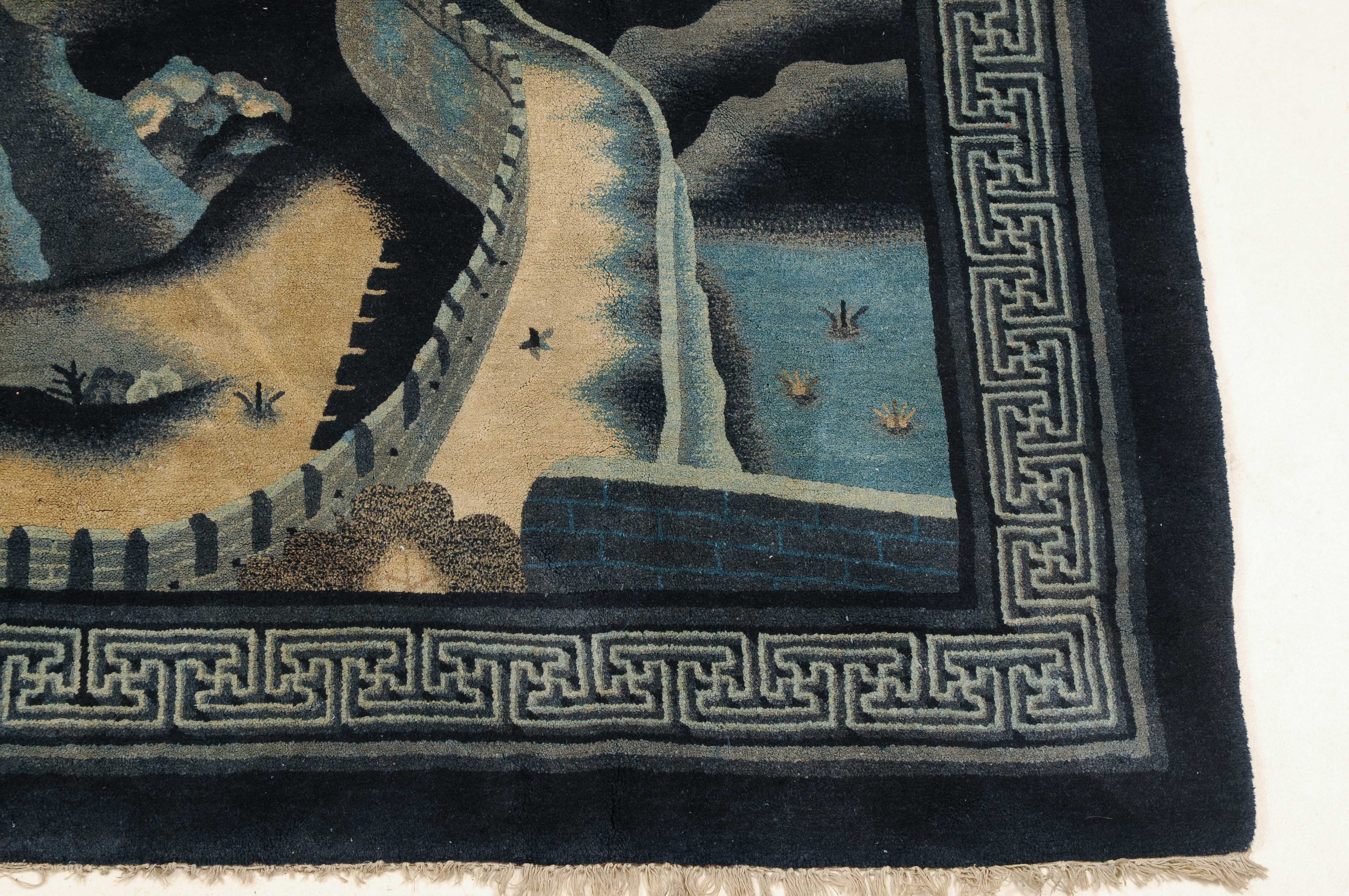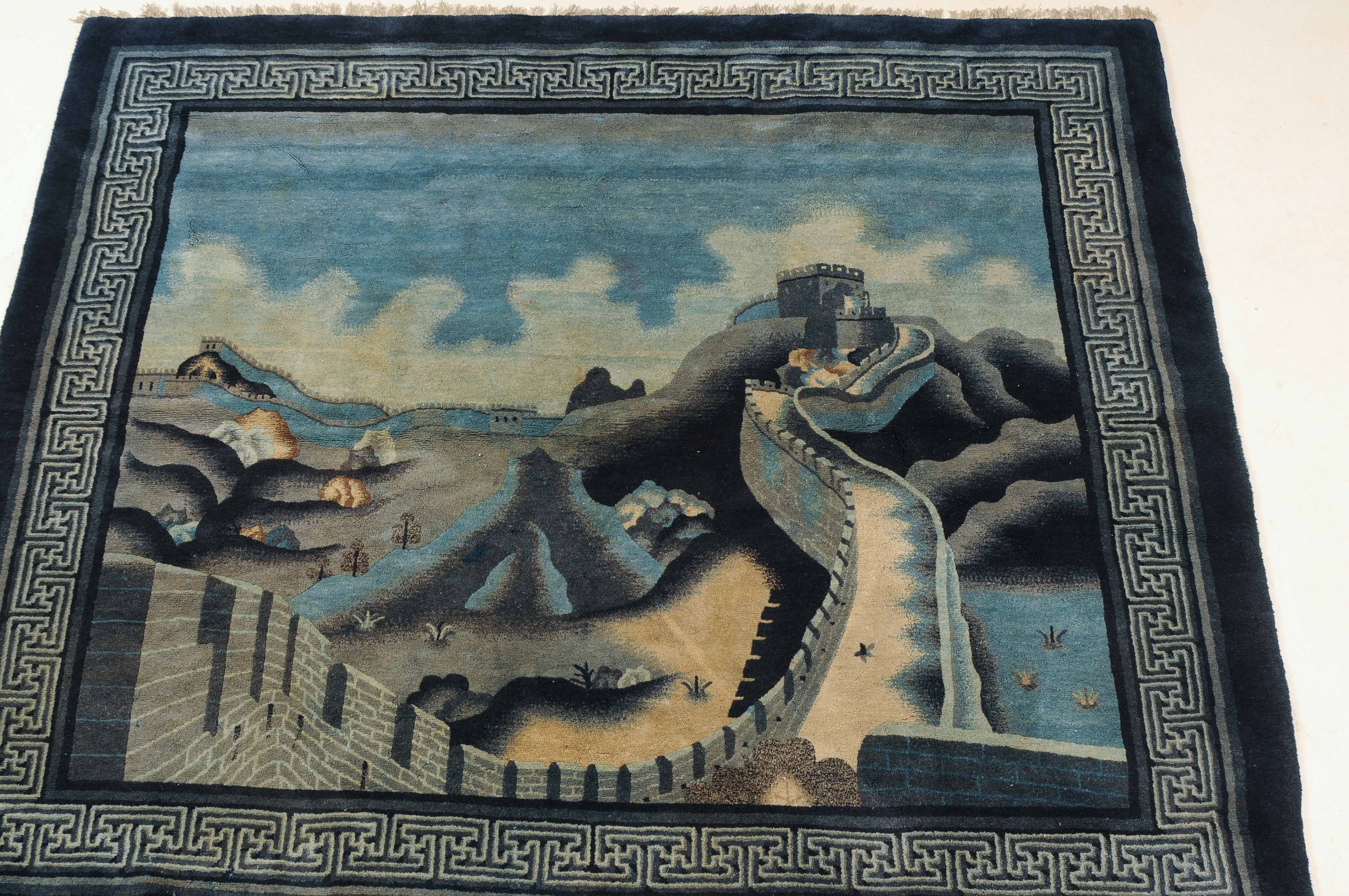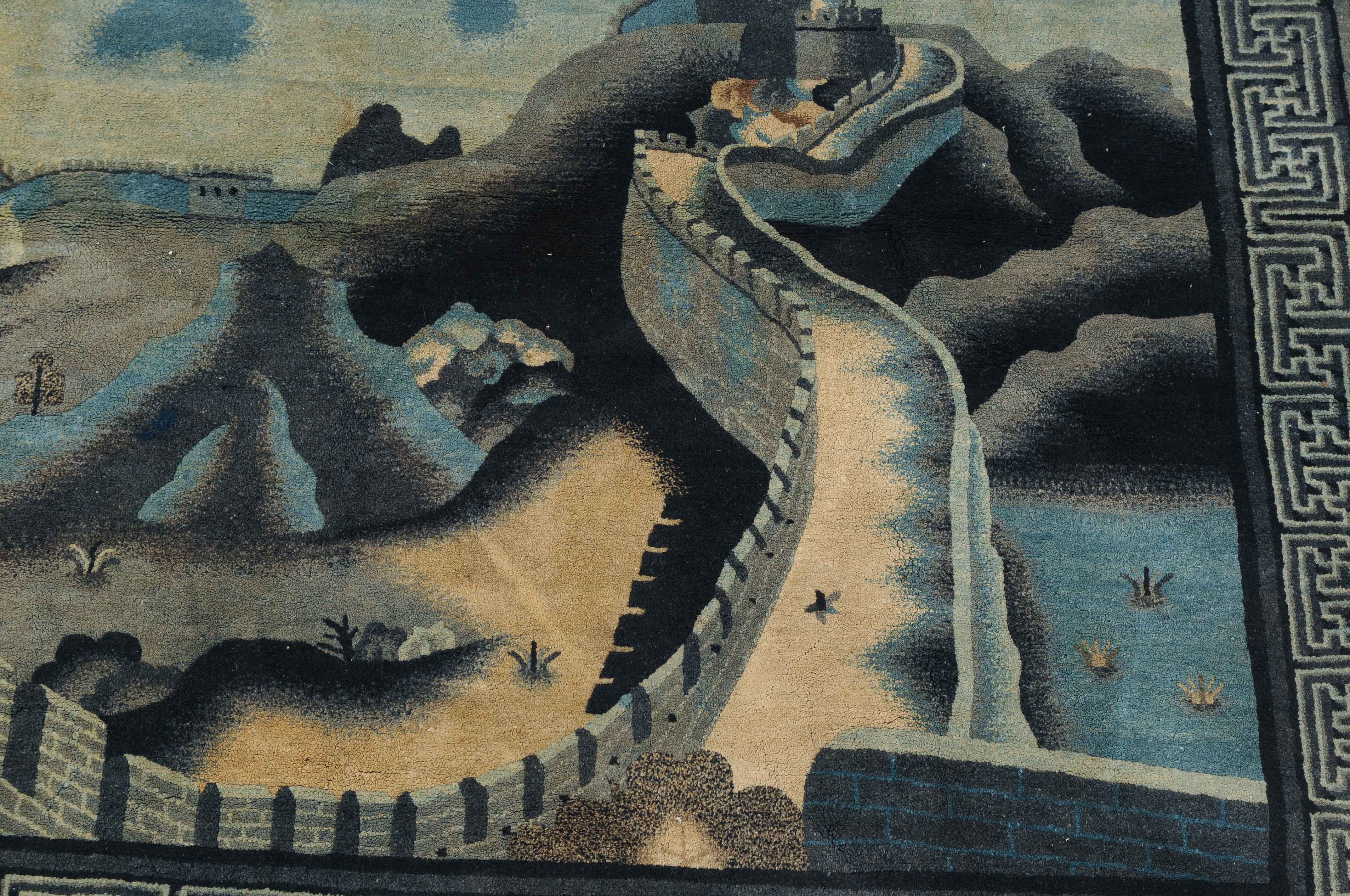 S-Mongolei, um 1930. Auf einem in Blau gehaltenen Grund ist die Chinesische Mauer mit mehreren Wachtürmen dargestellt, flankiert von Felsen und Hügeln in verschiedenen Farbtönen. Das Innenfeld wird von einer eleganten breiten T-Bordüre gerahmt. Sehr gute Erhaltung. 165x195 cm (ft. 5.4x6.4).
