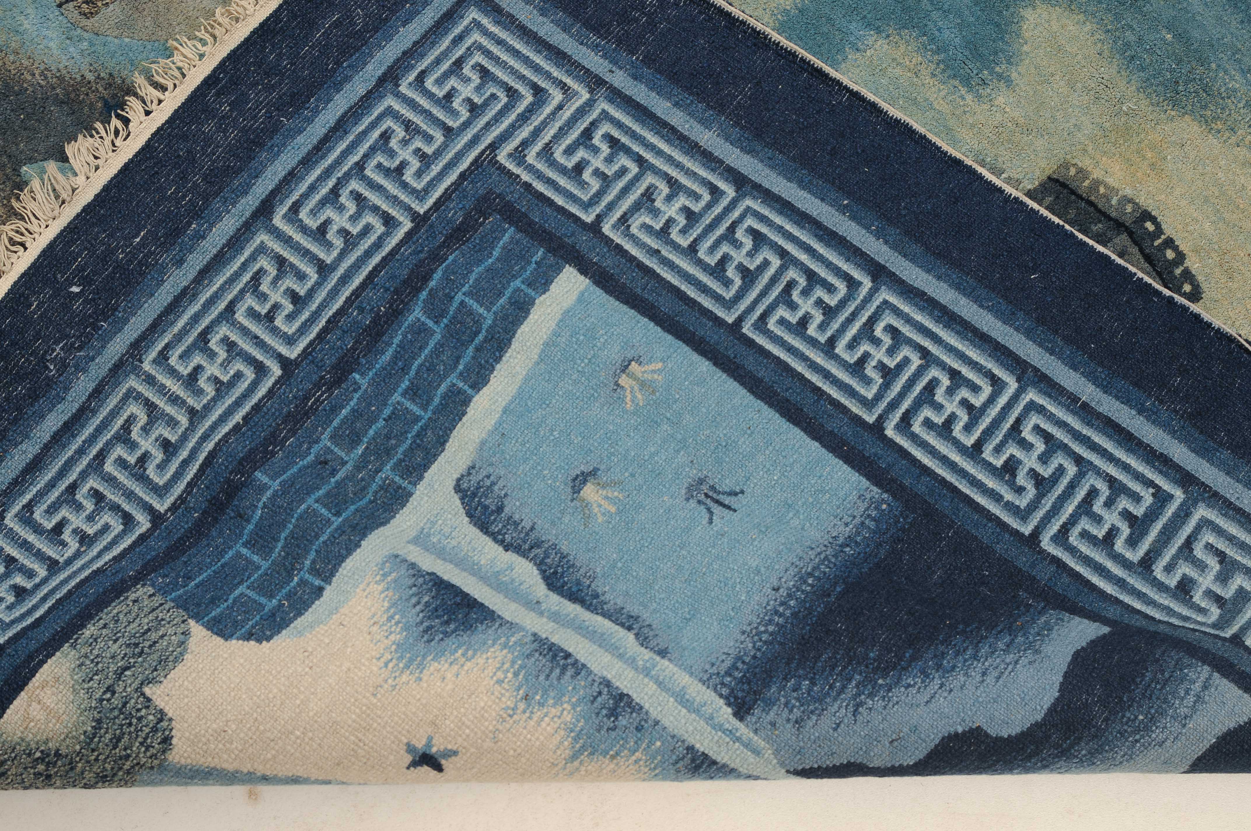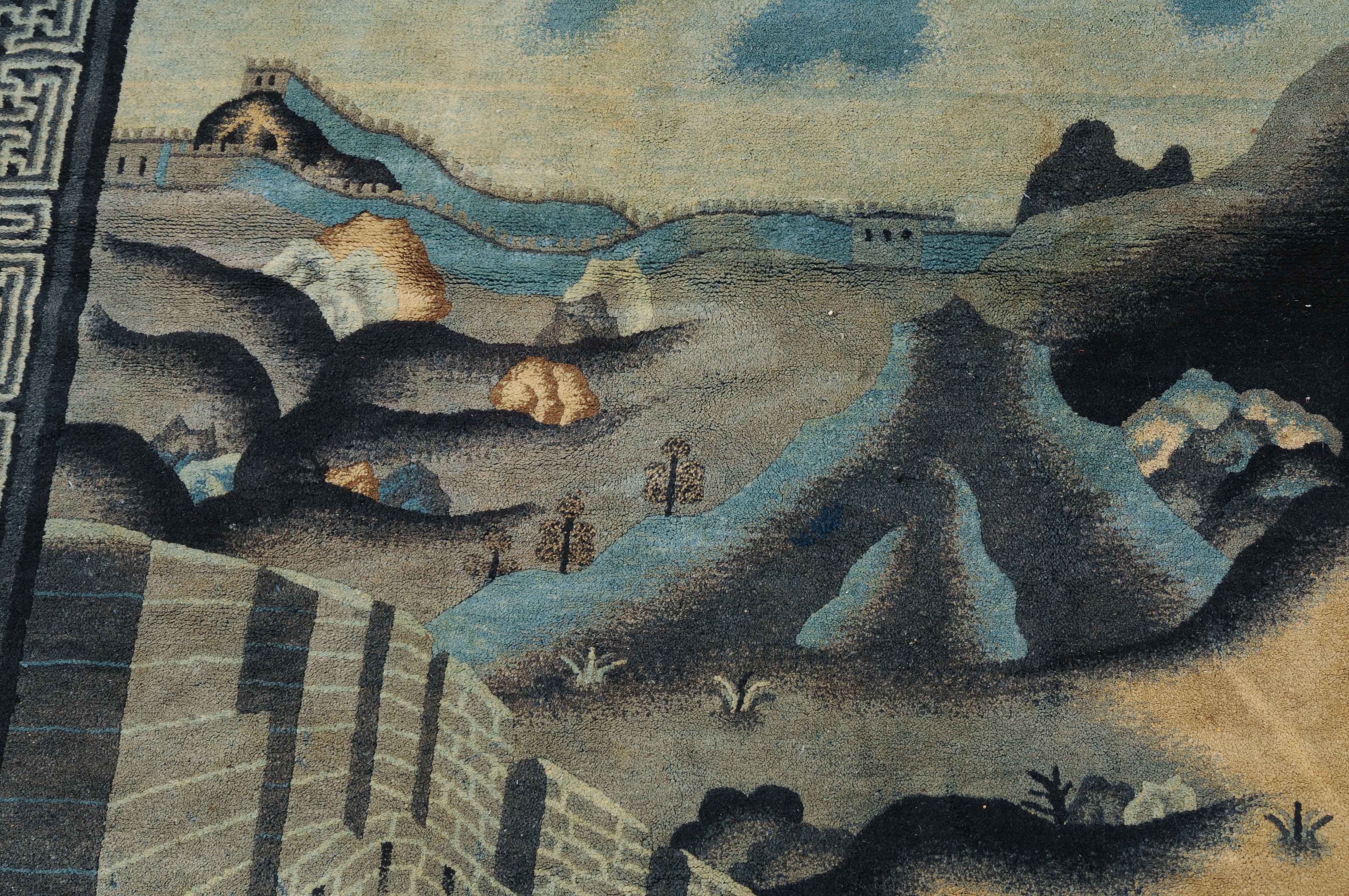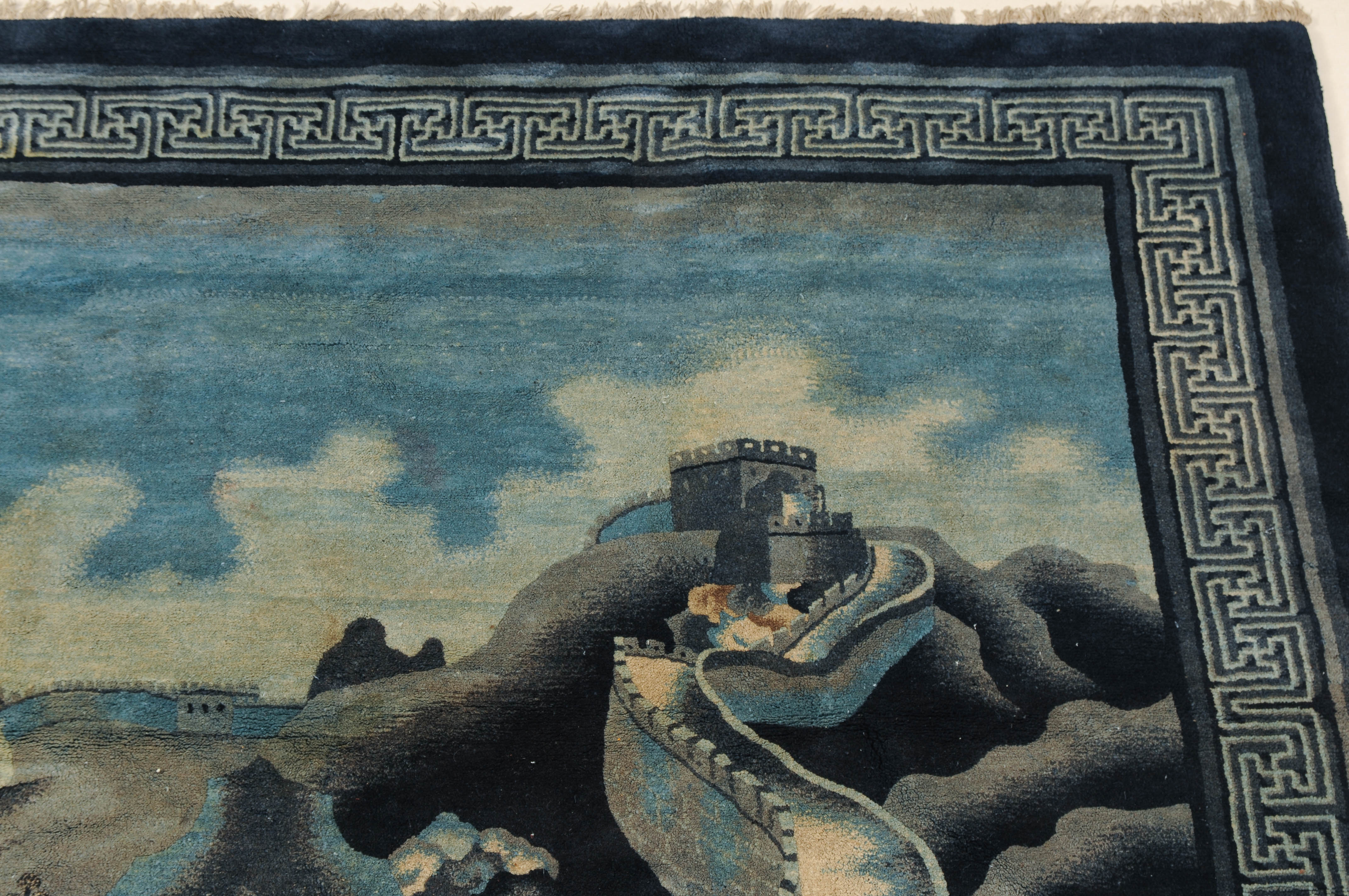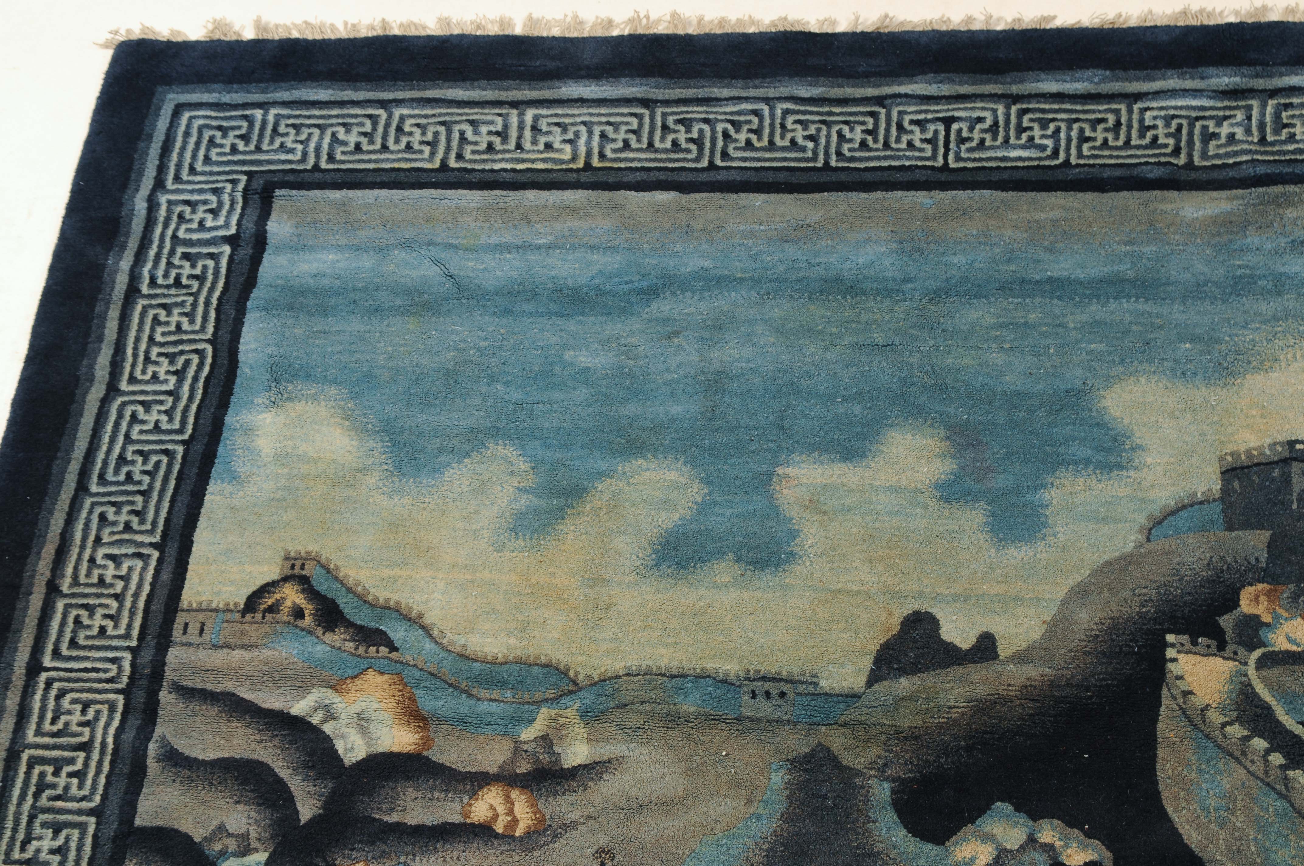S-Mongolei, um 1930. Auf einem in Blau gehaltenen Grund ist die Chinesische Mauer mit mehreren Wachtürmen dargestellt, flankiert von Felsen und Hügeln in verschiedenen Farbtönen. Das Innenfeld wird von einer eleganten breiten T-Bordüre gerahmt. Sehr gute Erhaltung. 165x195 cm (ft. 5.4x6.4).