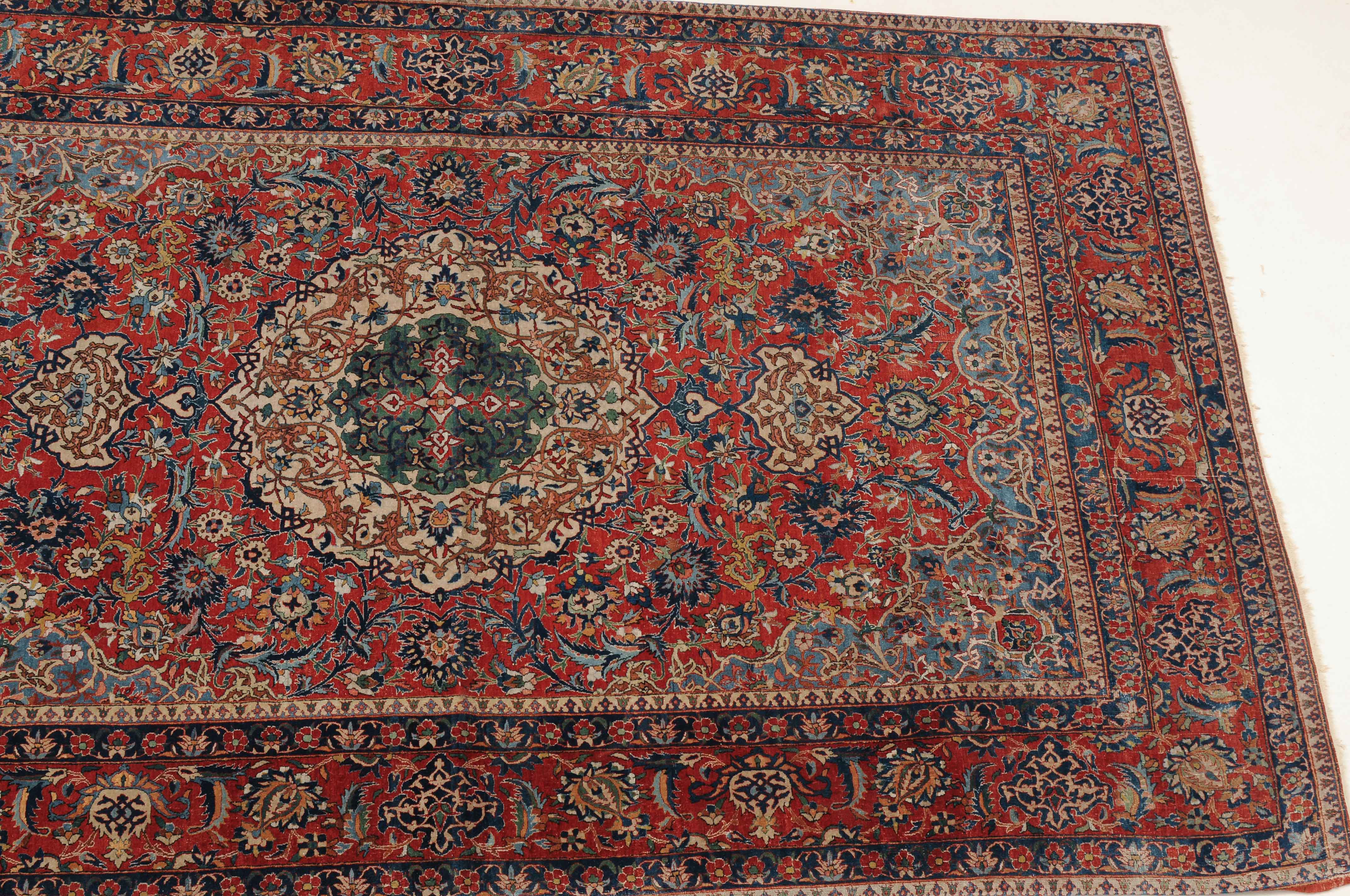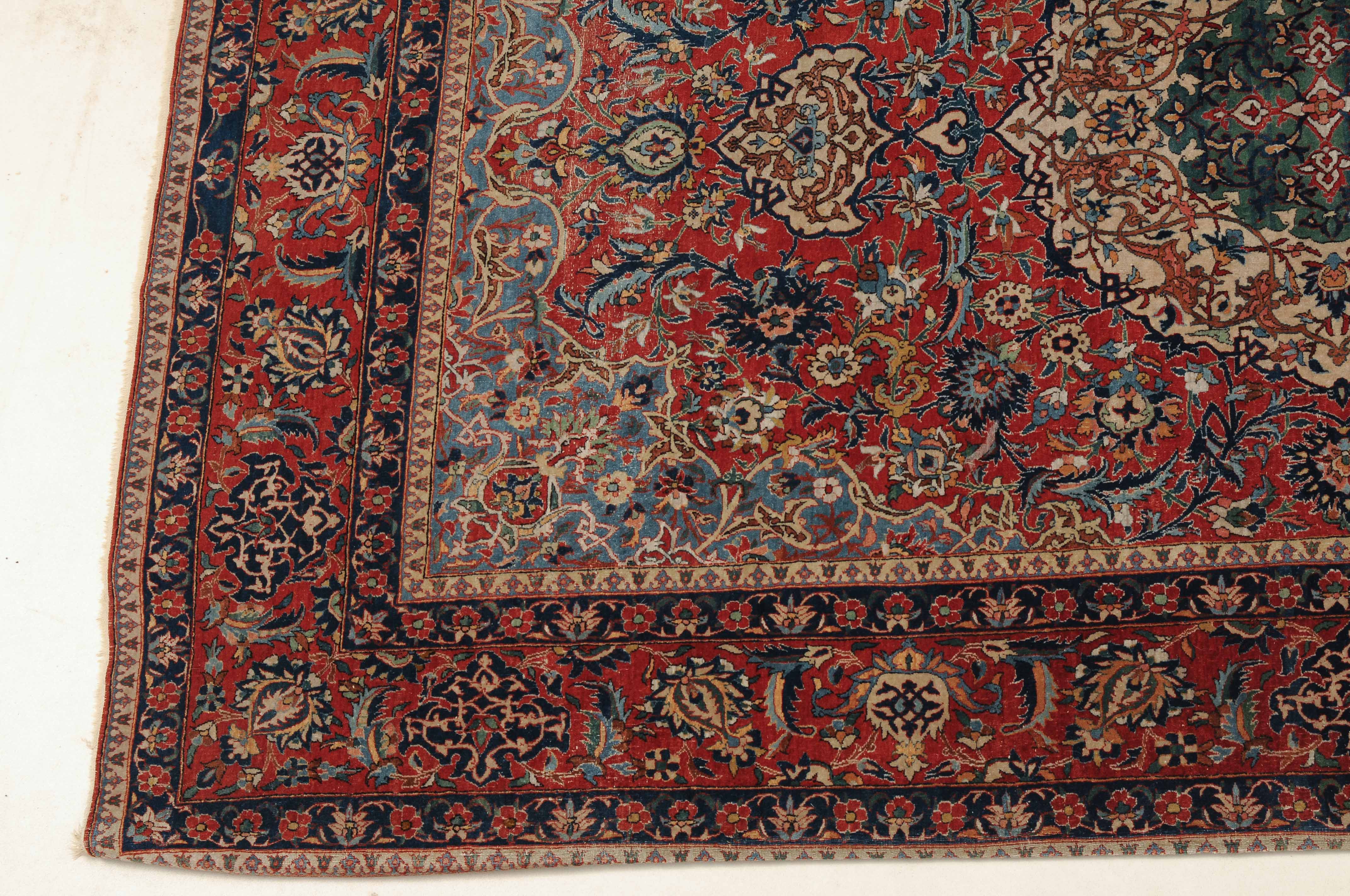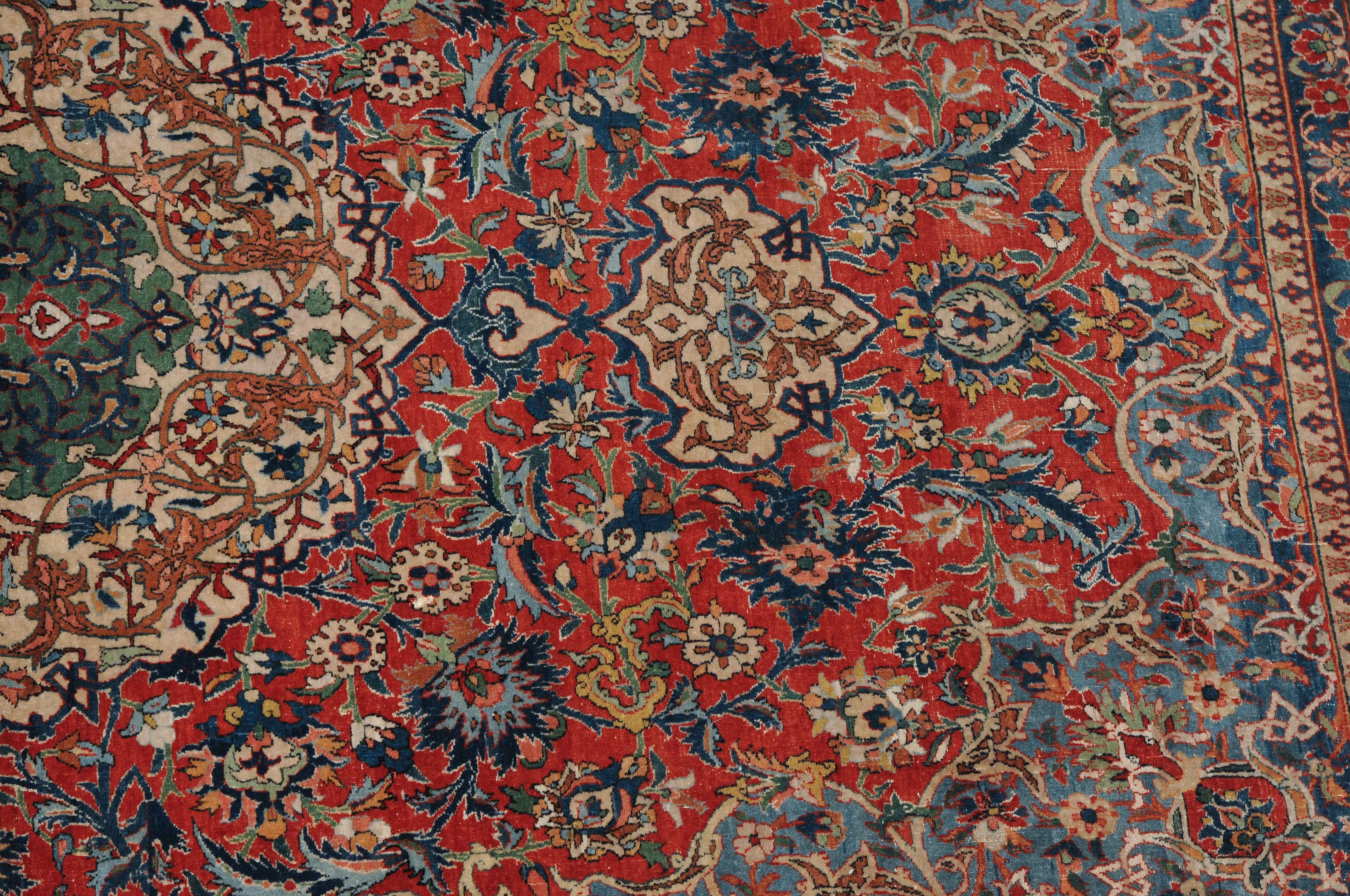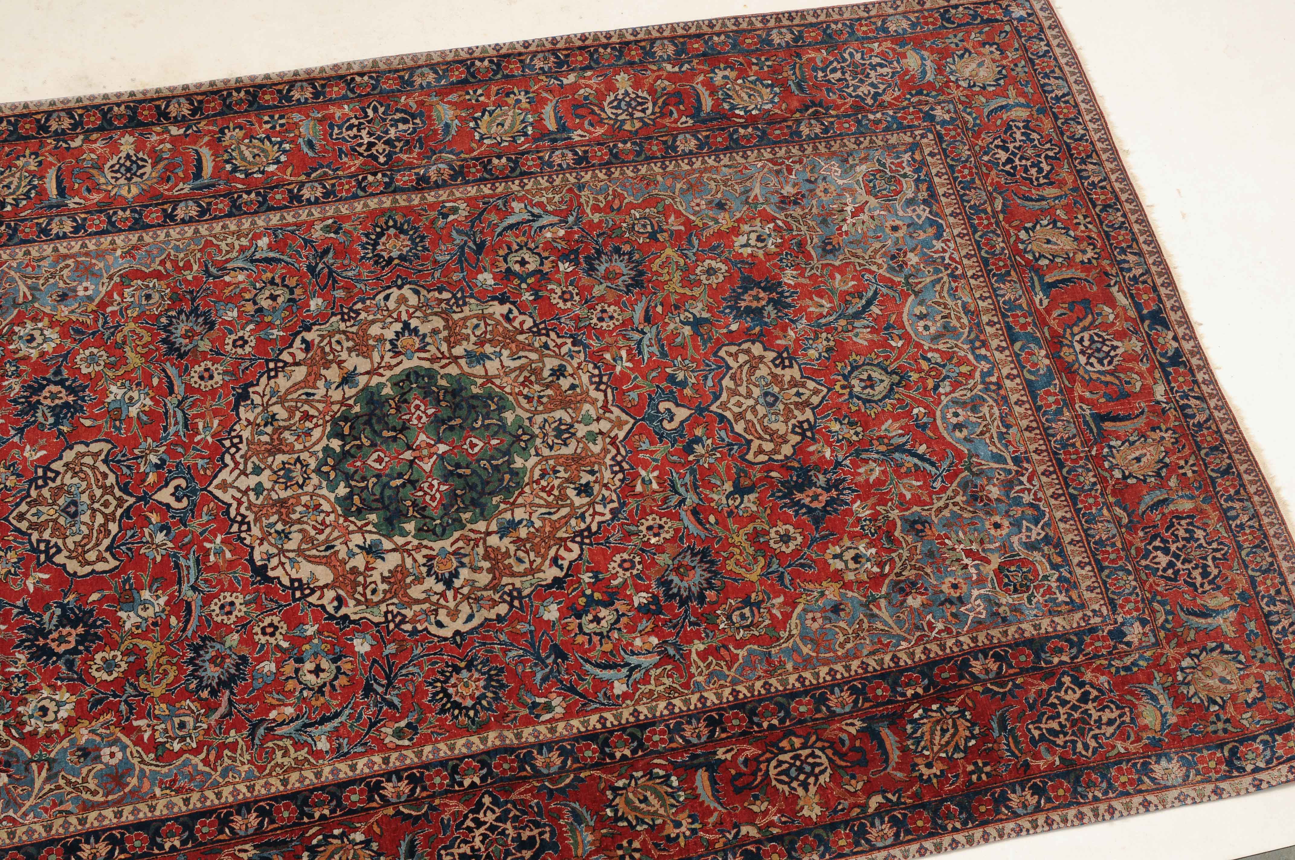 Z-Persien, um 1910. Auf rotem Grund figuriert ein dichtes florales Dekor mit einem türkisgrünen Rundmedaillon und 2 Anhängern, umgeben von Blütenpalmetten, Zweigen und 4 effektvollen hellblauen Eckzwickeln. Fein gezeichnete blaue Blütenborten umranden die rote, mit Palmetten und Blütenranken auf dekorative Weise verzierte Hauptbordüre. Gebrauchsspuren. 150x245 cm (ft. 5x8.1).