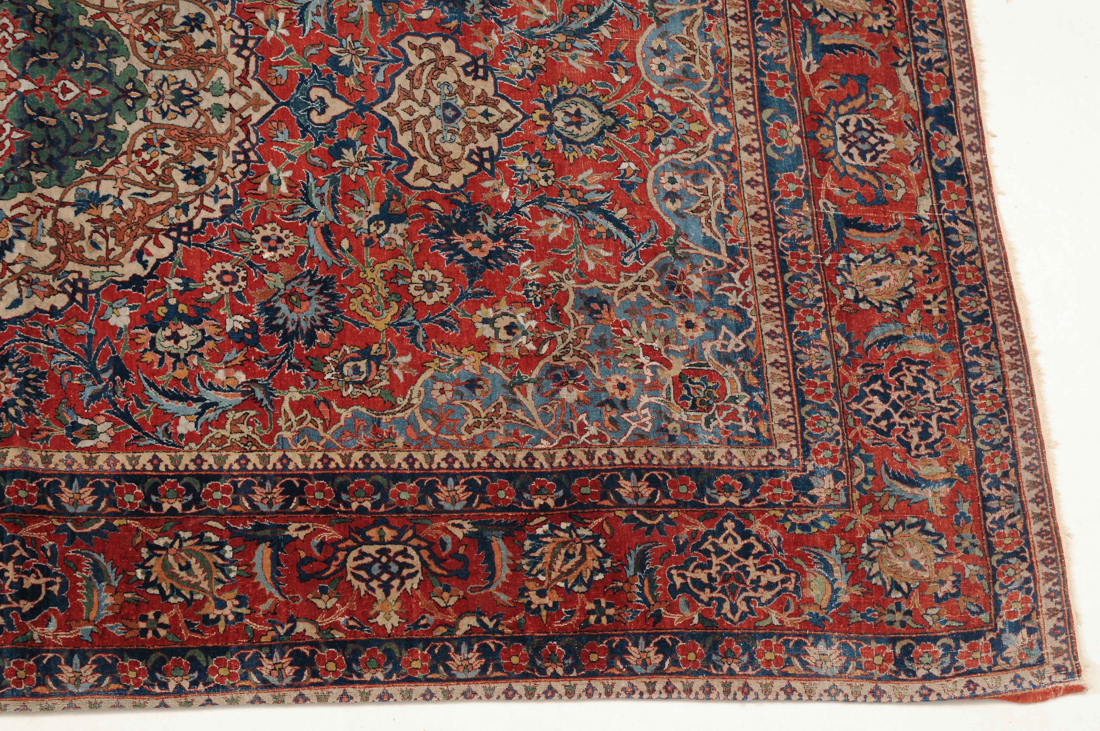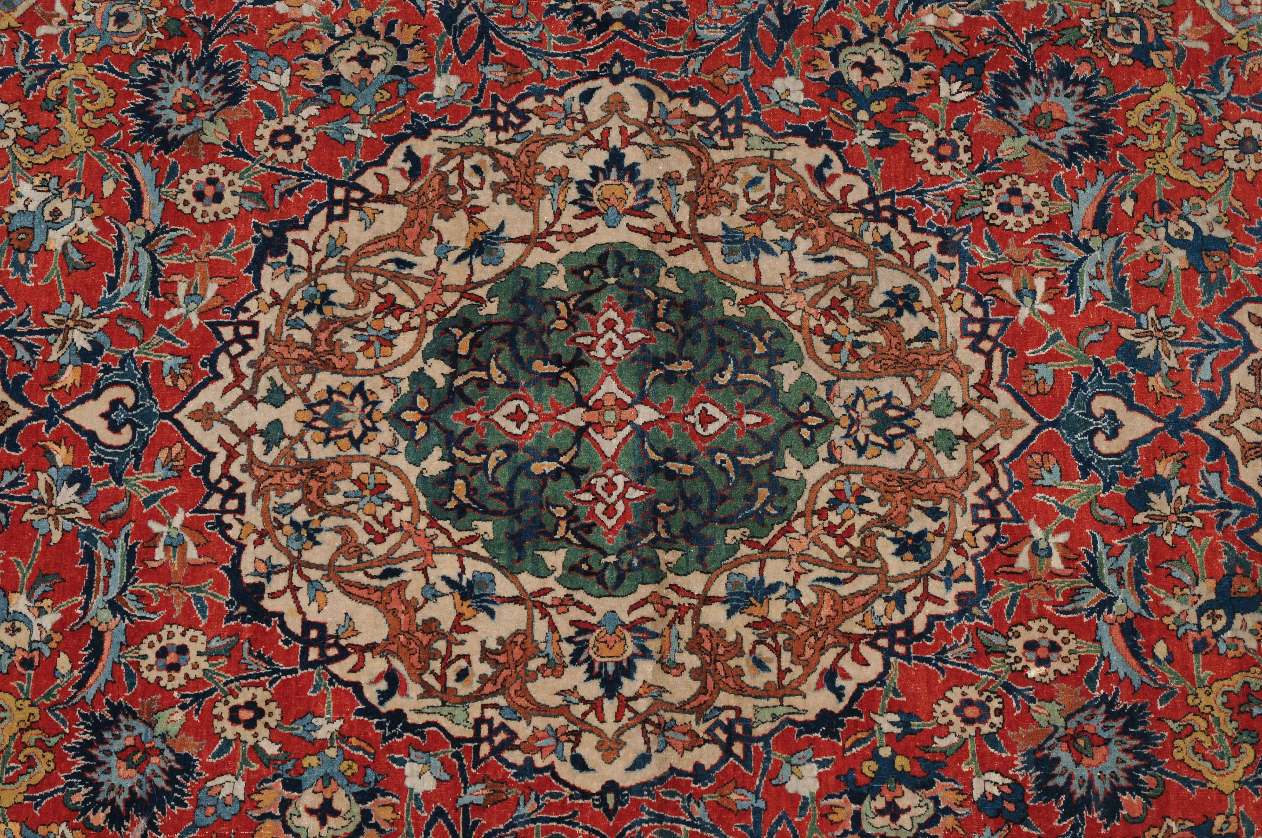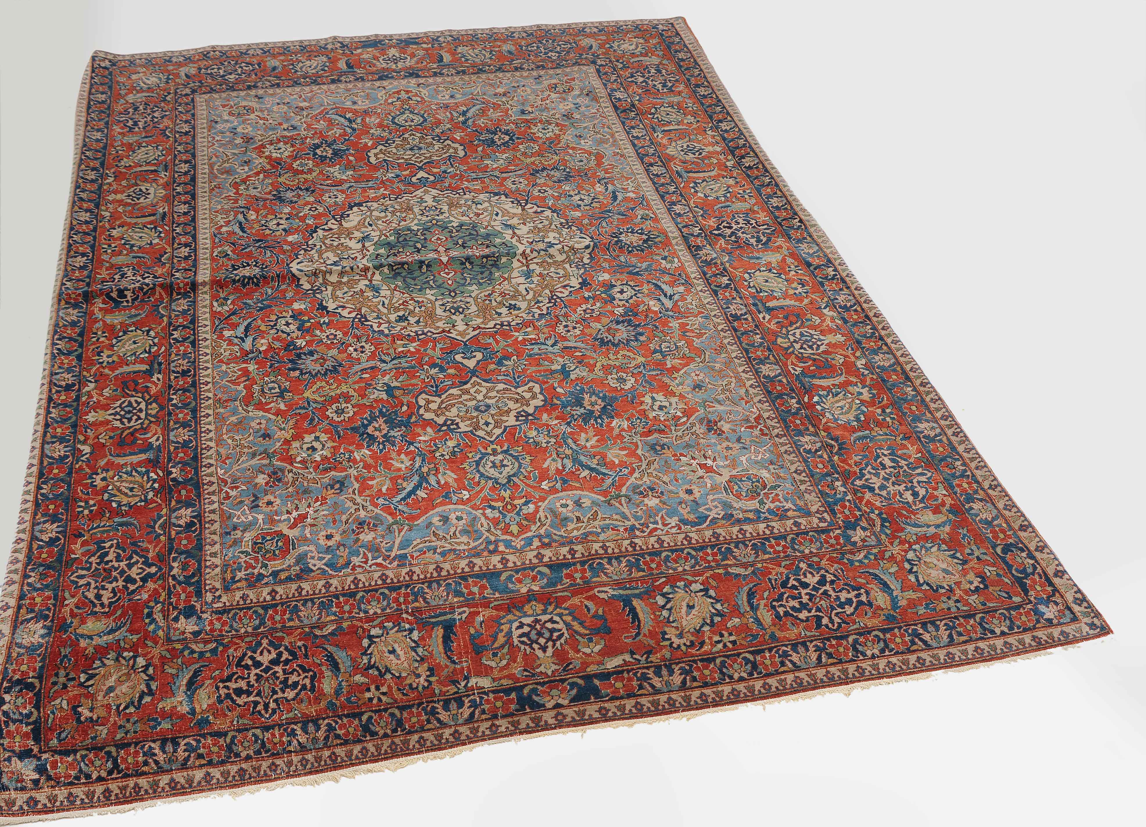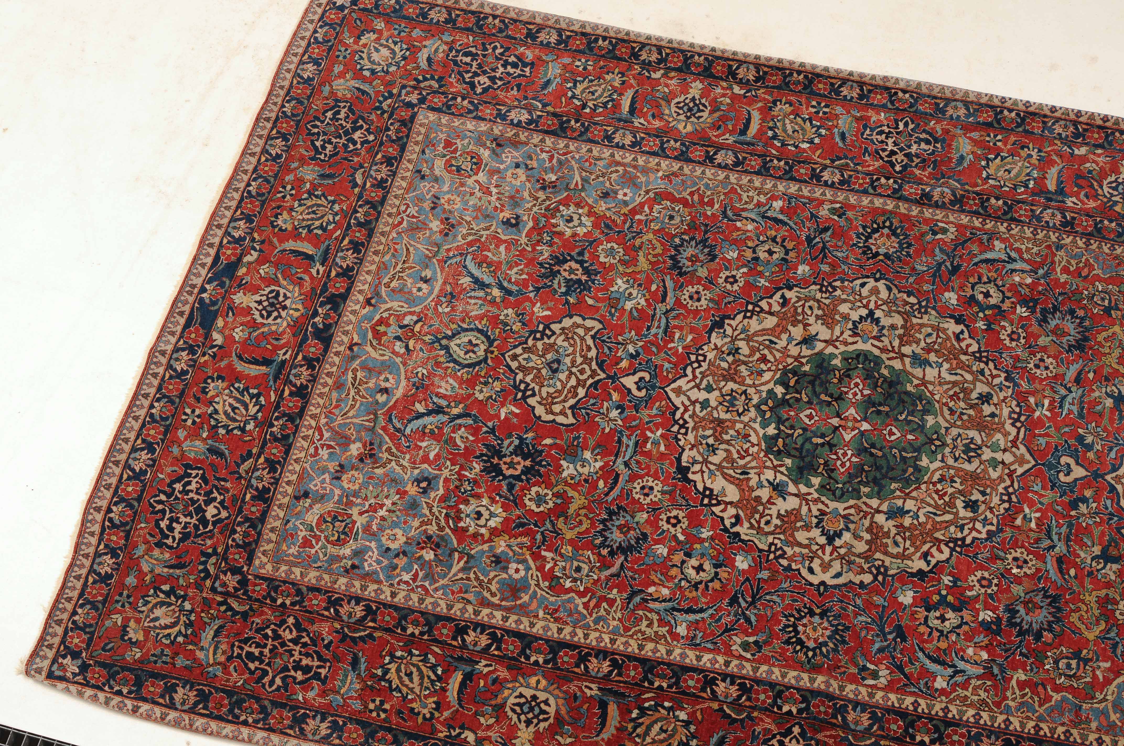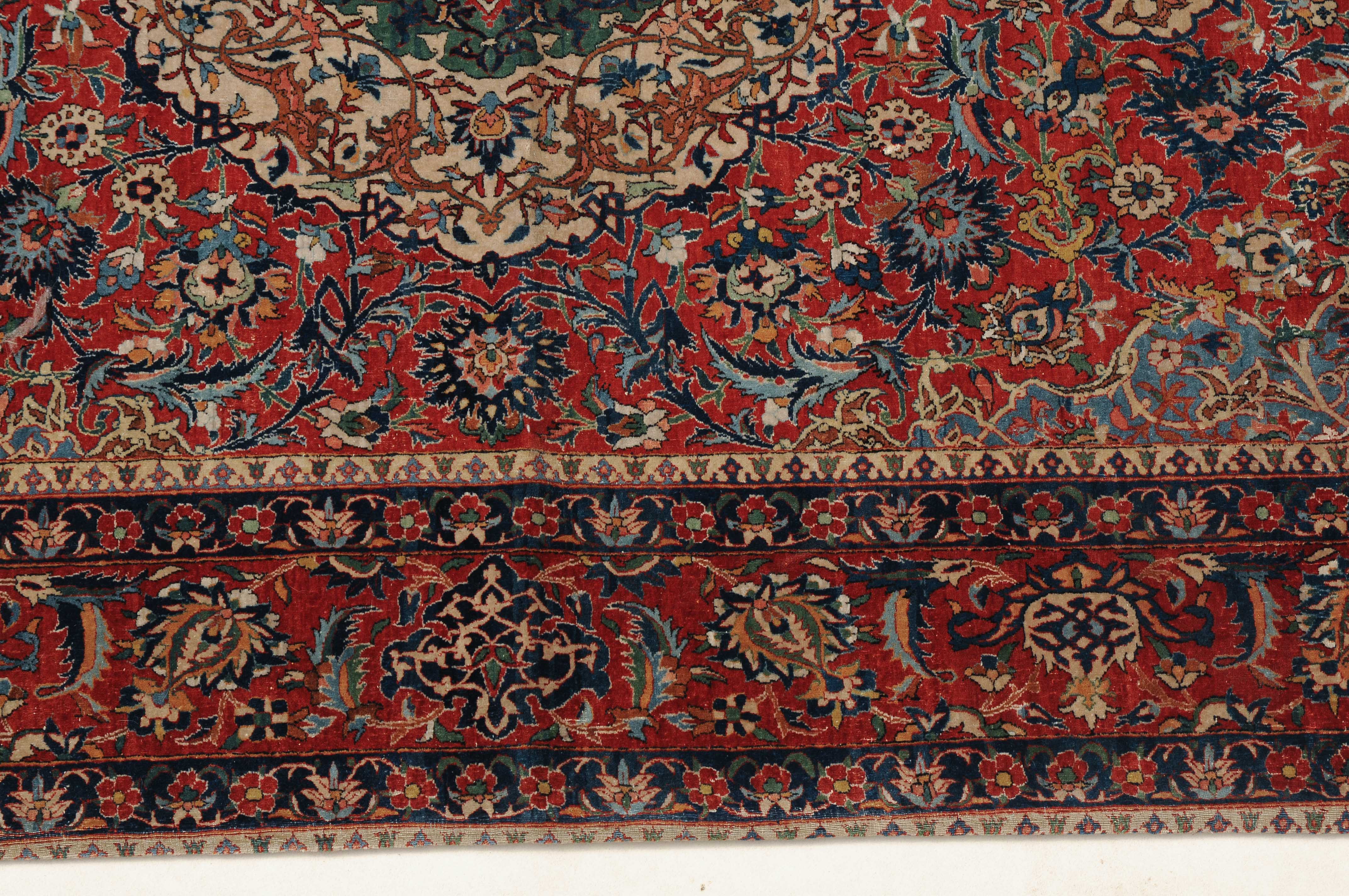 Z-Persien, um 1910. Auf rotem Grund figuriert ein dichtes florales Dekor mit einem türkisgrünen Rundmedaillon und 2 Anhängern, umgeben von Blütenpalmetten, Zweigen und 4 effektvollen hellblauen Eckzwickeln. Fein gezeichnete blaue Blütenborten umranden die rote, mit Palmetten und Blütenranken auf dekorative Weise verzierte Hauptbordüre. Gebrauchsspuren. 150x245 cm (ft. 5x8.1).