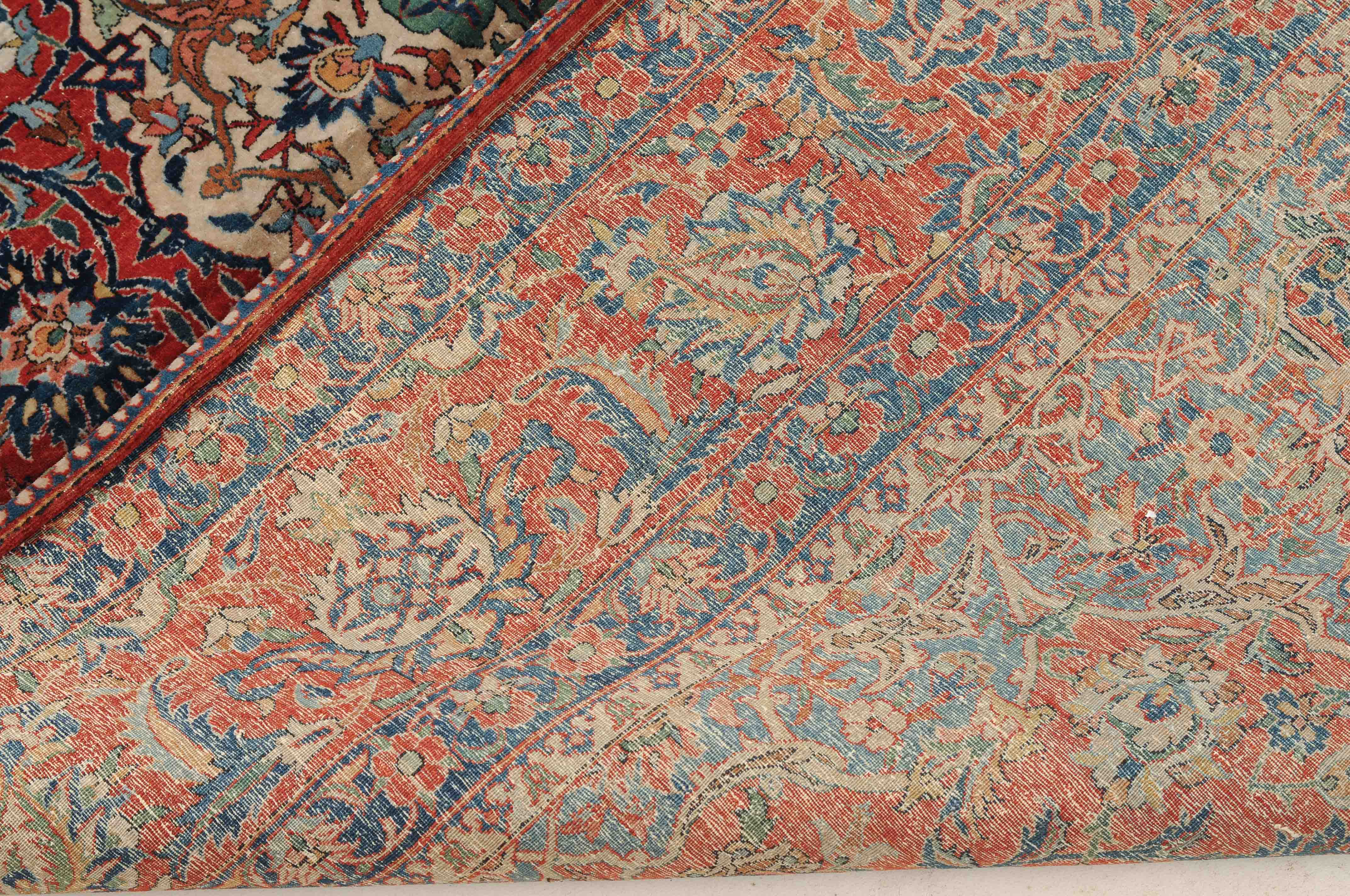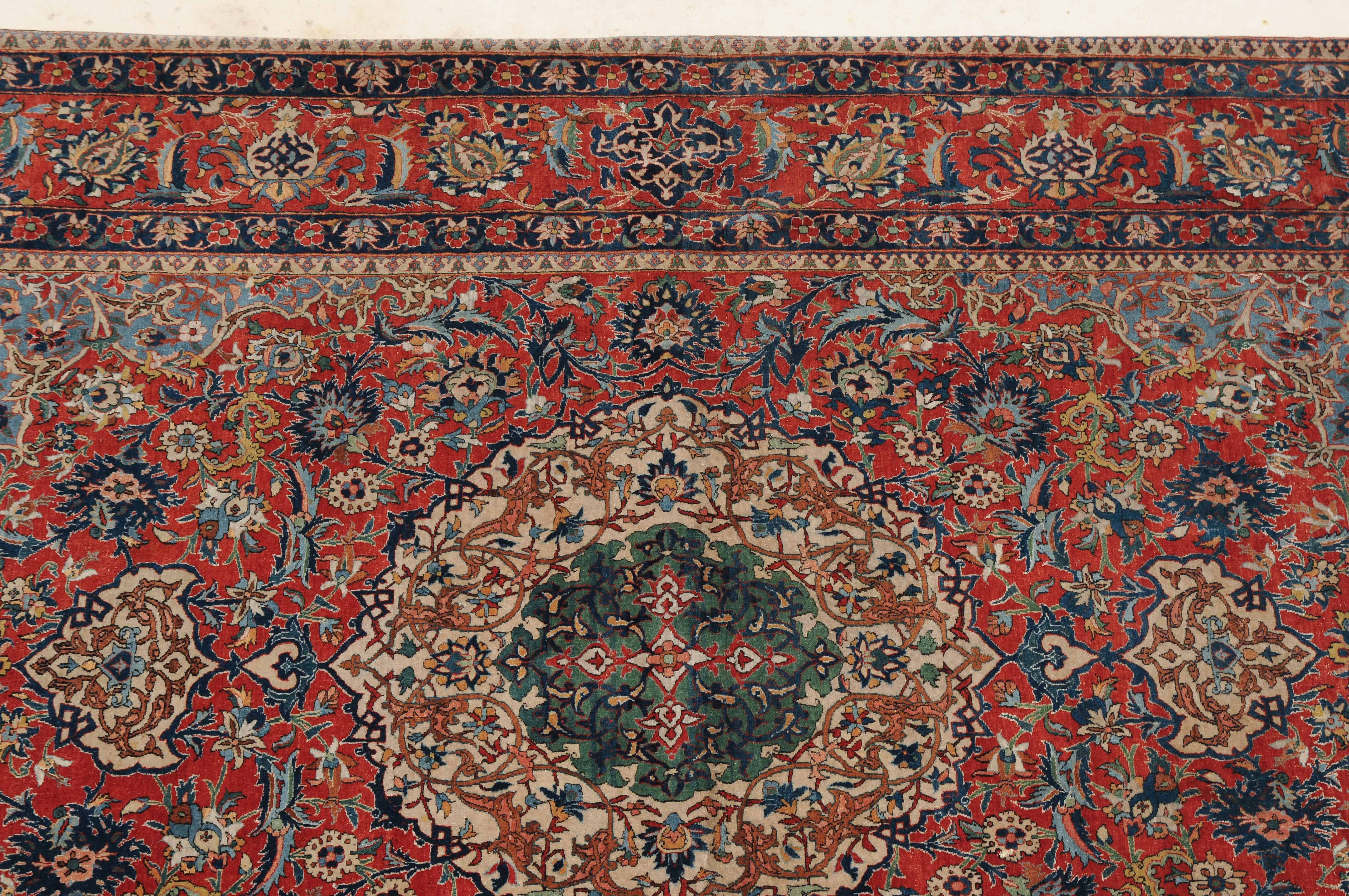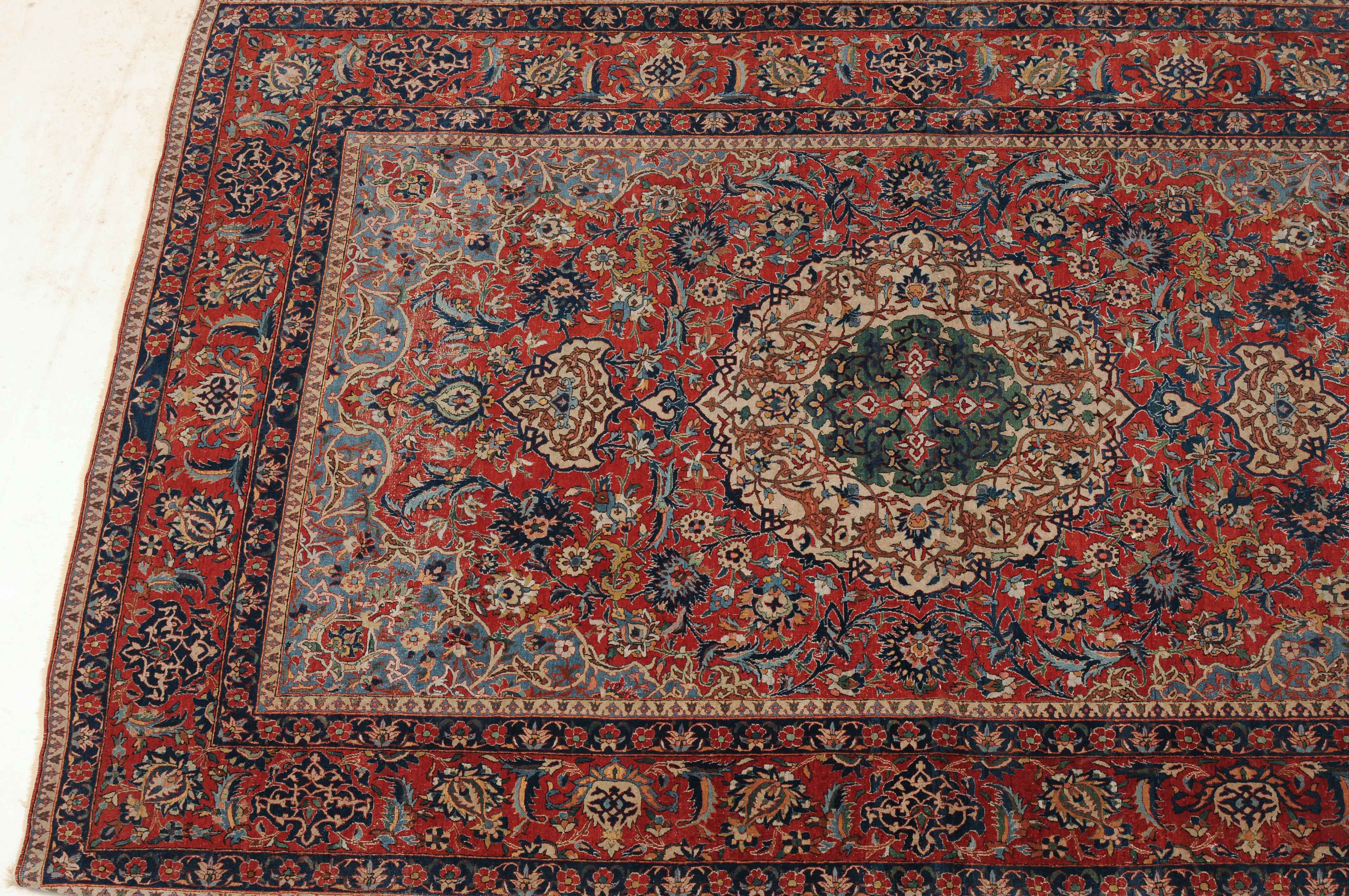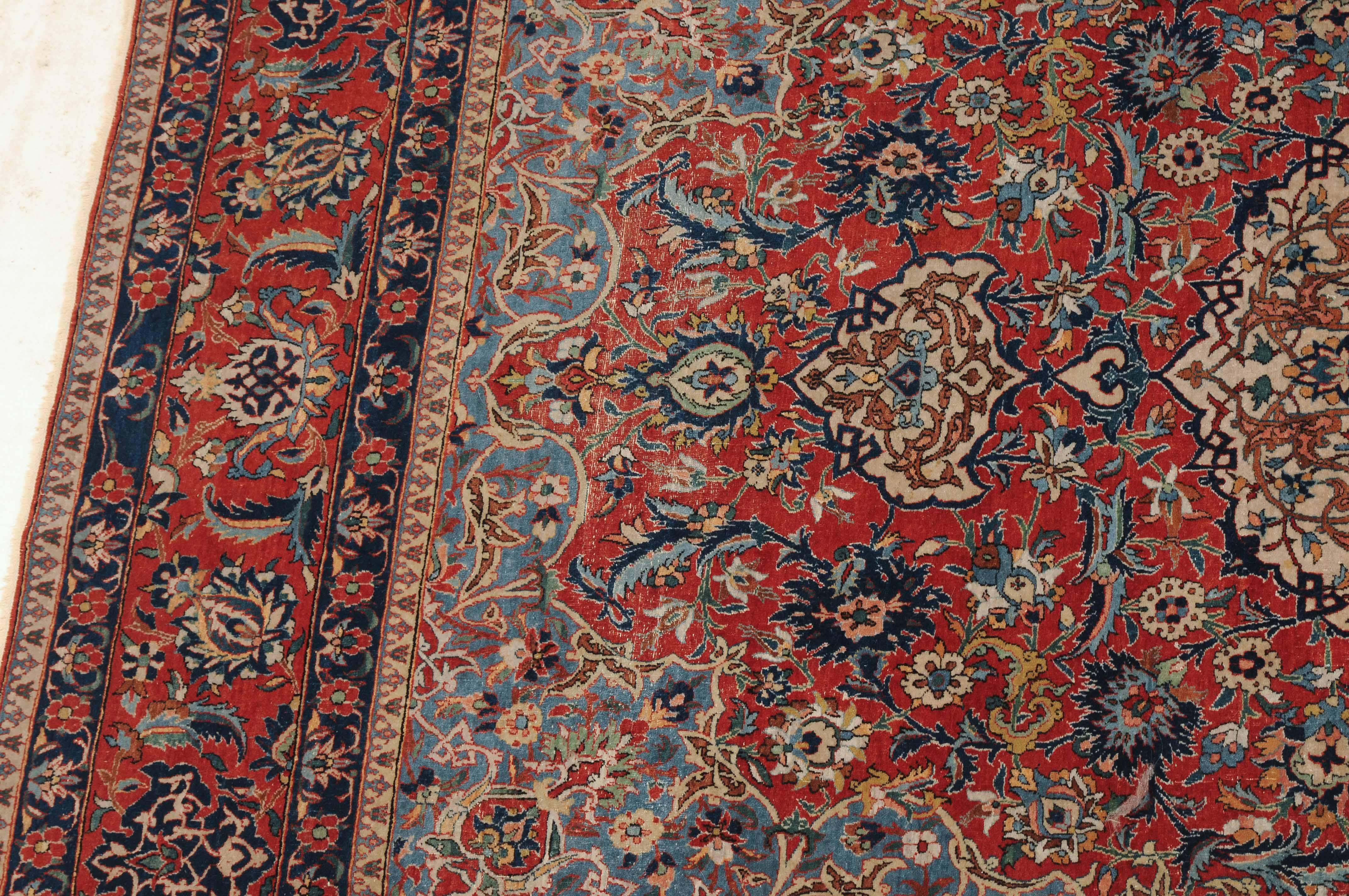 Z-Persien, um 1910. Auf rotem Grund figuriert ein dichtes florales Dekor mit einem türkisgrünen Rundmedaillon und 2 Anhängern, umgeben von Blütenpalmetten, Zweigen und 4 effektvollen hellblauen Eckzwickeln. Fein gezeichnete blaue Blütenborten umranden die rote, mit Palmetten und Blütenranken auf dekorative Weise verzierte Hauptbordüre. Gebrauchsspuren. 150x245 cm (ft. 5x8.1).