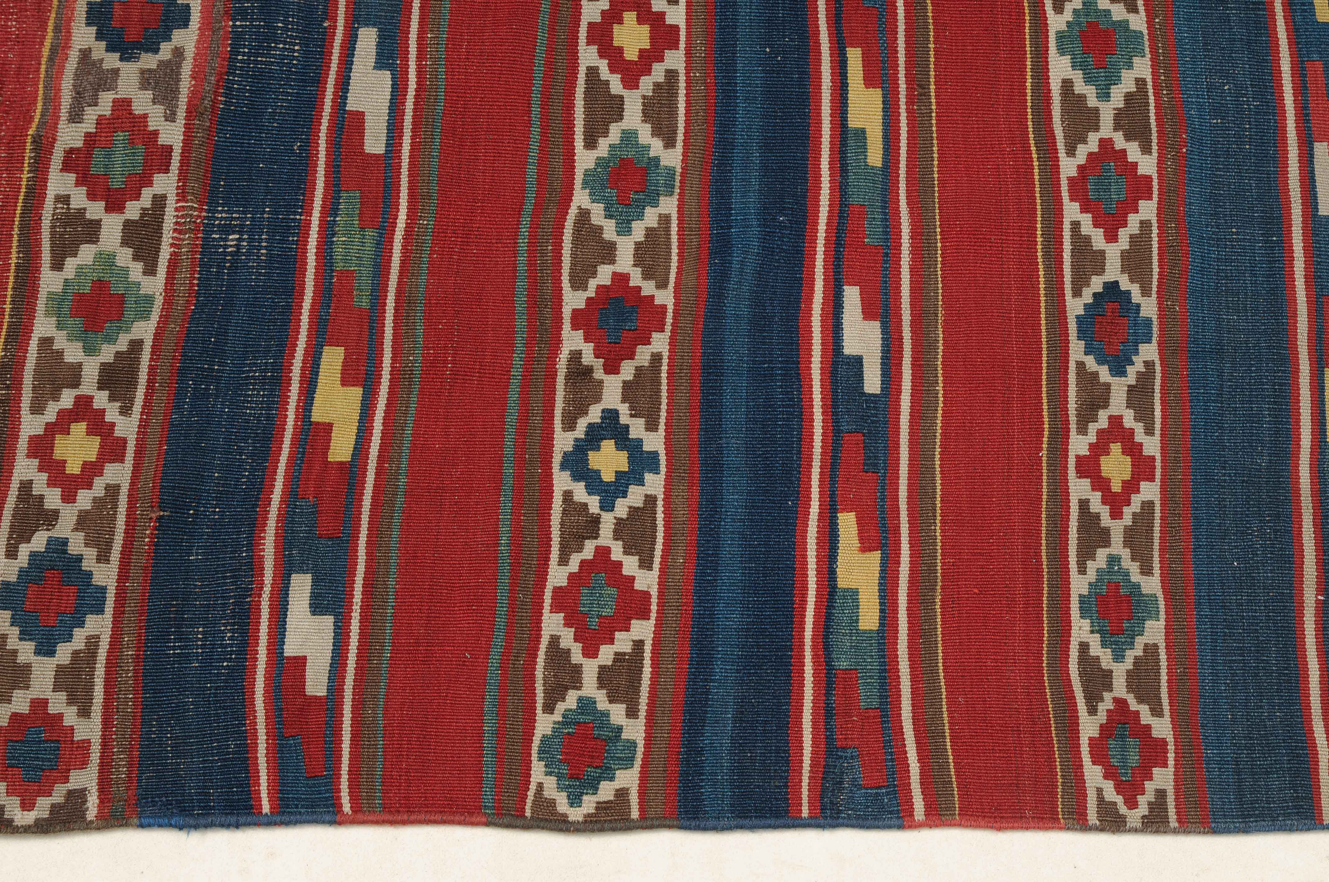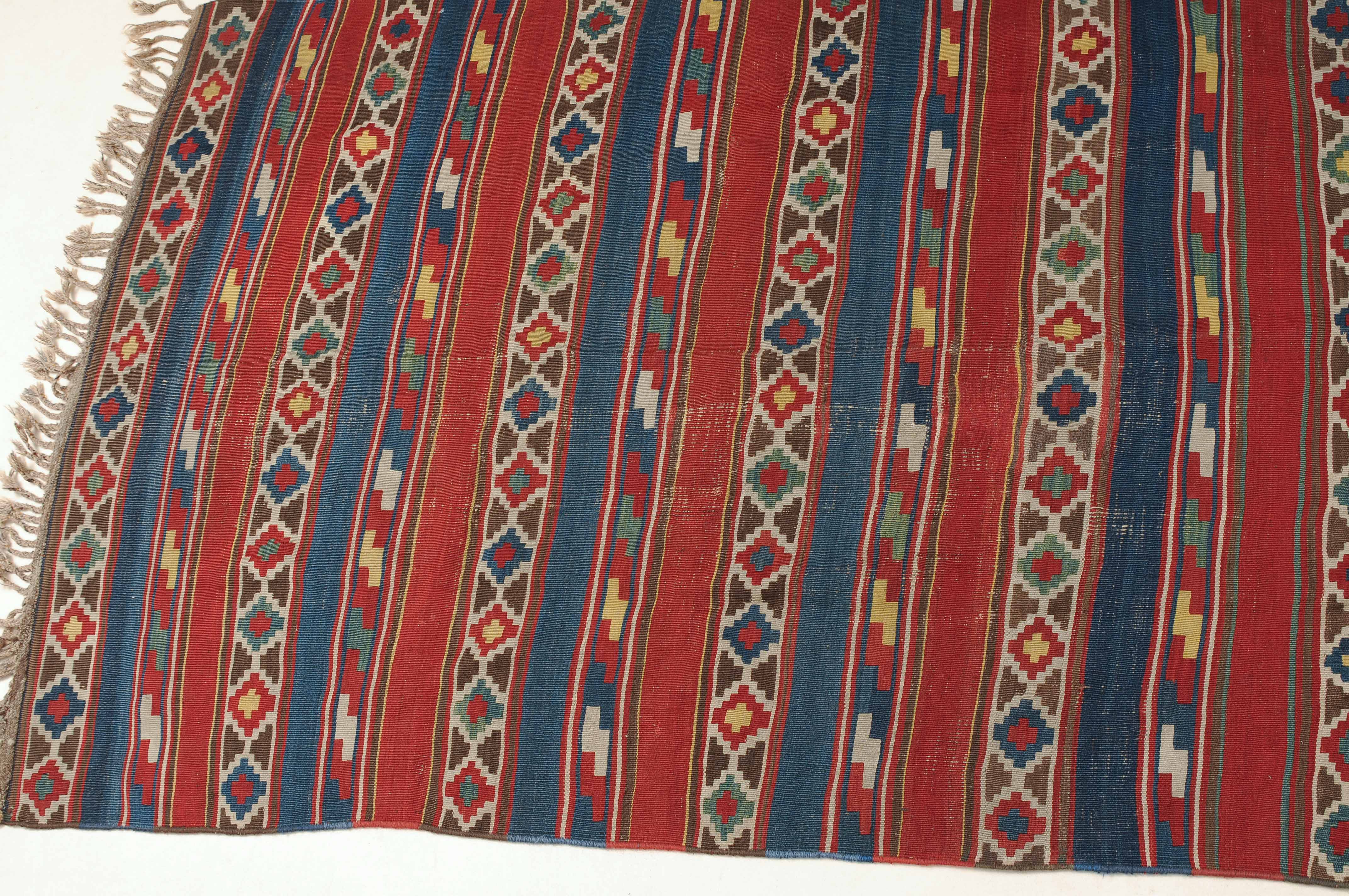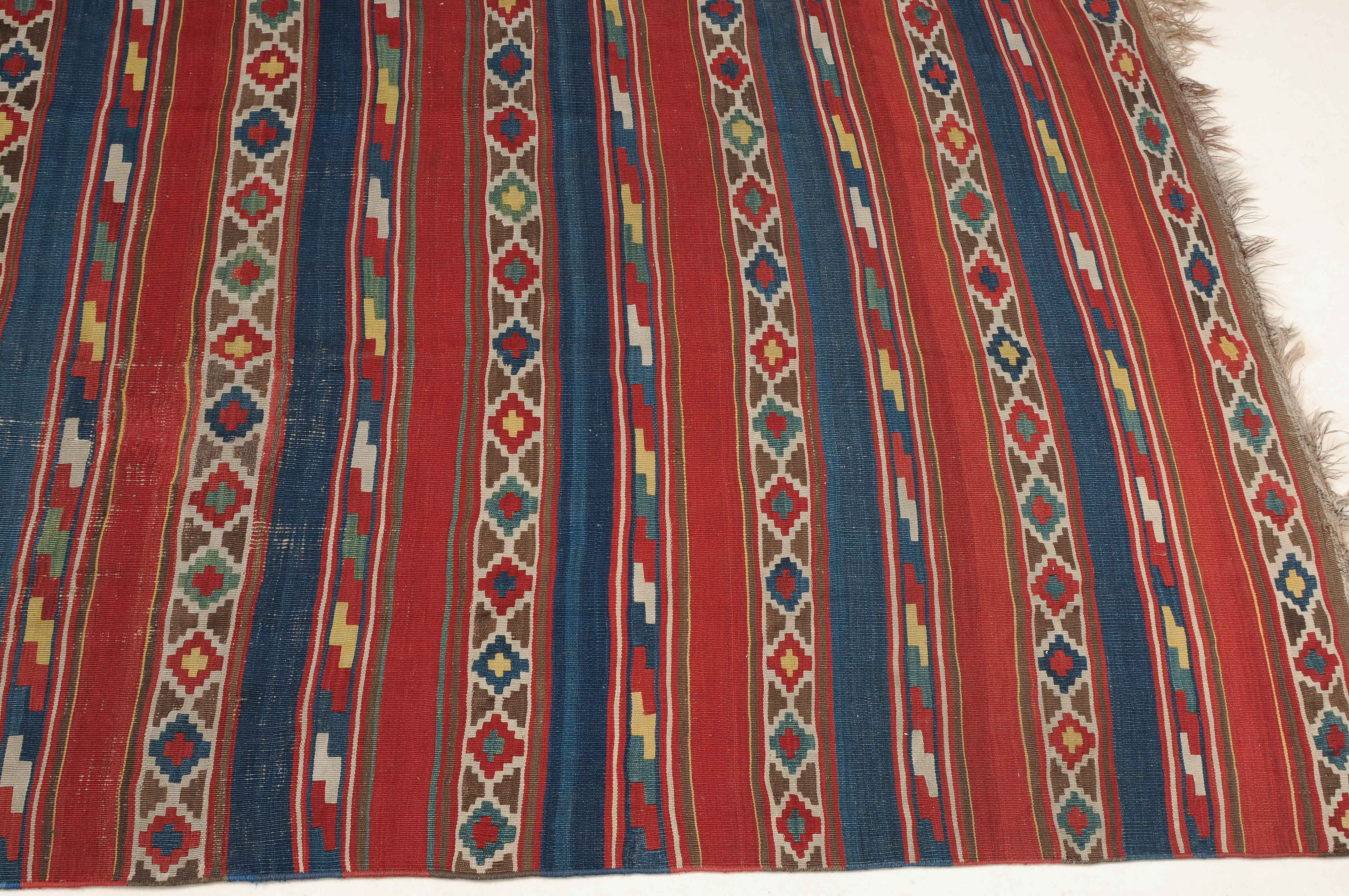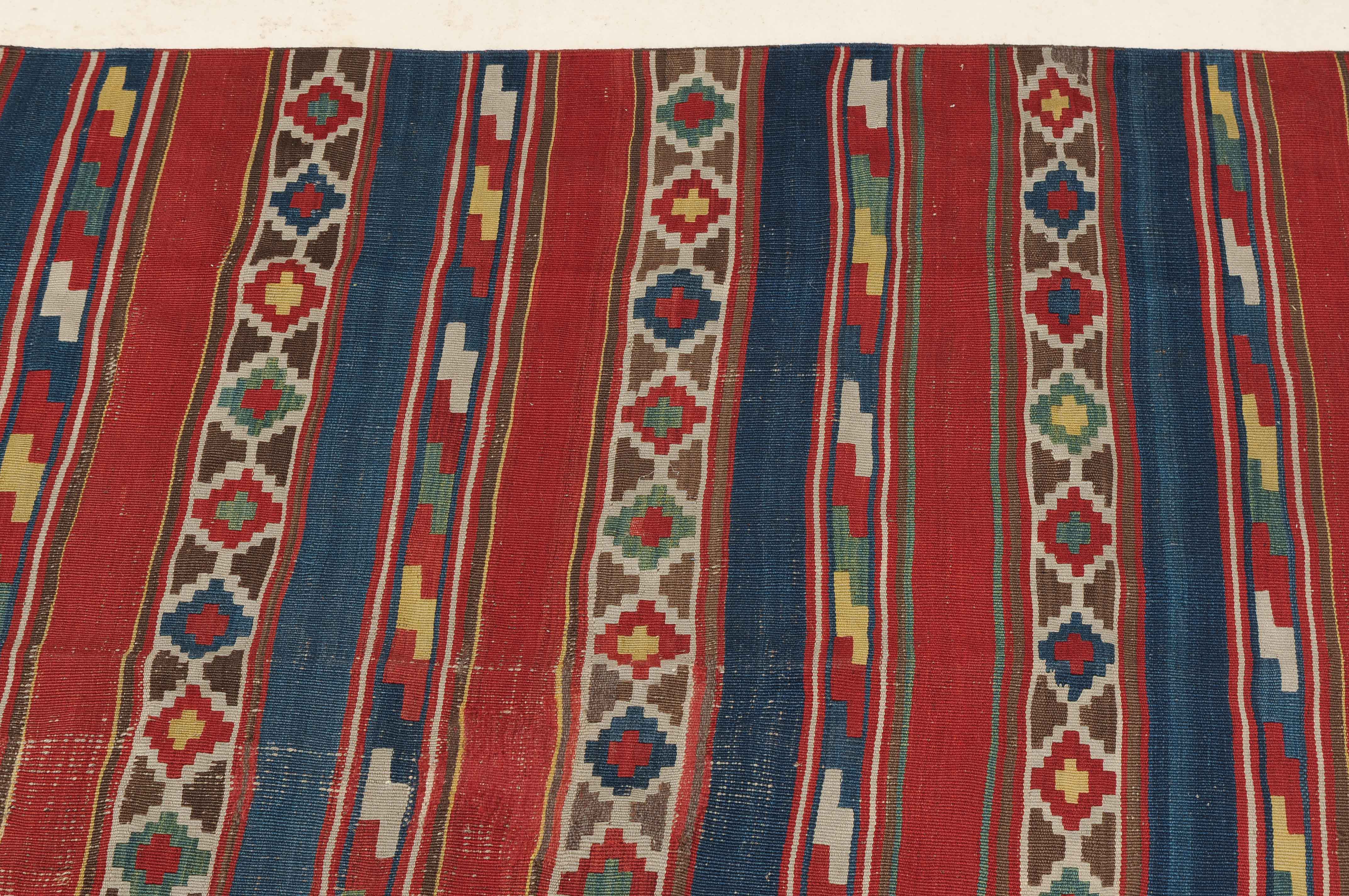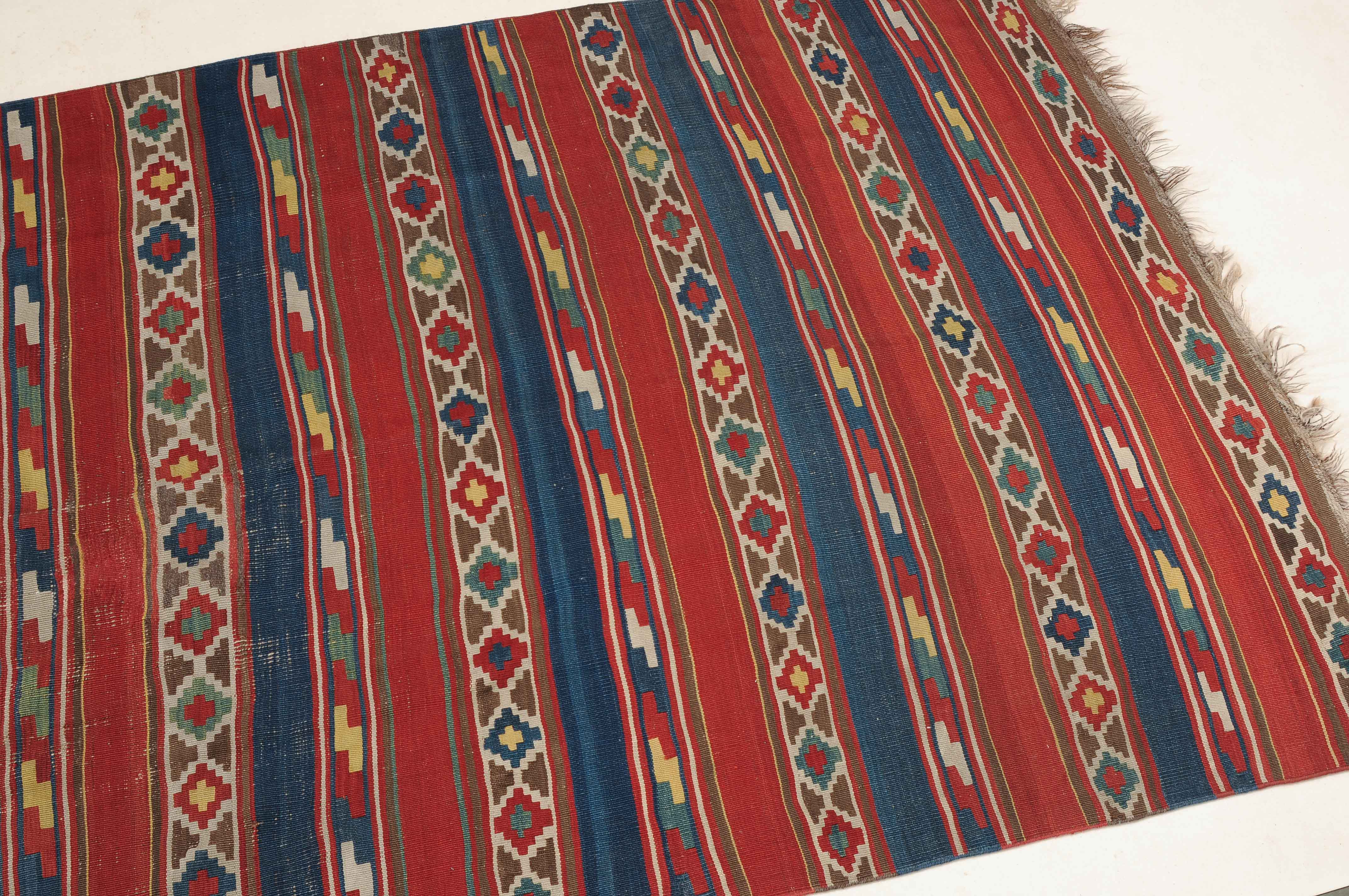 S-Kaukasus, um 1900. Sehr fein gewobener, mit einem horizontalen Streifen-Dekor belegter Kelim, der durchgehend mit aneinandergereihten Stufenrauten in alternierenden Farben dekorativ überzogen ist. Gebrauchsspuren. 150x320 cm (ft. 5x10.6).