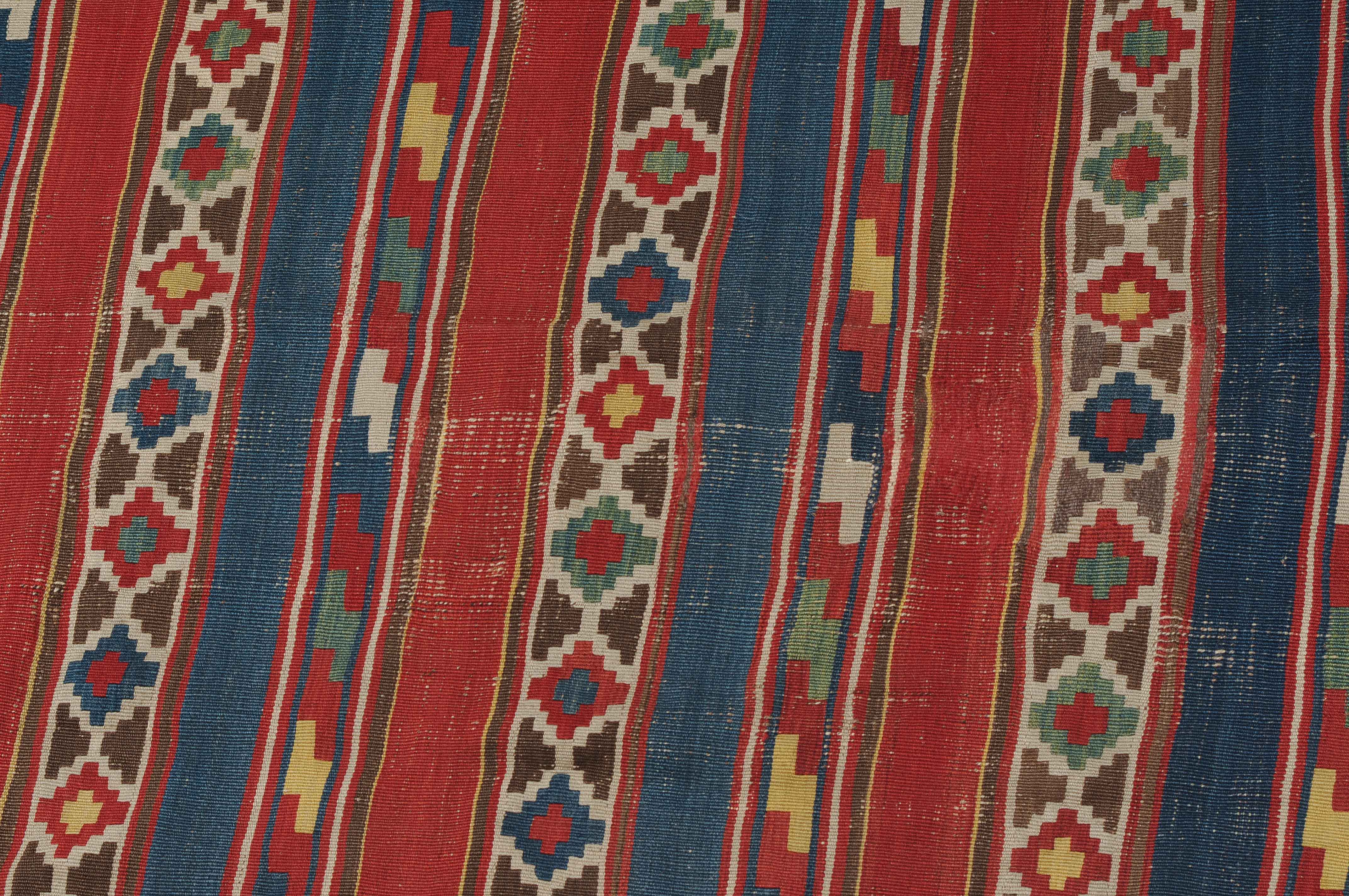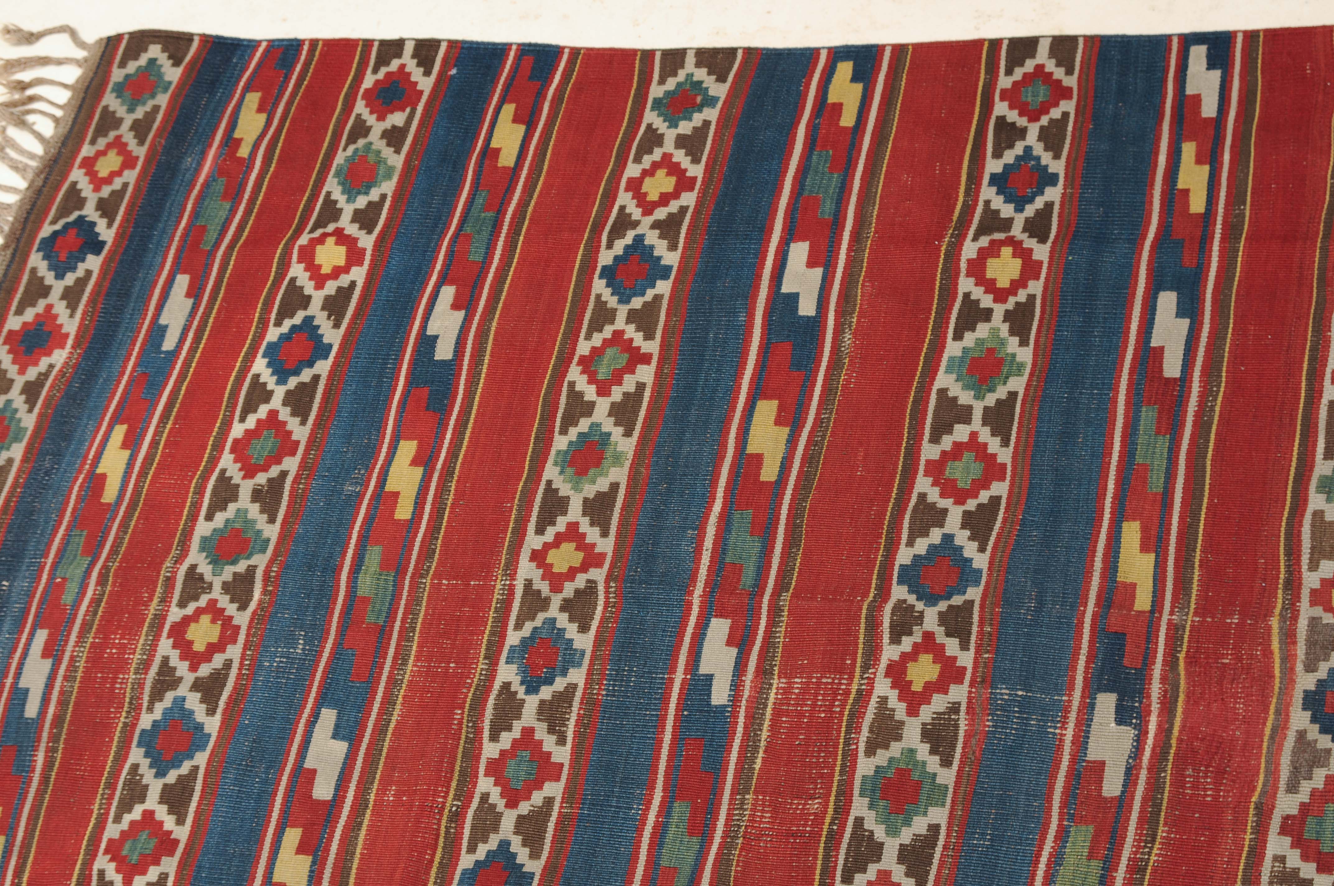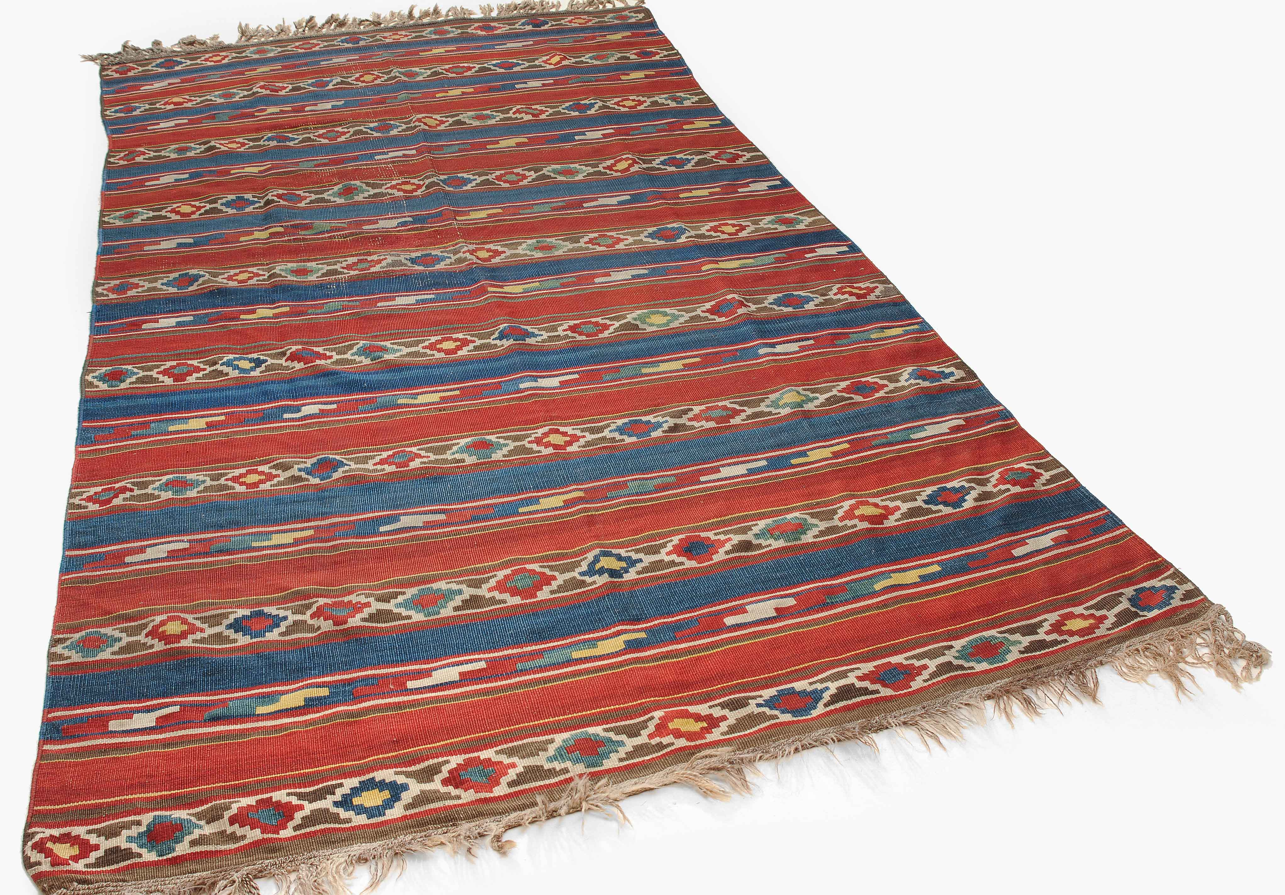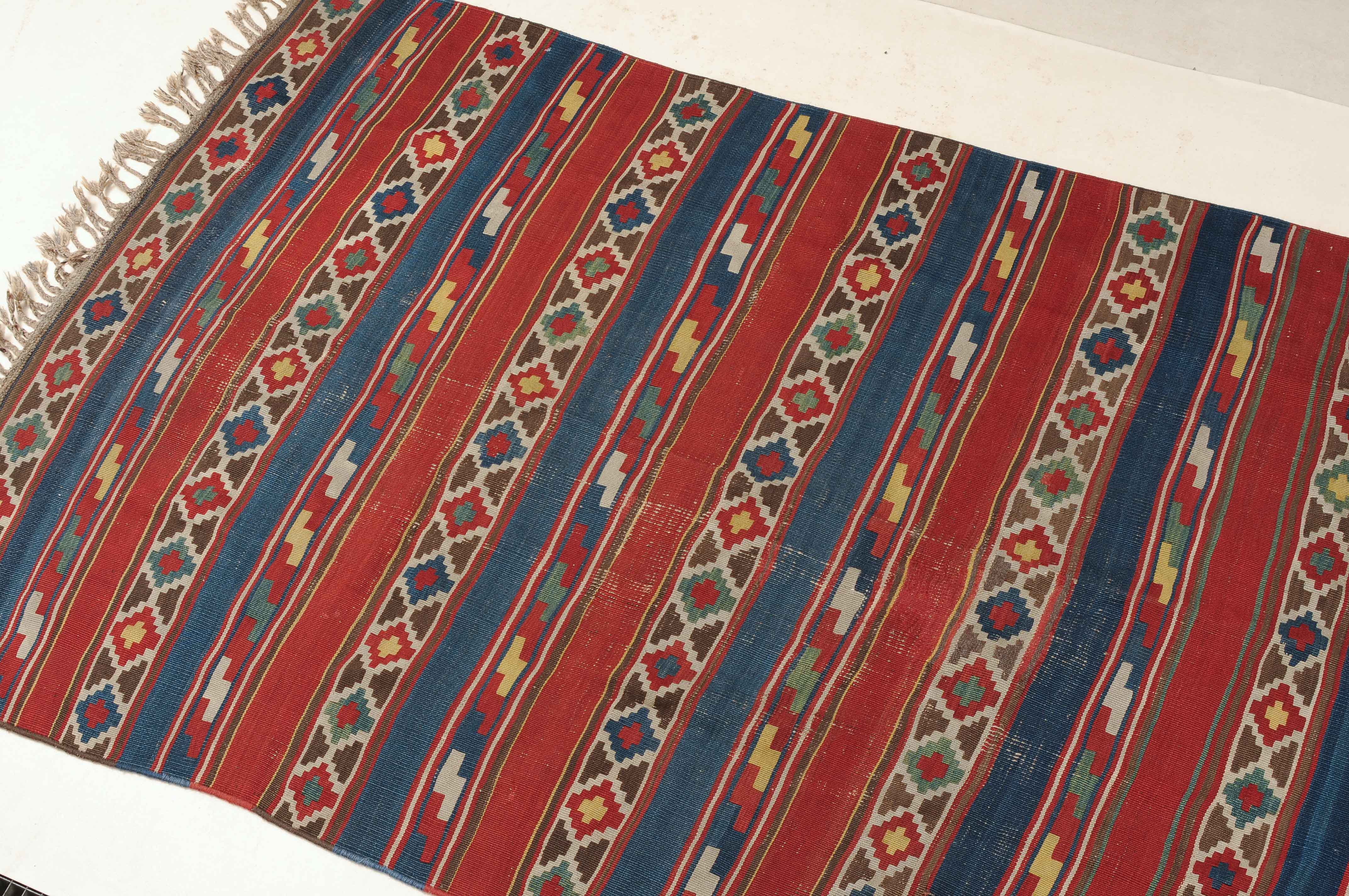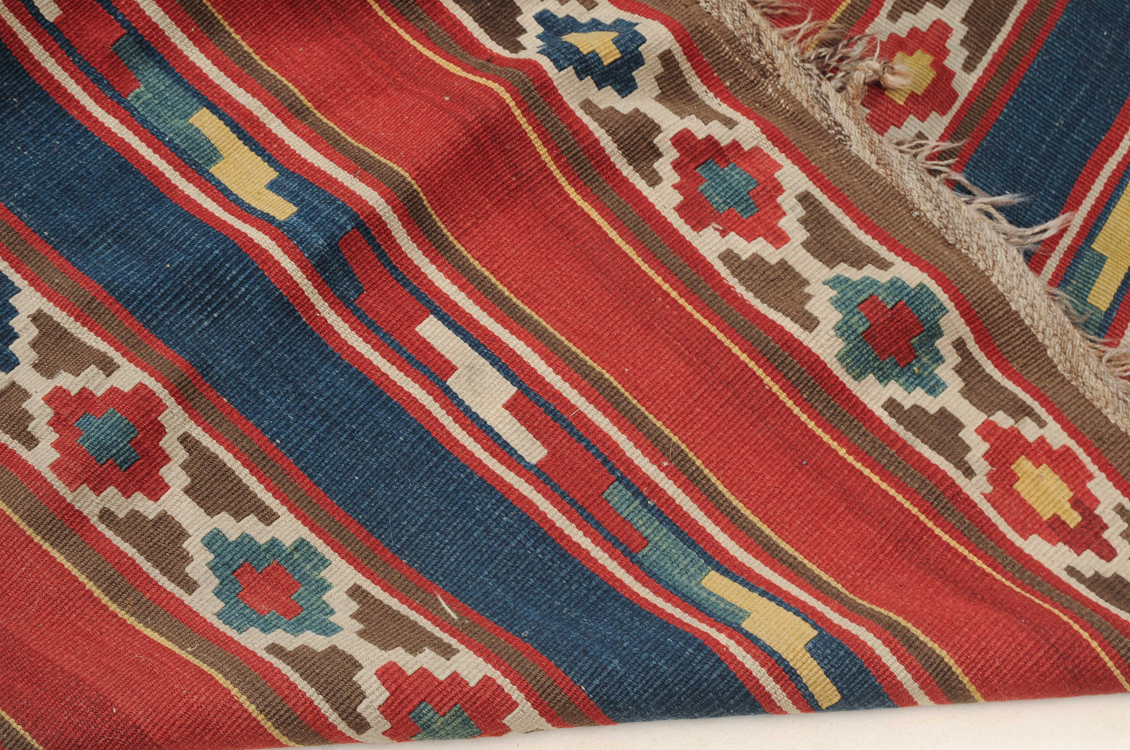 S-Kaukasus, um 1900. Sehr fein gewobener, mit einem horizontalen Streifen-Dekor belegter Kelim, der durchgehend mit aneinandergereihten Stufenrauten in alternierenden Farben dekorativ überzogen ist. Gebrauchsspuren. 150x320 cm (ft. 5x10.6).
