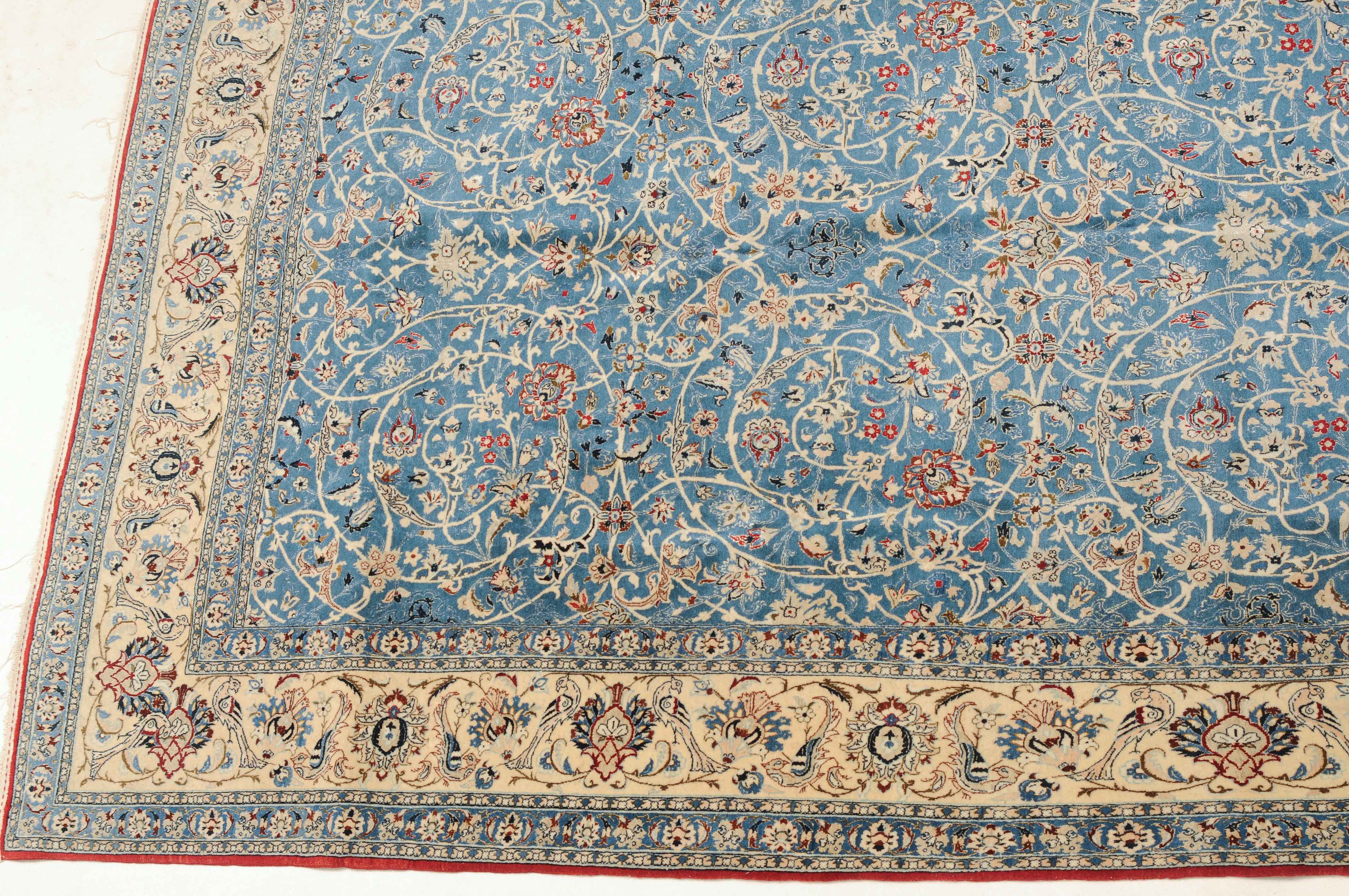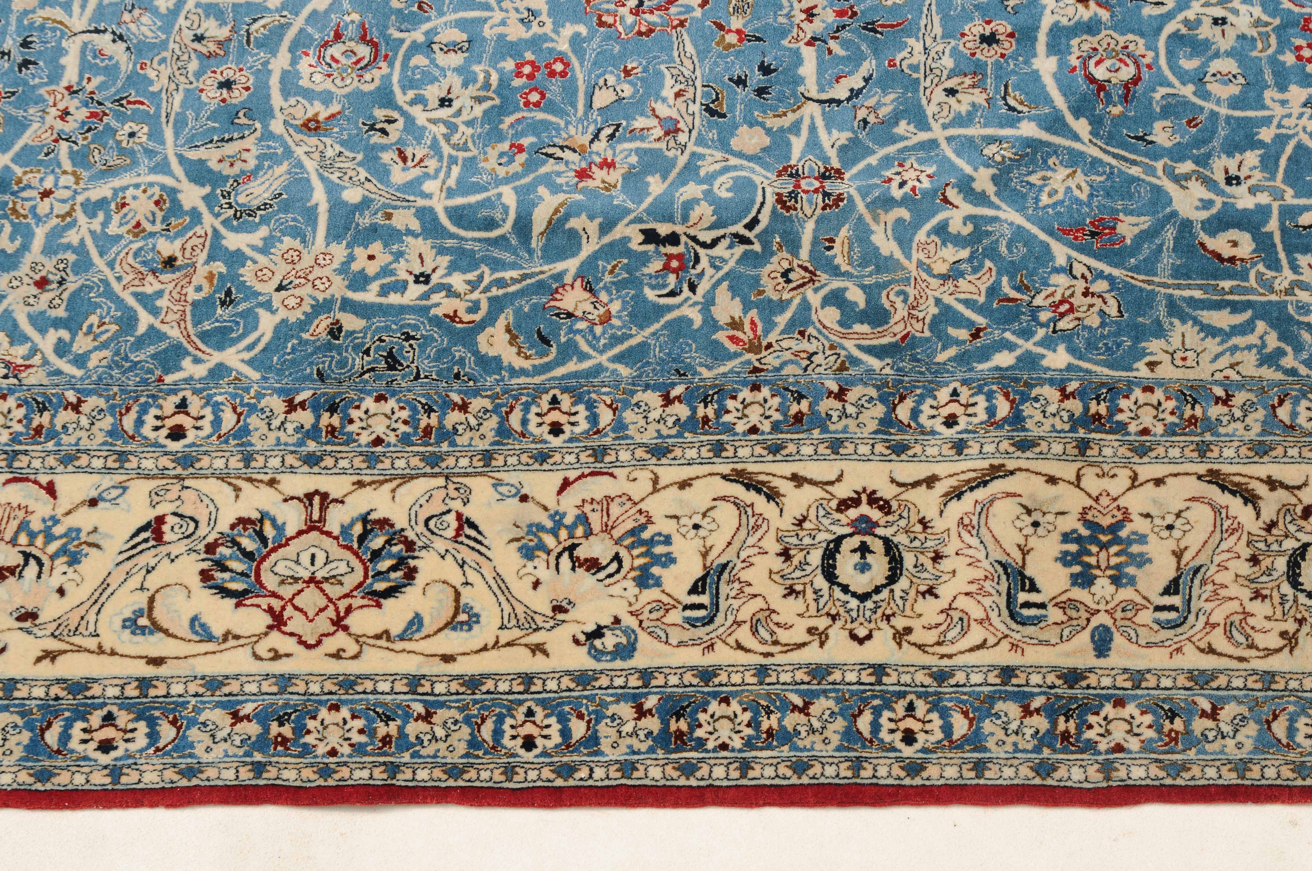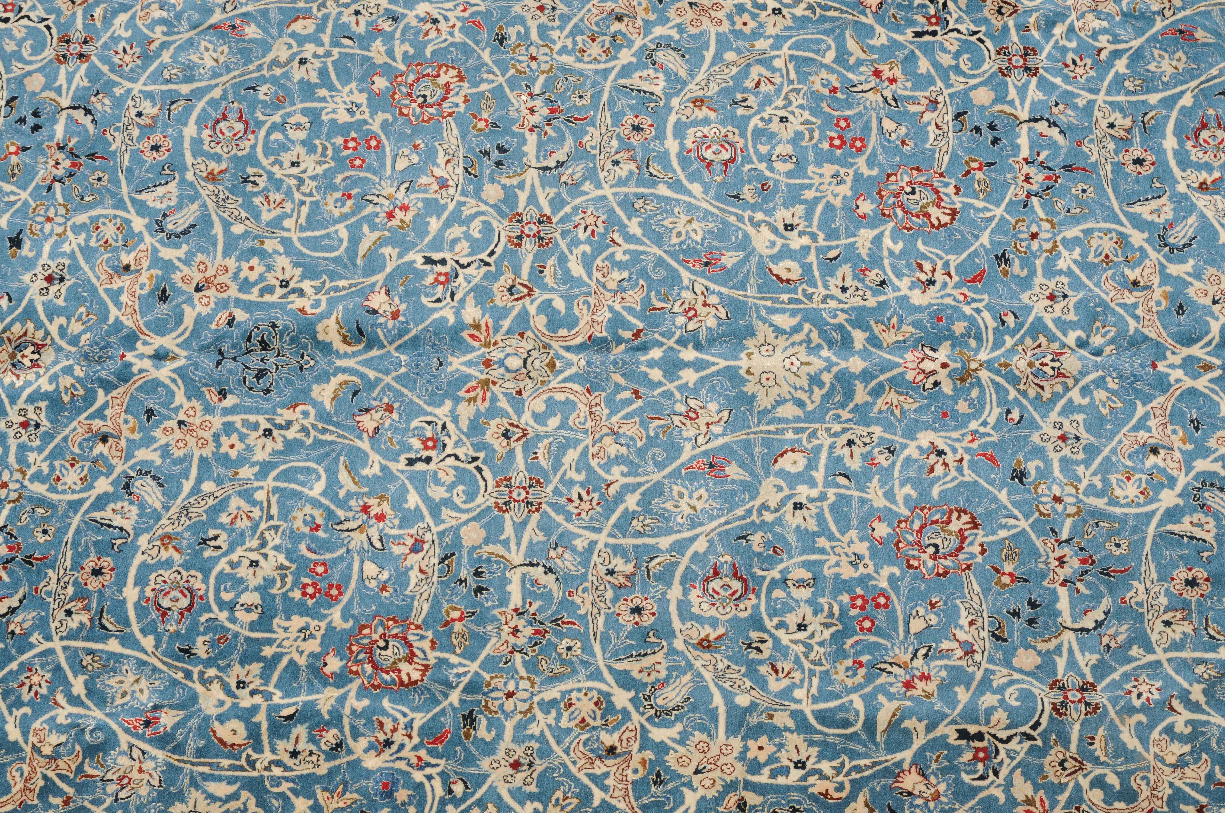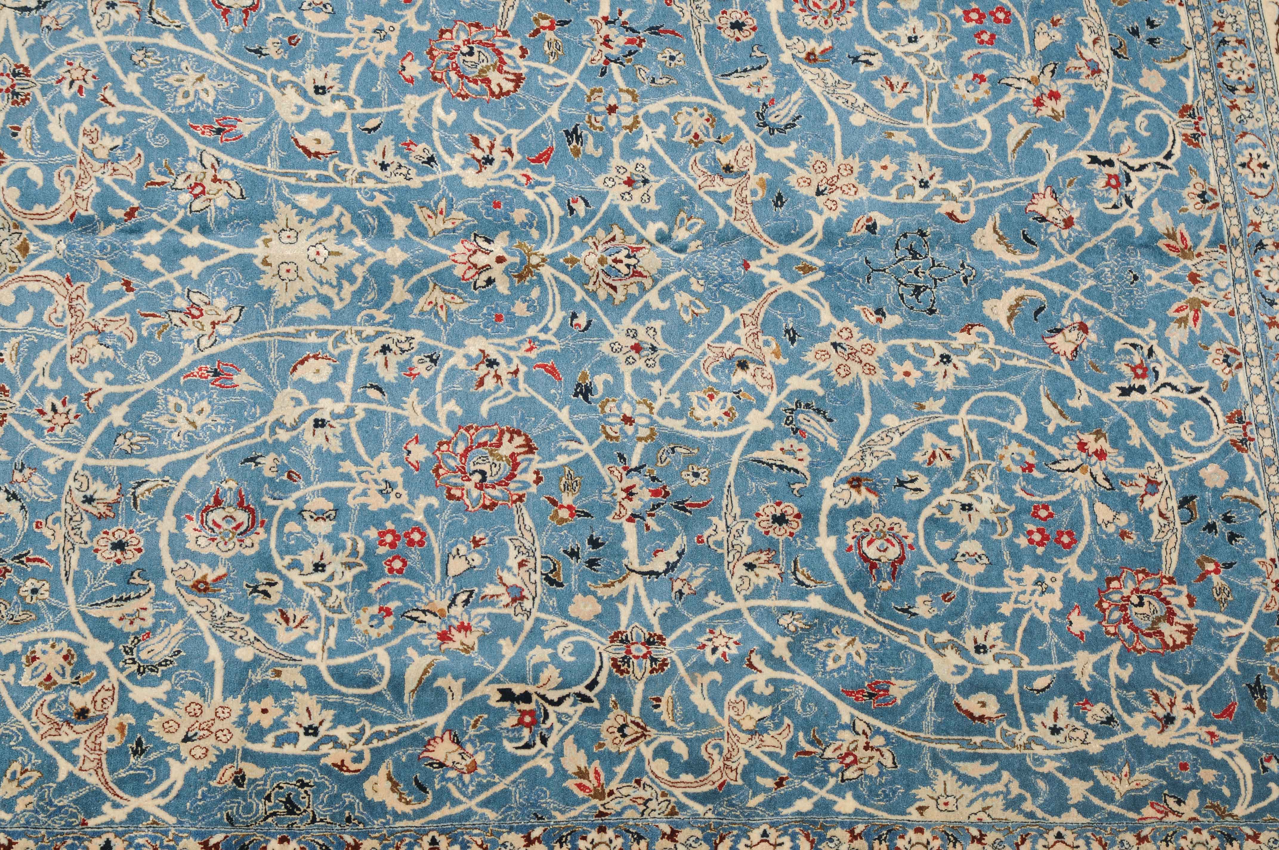 Z-Persien, um 1940. Sehr feine Knüpfung. Dichtes florales Werk. Das elegante hellblaue Innenfeld ist durchgehend mit dekorativen Blütenmotiven in verschiedenen Variationen und filigranen Arabesken in unendlichem Rapport gefüllt. 2 fein gezeichnete hellblaue Nebenbordüren umfassen die helle, mit Blüten-Palmetten und Vogelpaaren auf dekorative Weise belegte Hauptbordüre. Gereinigt. Sehr gute Erhaltung. 155x260 cm (ft. 5.1x8.6).