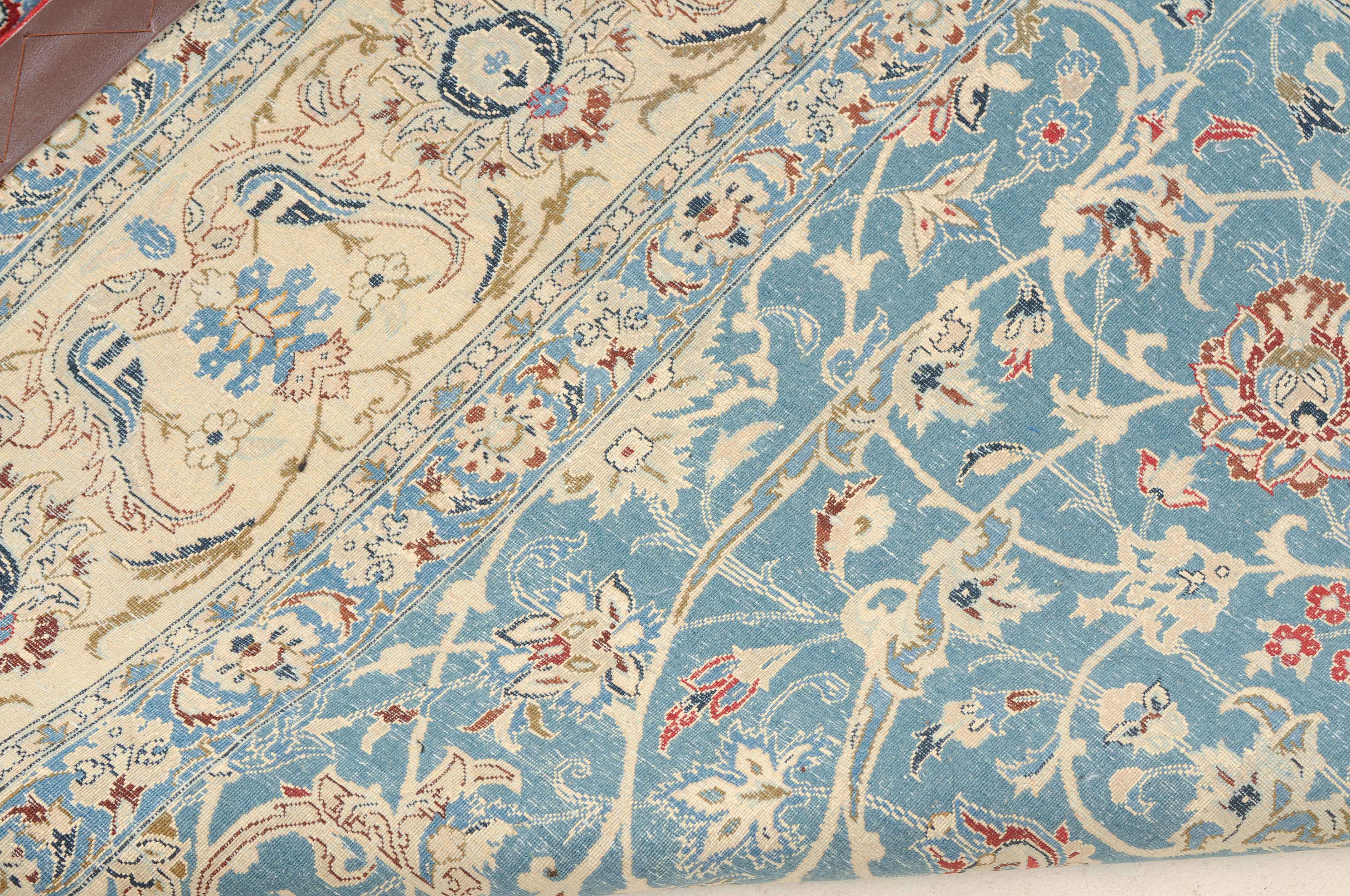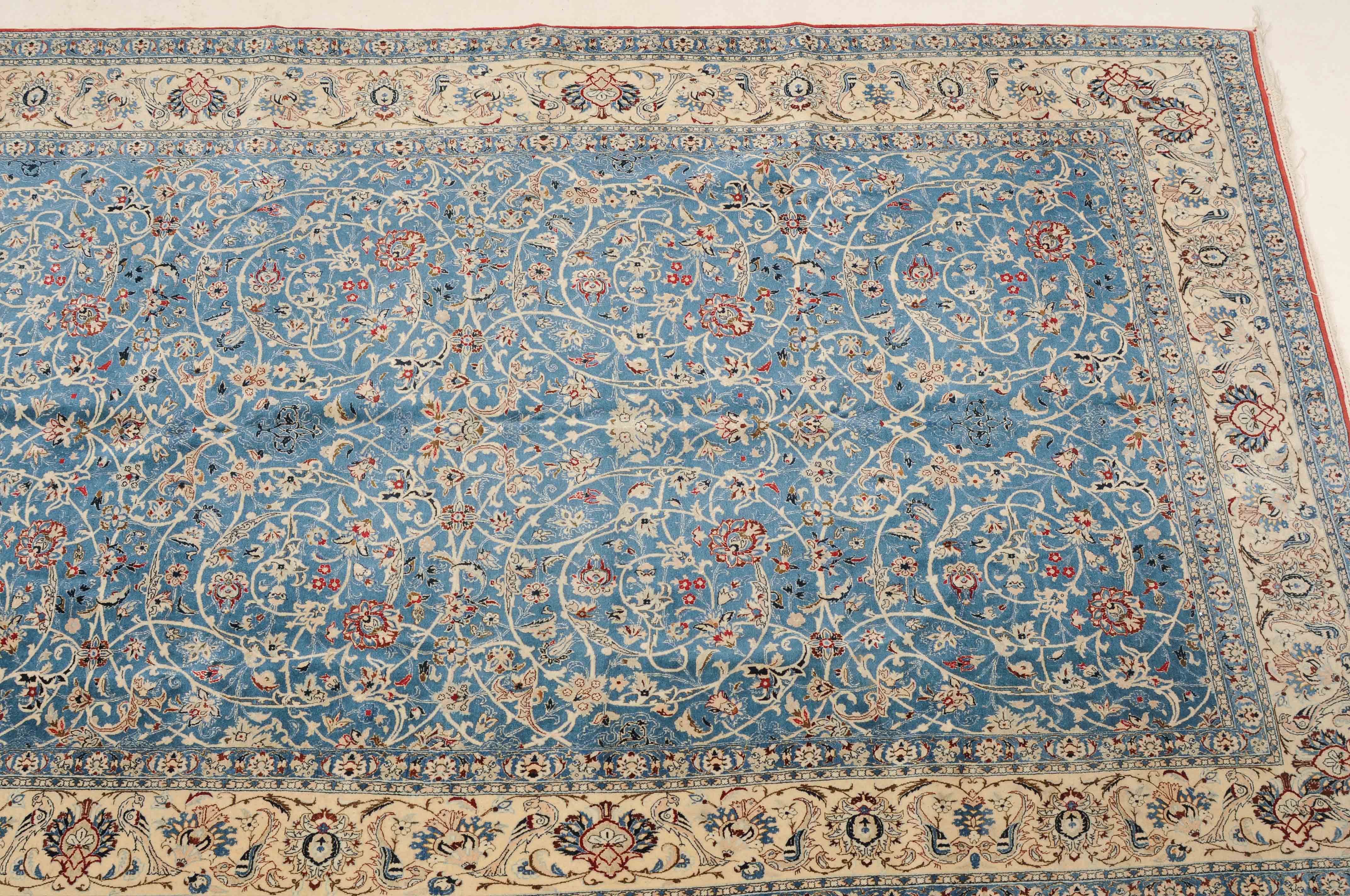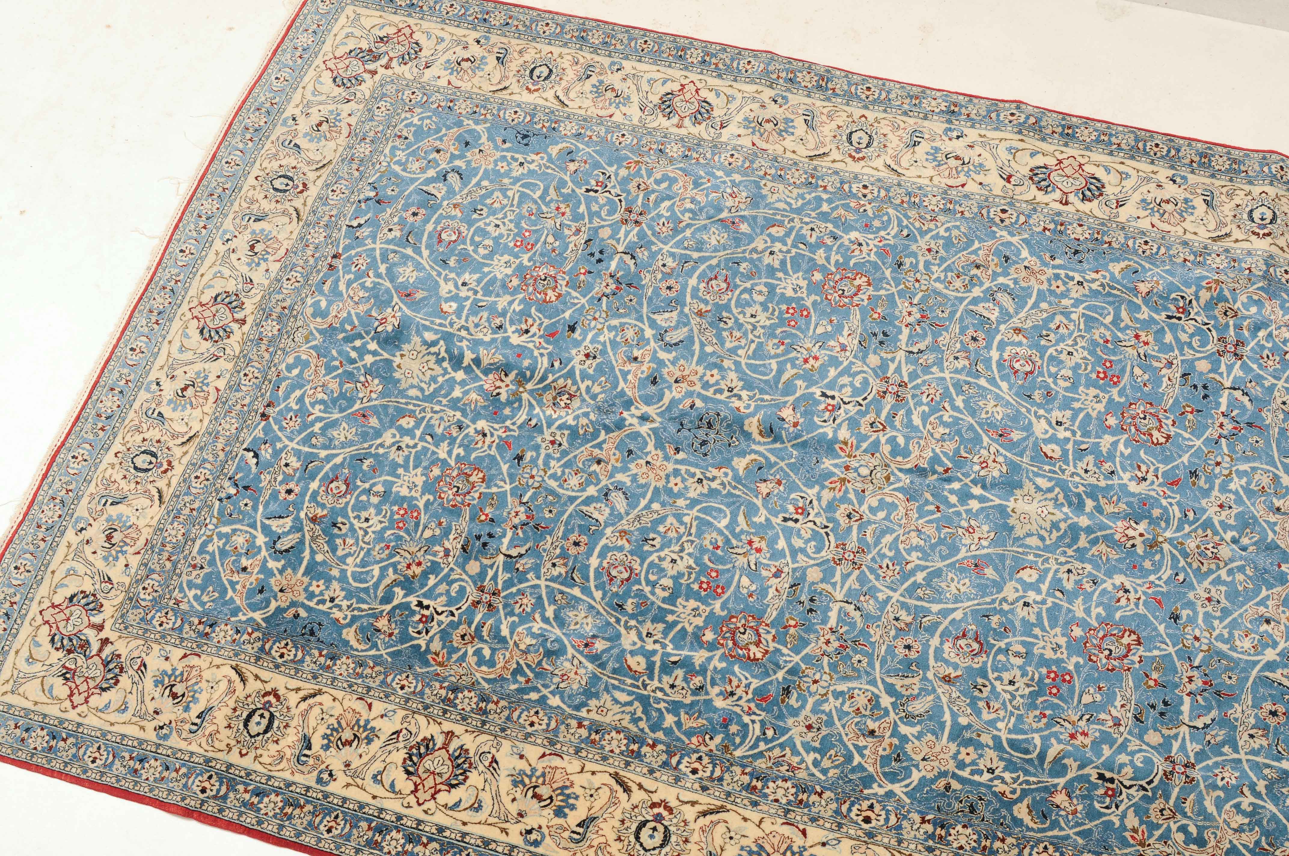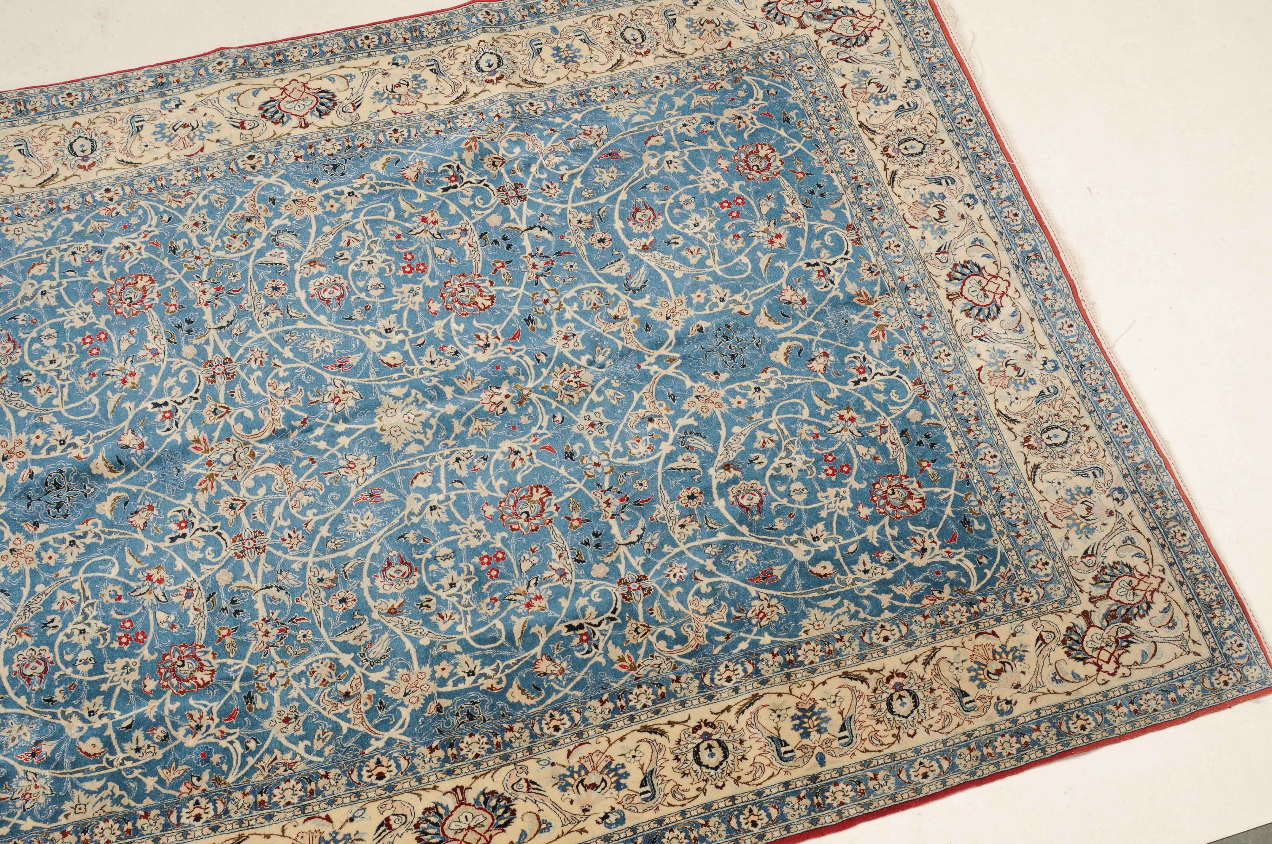 Z-Persien, um 1940. Sehr feine Knüpfung. Dichtes florales Werk. Das elegante hellblaue Innenfeld ist durchgehend mit dekorativen Blütenmotiven in verschiedenen Variationen und filigranen Arabesken in unendlichem Rapport gefüllt. 2 fein gezeichnete hellblaue Nebenbordüren umfassen die helle, mit Blüten-Palmetten und Vogelpaaren auf dekorative Weise belegte Hauptbordüre. Gereinigt. Sehr gute Erhaltung. 155x260 cm (ft. 5.1x8.6).