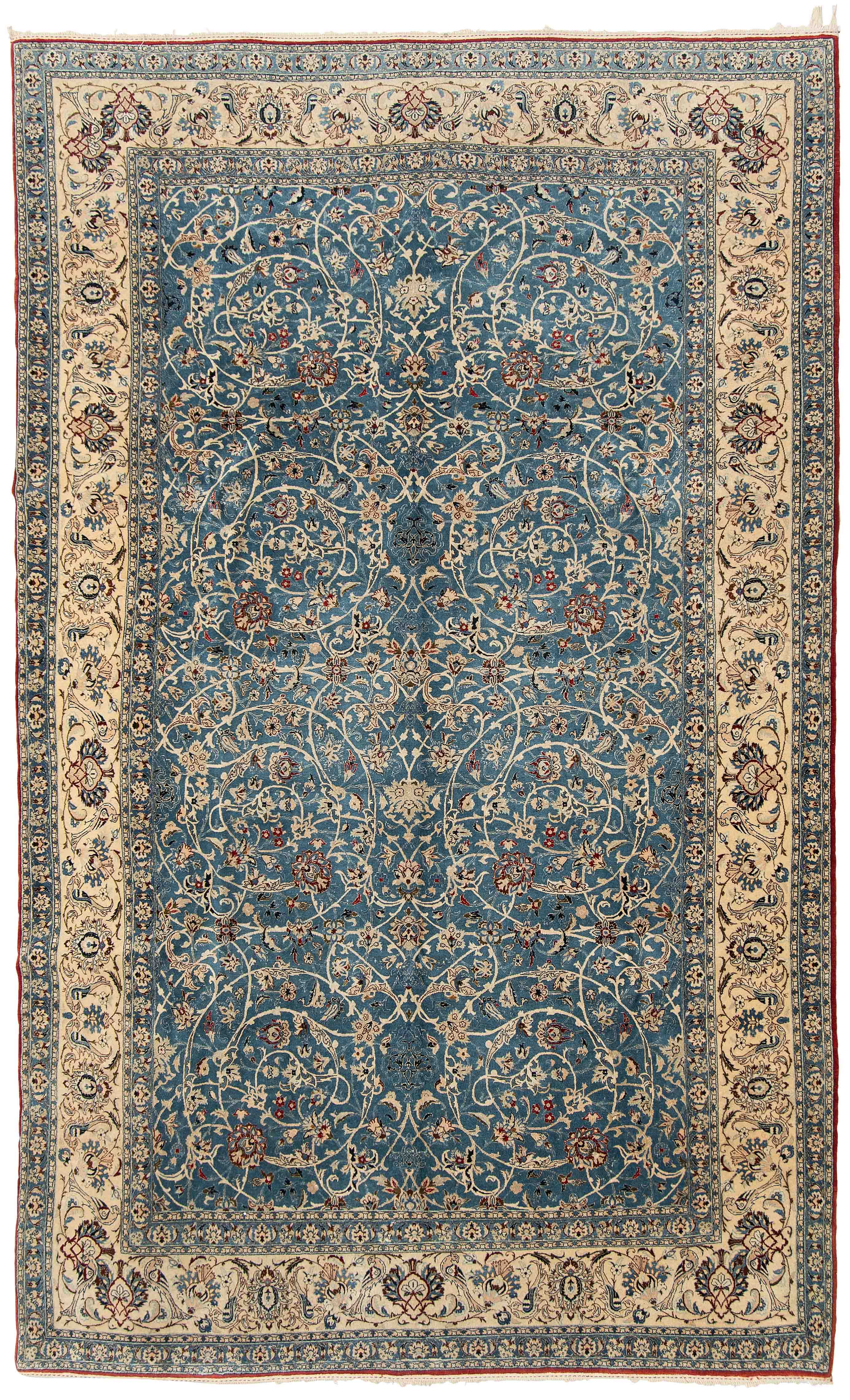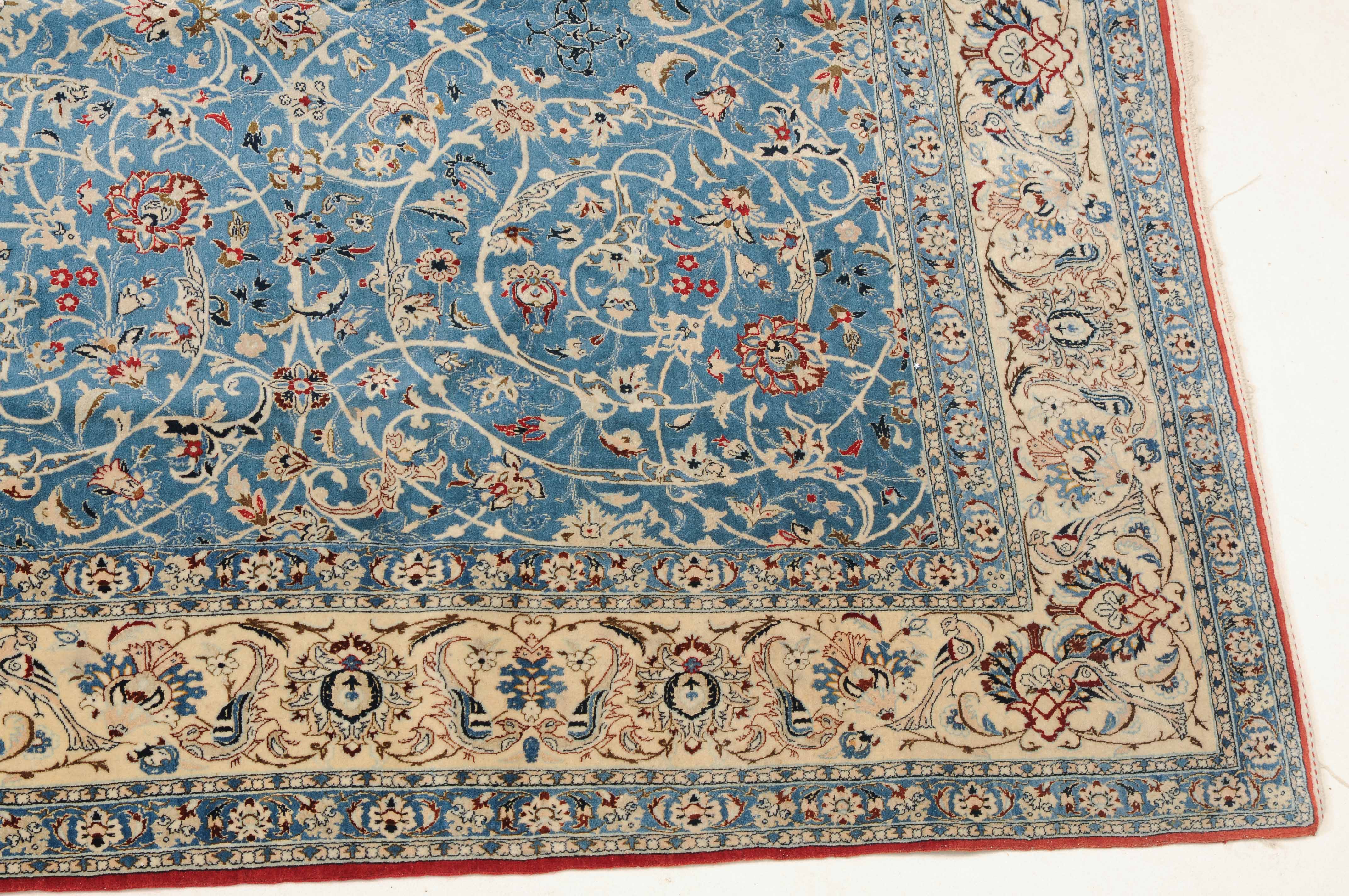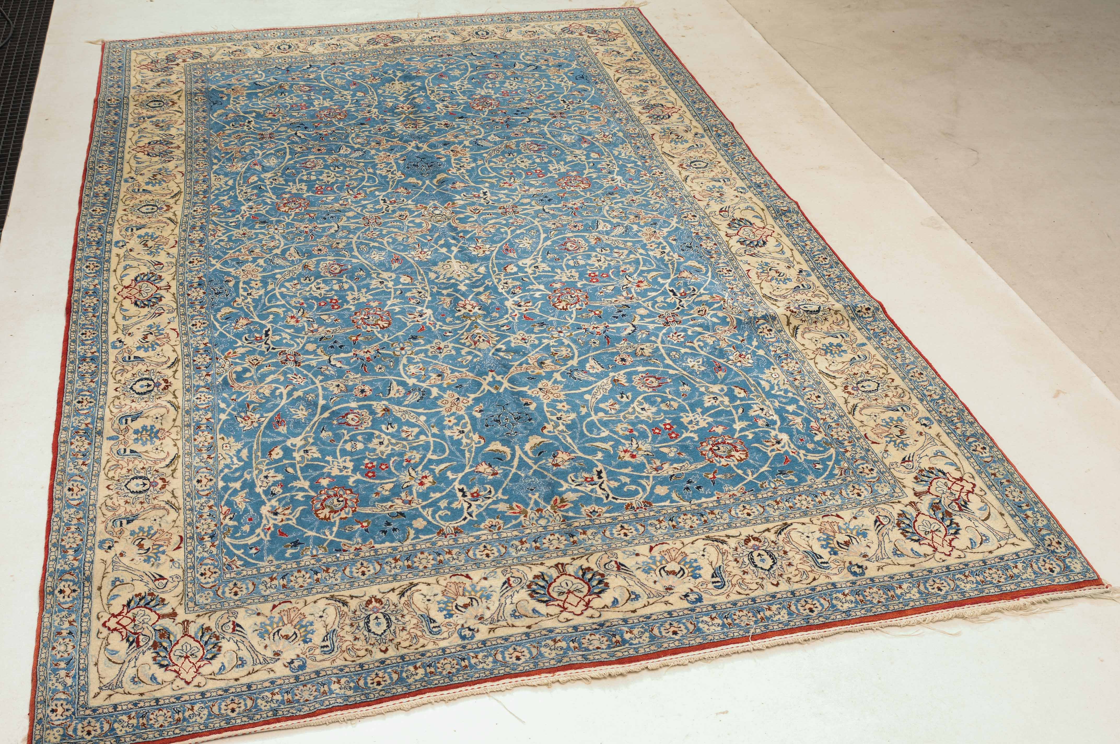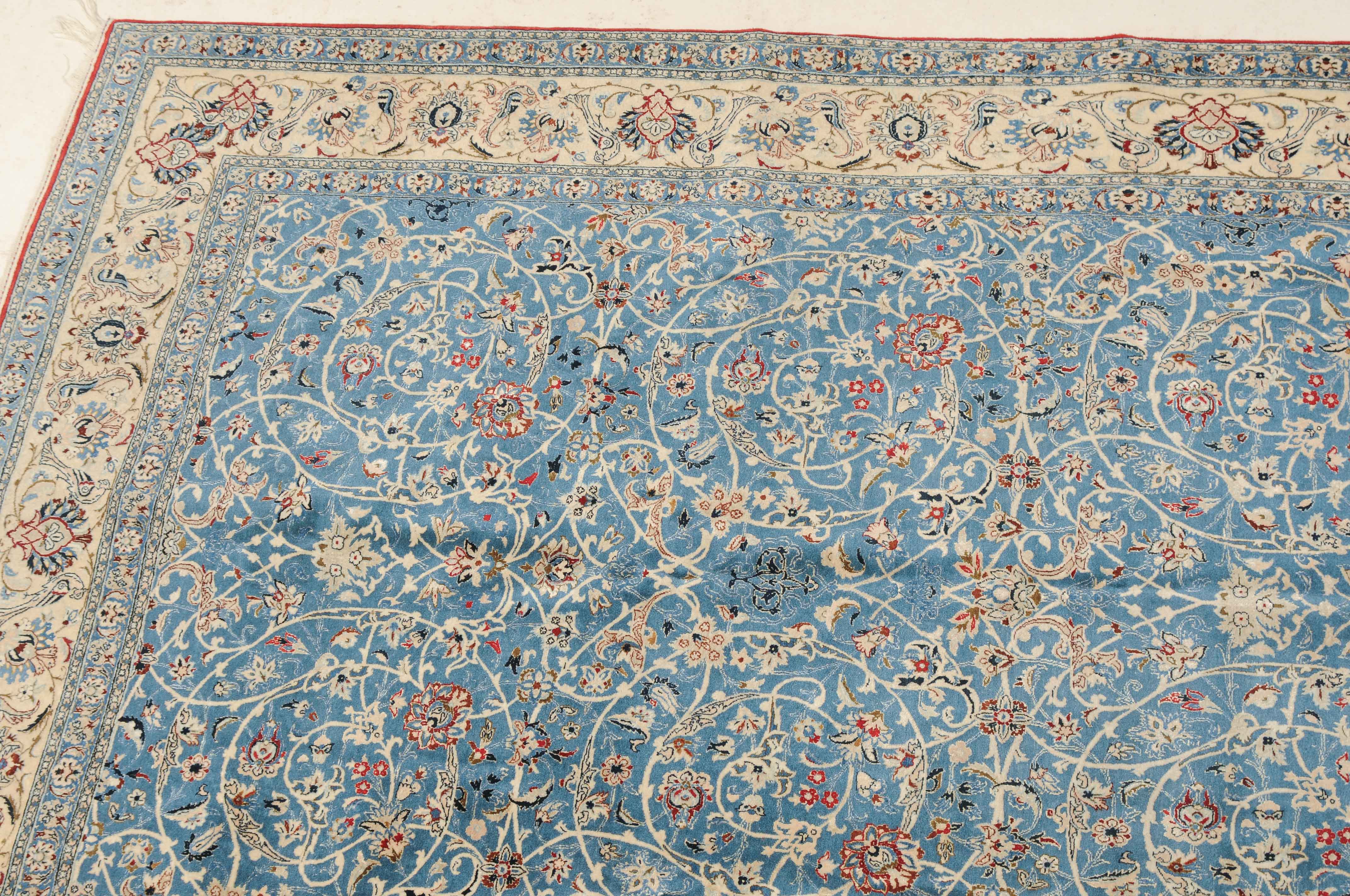 Z-Persien, um 1940. Sehr feine Knüpfung. Dichtes florales Werk. Das elegante hellblaue Innenfeld ist durchgehend mit dekorativen Blütenmotiven in verschiedenen Variationen und filigranen Arabesken in unendlichem Rapport gefüllt. 2 fein gezeichnete hellblaue Nebenbordüren umfassen die helle, mit Blüten-Palmetten und Vogelpaaren auf dekorative Weise belegte Hauptbordüre. Gereinigt. Sehr gute Erhaltung. 155x260 cm (ft. 5.1x8.6).