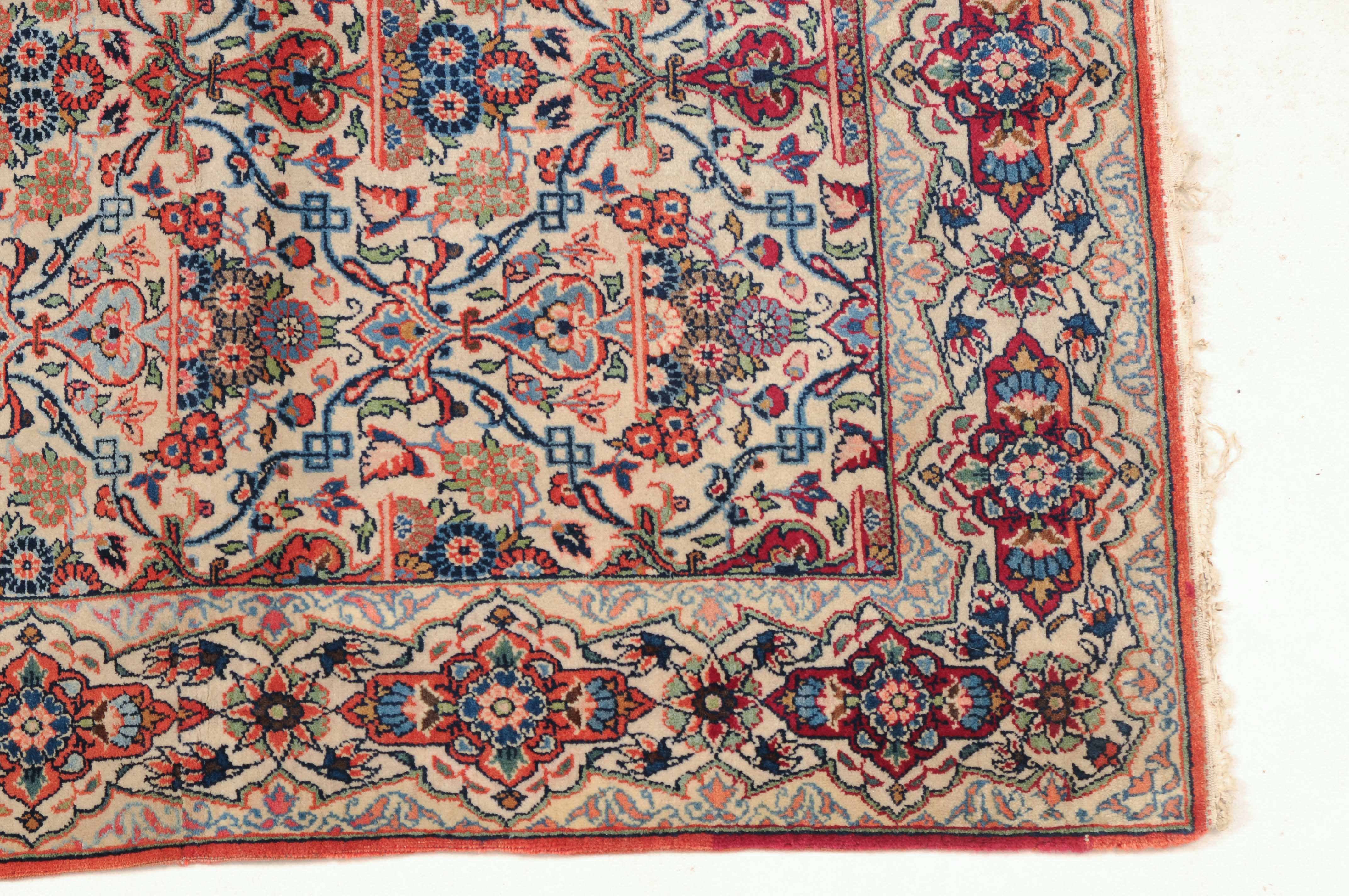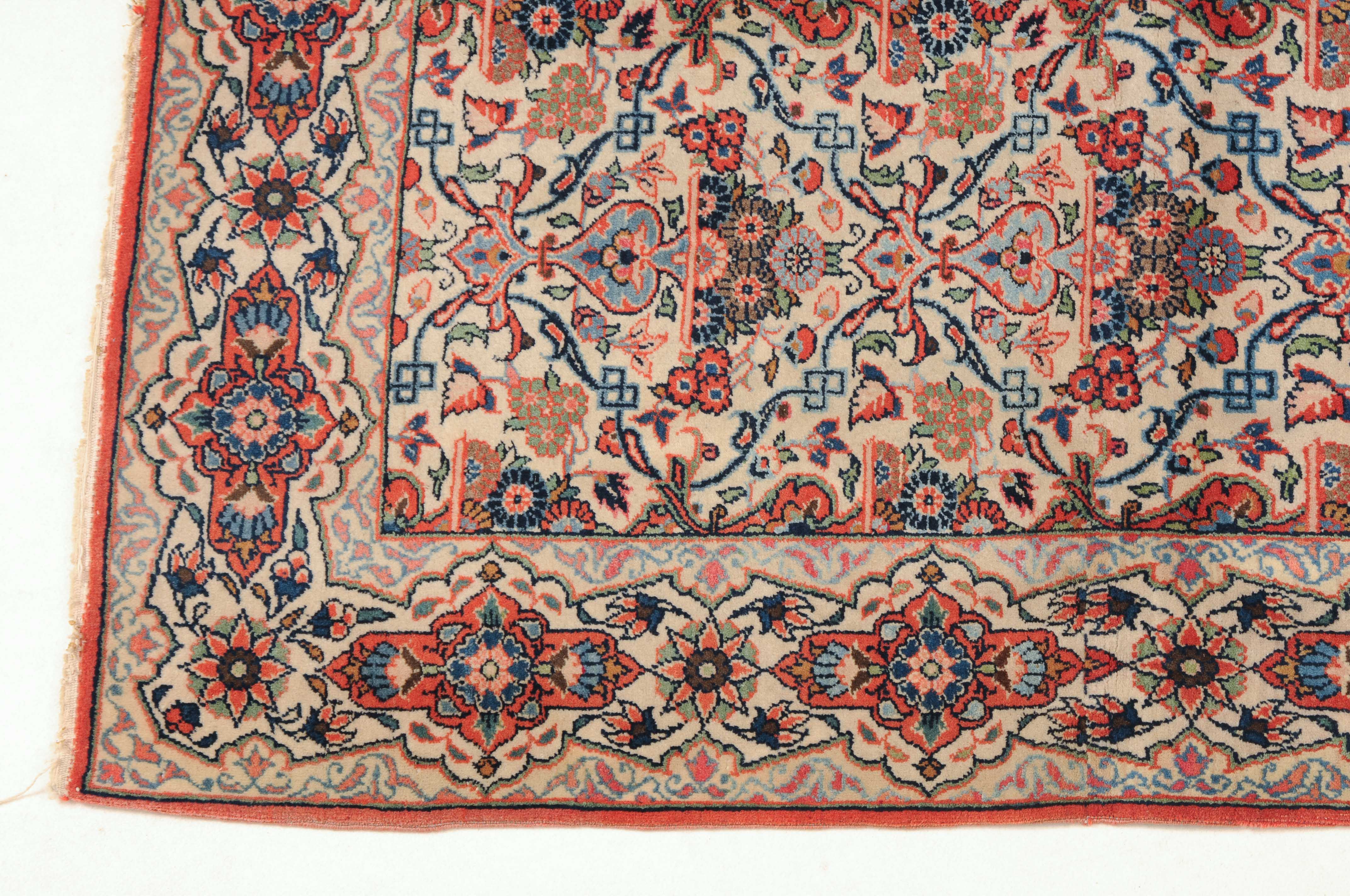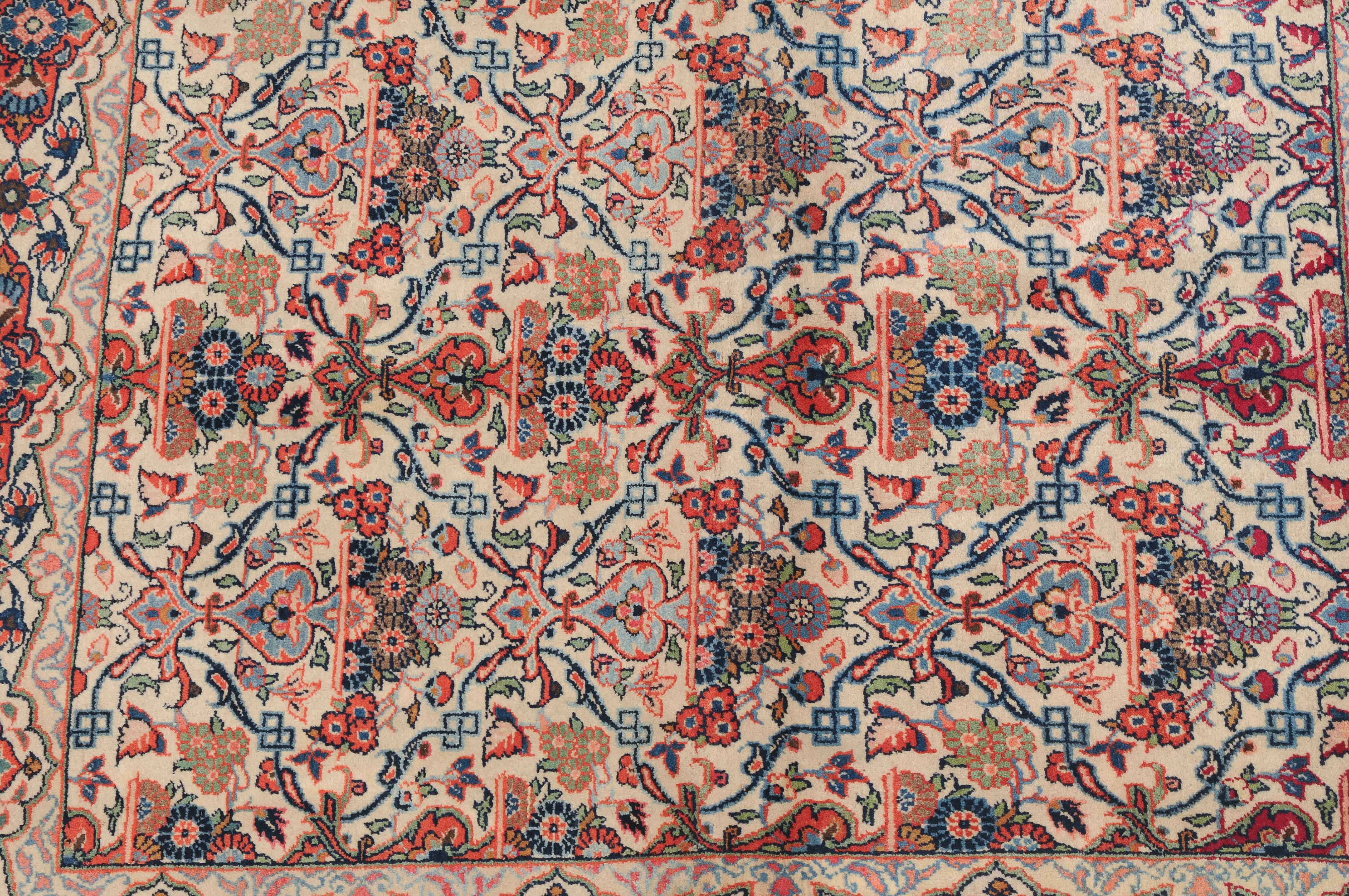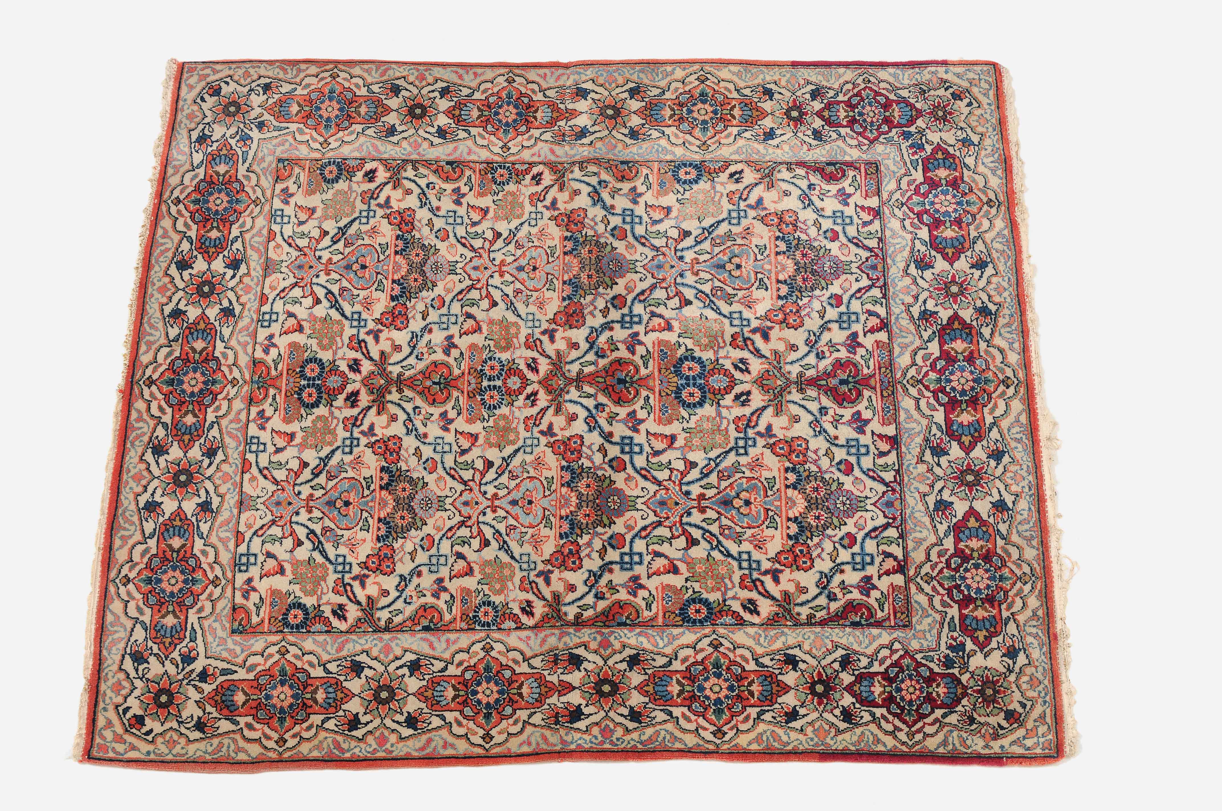Z-Persien, um 1920. Auf weissem Grund figurieren in horizontalen Reihen angelegte, blumengefüllte Vasen in Rot und Blau, dicht flankiert von einem feingliedrigen Ranken- und Blütenwerk. Die dekorative helle Hauptbordüre ist alternierend mit roten Kartuschen und Sternblüten gefüllt. In der Mitte geschnitten und wieder zusammen genäht. Gute Erhaltung. 104x125 cm (ft. 3.4x4.1).