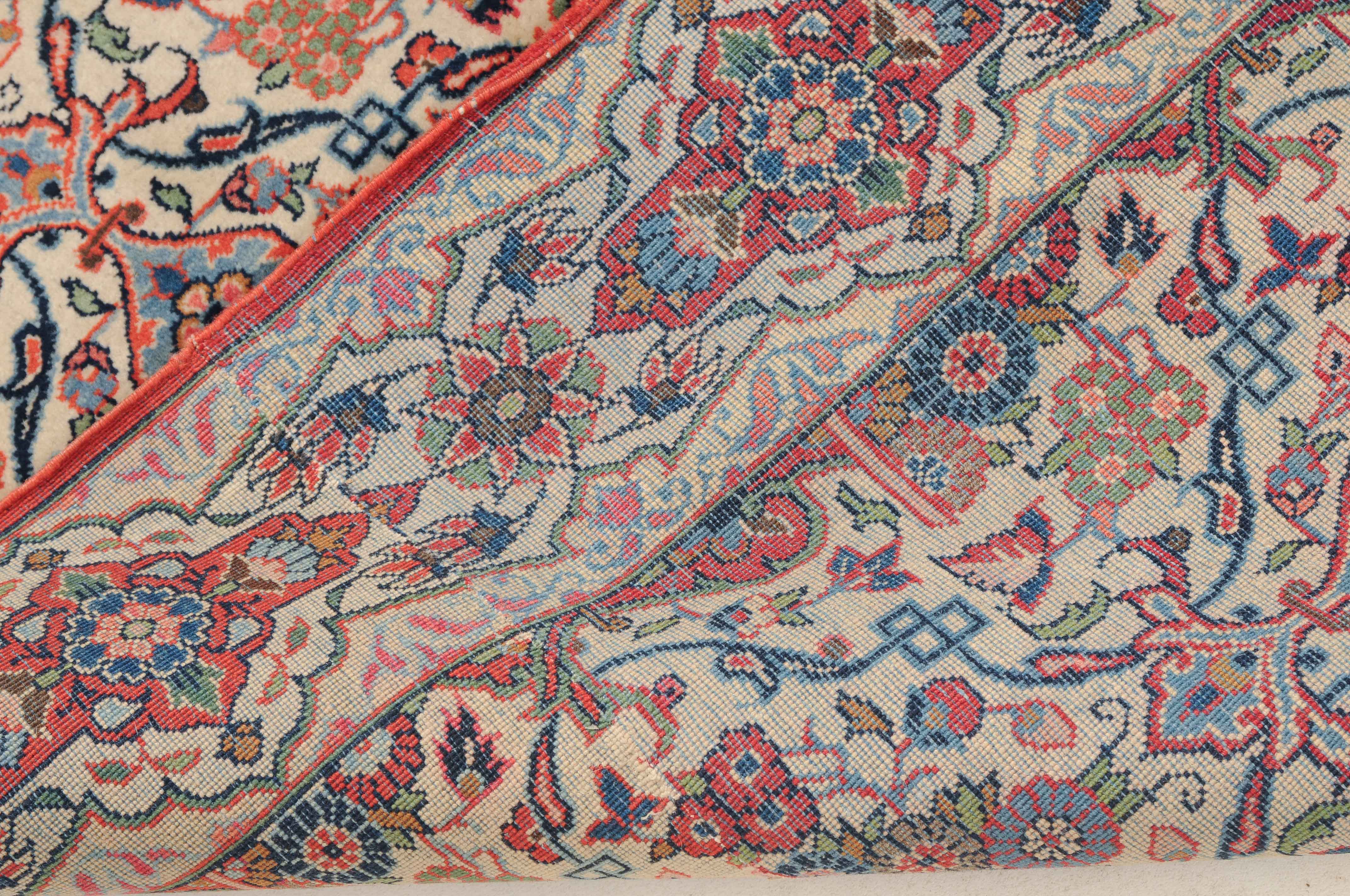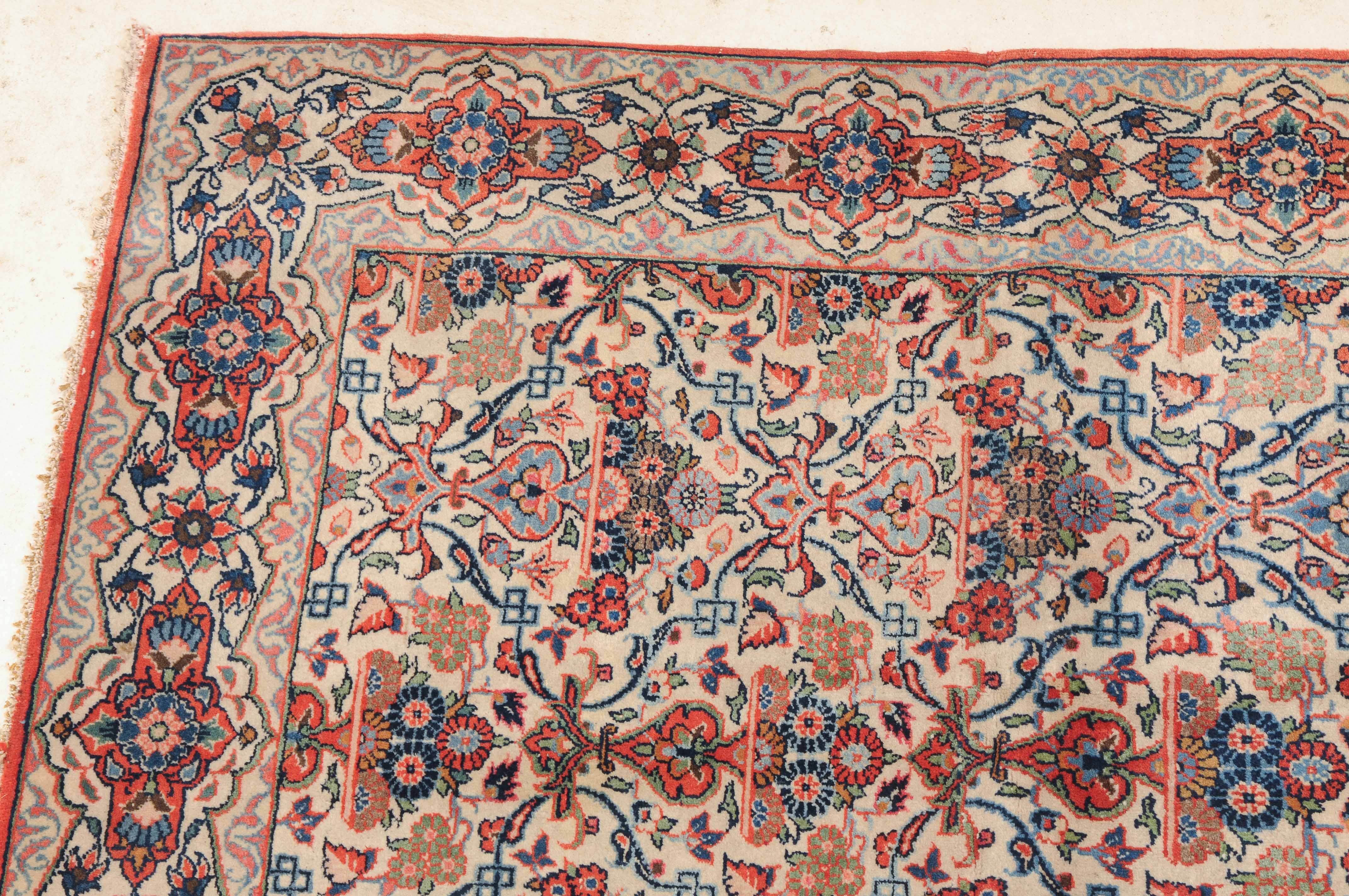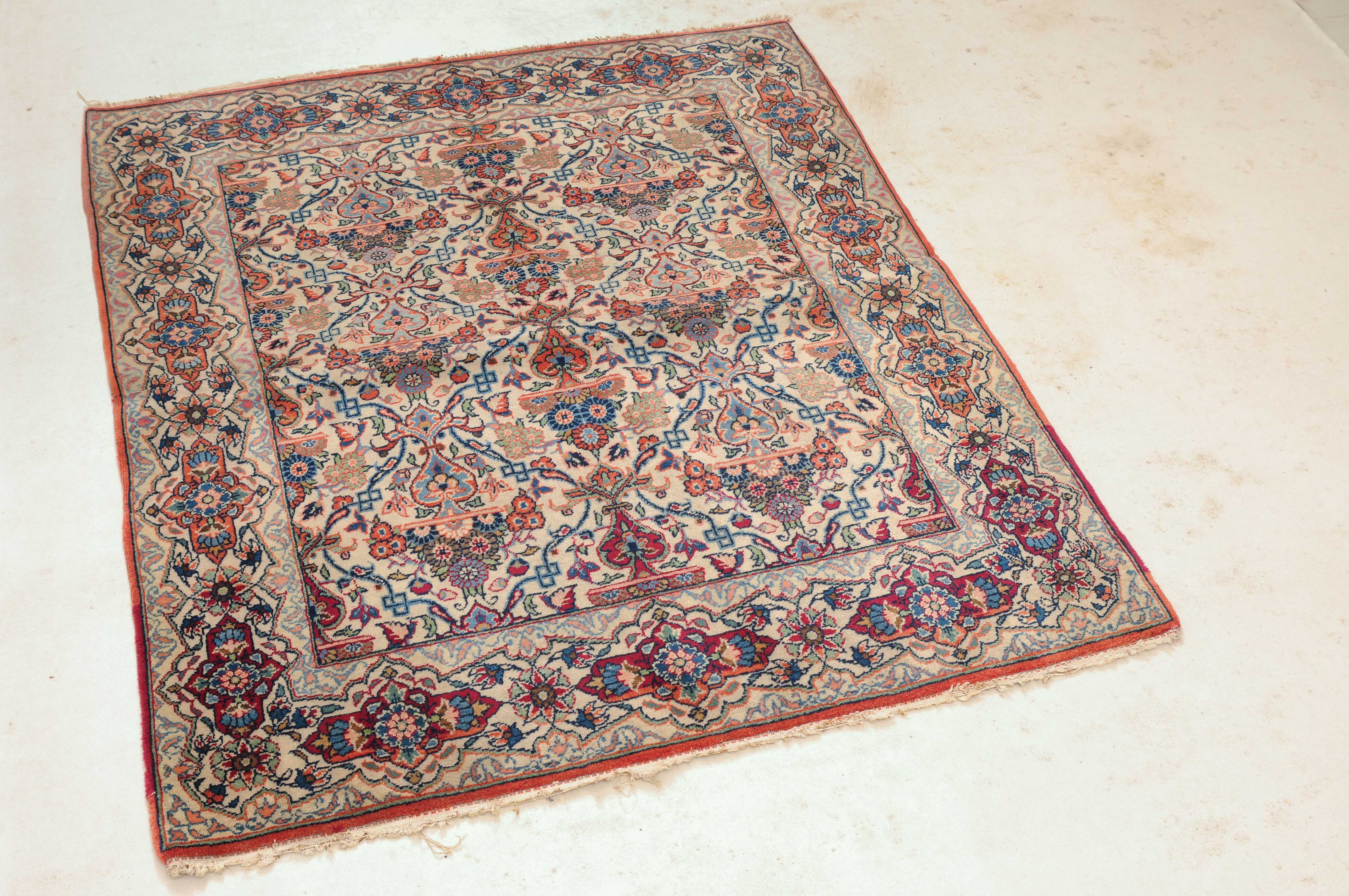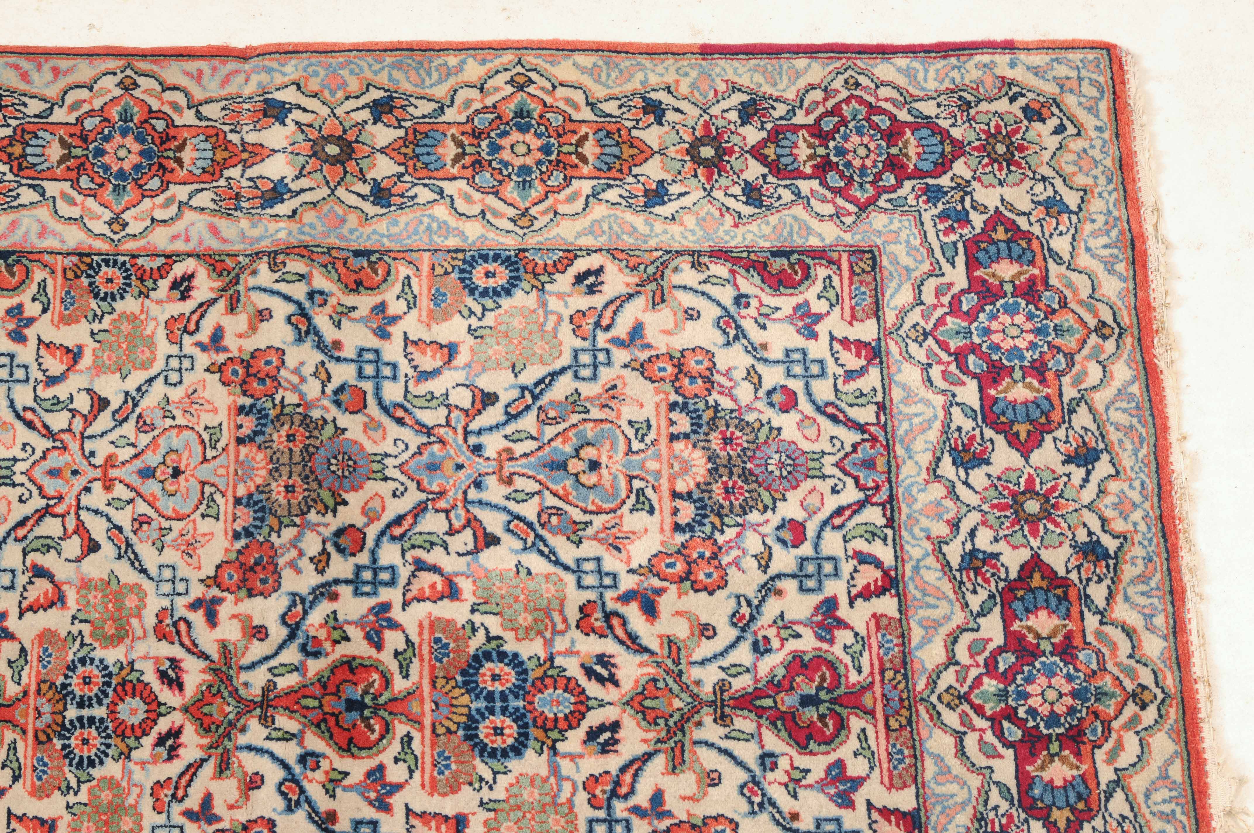 Z-Persien, um 1920. Auf weissem Grund figurieren in horizontalen Reihen angelegte, blumengefüllte Vasen in Rot und Blau, dicht flankiert von einem feingliedrigen Ranken- und Blütenwerk. Die dekorative helle Hauptbordüre ist alternierend mit roten Kartuschen und Sternblüten gefüllt. In der Mitte geschnitten und wieder zusammen genäht. Gute Erhaltung. 104x125 cm (ft. 3.4x4.1).