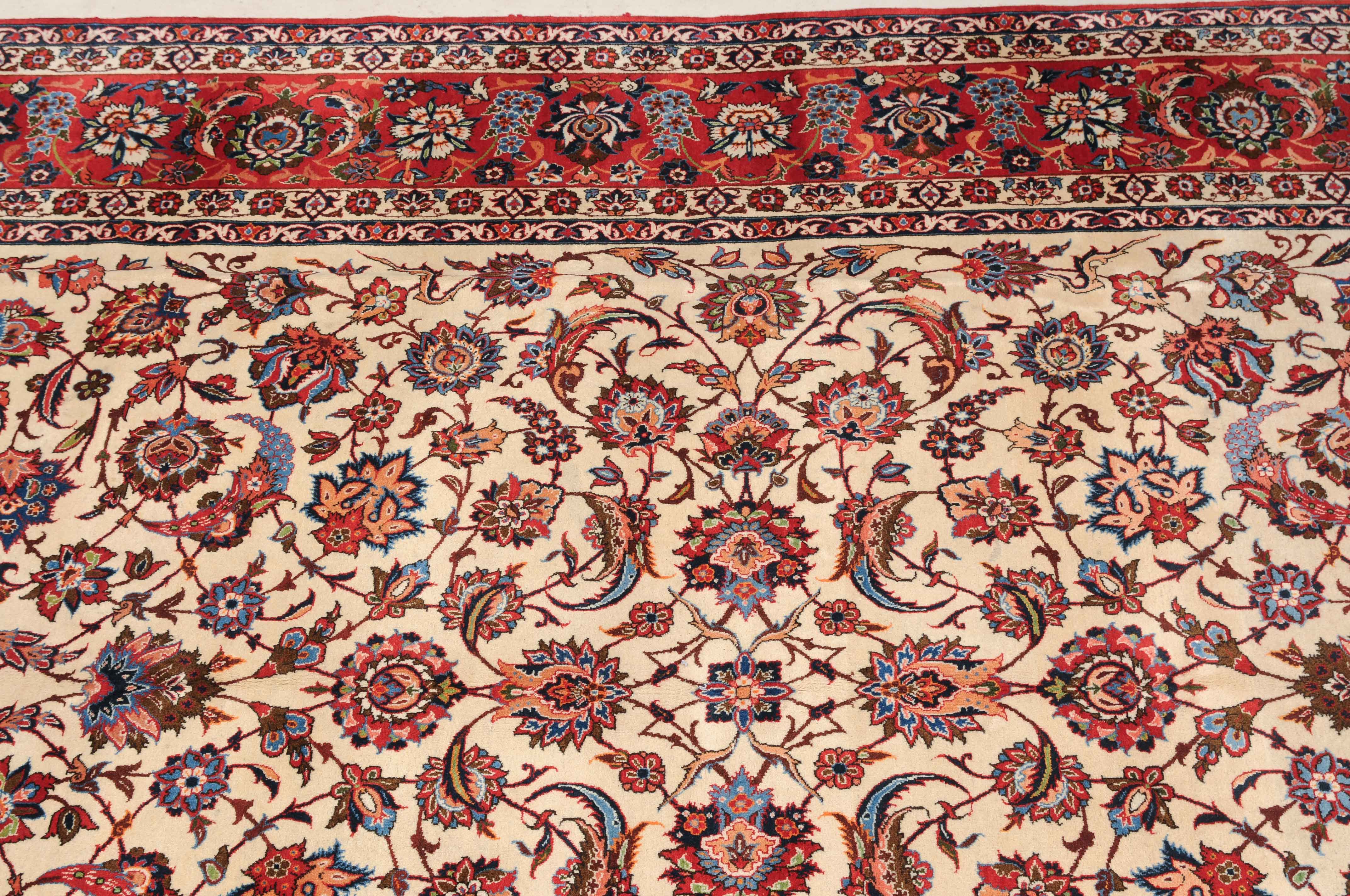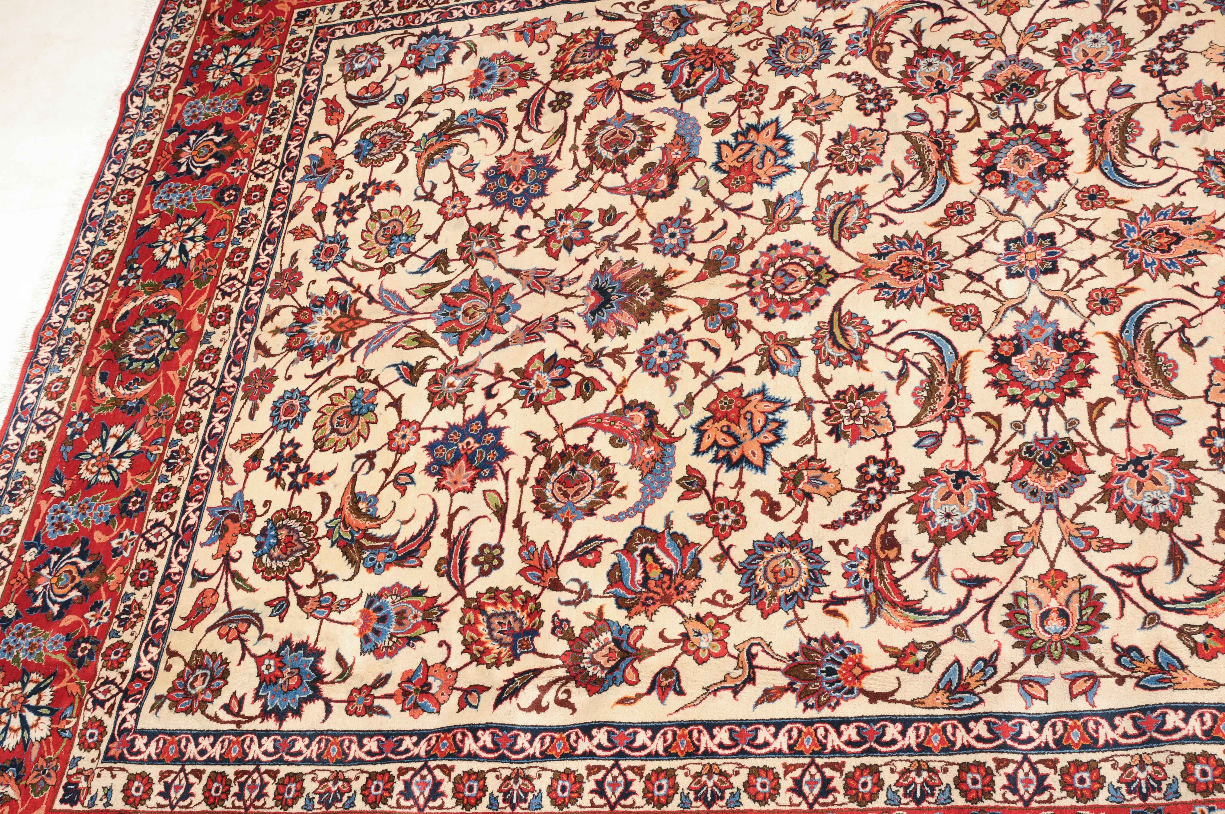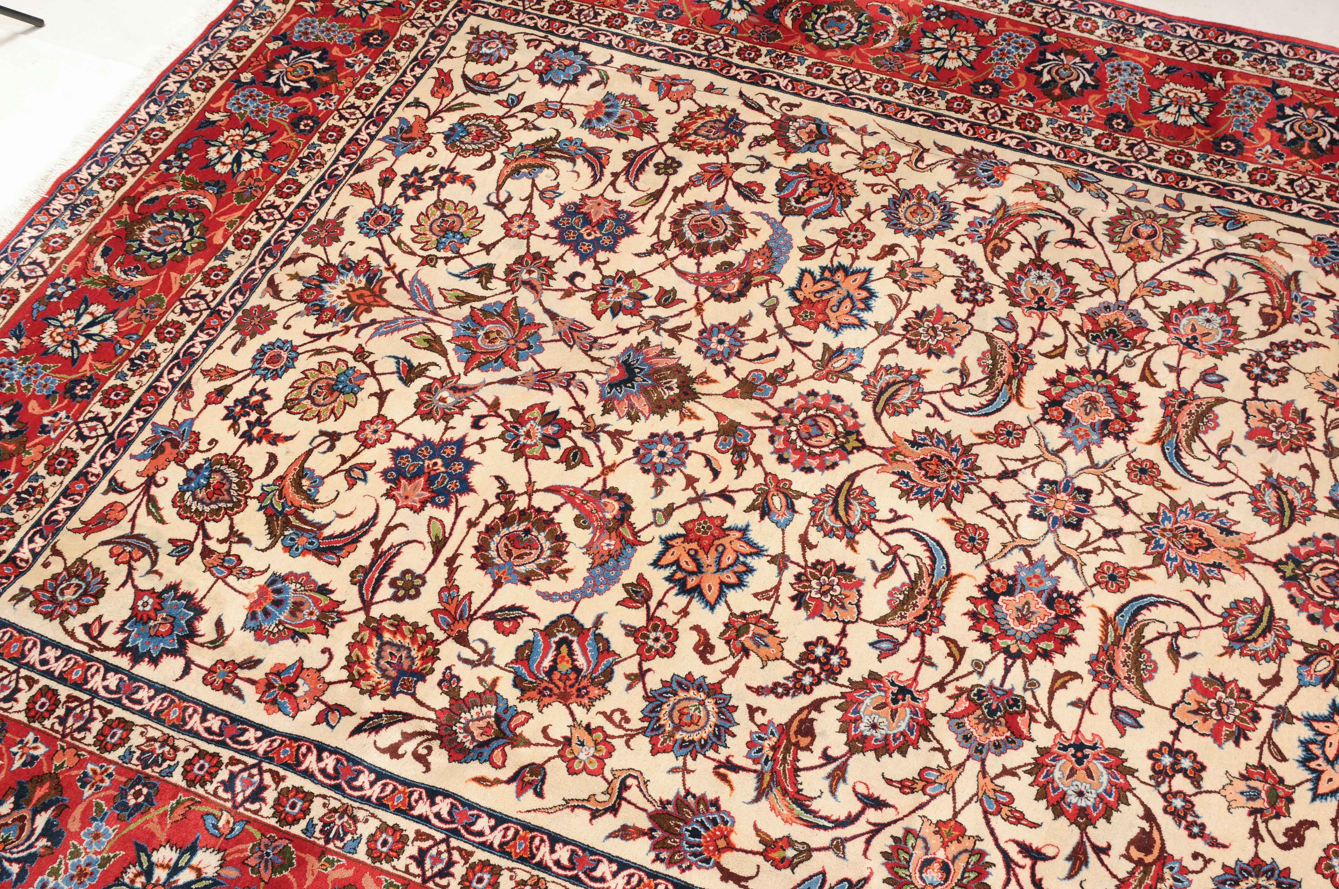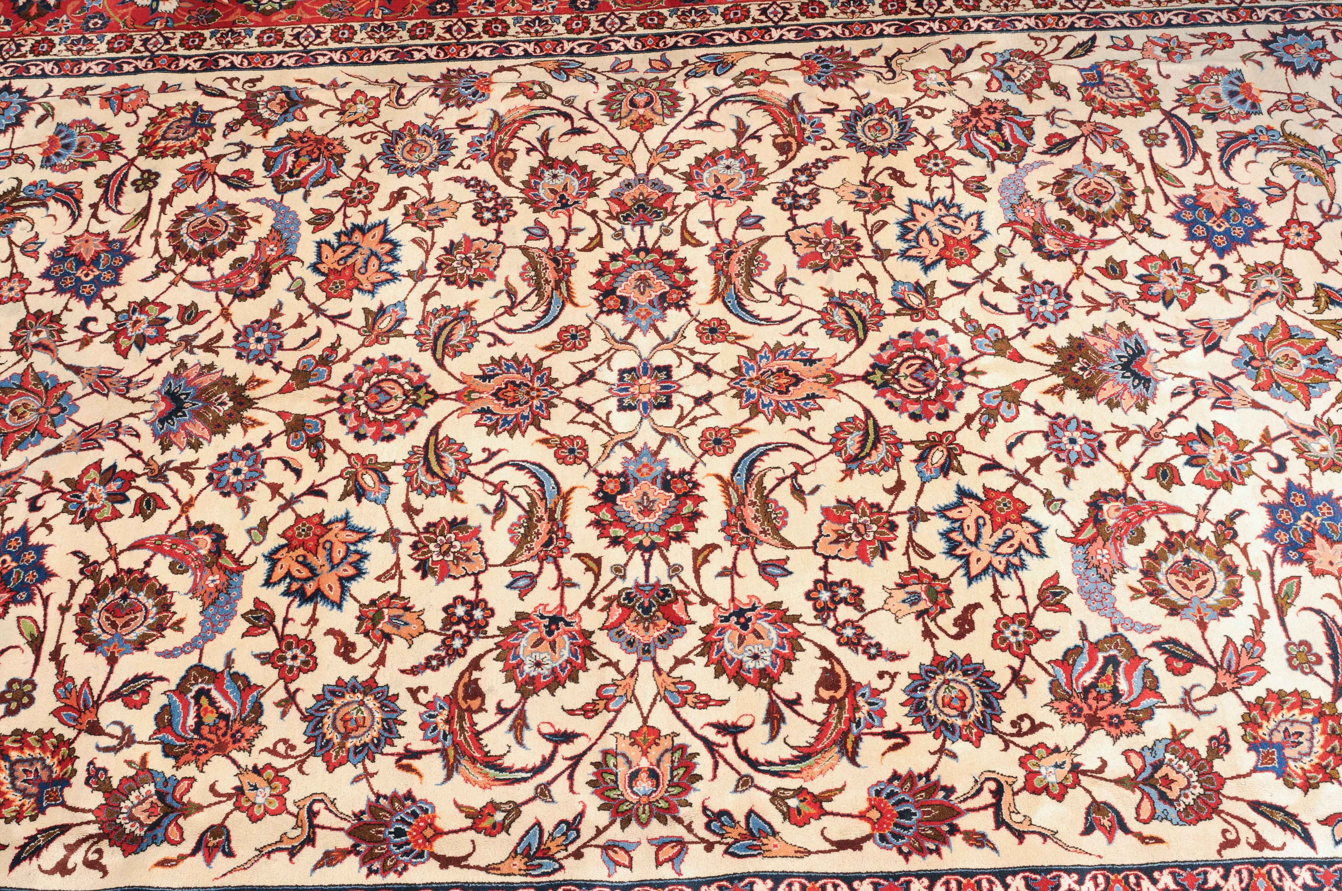 Z-Persien, um 1940. Dichtes florales Werk. Das beige Innenfeld ist durchgehend mit dekorativen Blüten, Blattranken und Zweigen in verschiedensten Variationen gefüllt. Die mit dem gleichen Dekor belegte rote Bordüre wird von 4 filigran gezeichneten Blütenbandborten gesäumt. Gute Erhaltung. 302x416 cm (ft. 10x13.7).