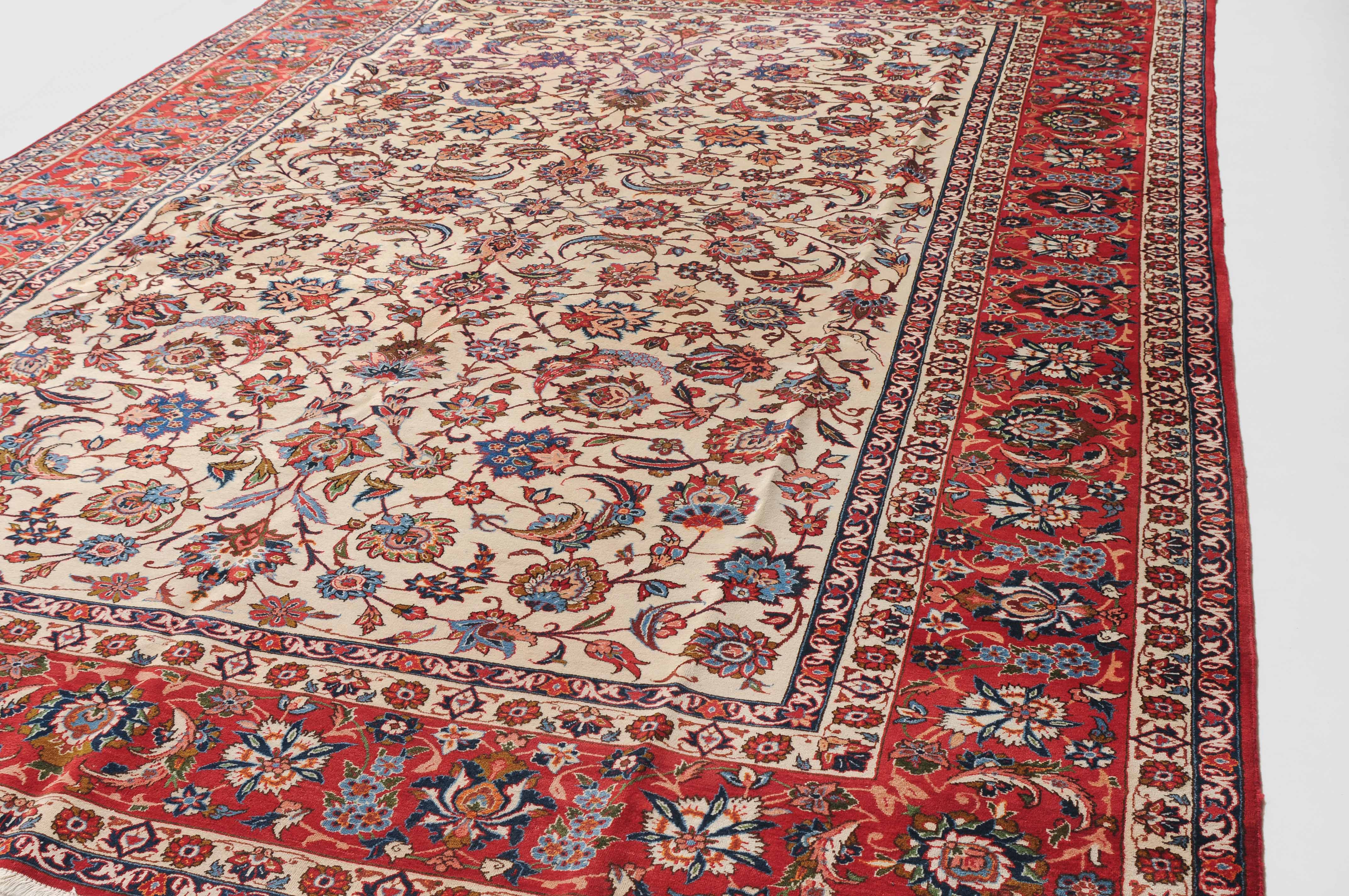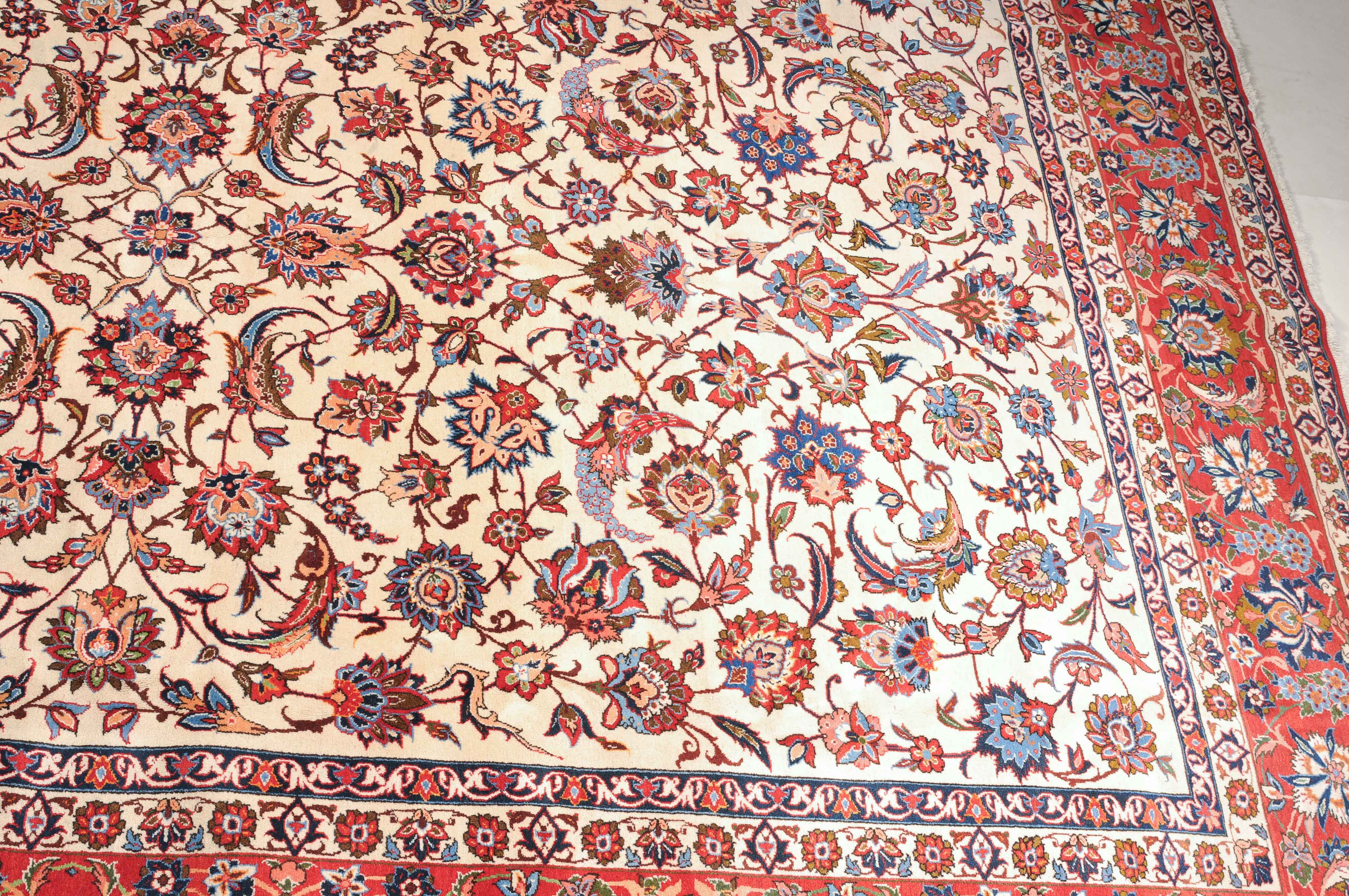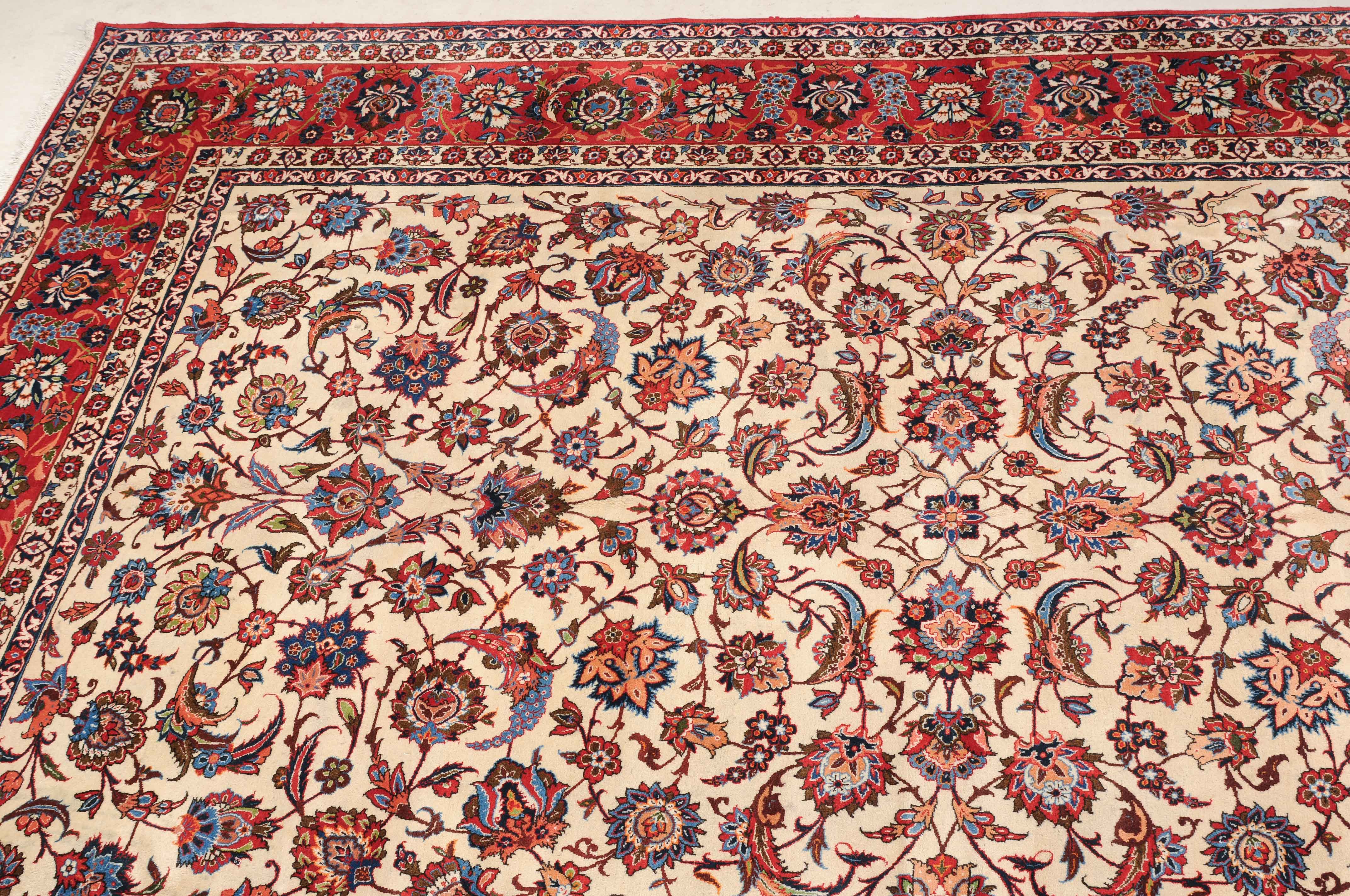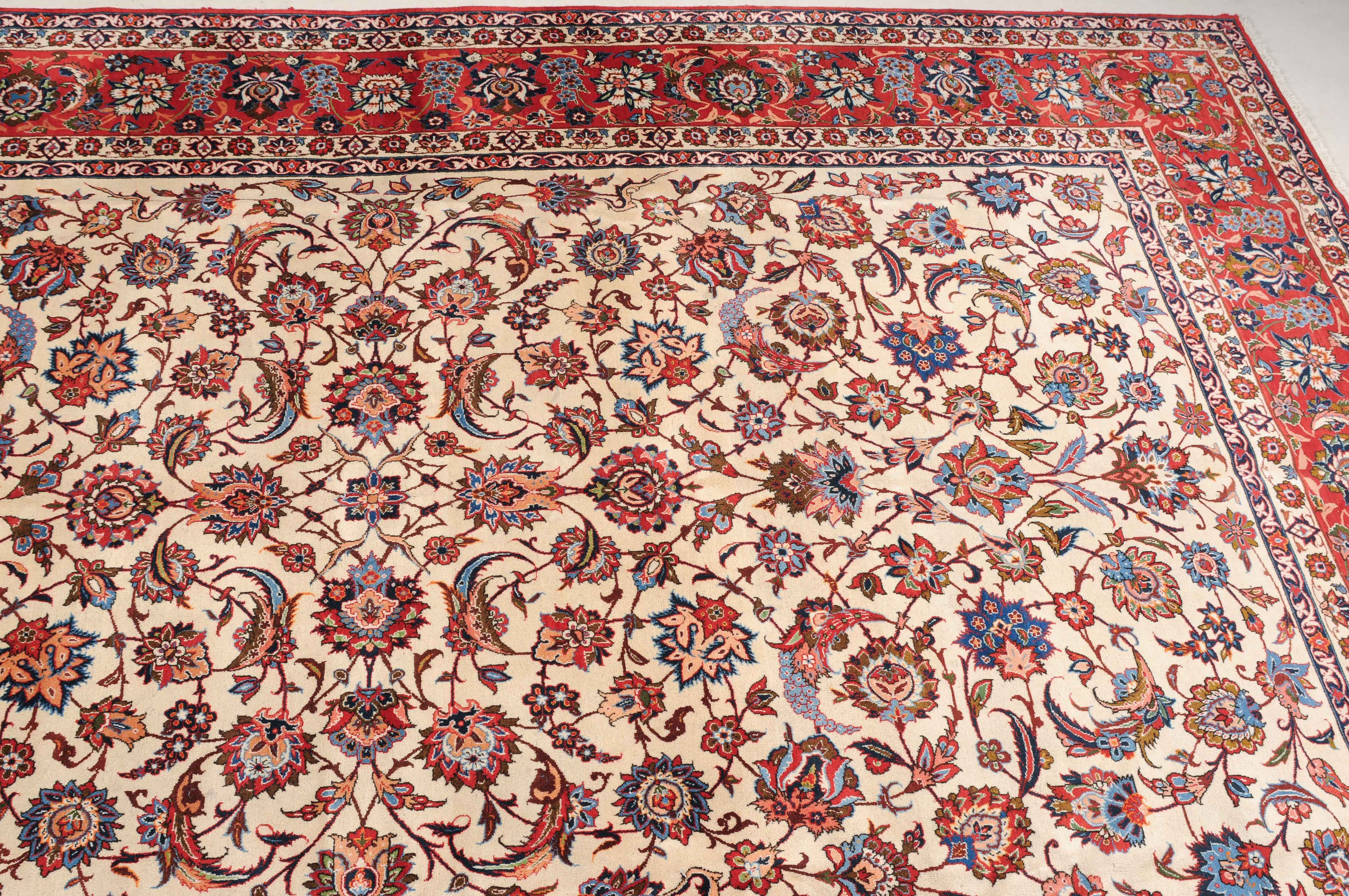 Z-Persien, um 1940. Dichtes florales Werk. Das beige Innenfeld ist durchgehend mit dekorativen Blüten, Blattranken und Zweigen in verschiedensten Variationen gefüllt. Die mit dem gleichen Dekor belegte rote Bordüre wird von 4 filigran gezeichneten Blütenbandborten gesäumt. Gute Erhaltung. 302x416 cm (ft. 10x13.7).