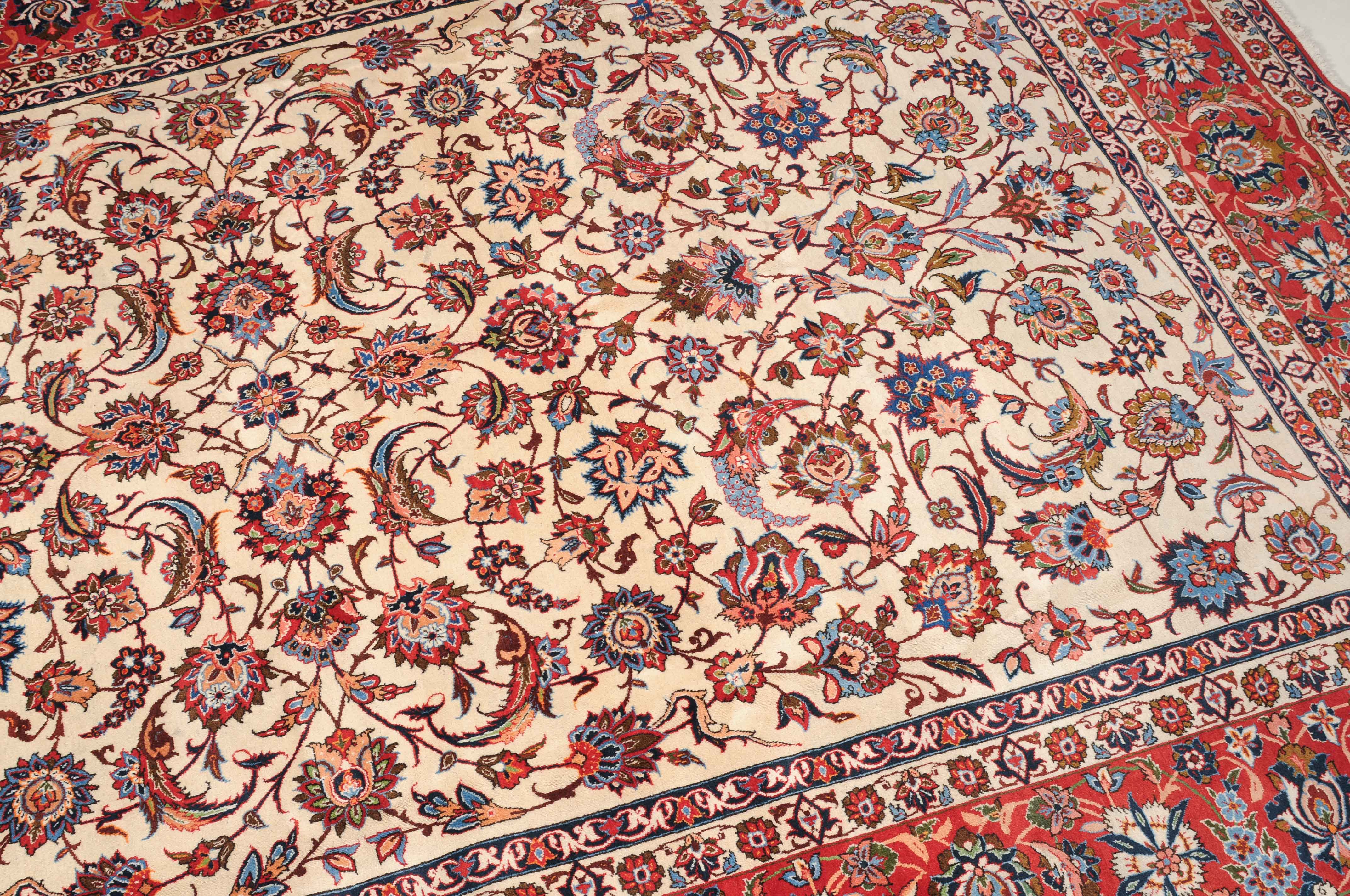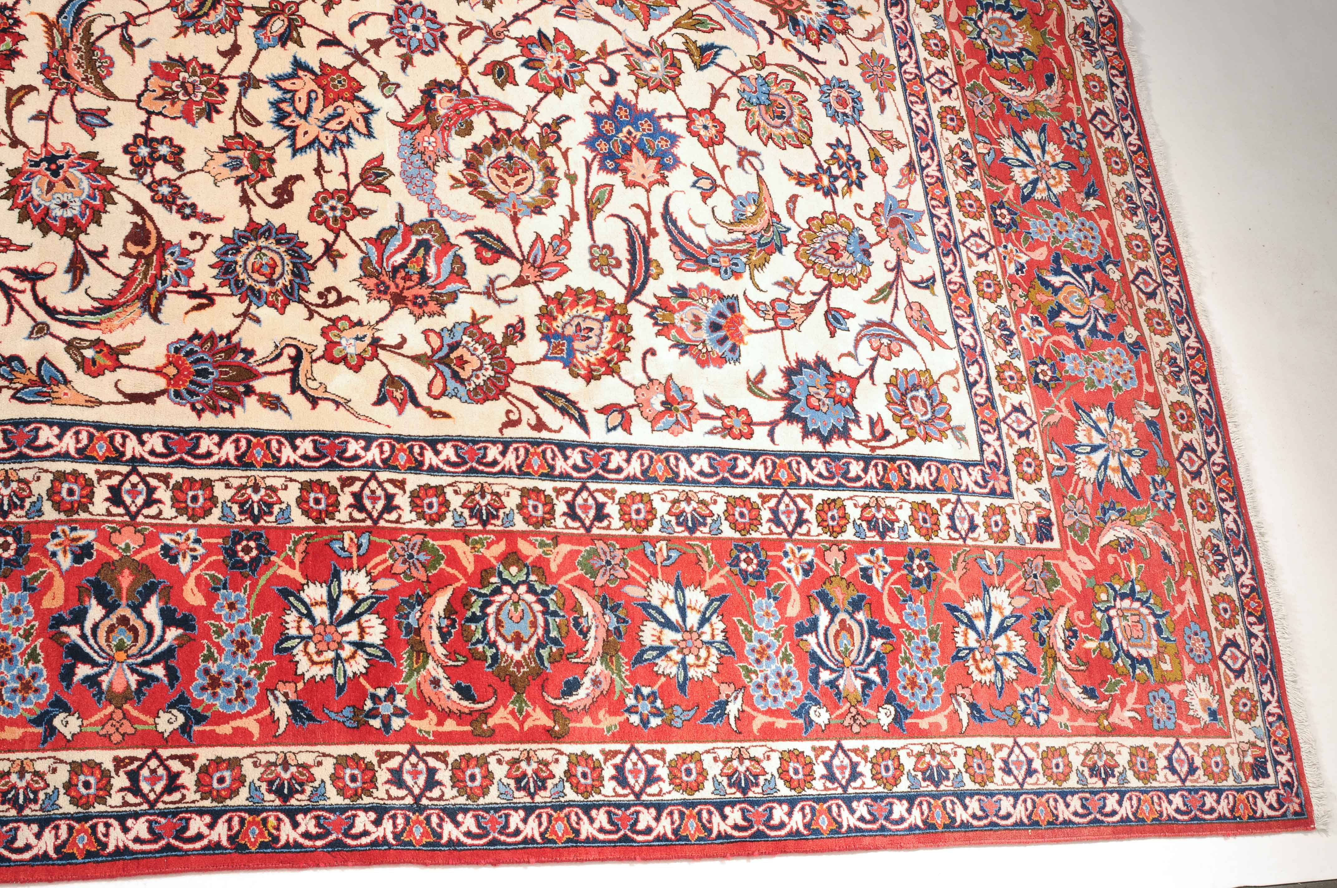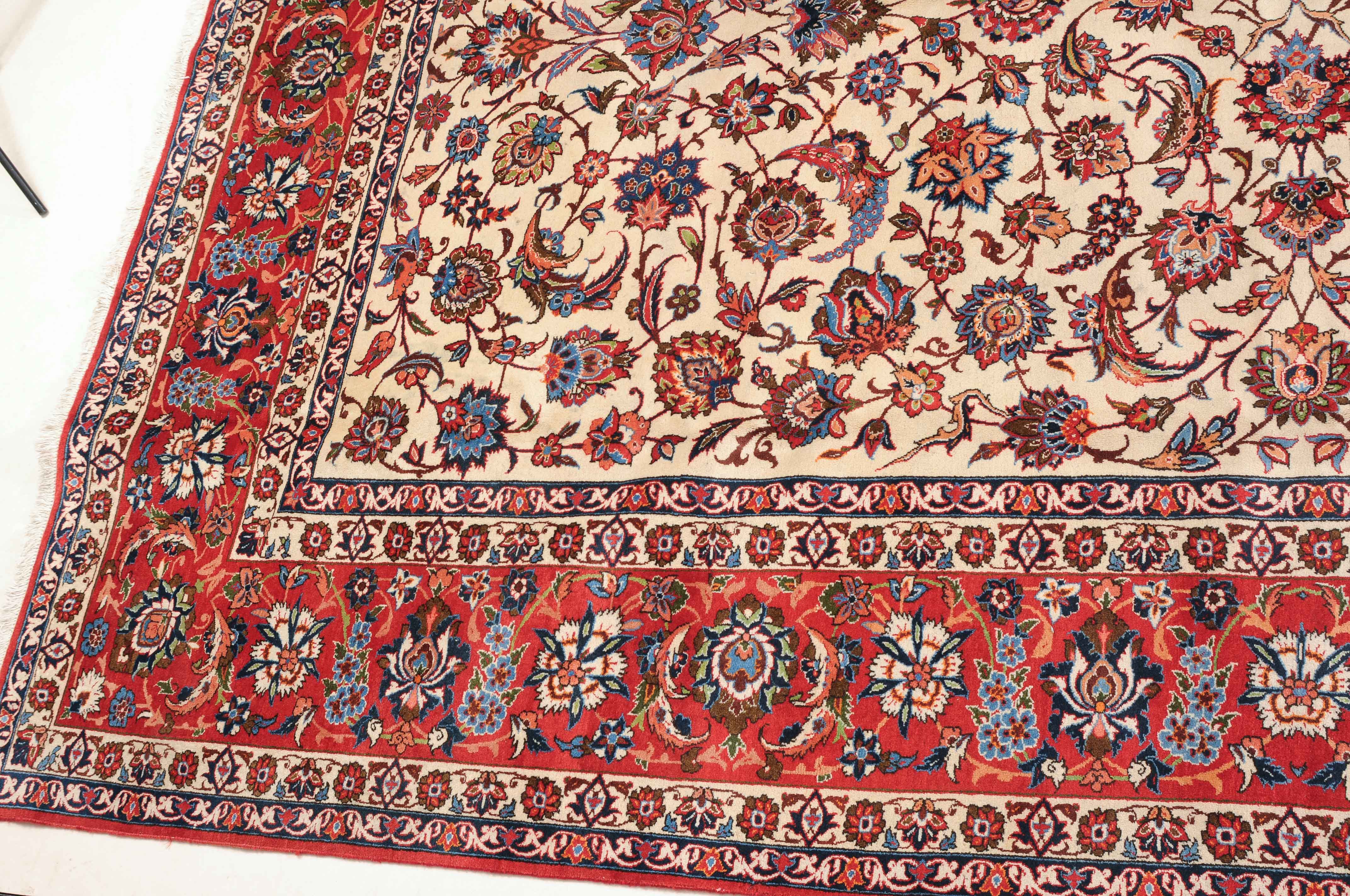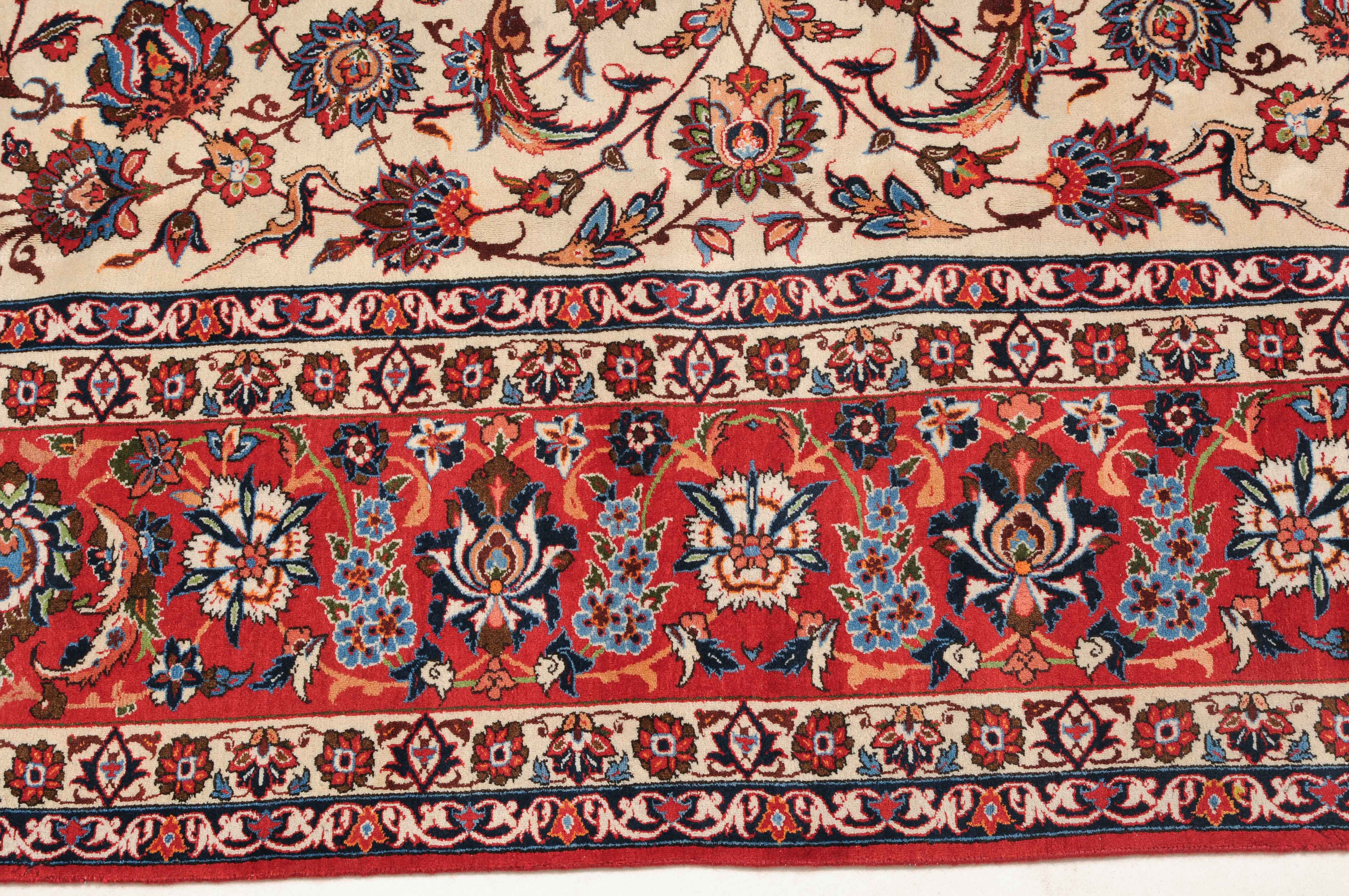 Z-Persien, um 1940. Dichtes florales Werk. Das beige Innenfeld ist durchgehend mit dekorativen Blüten, Blattranken und Zweigen in verschiedensten Variationen gefüllt. Die mit dem gleichen Dekor belegte rote Bordüre wird von 4 filigran gezeichneten Blütenbandborten gesäumt. Gute Erhaltung. 302x416 cm (ft. 10x13.7).