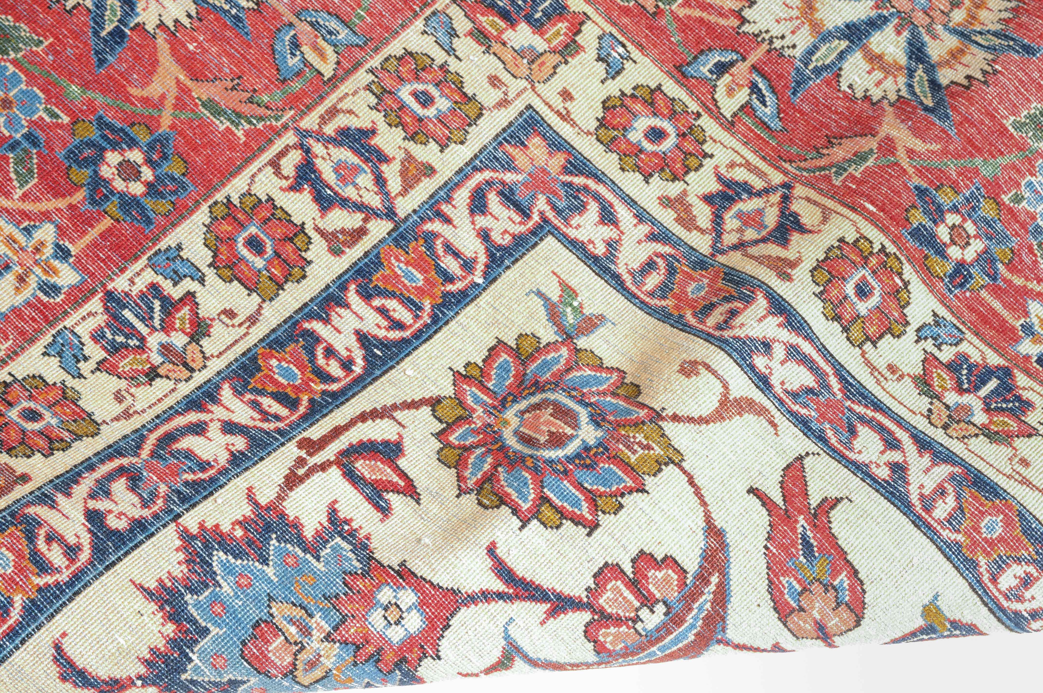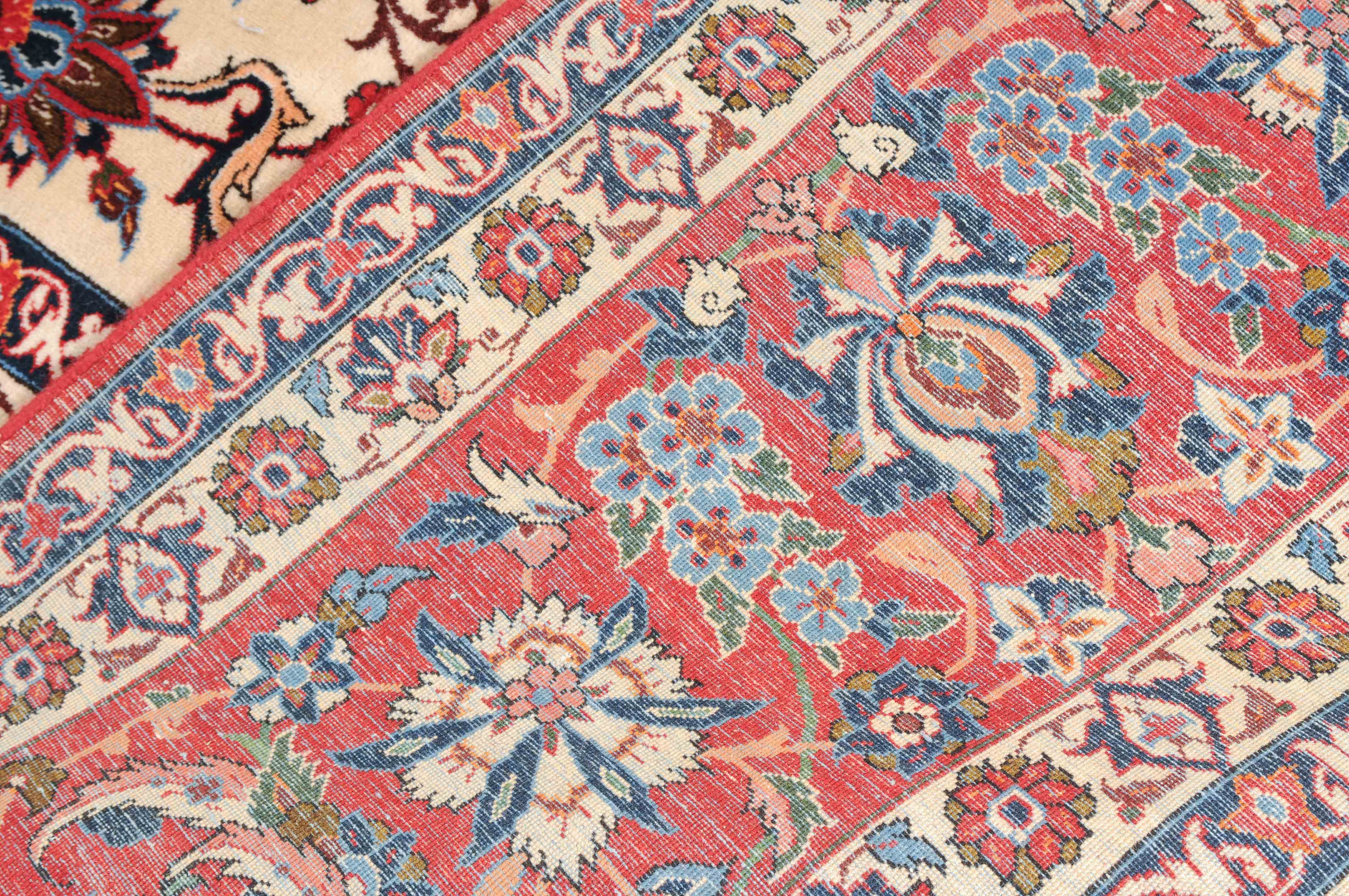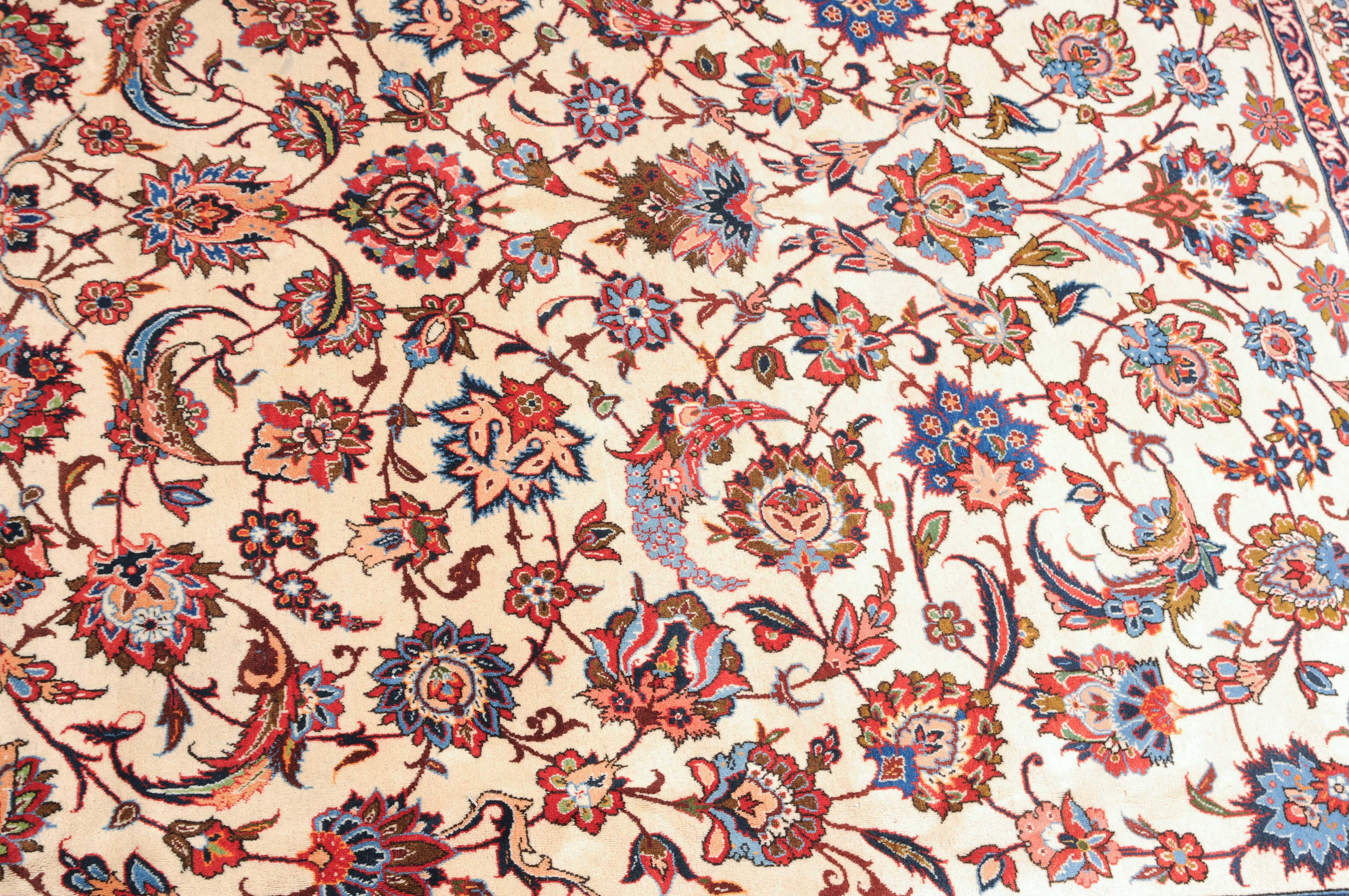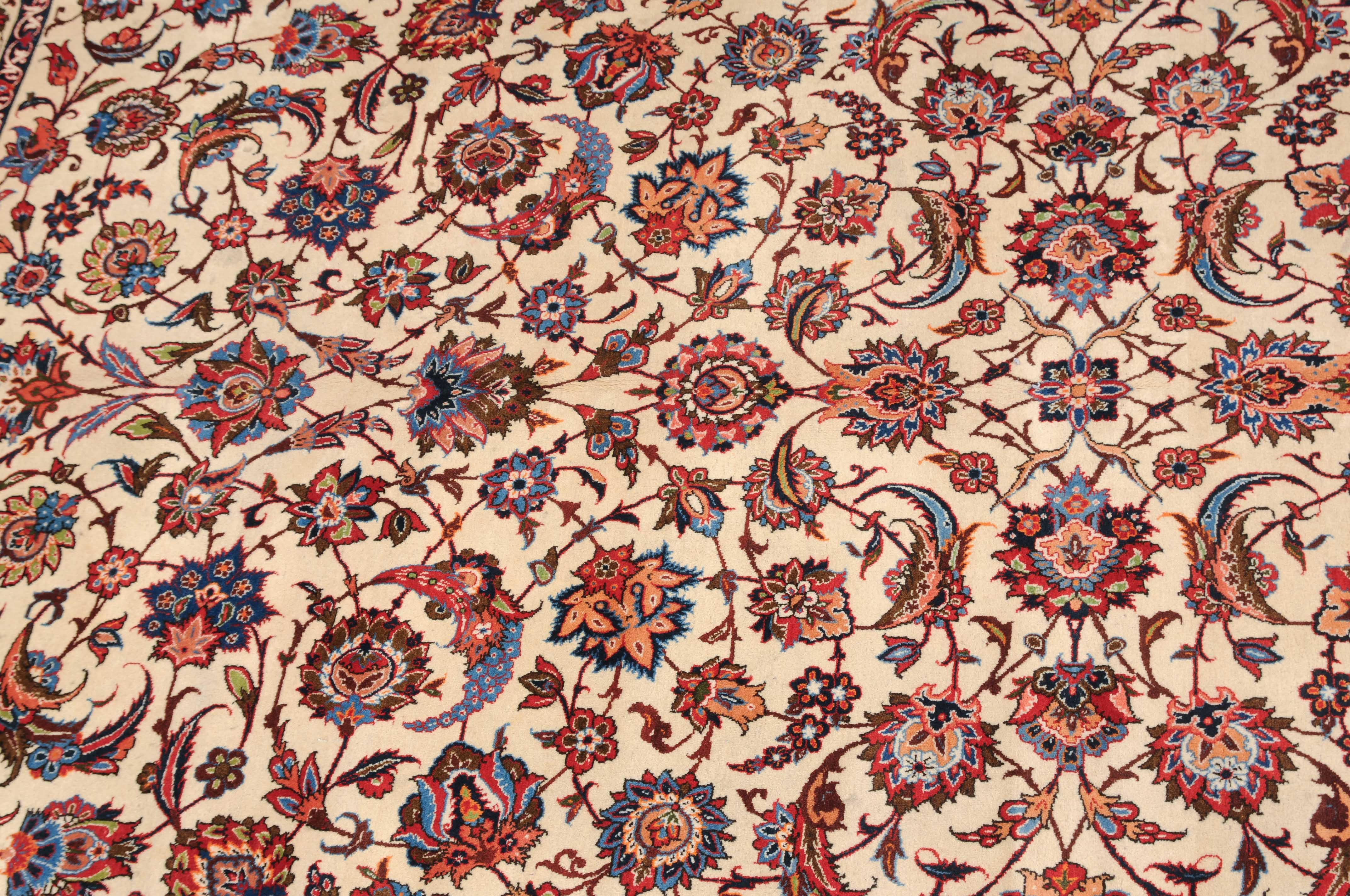 Z-Persien, um 1940. Dichtes florales Werk. Das beige Innenfeld ist durchgehend mit dekorativen Blüten, Blattranken und Zweigen in verschiedensten Variationen gefüllt. Die mit dem gleichen Dekor belegte rote Bordüre wird von 4 filigran gezeichneten Blütenbandborten gesäumt. Gute Erhaltung. 302x416 cm (ft. 10x13.7).