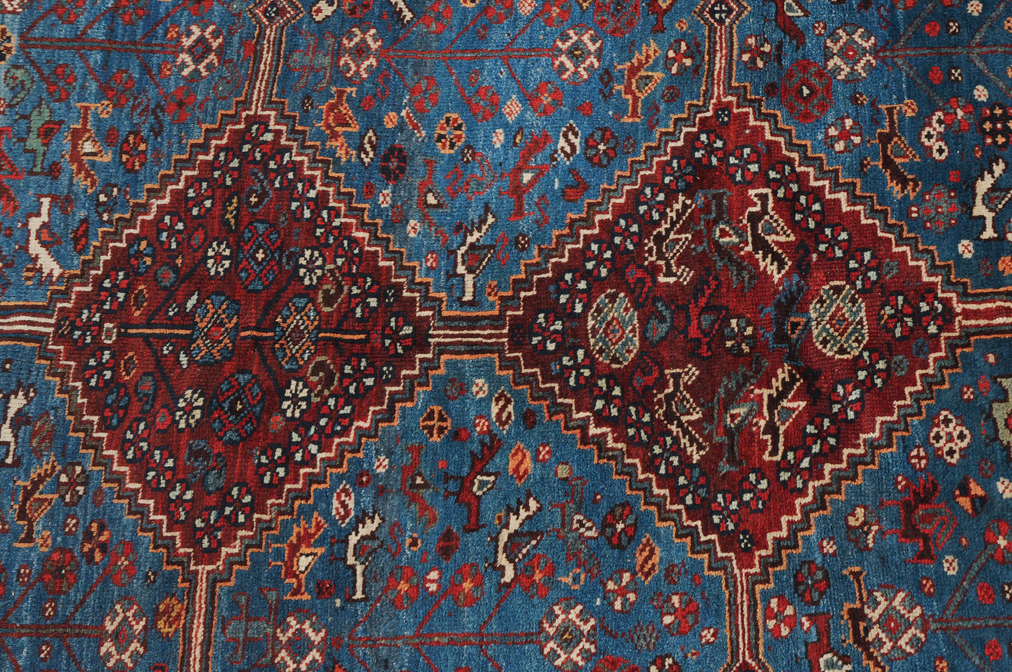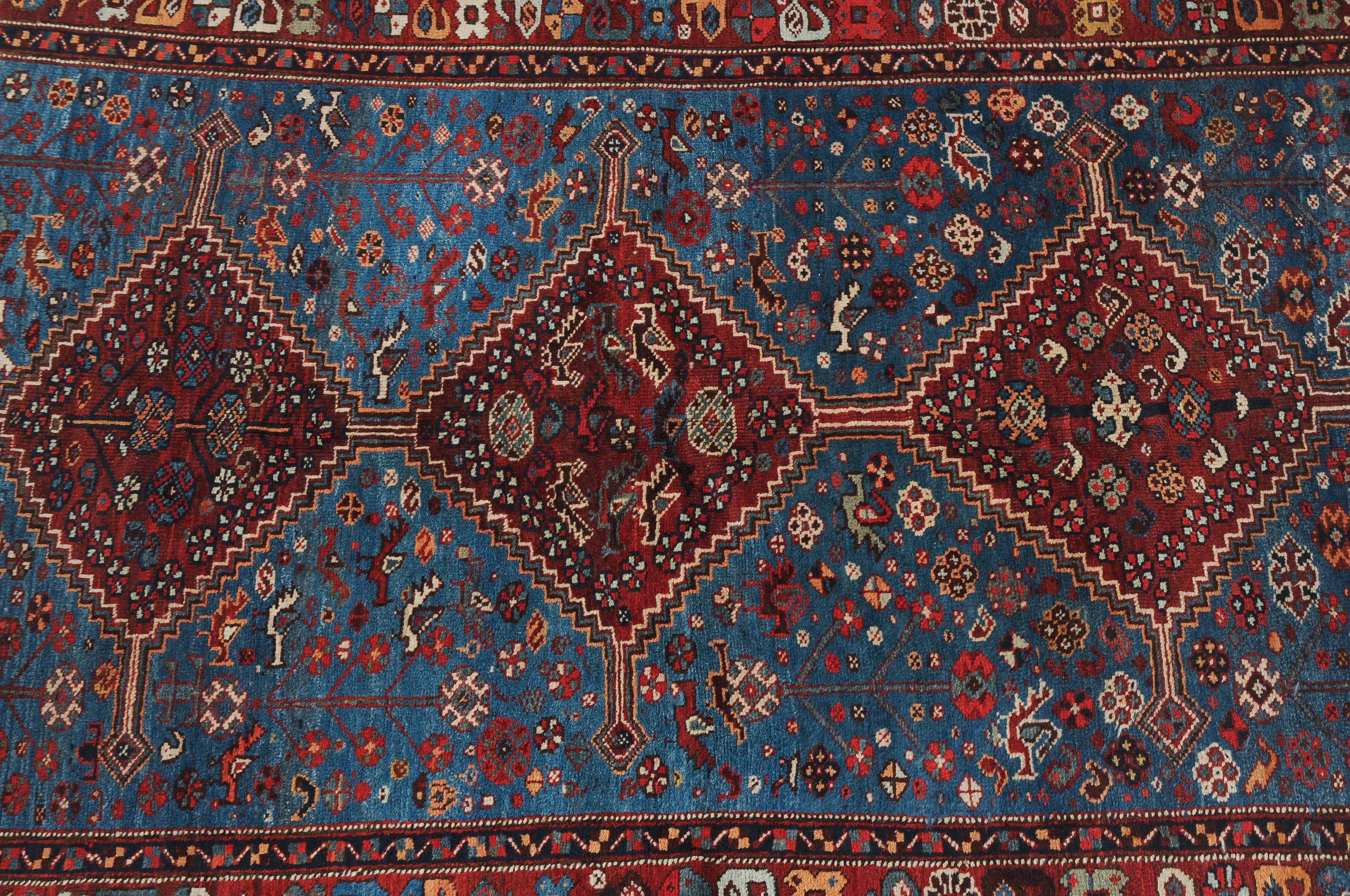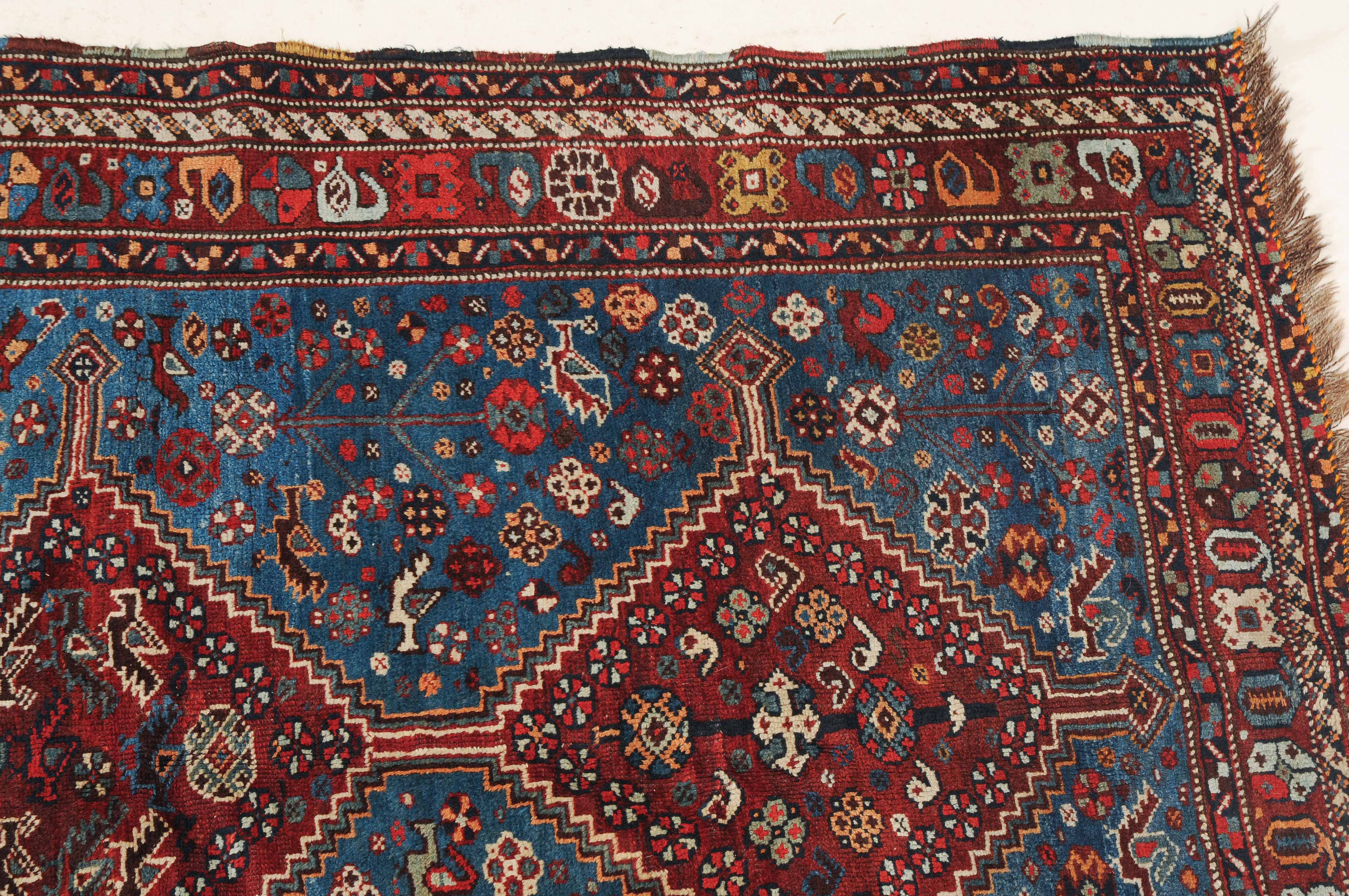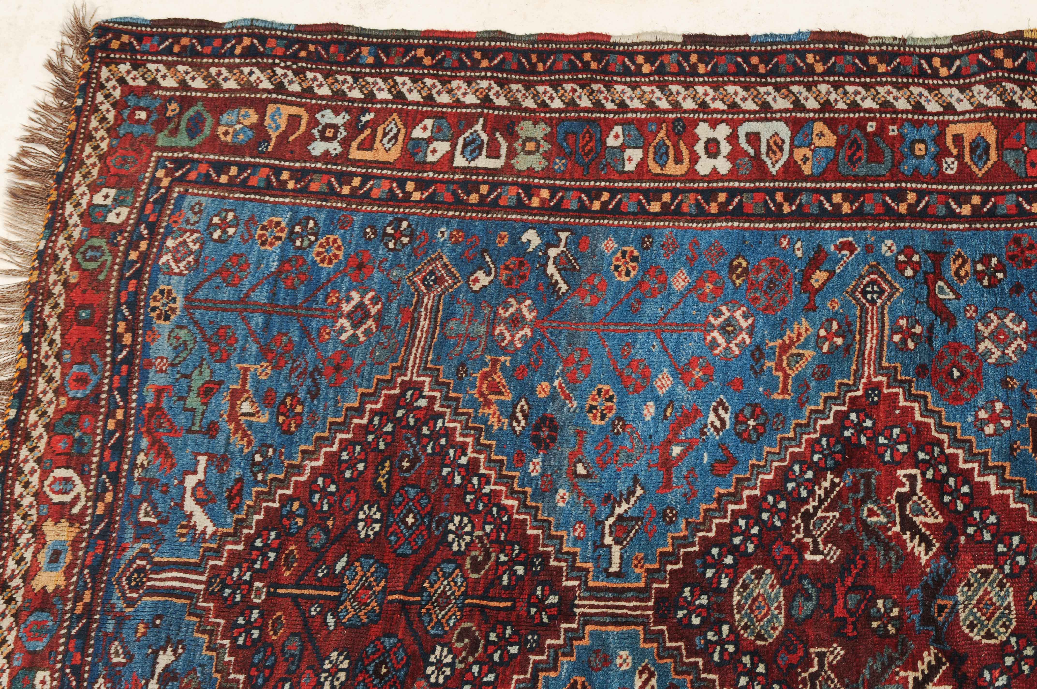S-Persien, um 1900. Im mittelblauen Innenfeld figurieren 3 miteinander verbundene, getreppte rote Rautenmedaillons, die im Inneren dekorativ geschmückt sind, flankiert von stilisierten Vögeln, Blütenmotiven und verschiedensten Ghashghai-Elementen. Filigrane, geometrisch gehaltene Nebenbordüren umfassen die rote Ghashghai-Hauptbordüre. Gute Erhaltung. 133x192 cm (ft. 4.4x6.3).