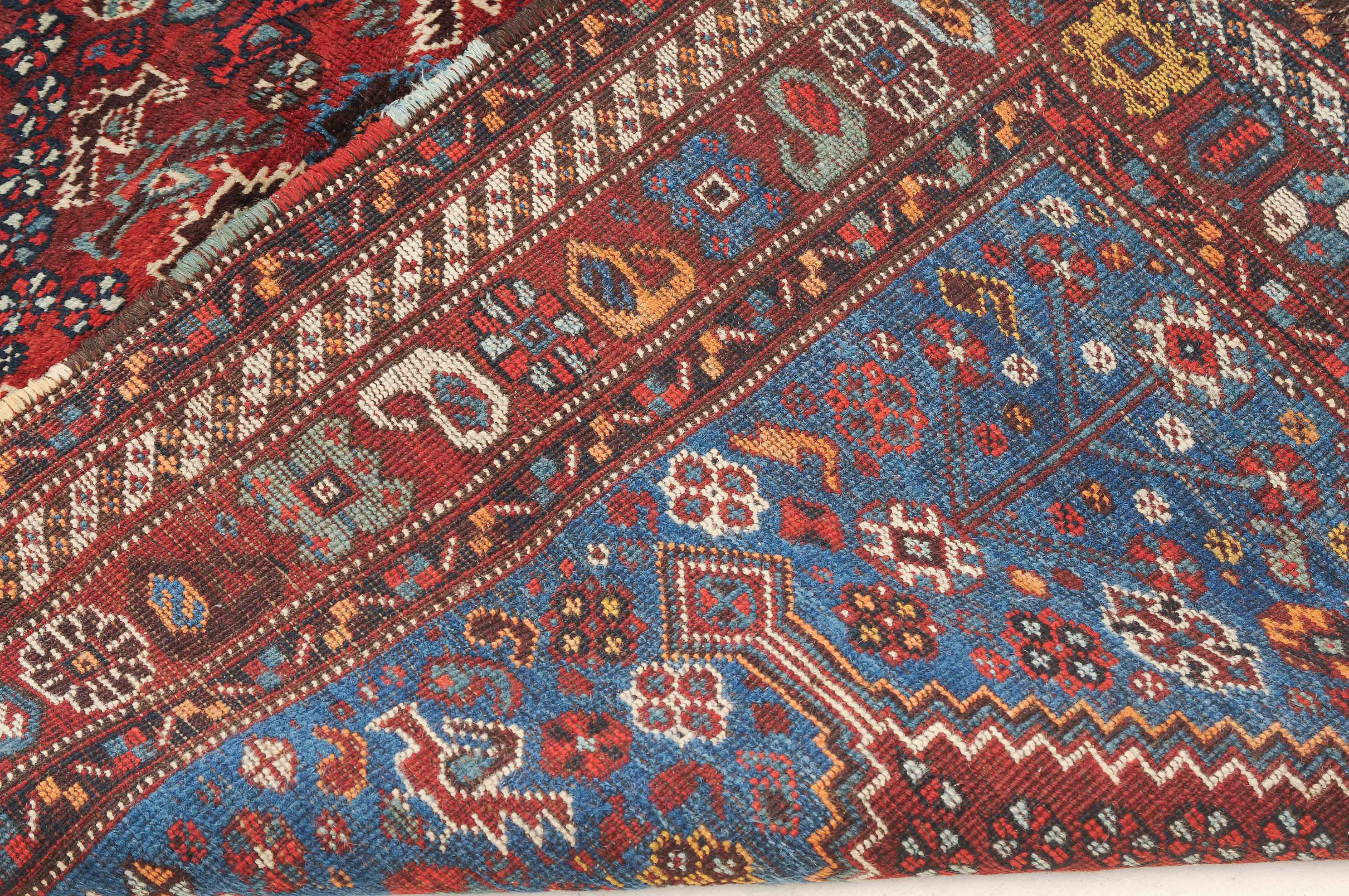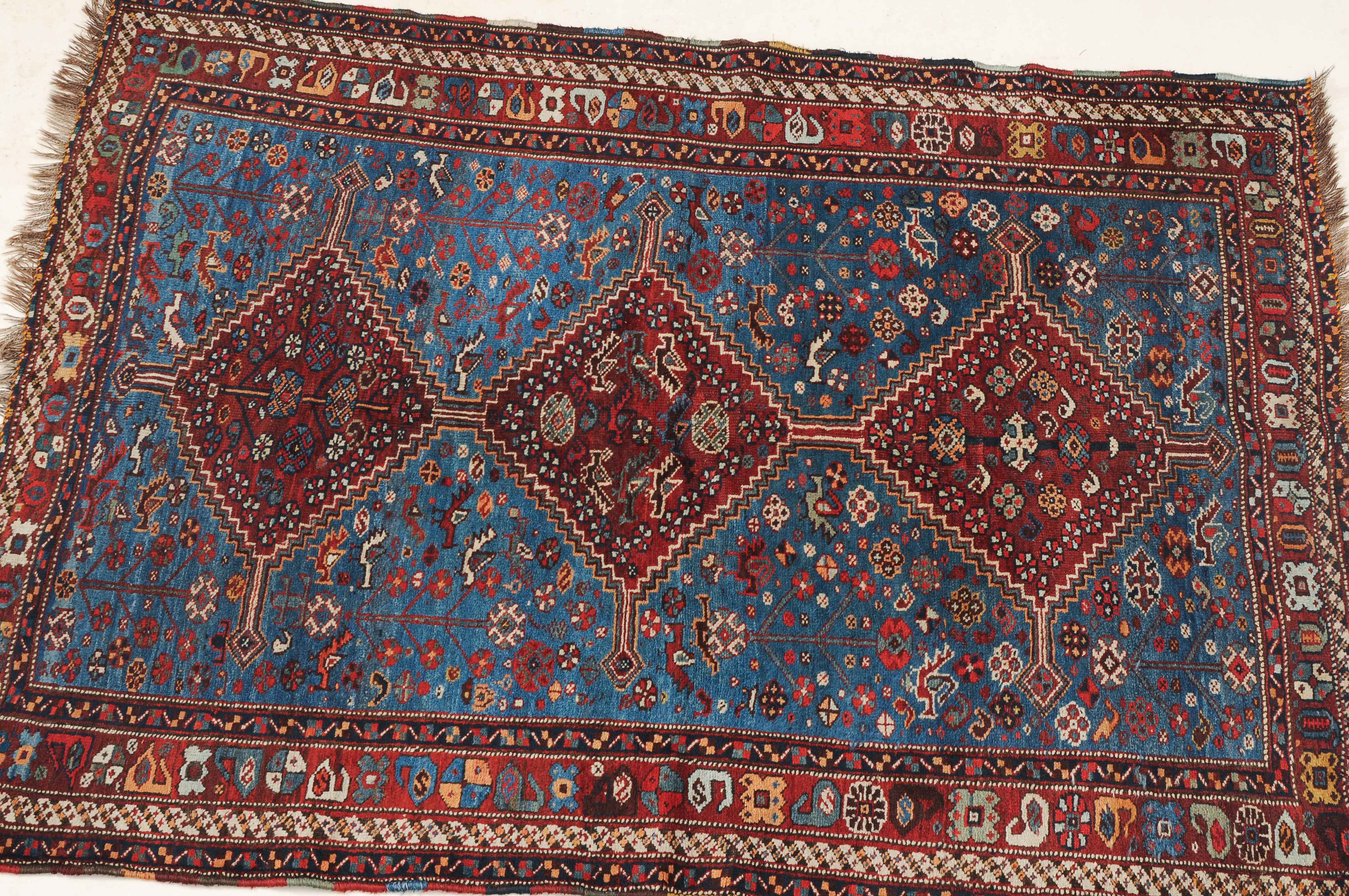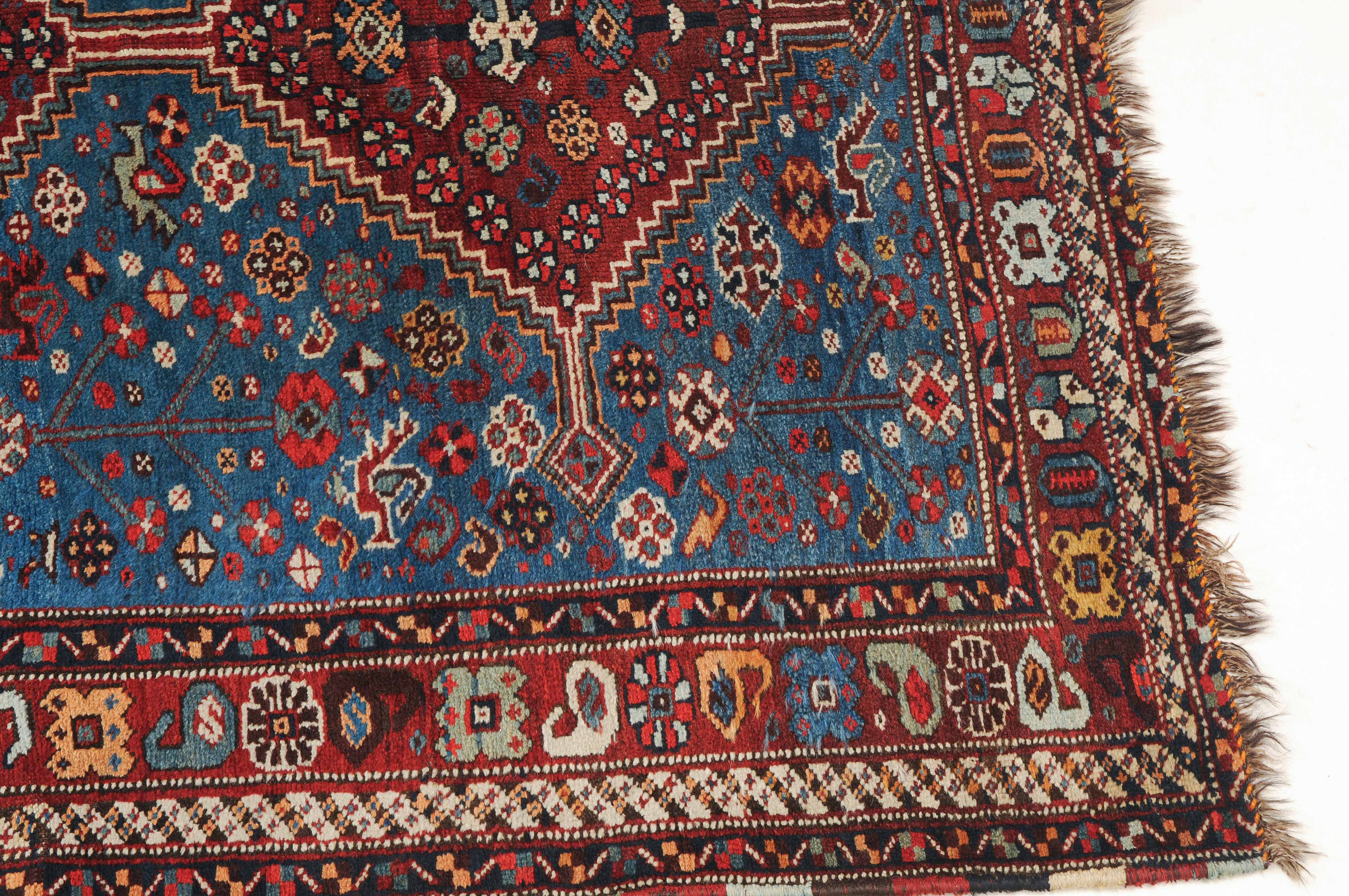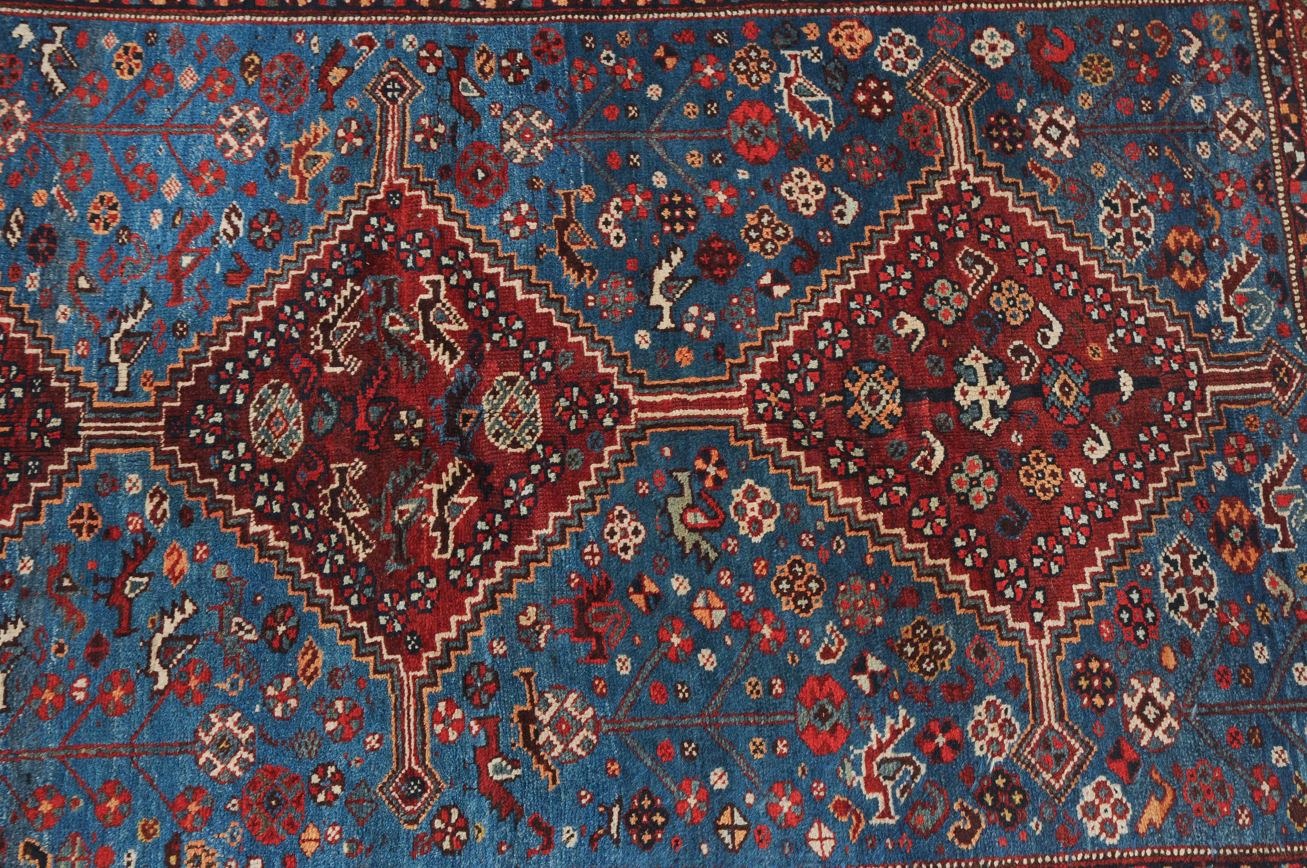 S-Persien, um 1900. Im mittelblauen Innenfeld figurieren 3 miteinander verbundene, getreppte rote Rautenmedaillons, die im Inneren dekorativ geschmückt sind, flankiert von stilisierten Vögeln, Blütenmotiven und verschiedensten Ghashghai-Elementen. Filigrane, geometrisch gehaltene Nebenbordüren umfassen die rote Ghashghai-Hauptbordüre. Gute Erhaltung. 133x192 cm (ft. 4.4x6.3).
