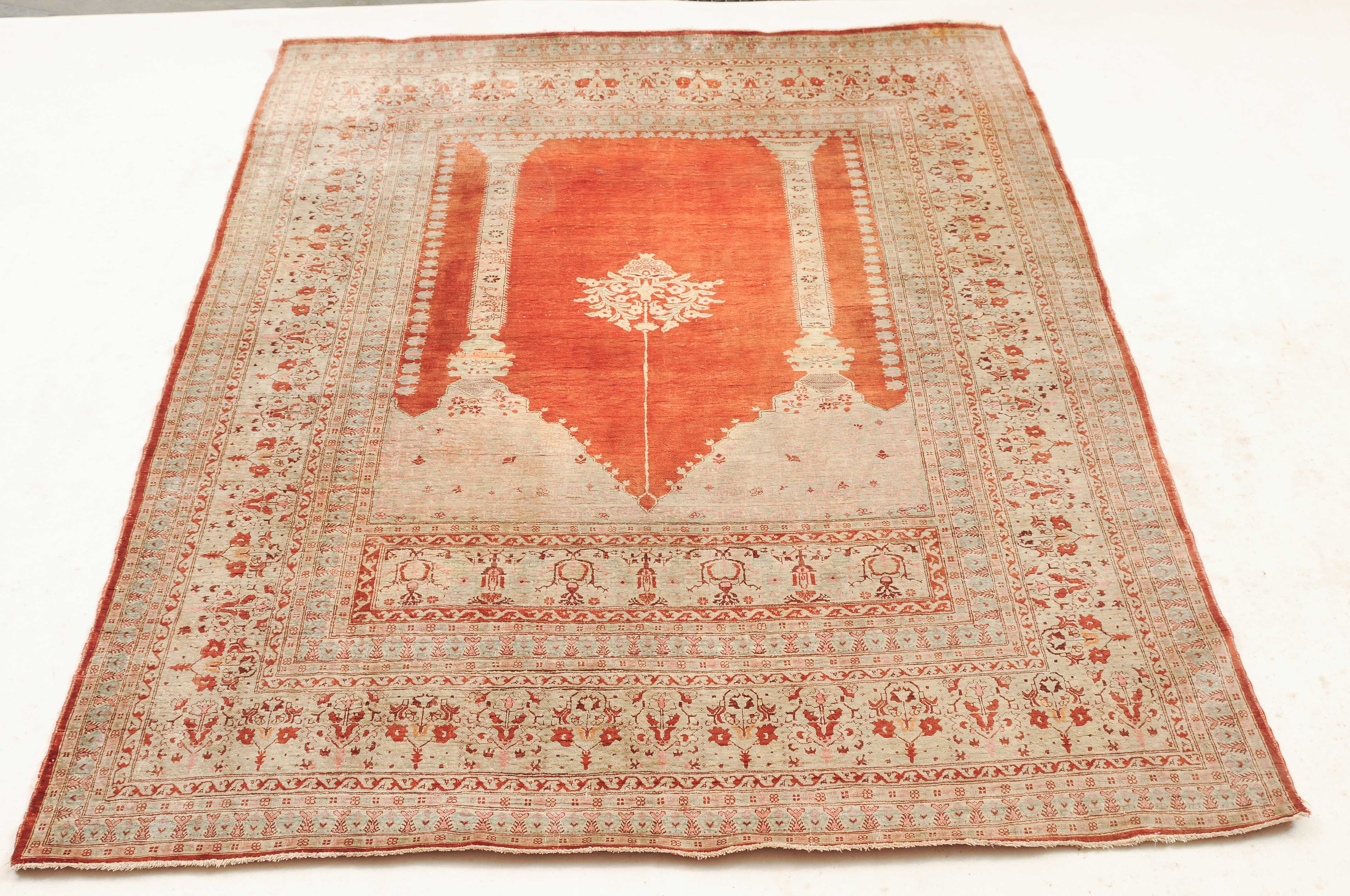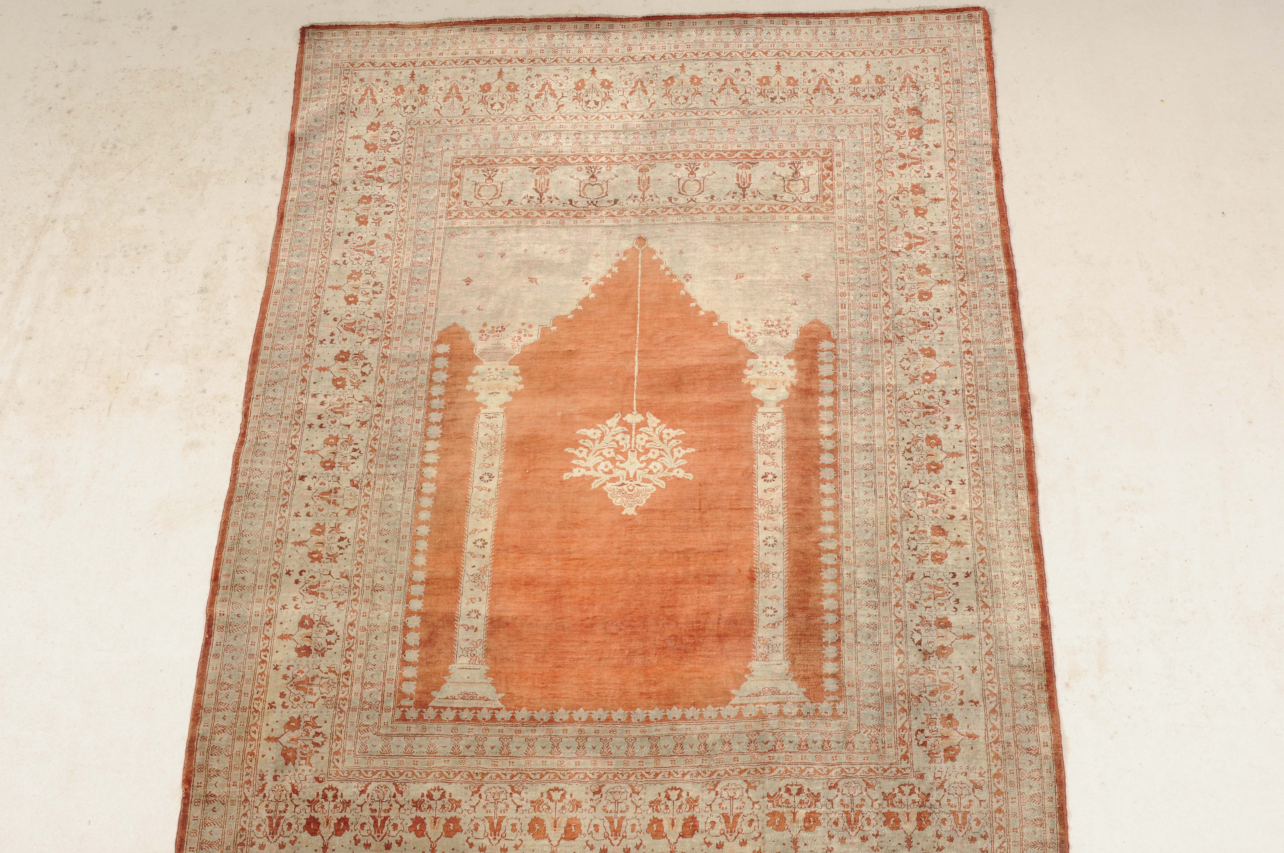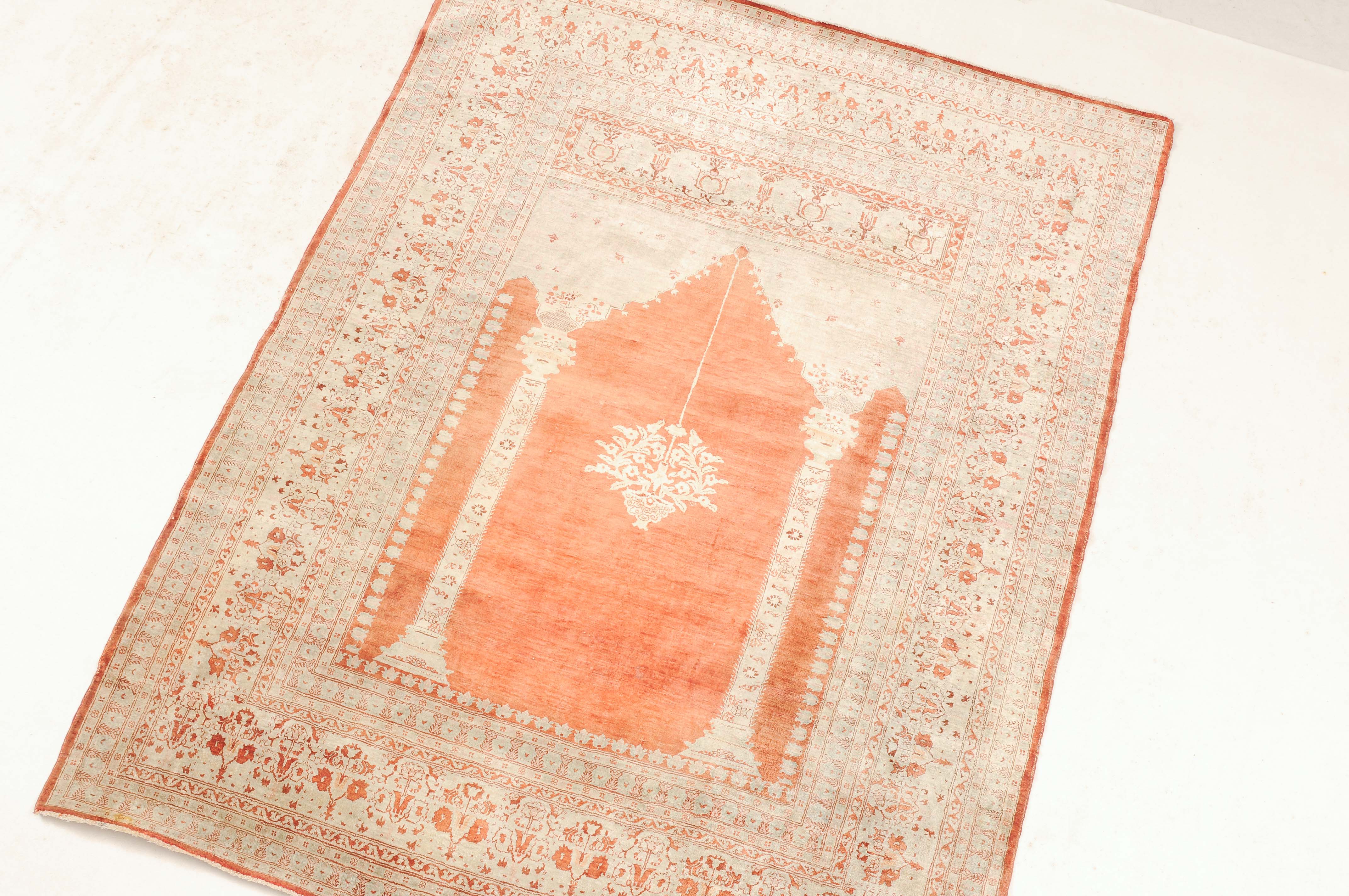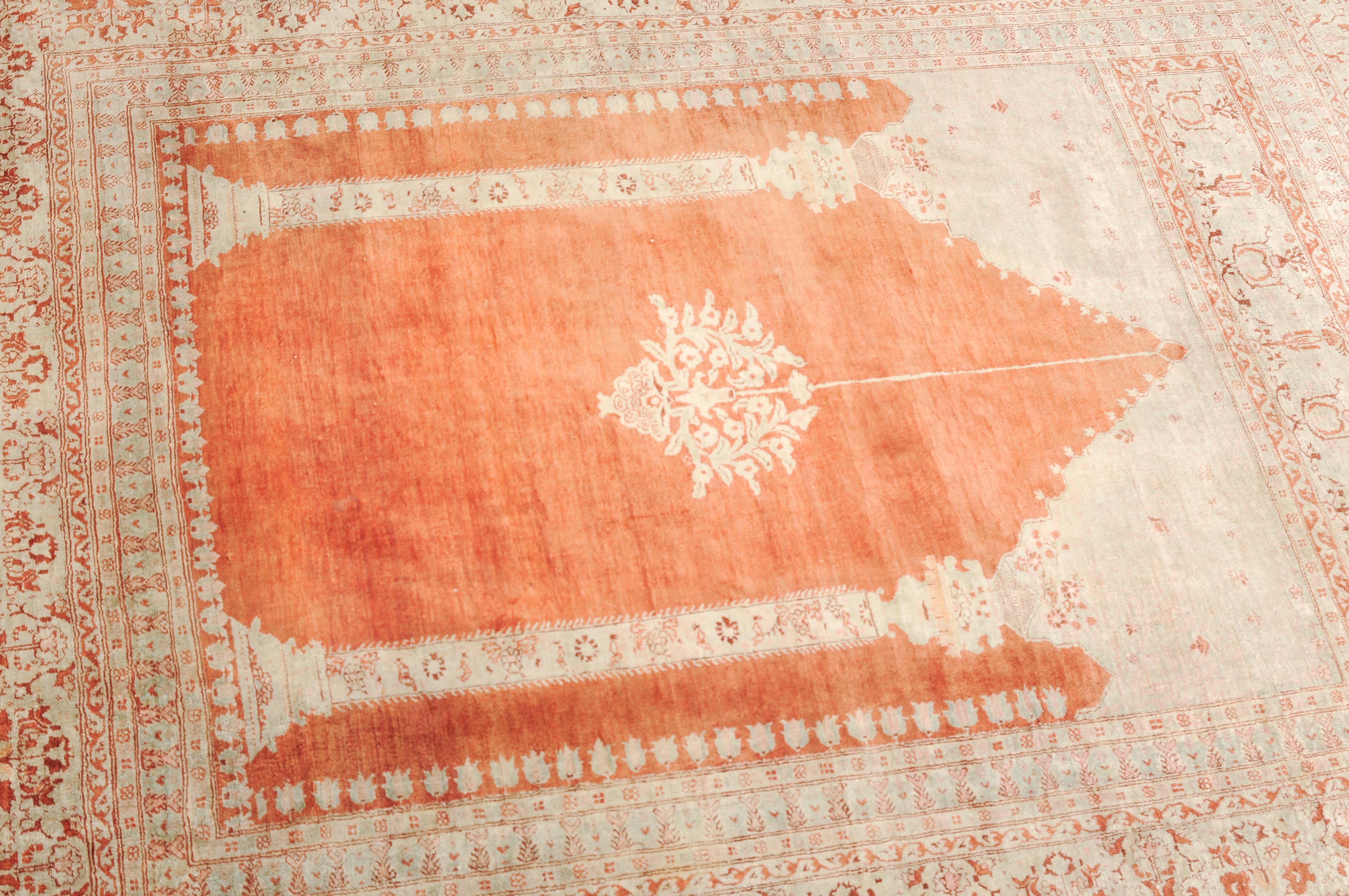 NW-Persien, um 1900. Flormaterial reine Seide. Auf einem leuchtenden rot-braunen Grund bilden 2 elegante helle Säulen eine Gebetsnische, von deren Giebel eine Ampel hinab ins Feld ragt. Mehrere filigrane, dekorativ geschmückte Nebenbordüren säumen die breite, reich verzierte Palmetten-Hauptbordüre. Leichte Gebrauchsspuren. 124x165 cm (ft. 4.1x5.4).