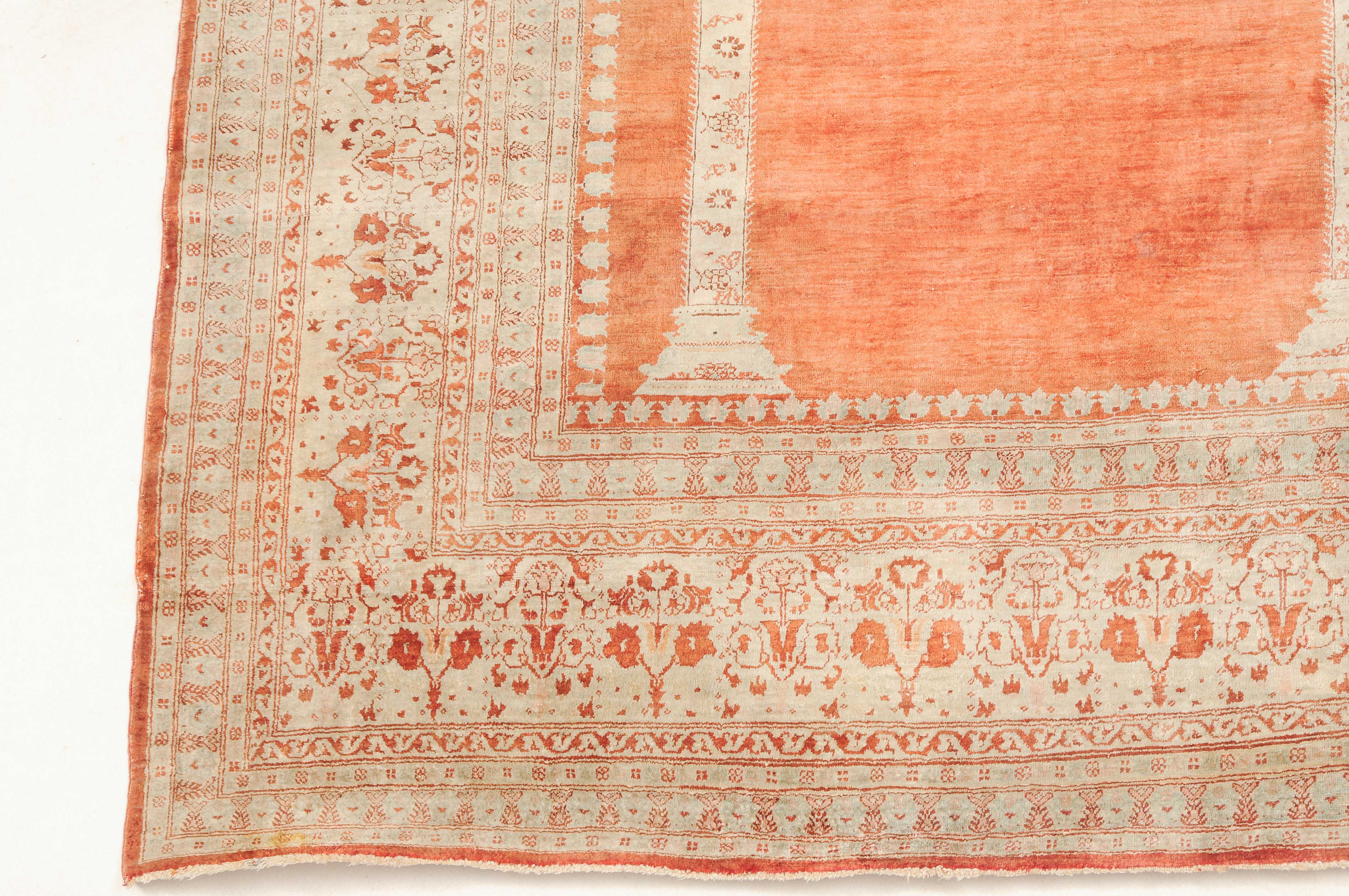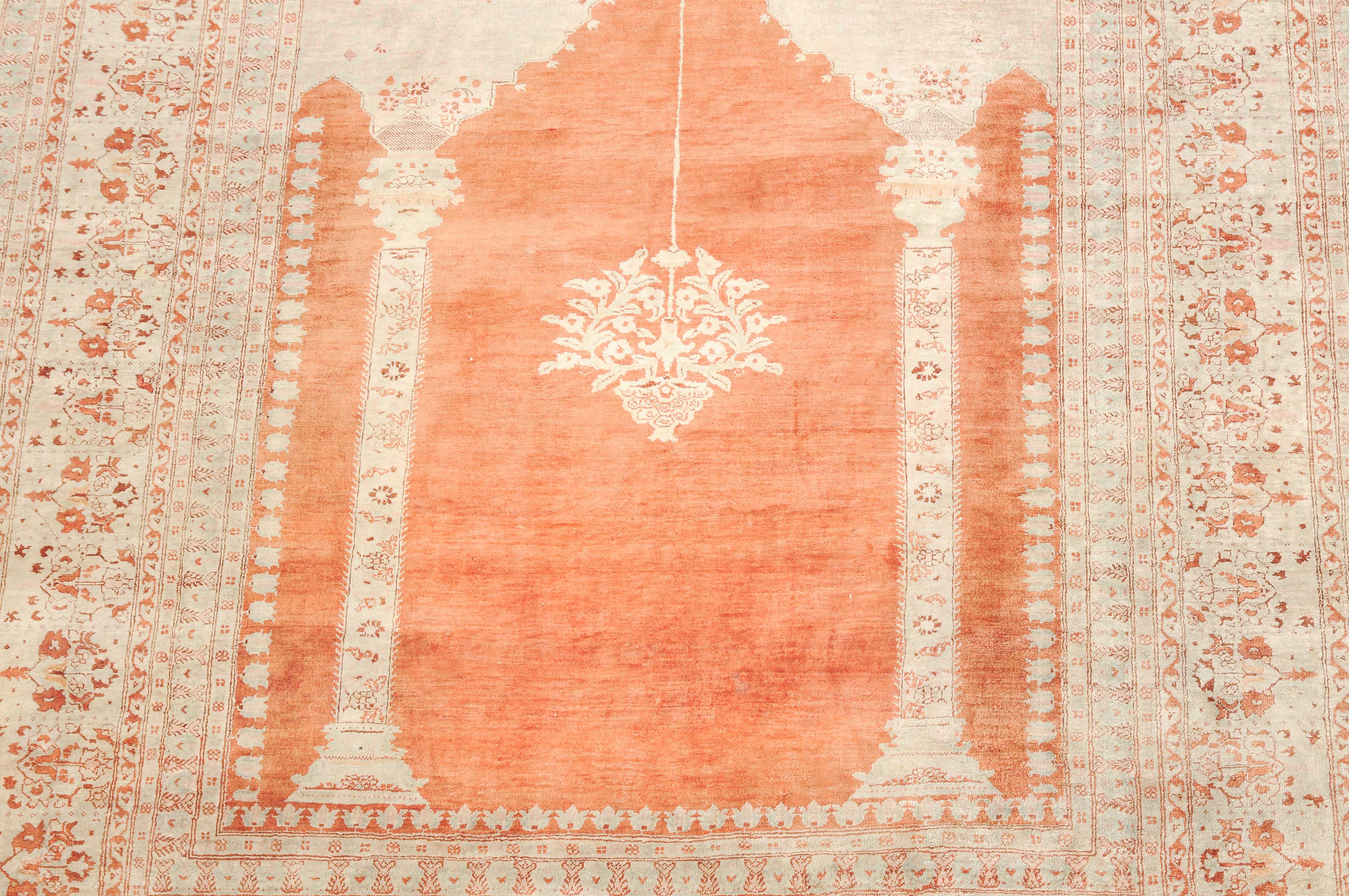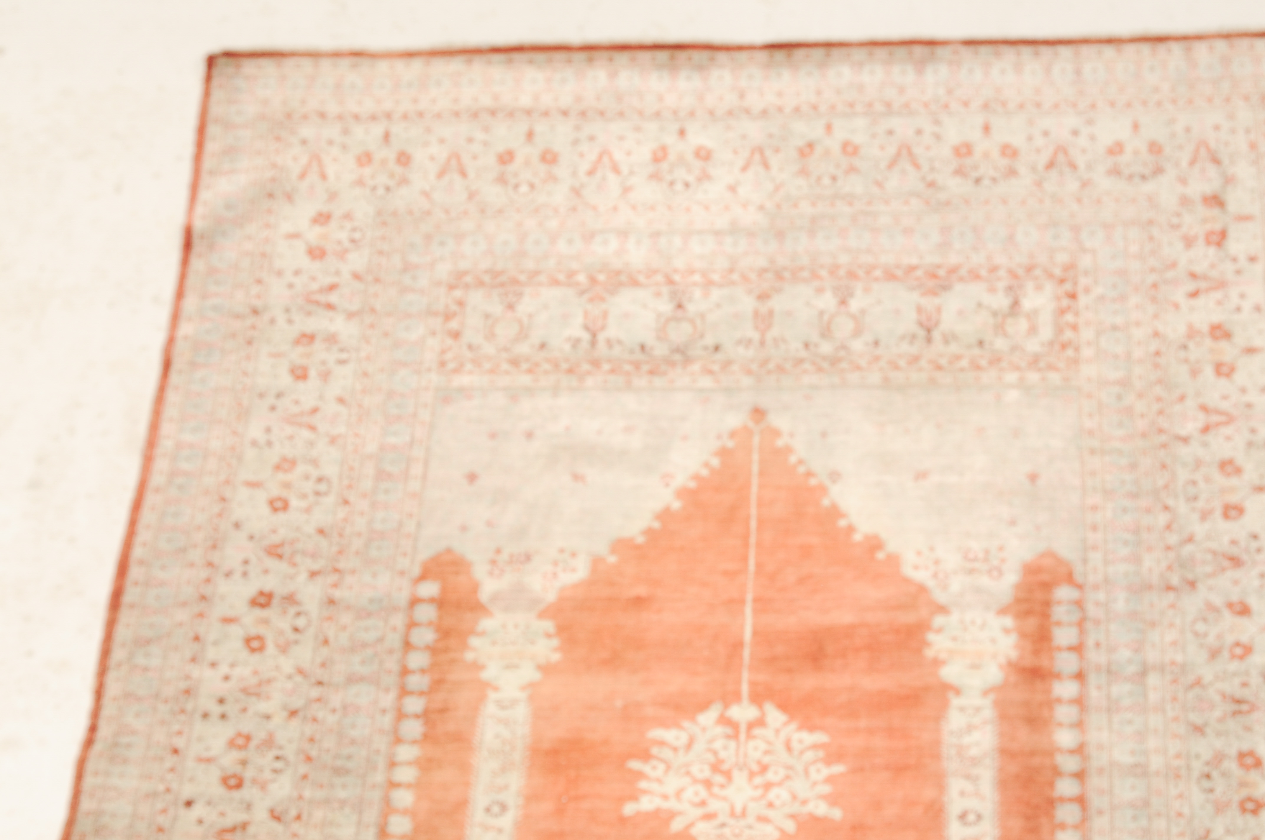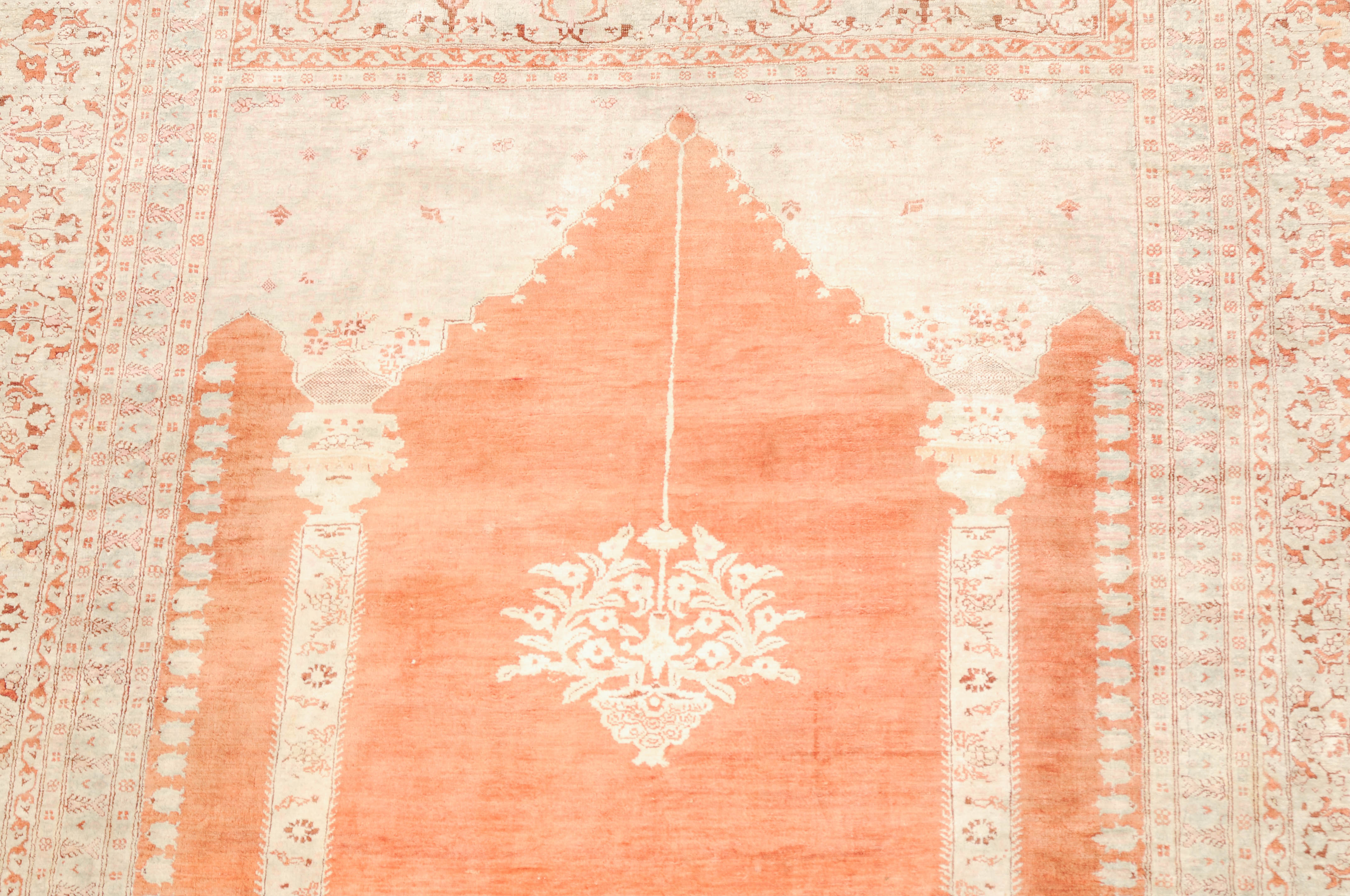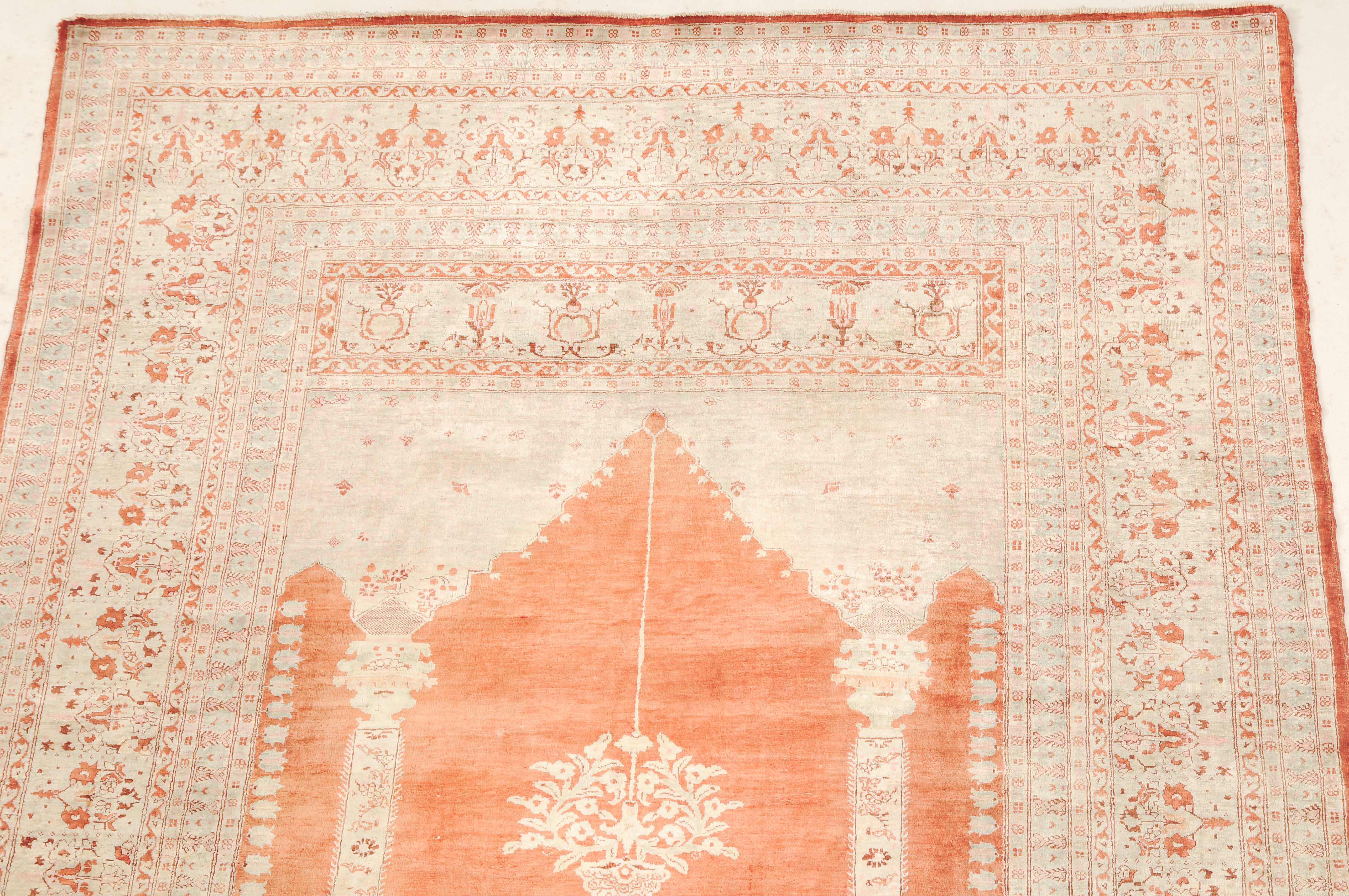 NW-Persien, um 1900. Flormaterial reine Seide. Auf einem leuchtenden rot-braunen Grund bilden 2 elegante helle Säulen eine Gebetsnische, von deren Giebel eine Ampel hinab ins Feld ragt. Mehrere filigrane, dekorativ geschmückte Nebenbordüren säumen die breite, reich verzierte Palmetten-Hauptbordüre. Leichte Gebrauchsspuren. 124x165 cm (ft. 4.1x5.4).