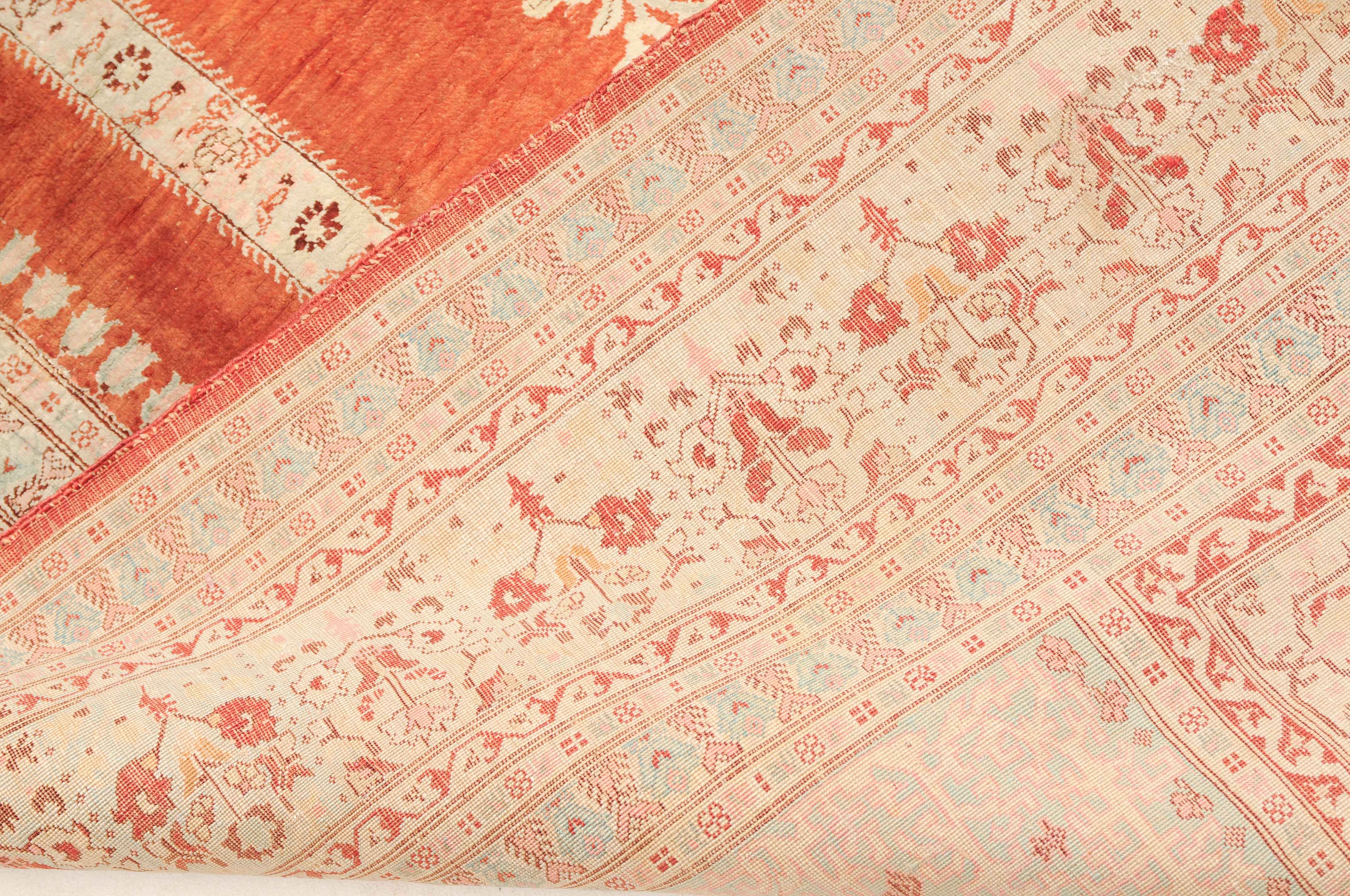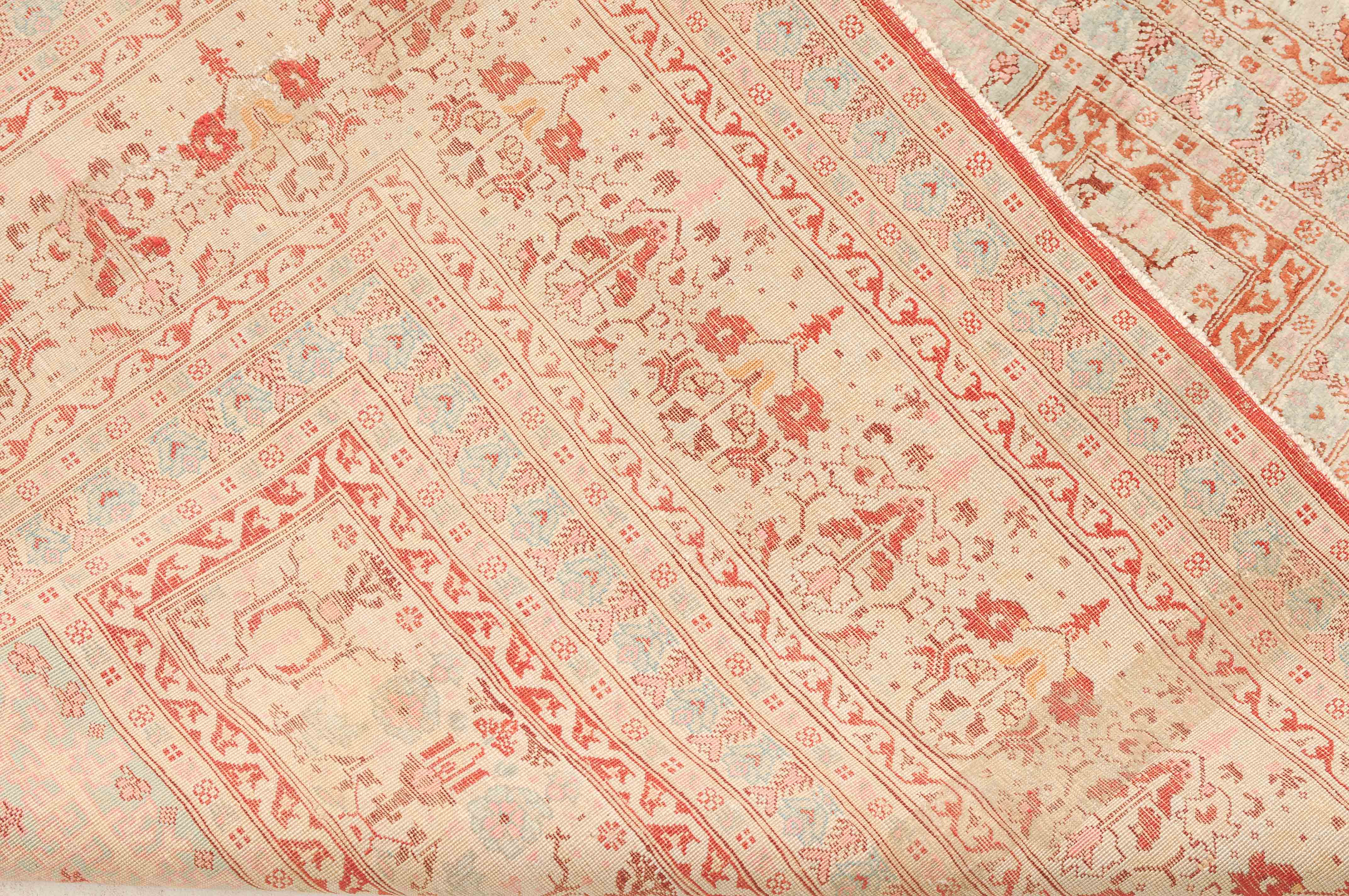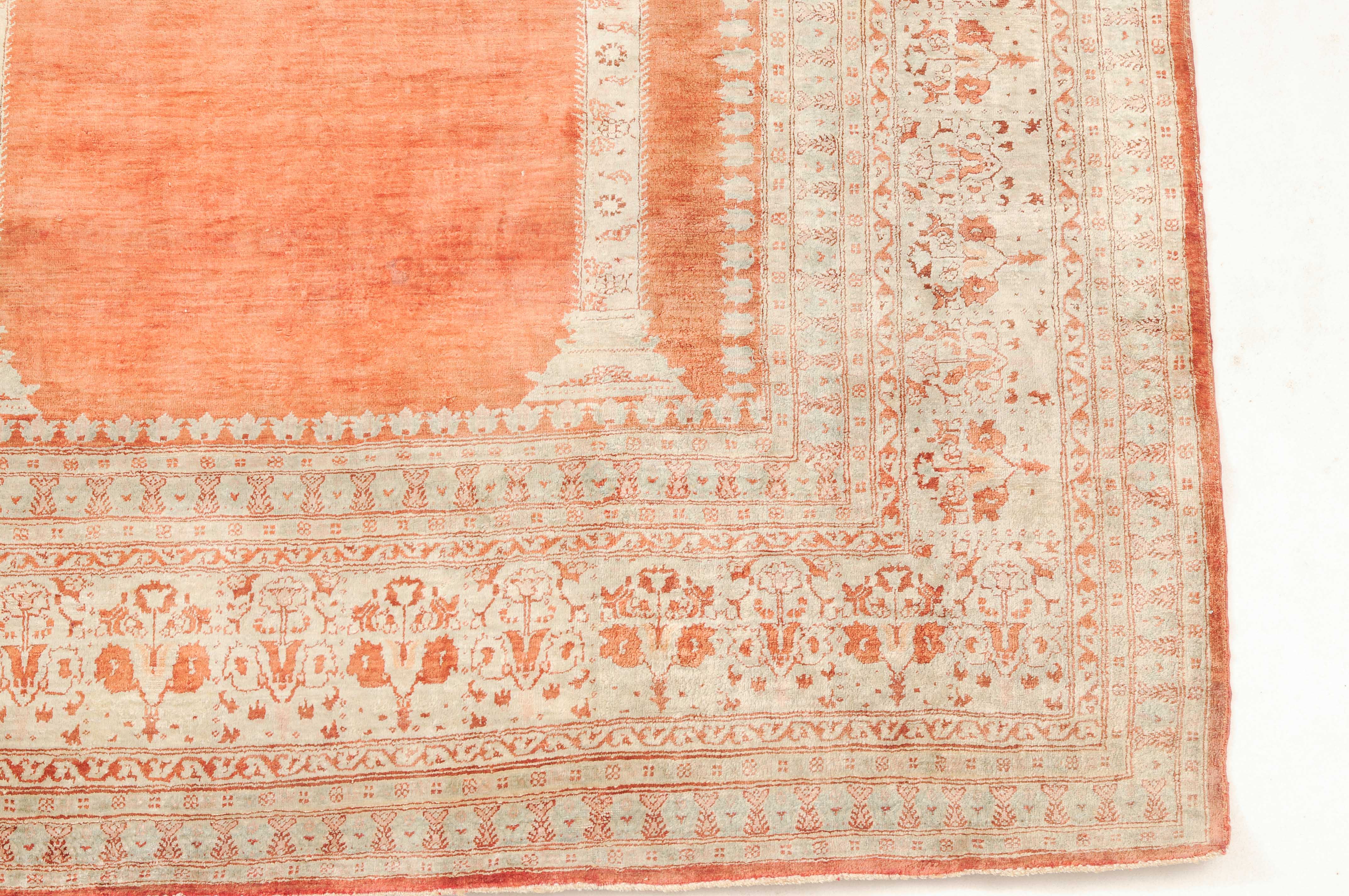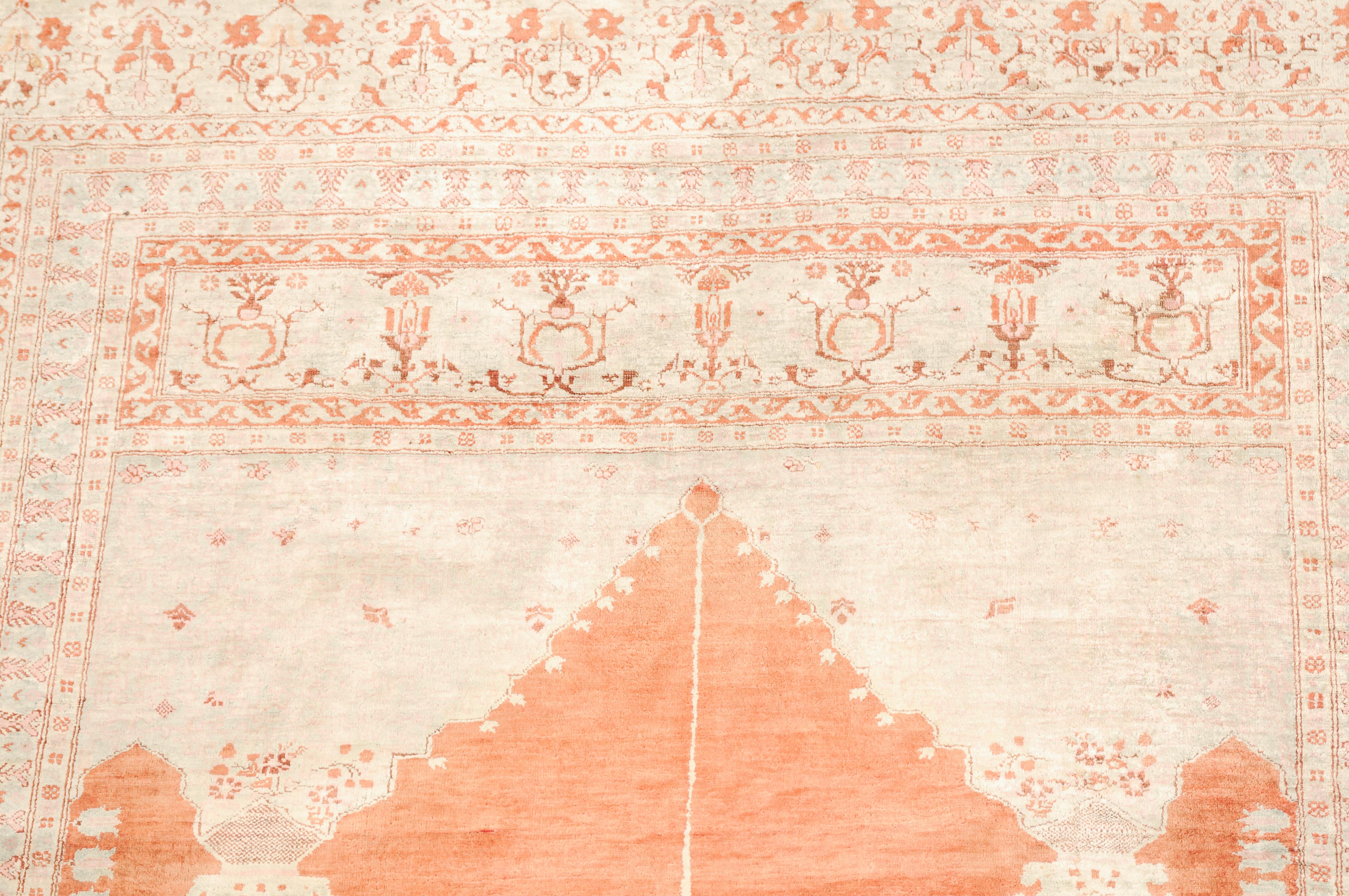 NW-Persien, um 1900. Flormaterial reine Seide. Auf einem leuchtenden rot-braunen Grund bilden 2 elegante helle Säulen eine Gebetsnische, von deren Giebel eine Ampel hinab ins Feld ragt. Mehrere filigrane, dekorativ geschmückte Nebenbordüren säumen die breite, reich verzierte Palmetten-Hauptbordüre. Leichte Gebrauchsspuren. 124x165 cm (ft. 4.1x5.4).