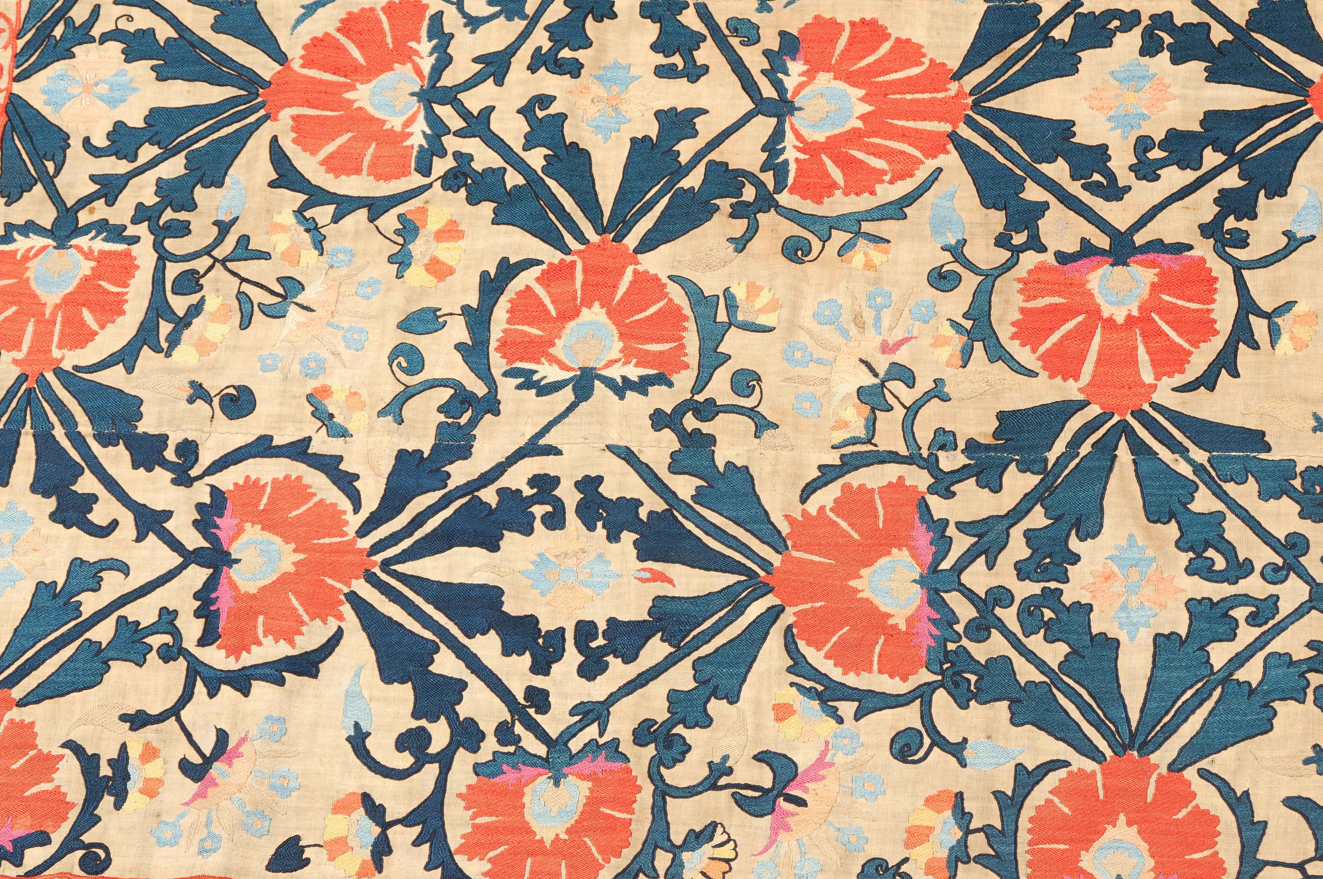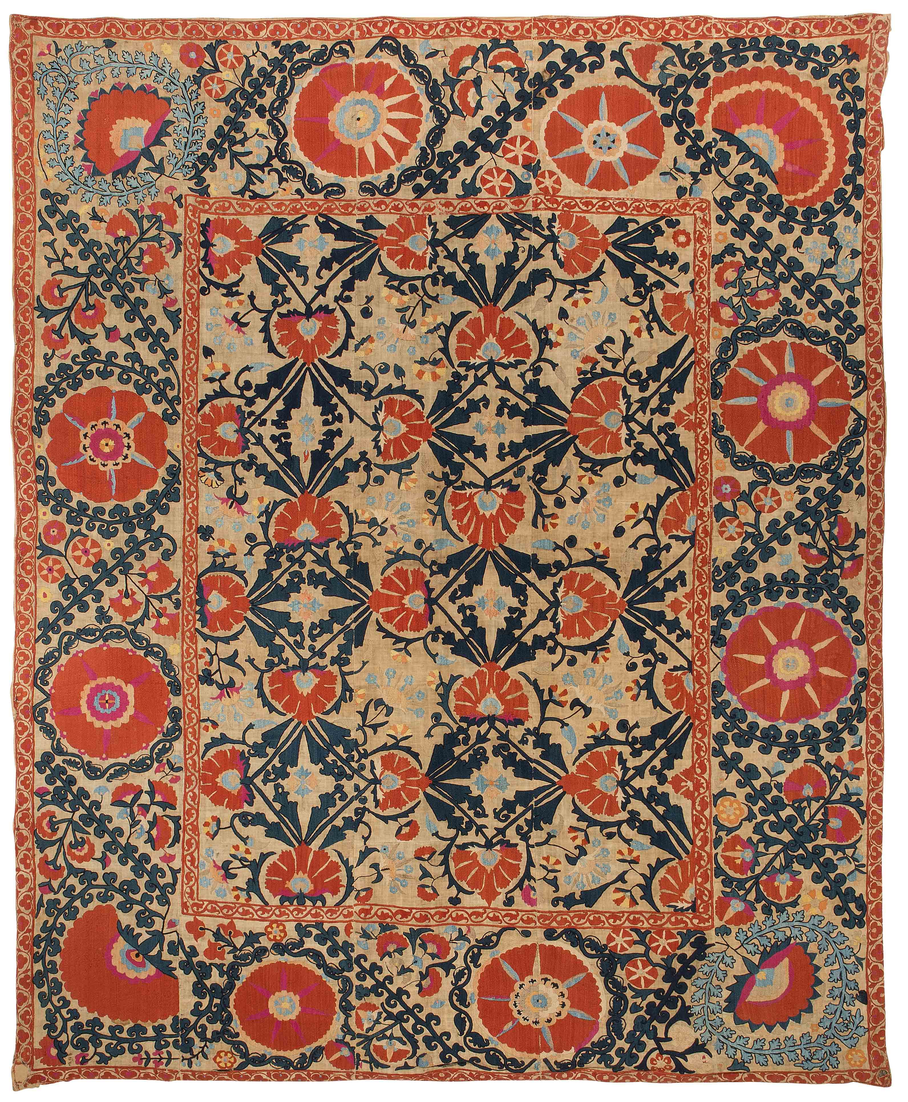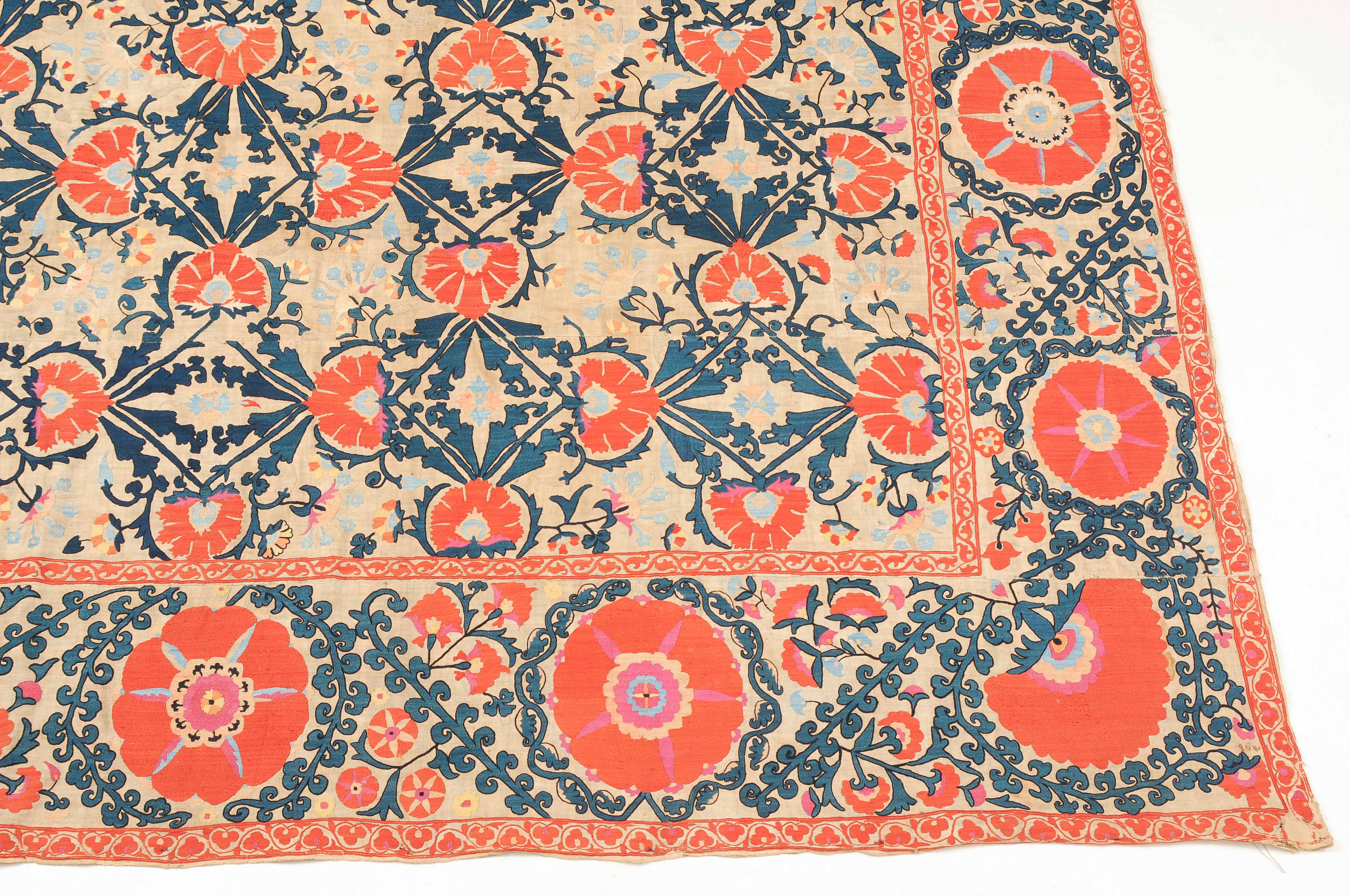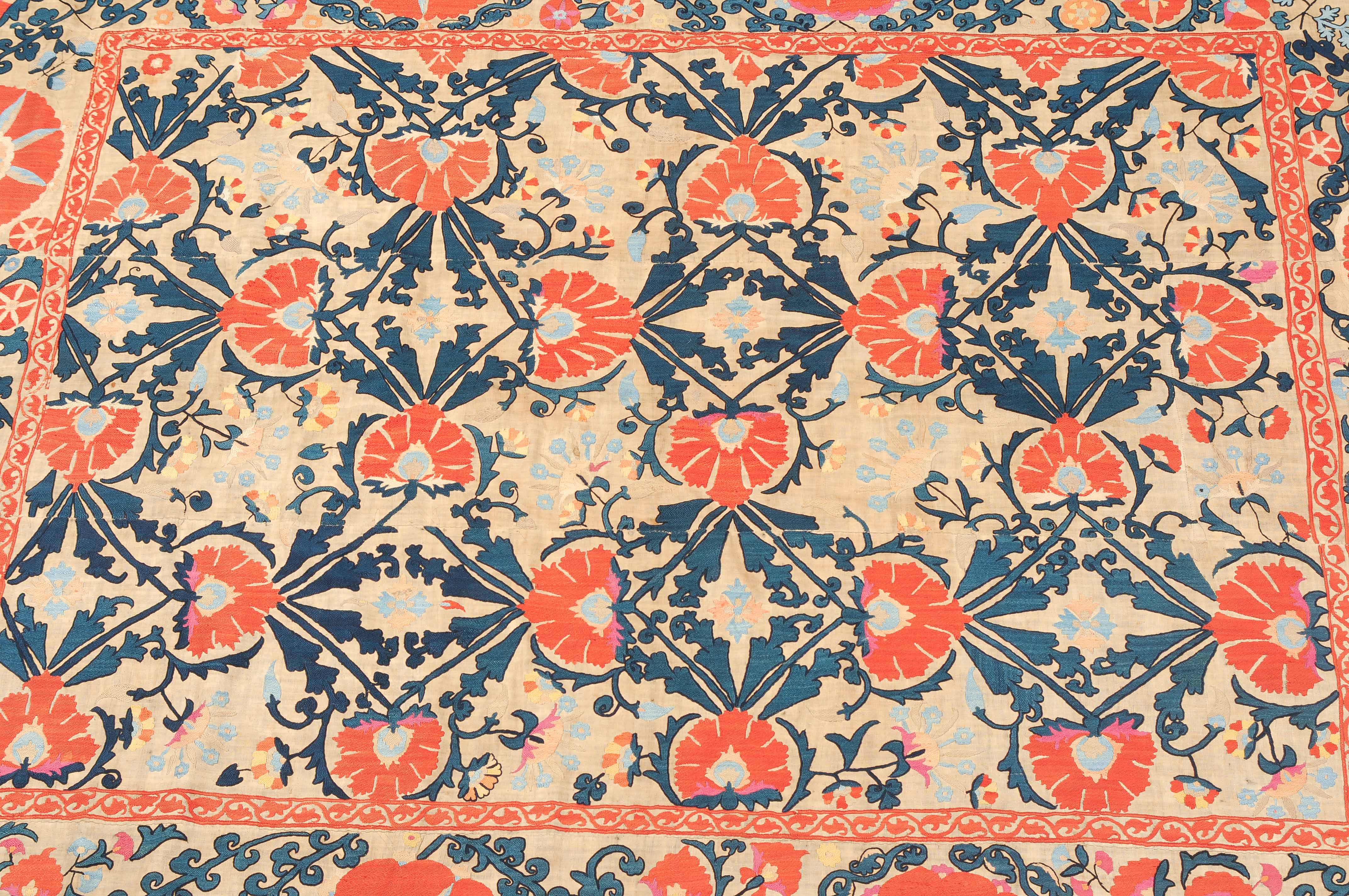 Usbekistan, um 1900. Nadelarbeit auf Tuch. Filigrane dunkelblaue Borten bilden auf dem hellen Grund des Innenfeldes Rauten, die mit prächtigen roten Blütenpalmetten an jeder Rautenecke verziert sind, flankiert von fein gearbeiteten Blattranken und Blütenketten in verschiedensten Variationen und Farbtönen. In der ebenfalls hellen Bordüre umlaufen dunkelblaue Rankenbänder die grosszügig angelegten roten Blütenmotive auf dekorative Weise. Minimale Gebrauchsspuren. 190x233 cm (ft. 6.3x7.7).