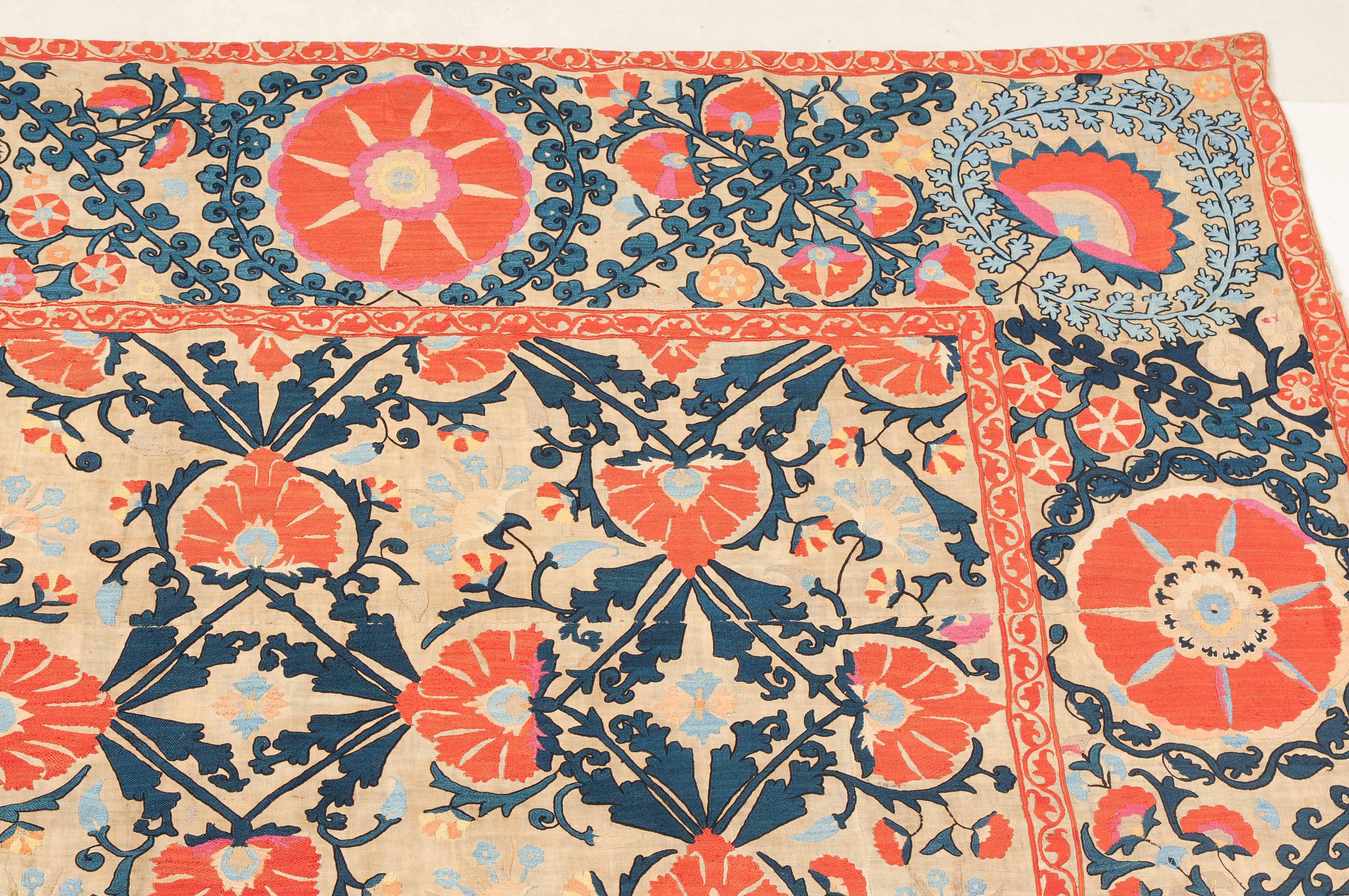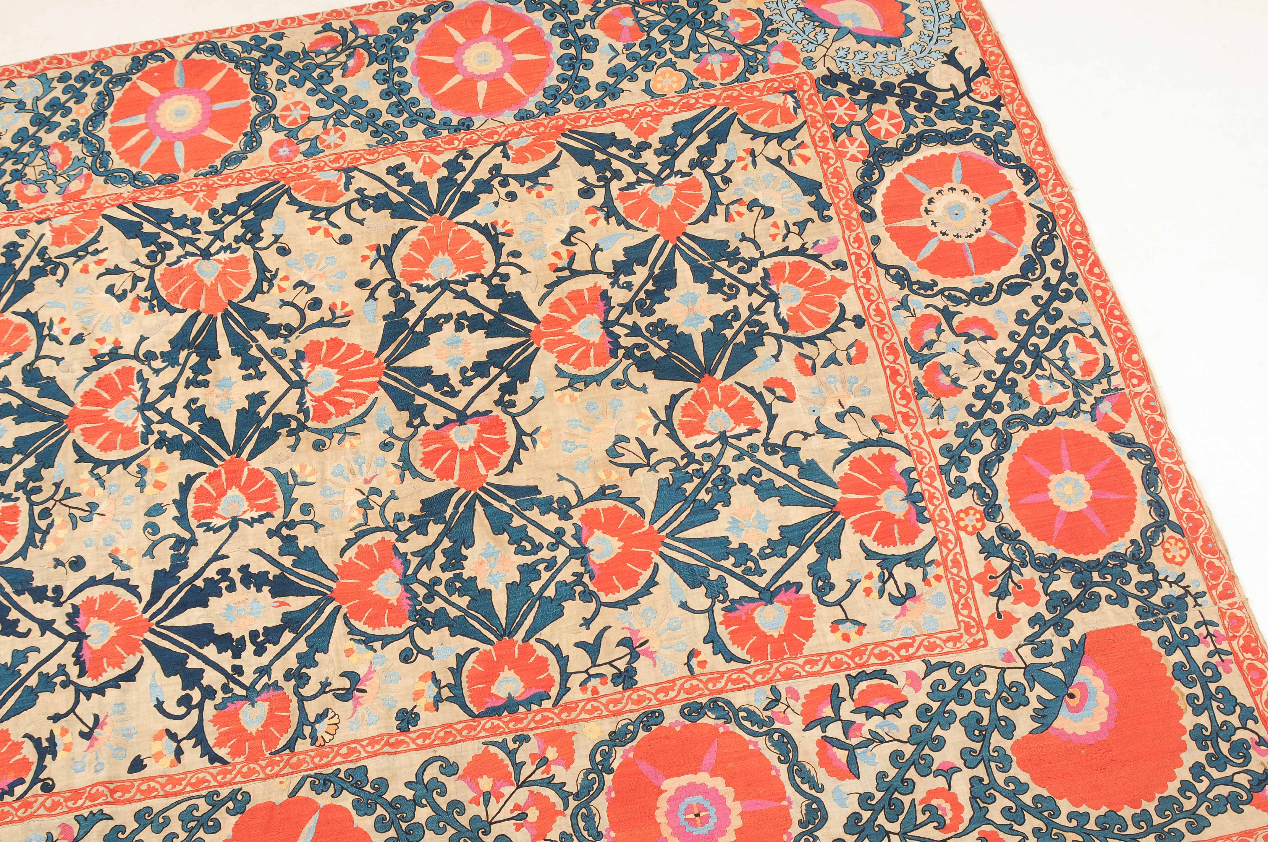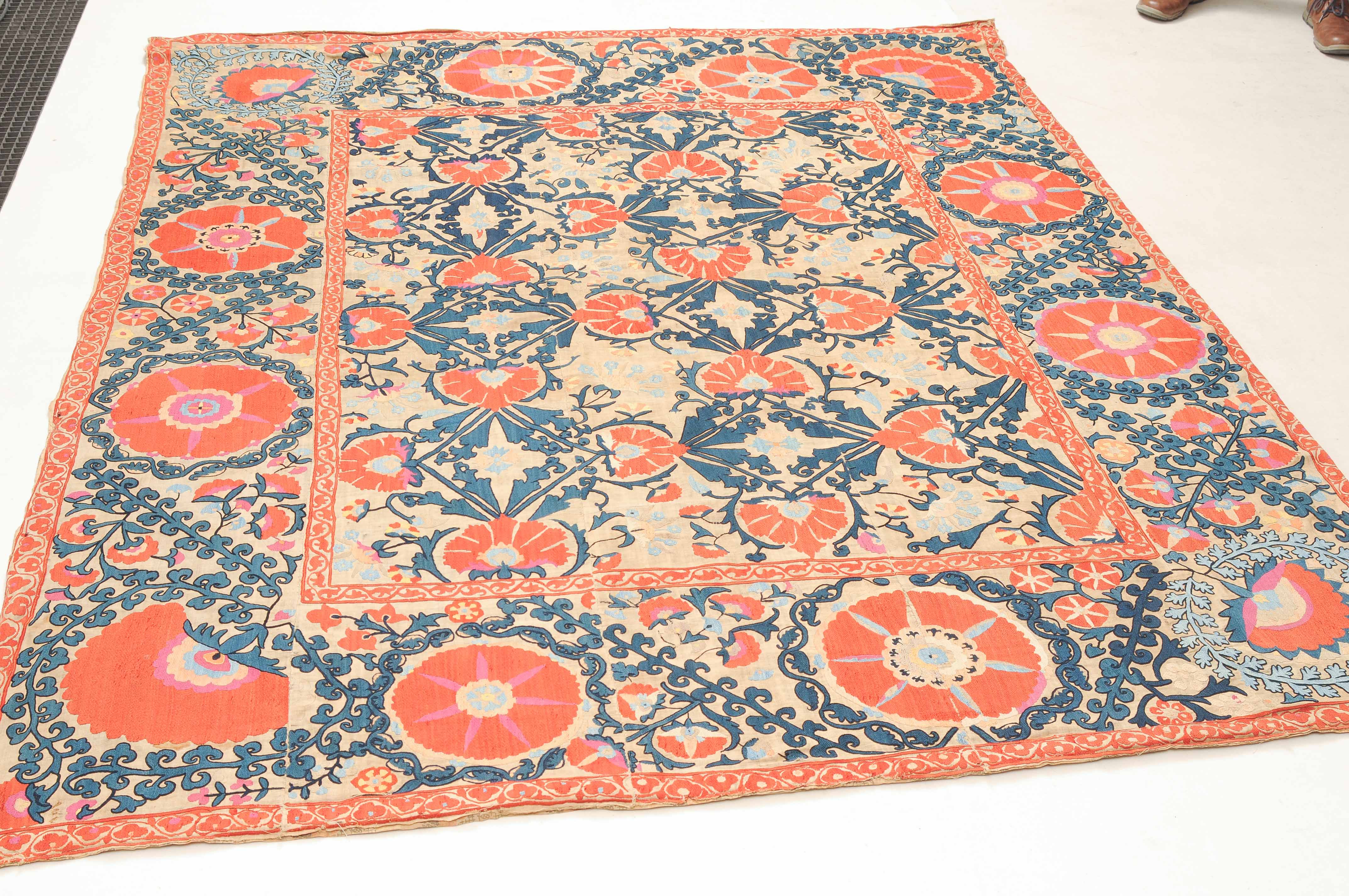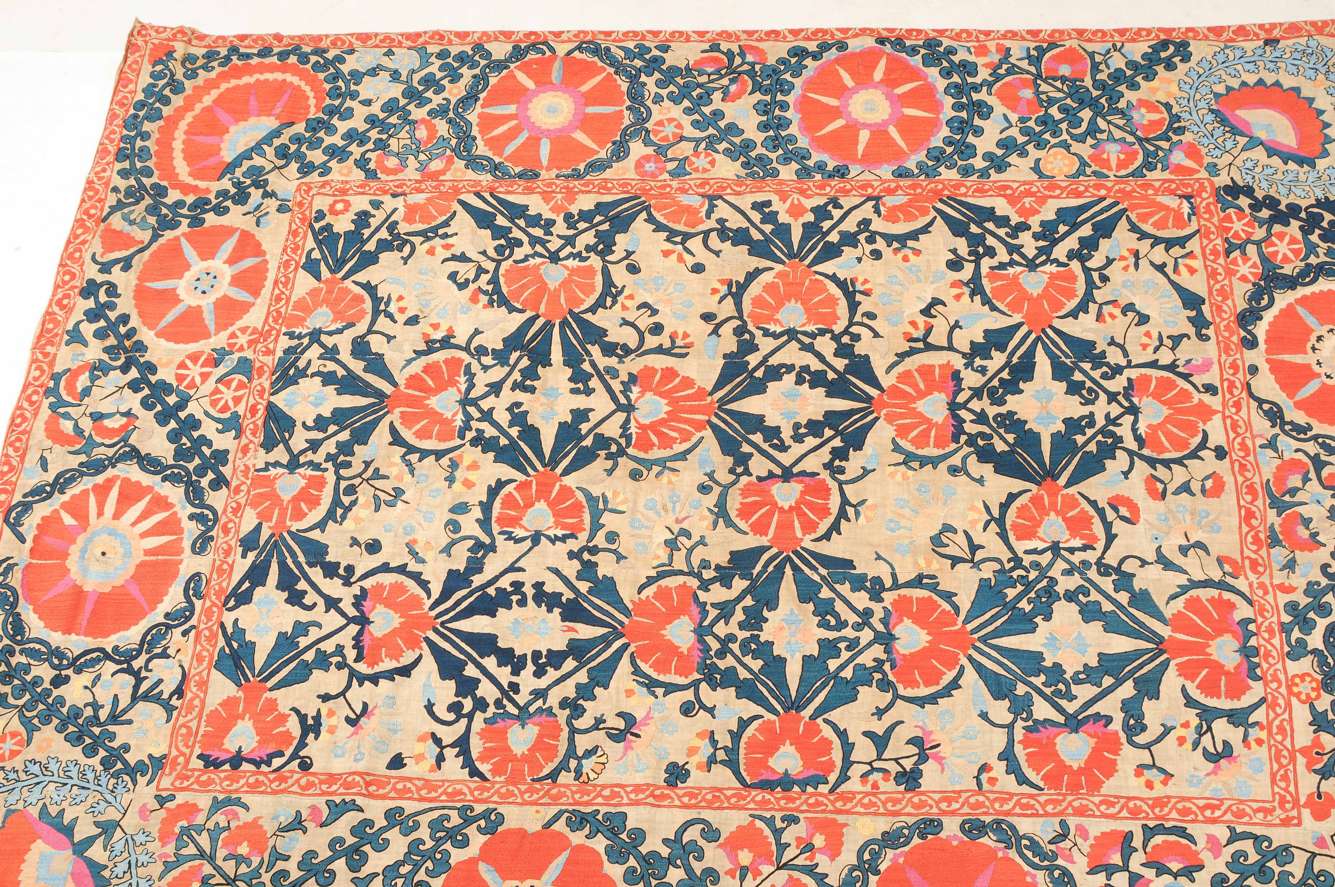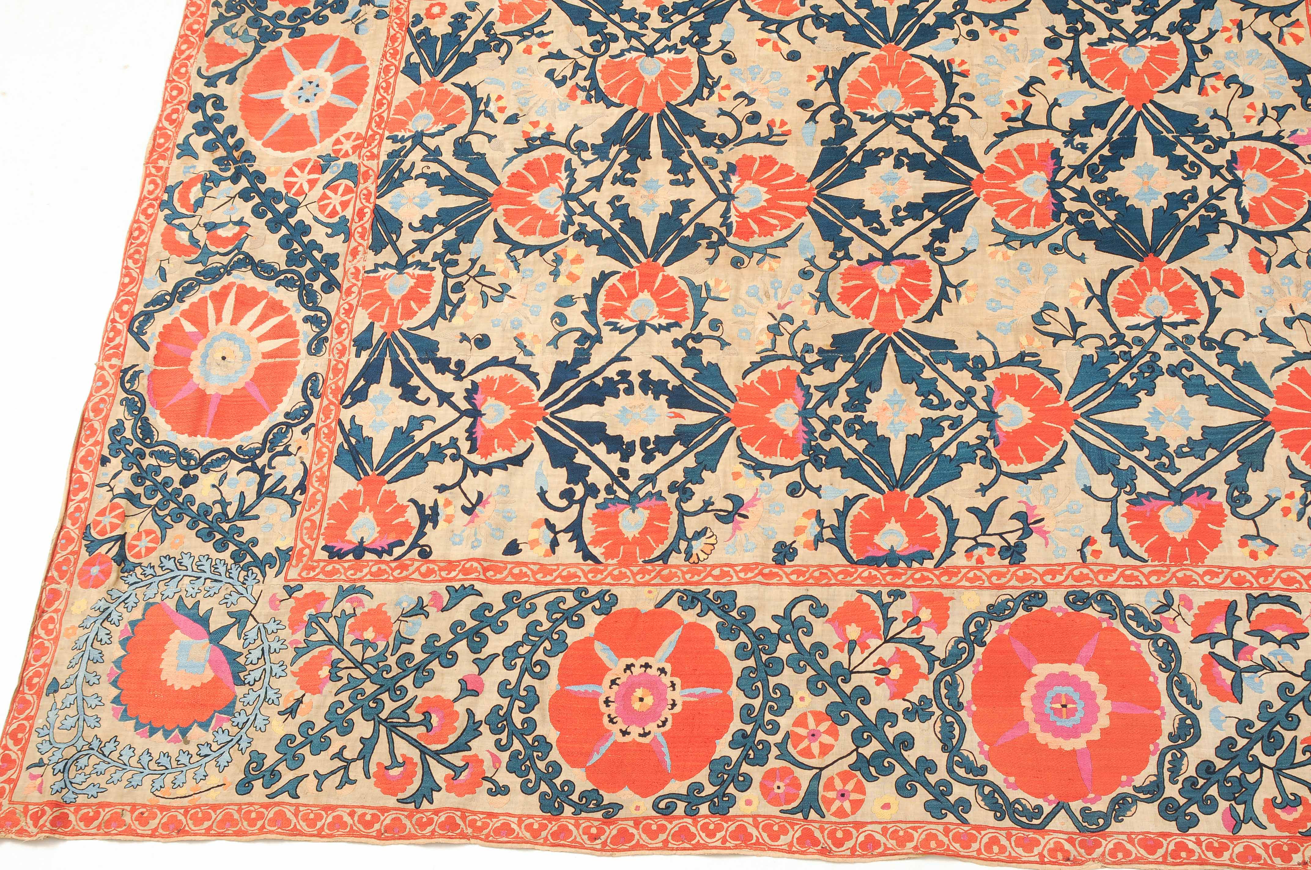 Usbekistan, um 1900. Nadelarbeit auf Tuch. Filigrane dunkelblaue Borten bilden auf dem hellen Grund des Innenfeldes Rauten, die mit prächtigen roten Blütenpalmetten an jeder Rautenecke verziert sind, flankiert von fein gearbeiteten Blattranken und Blütenketten in verschiedensten Variationen und Farbtönen. In der ebenfalls hellen Bordüre umlaufen dunkelblaue Rankenbänder die grosszügig angelegten roten Blütenmotive auf dekorative Weise. Minimale Gebrauchsspuren. 190x233 cm (ft. 6.3x7.7).