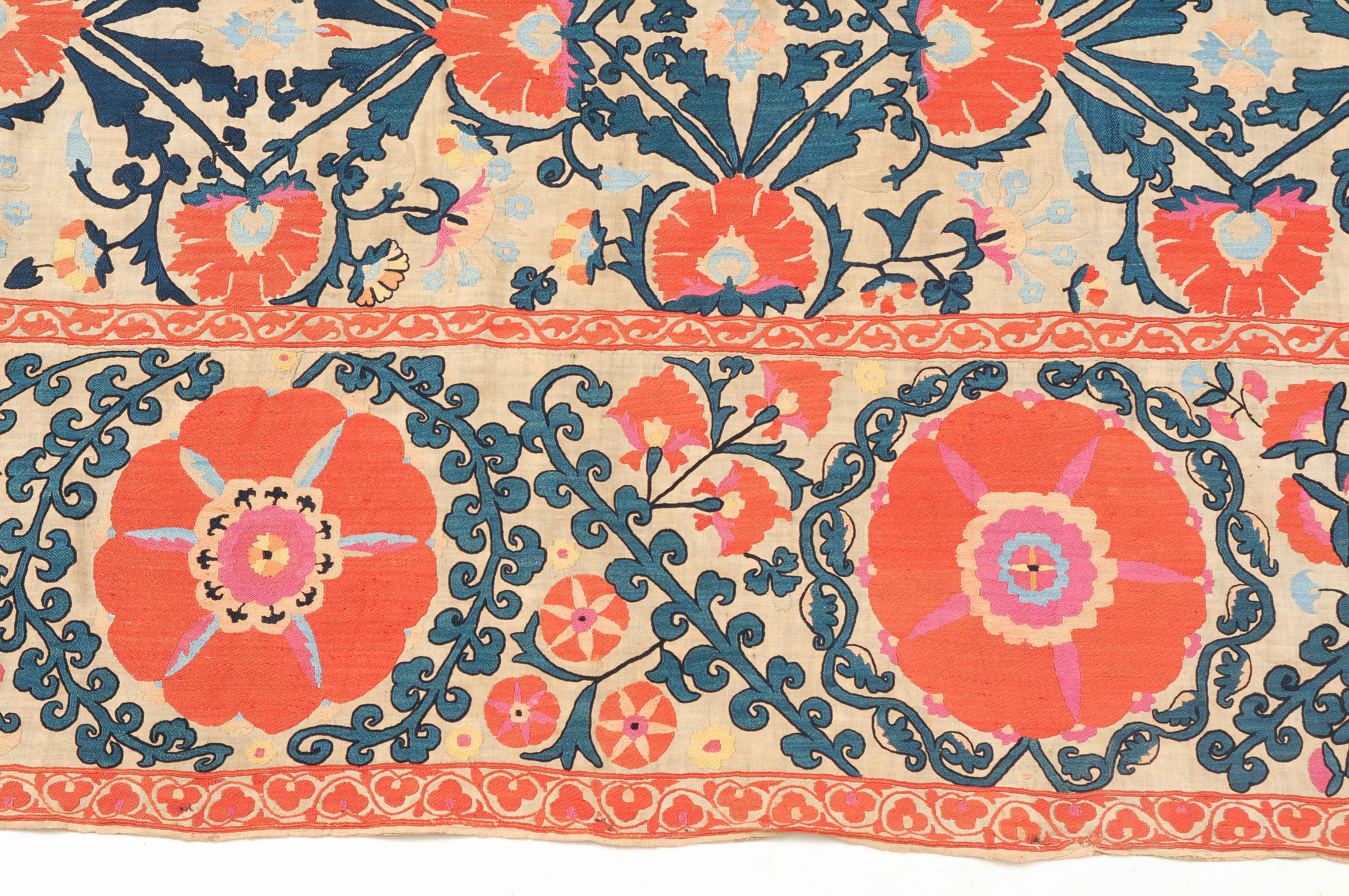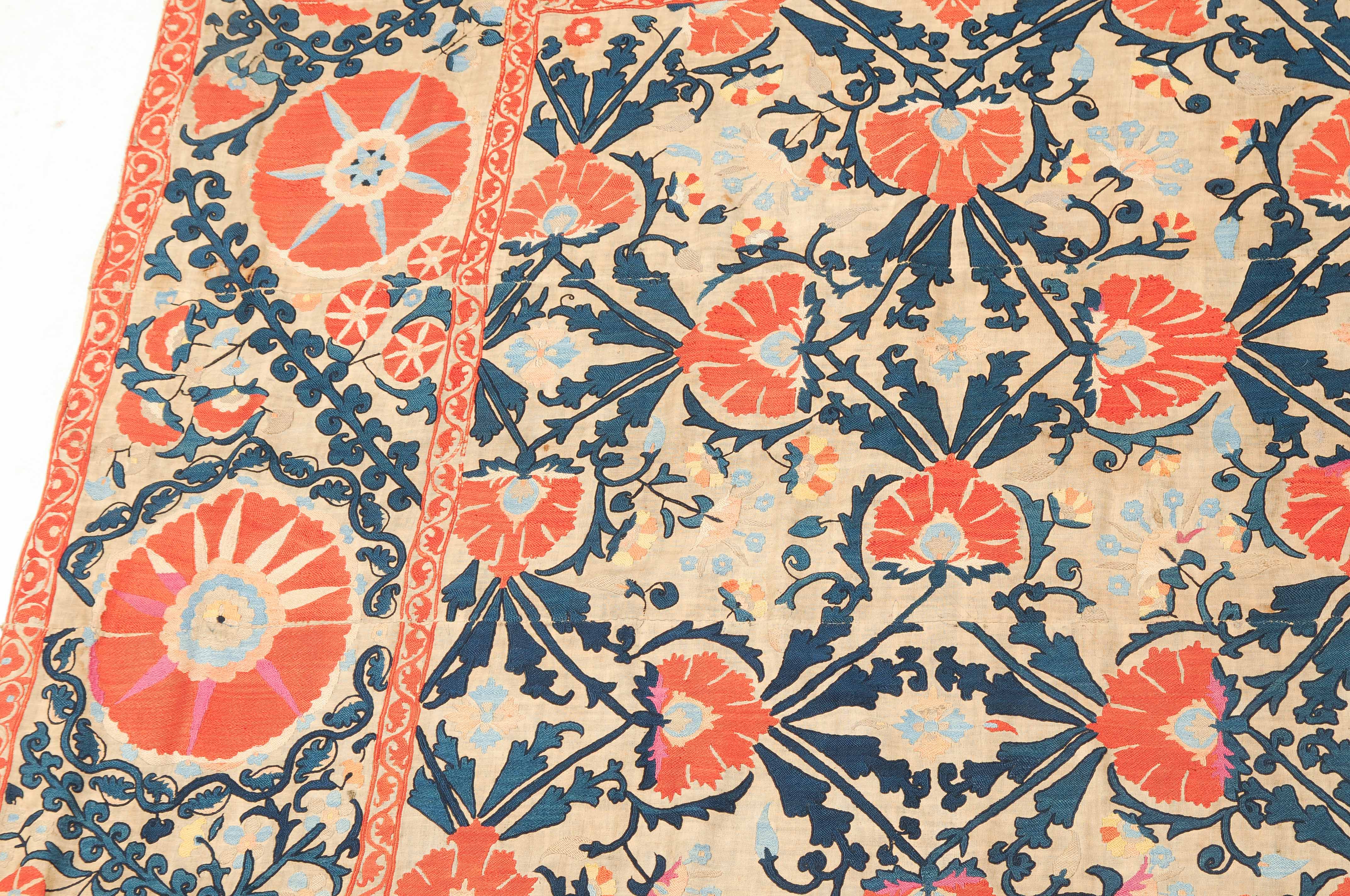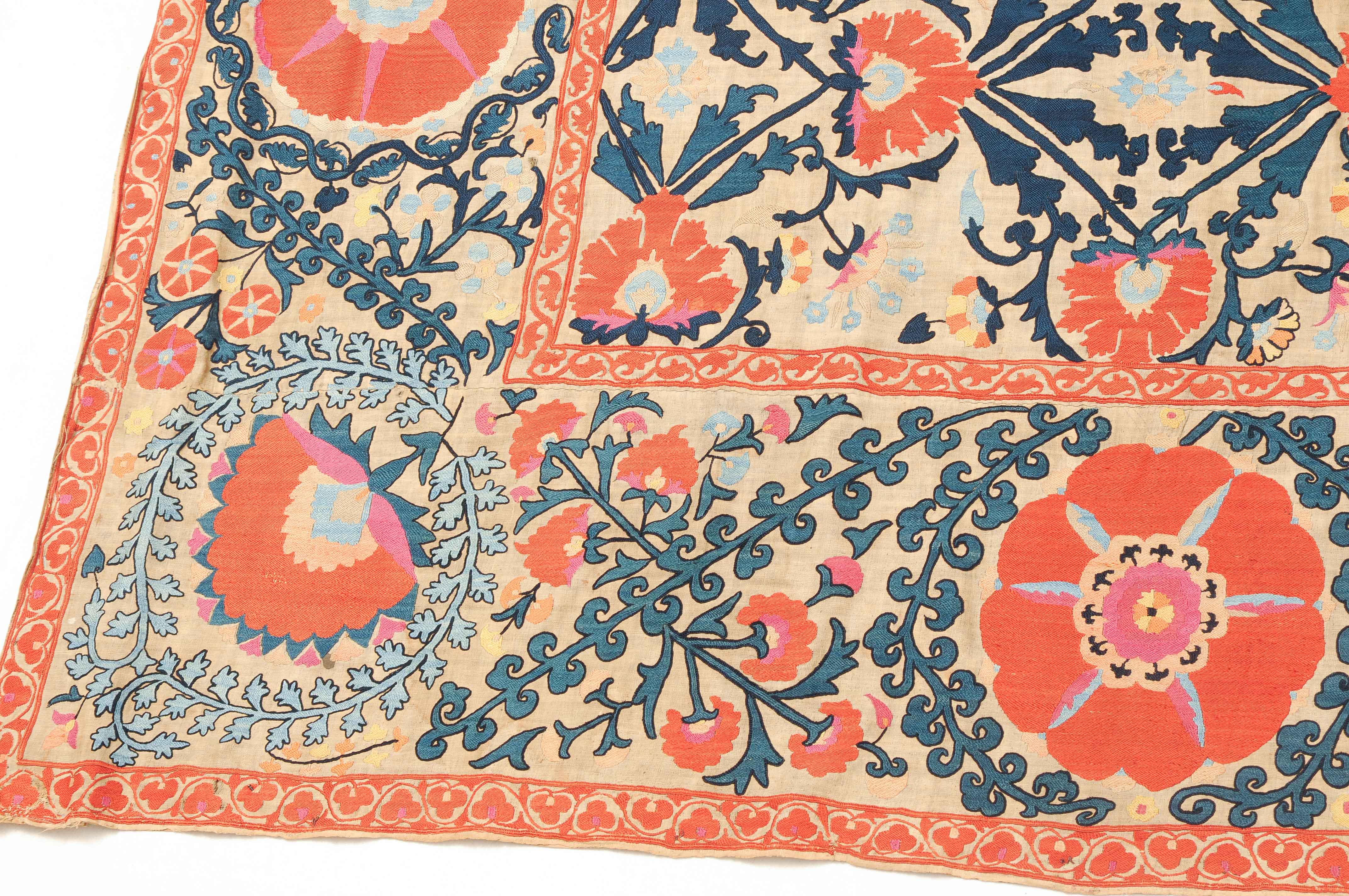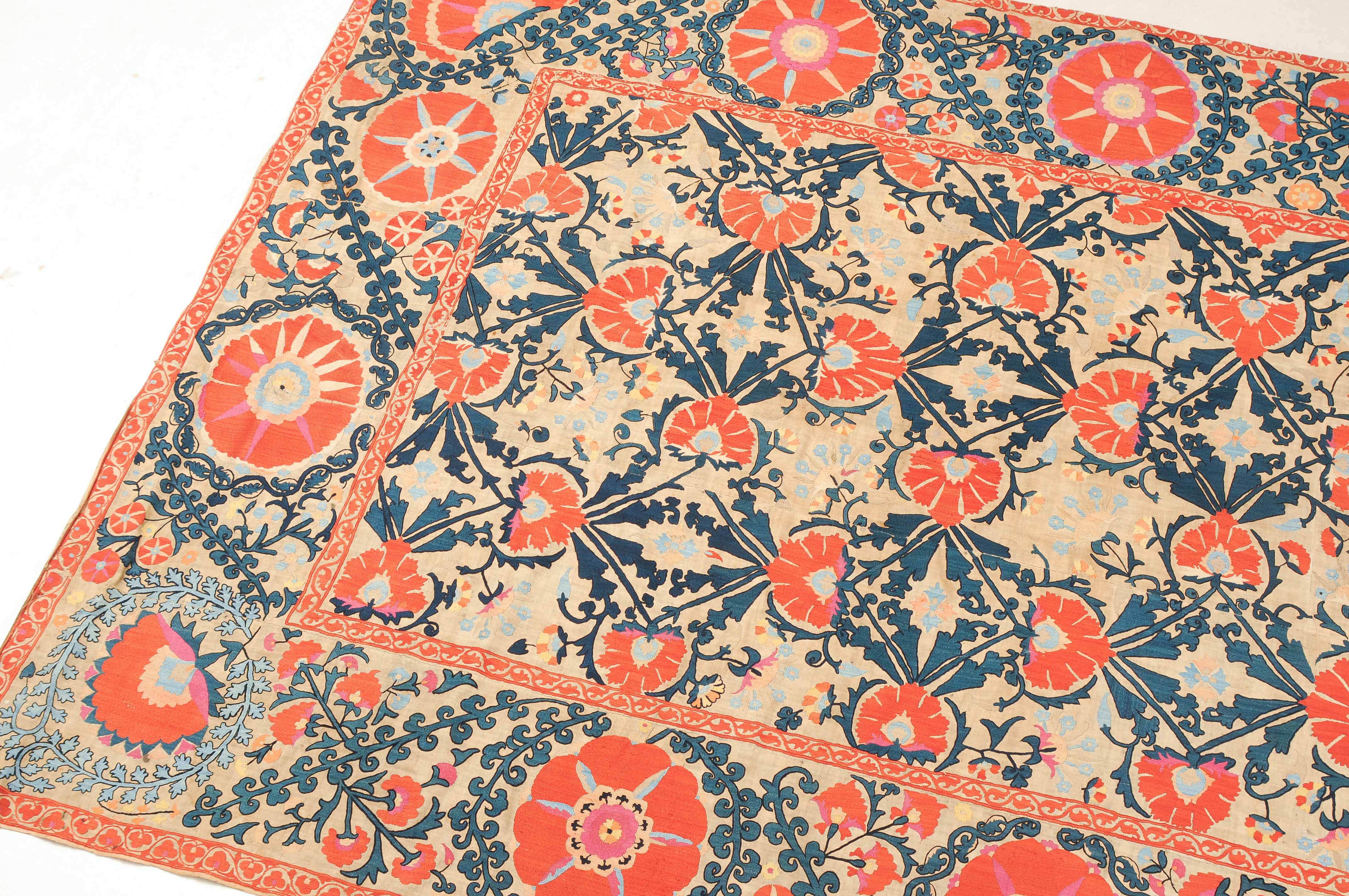 Usbekistan, um 1900. Nadelarbeit auf Tuch. Filigrane dunkelblaue Borten bilden auf dem hellen Grund des Innenfeldes Rauten, die mit prächtigen roten Blütenpalmetten an jeder Rautenecke verziert sind, flankiert von fein gearbeiteten Blattranken und Blütenketten in verschiedensten Variationen und Farbtönen. In der ebenfalls hellen Bordüre umlaufen dunkelblaue Rankenbänder die grosszügig angelegten roten Blütenmotive auf dekorative Weise. Minimale Gebrauchsspuren. 190x233 cm (ft. 6.3x7.7).