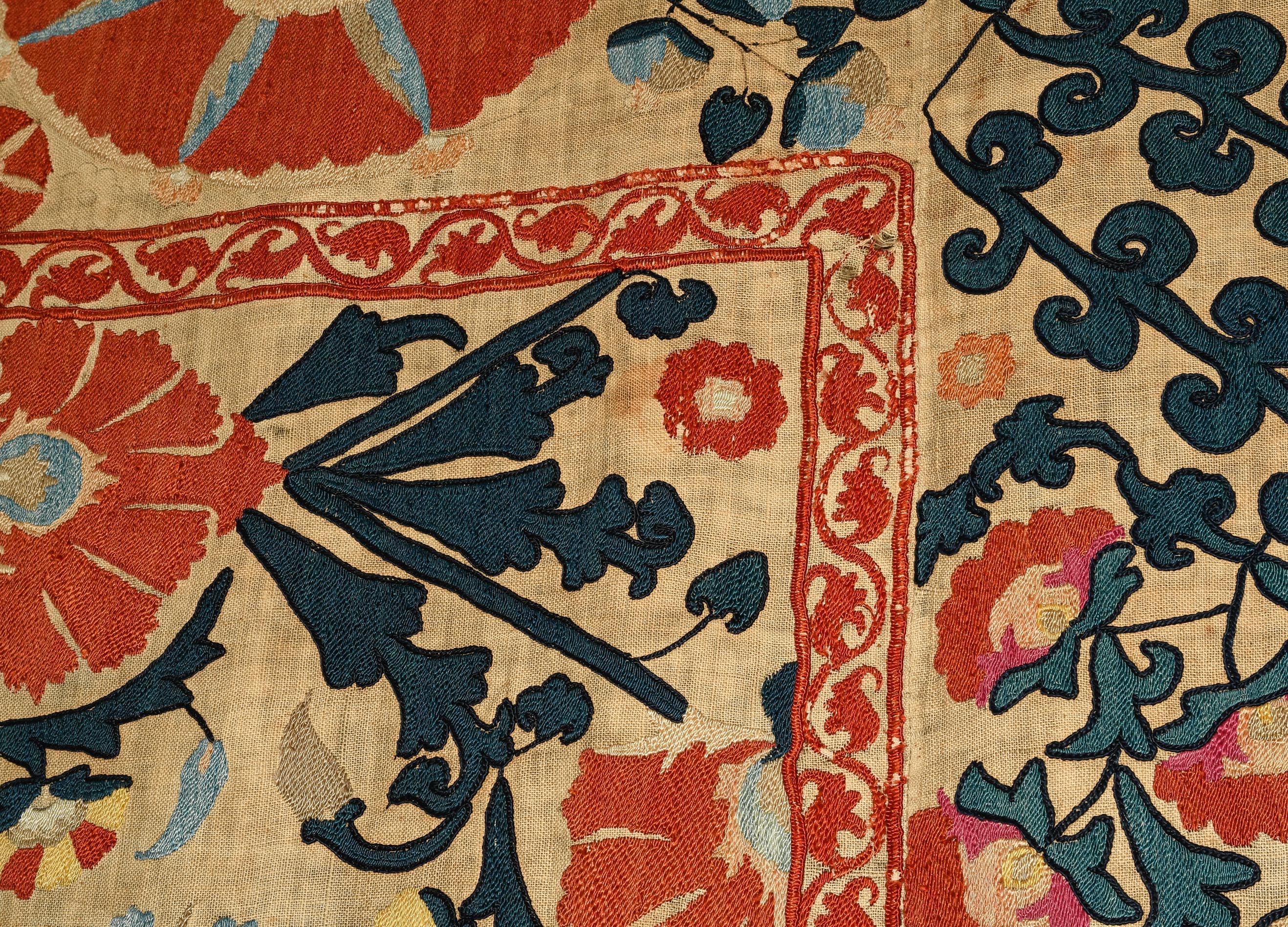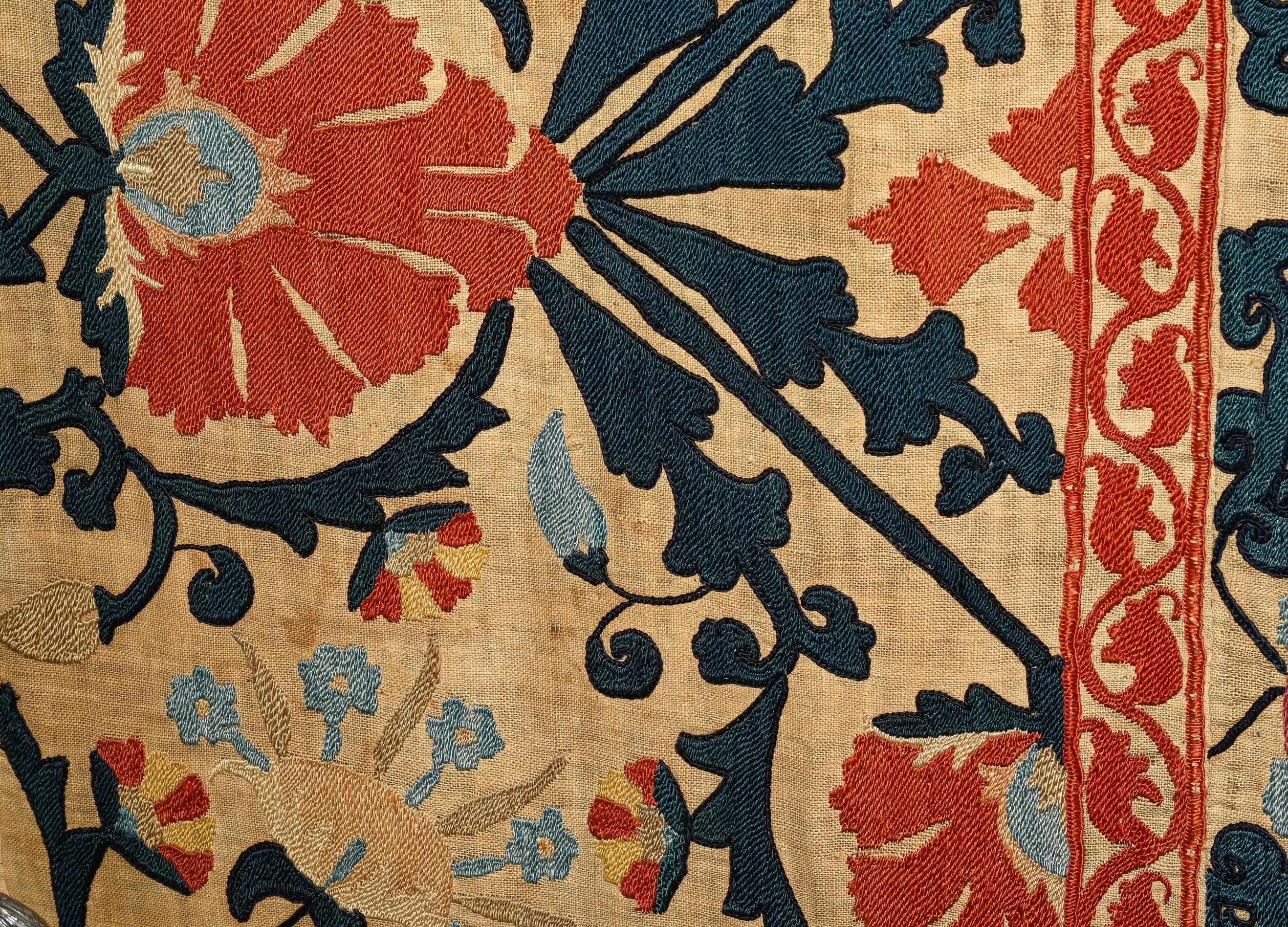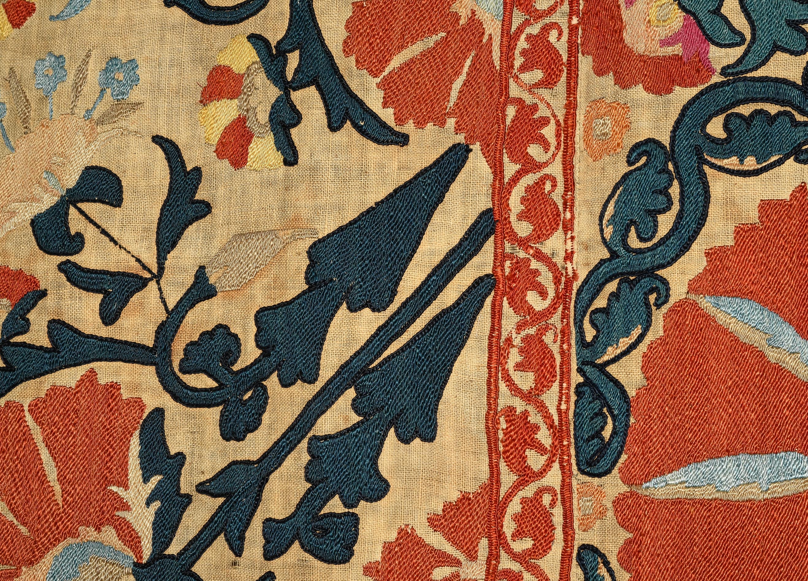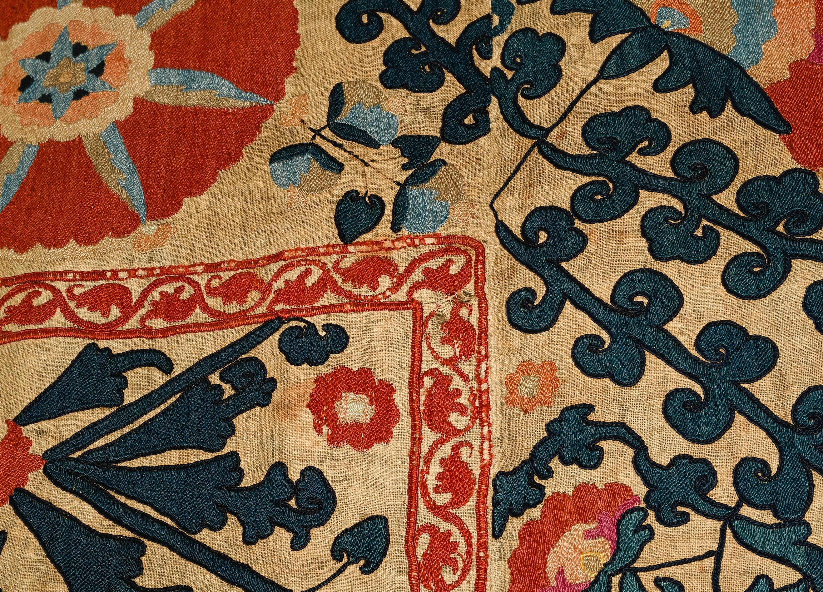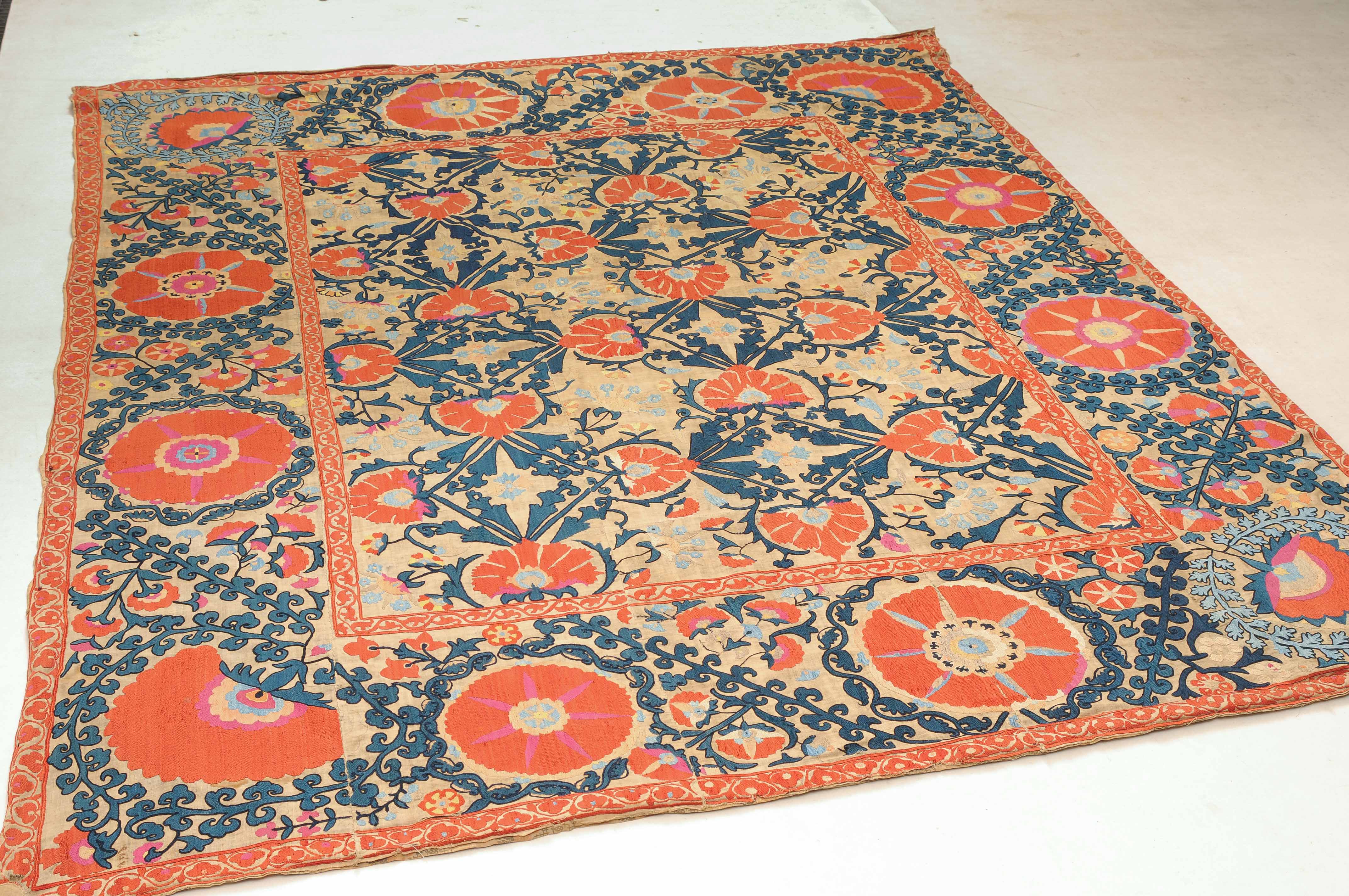 Usbekistan, um 1900. Nadelarbeit auf Tuch. Filigrane dunkelblaue Borten bilden auf dem hellen Grund des Innenfeldes Rauten, die mit prächtigen roten Blütenpalmetten an jeder Rautenecke verziert sind, flankiert von fein gearbeiteten Blattranken und Blütenketten in verschiedensten Variationen und Farbtönen. In der ebenfalls hellen Bordüre umlaufen dunkelblaue Rankenbänder die grosszügig angelegten roten Blütenmotive auf dekorative Weise. Minimale Gebrauchsspuren. 190x233 cm (ft. 6.3x7.7).