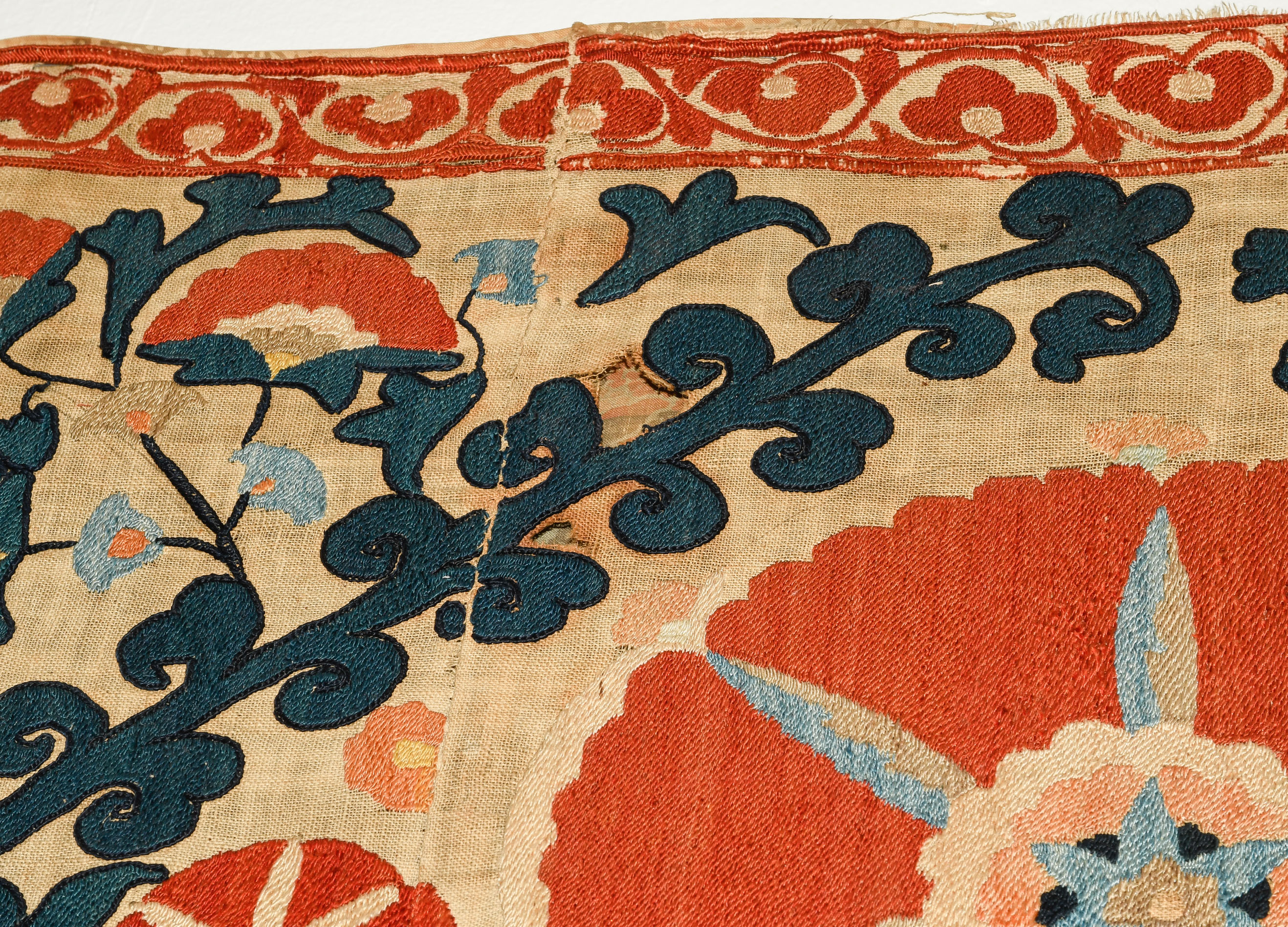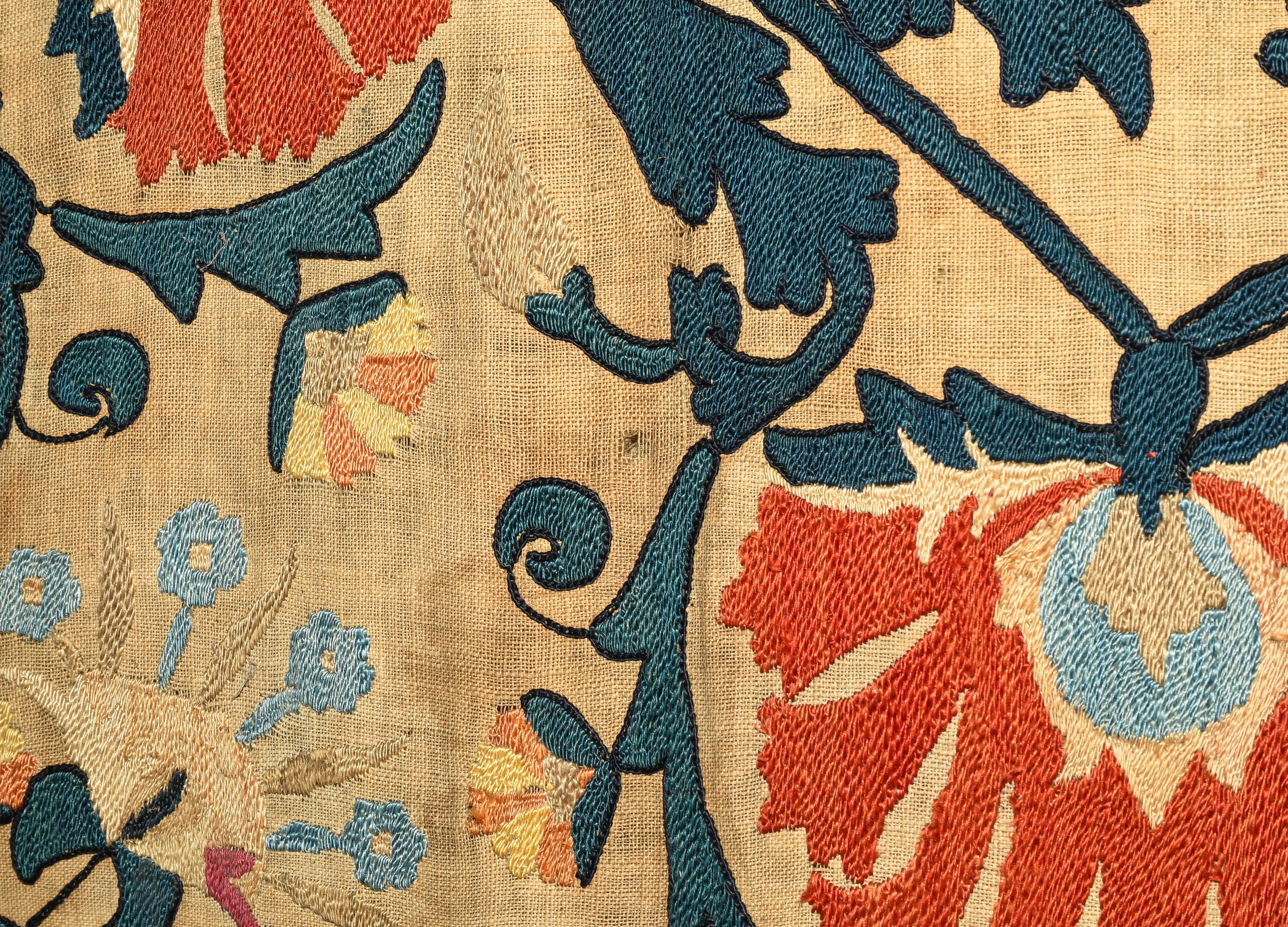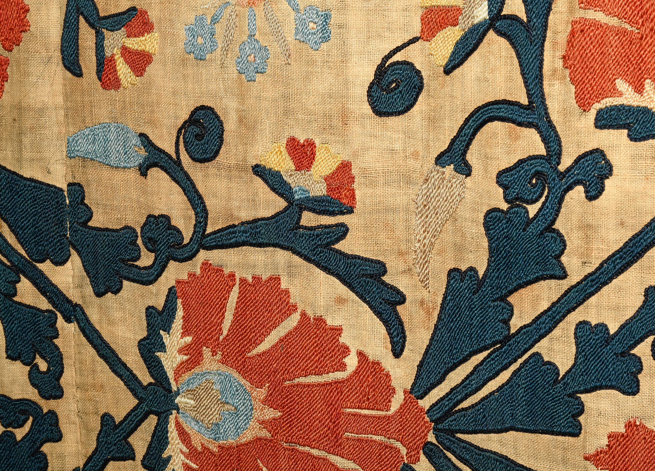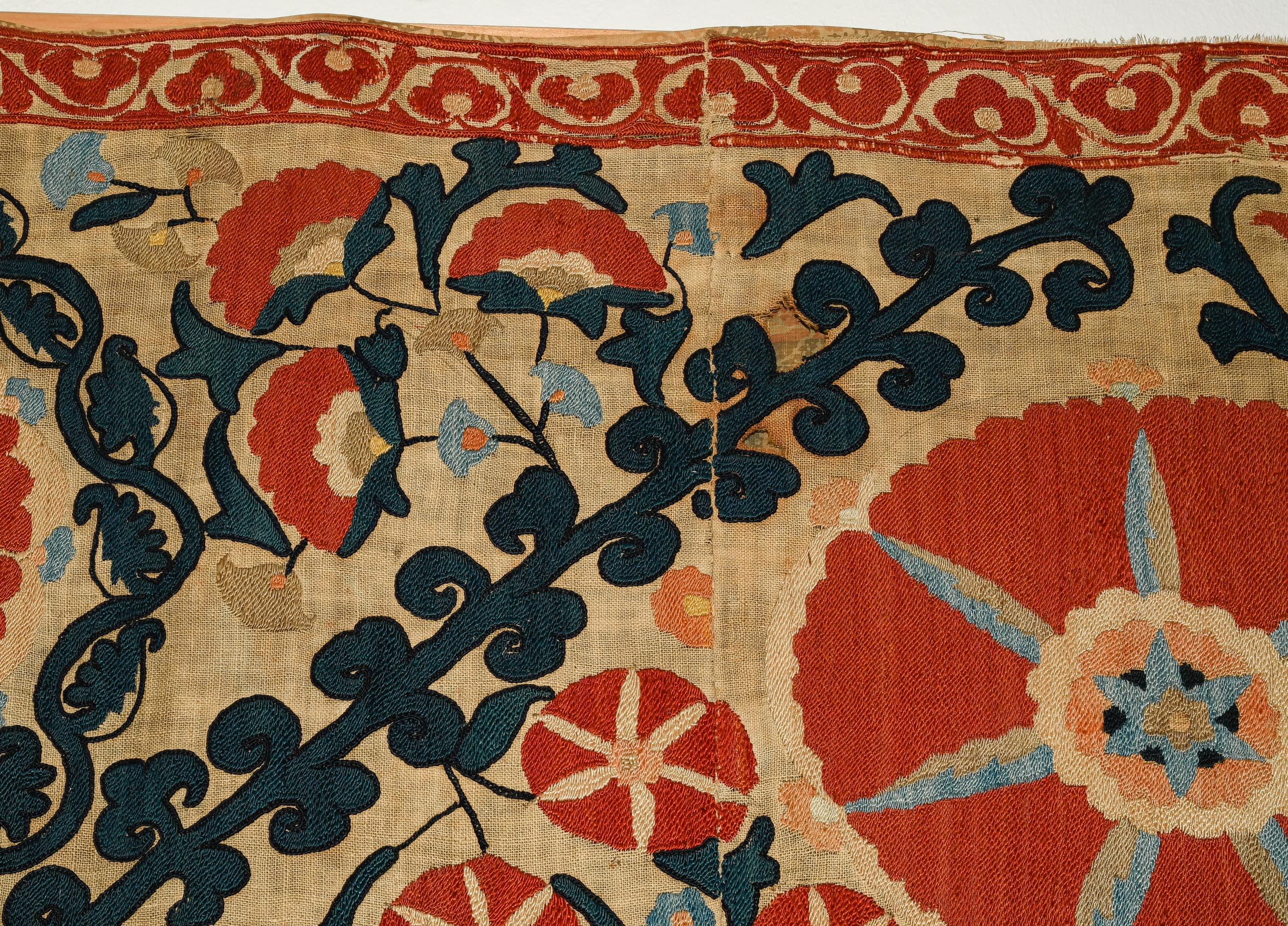Usbekistan, um 1900. Nadelarbeit auf Tuch. Filigrane dunkelblaue Borten bilden auf dem hellen Grund des Innenfeldes Rauten, die mit prächtigen roten Blütenpalmetten an jeder Rautenecke verziert sind, flankiert von fein gearbeiteten Blattranken und Blütenketten in verschiedensten Variationen und Farbtönen. In der ebenfalls hellen Bordüre umlaufen dunkelblaue Rankenbänder die grosszügig angelegten roten Blütenmotive auf dekorative Weise. Minimale Gebrauchsspuren. 190x233 cm (ft. 6.3x7.7).