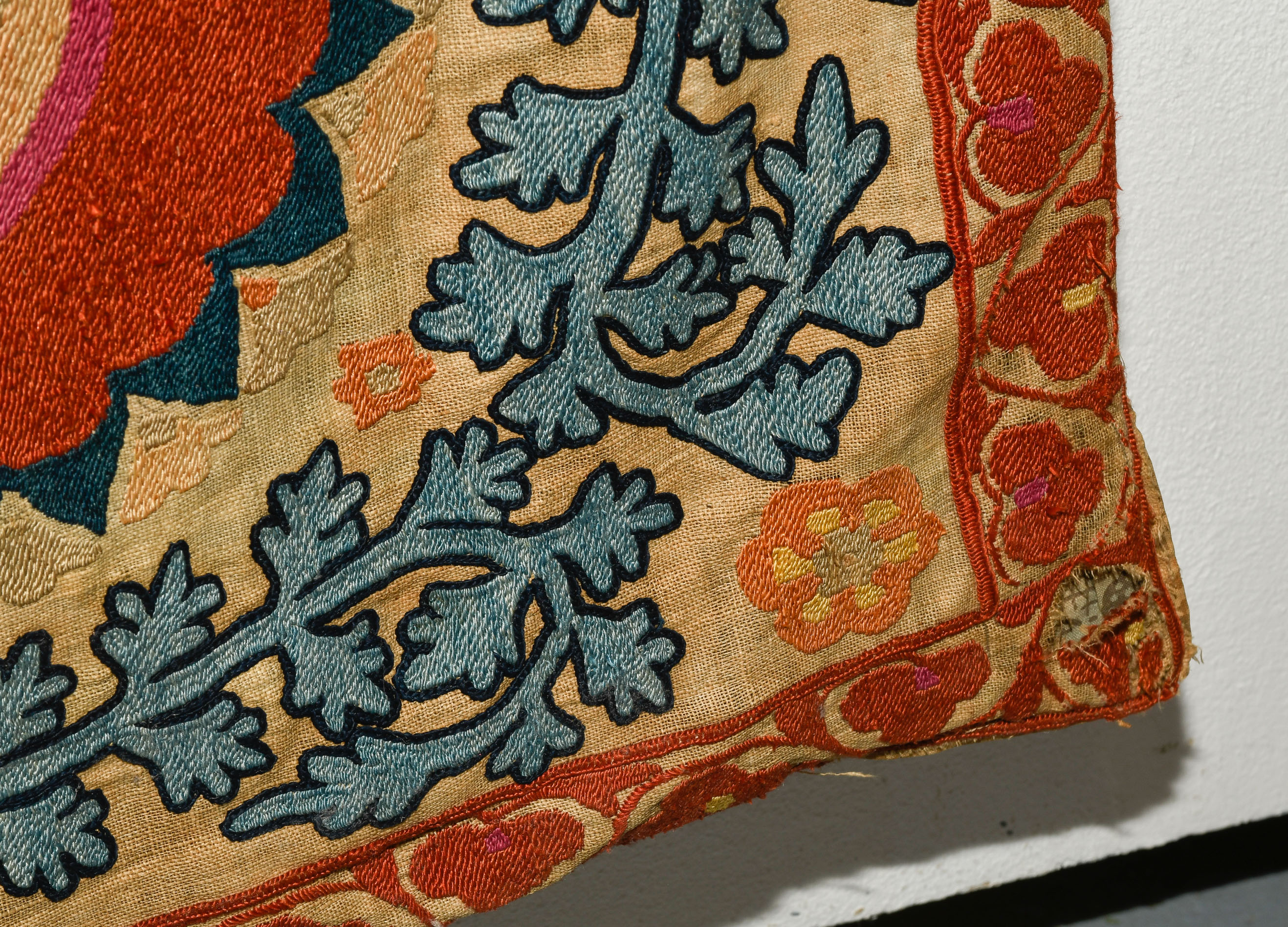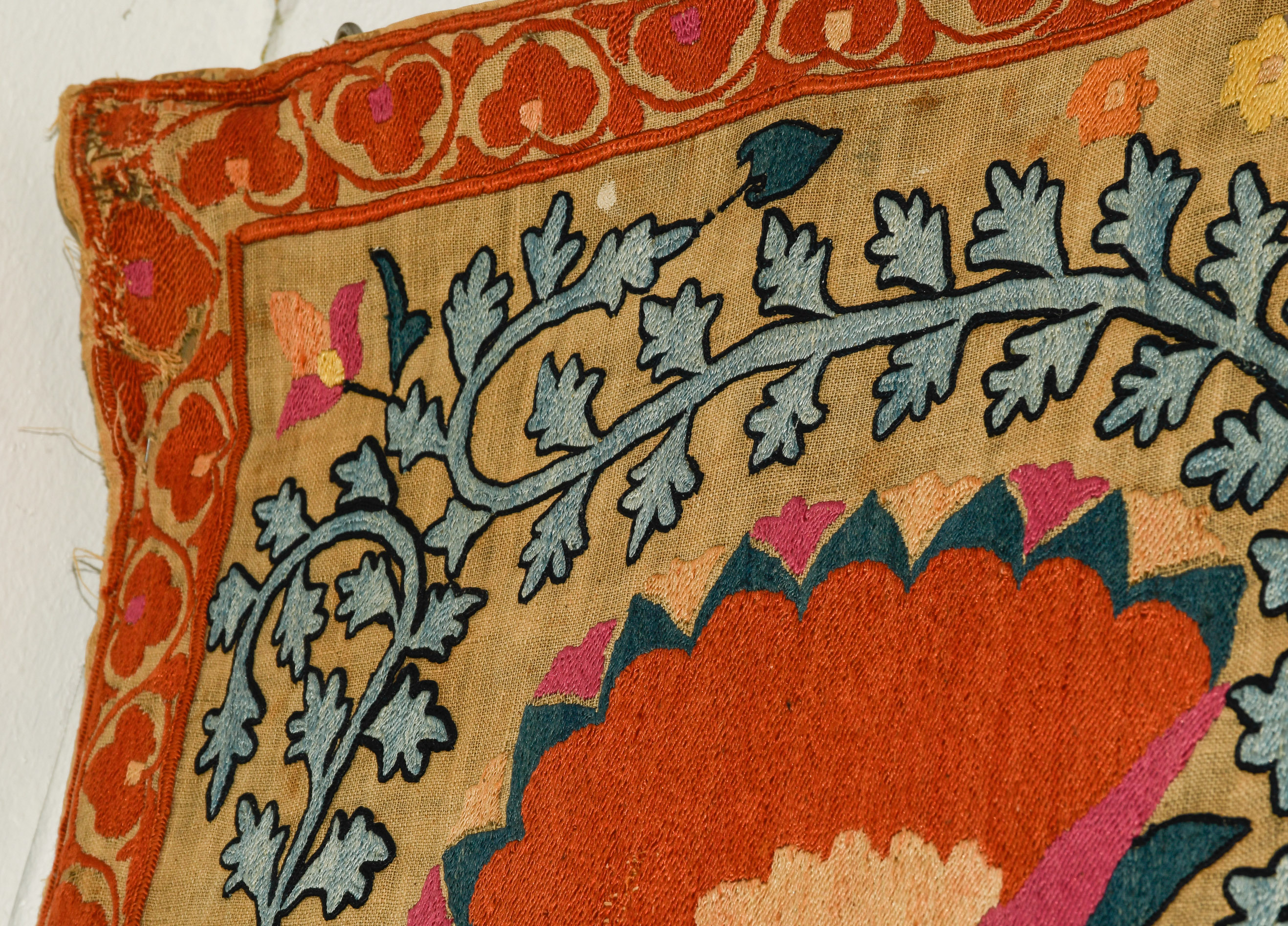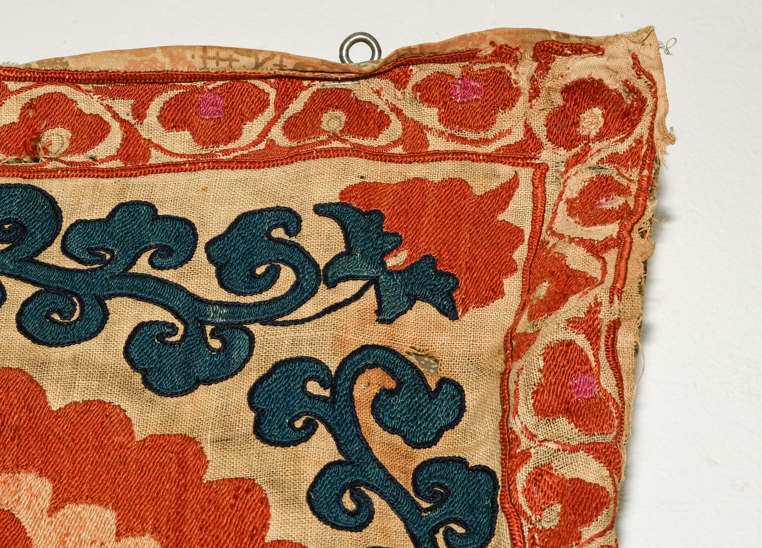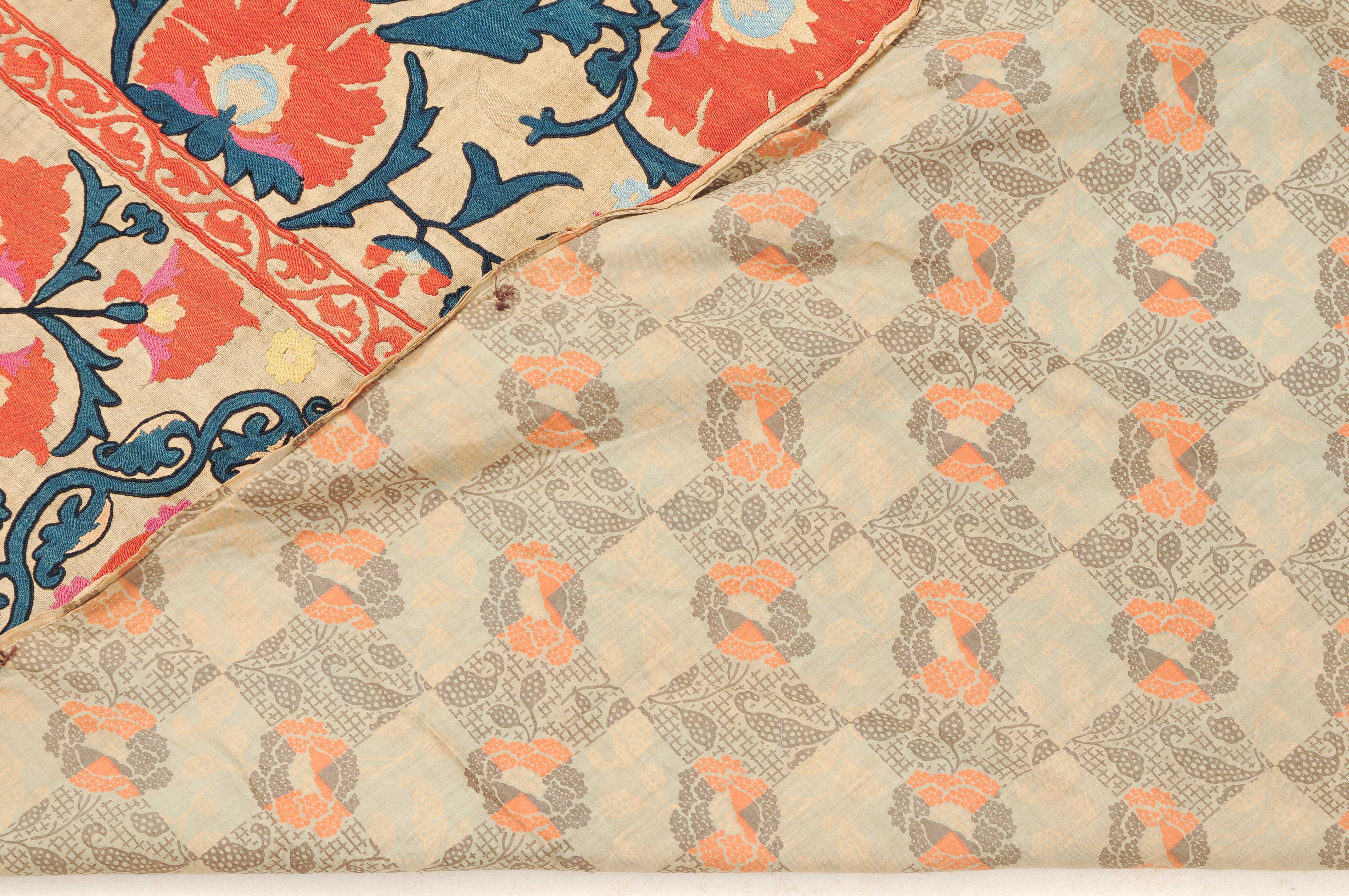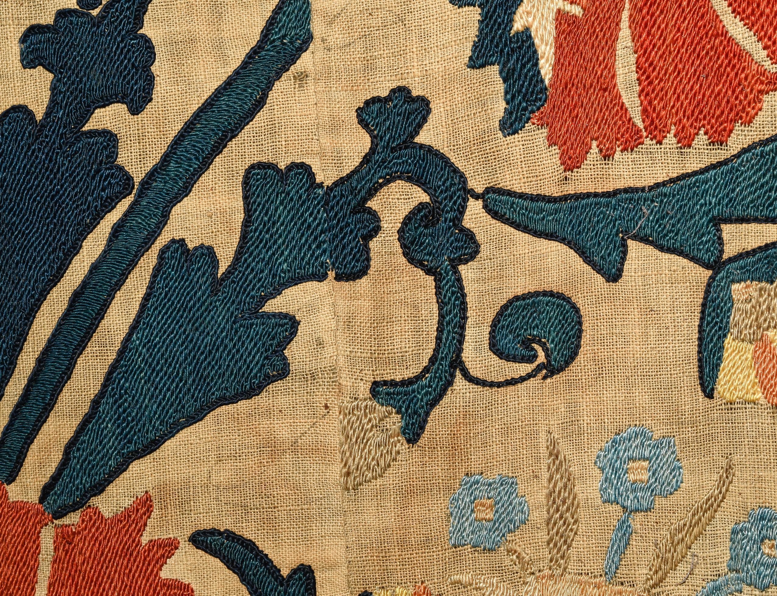 Usbekistan, um 1900. Nadelarbeit auf Tuch. Filigrane dunkelblaue Borten bilden auf dem hellen Grund des Innenfeldes Rauten, die mit prächtigen roten Blütenpalmetten an jeder Rautenecke verziert sind, flankiert von fein gearbeiteten Blattranken und Blütenketten in verschiedensten Variationen und Farbtönen. In der ebenfalls hellen Bordüre umlaufen dunkelblaue Rankenbänder die grosszügig angelegten roten Blütenmotive auf dekorative Weise. Minimale Gebrauchsspuren. 190x233 cm (ft. 6.3x7.7).